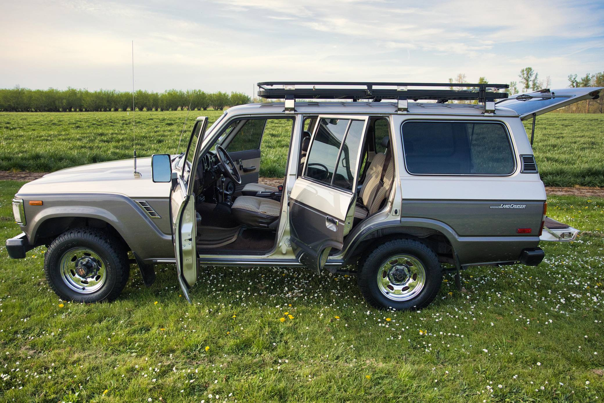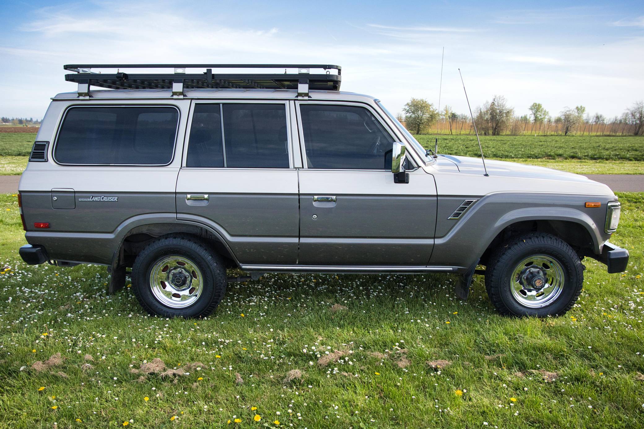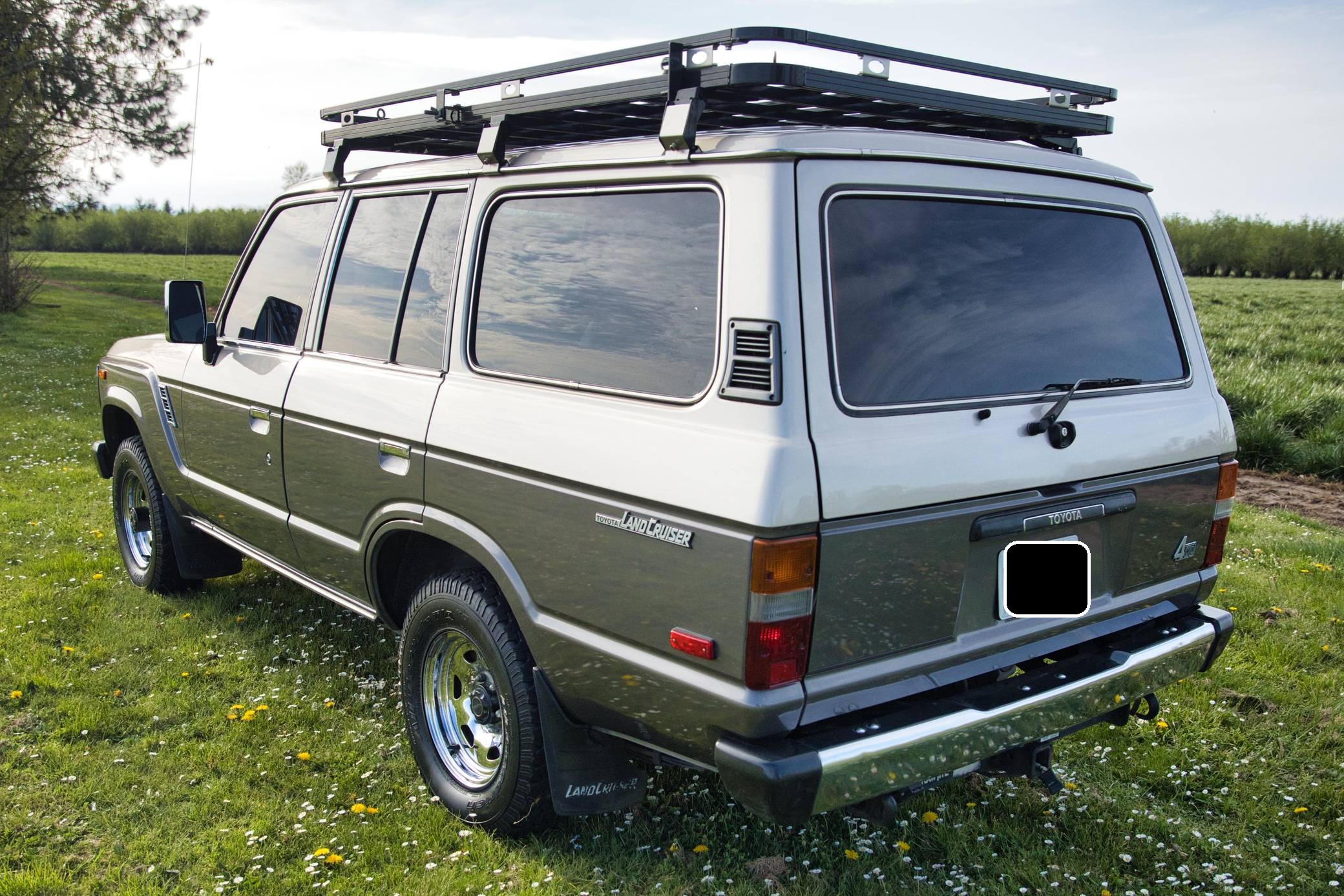 1990 Toyota Land Cruiser, finished in two-tone Metallic Beige and Metallic Gray with a tan interior. Equipment includes 15-inch wheels, manually-locking front hubs, cloth upholstery, a split rear hatch, air conditioning, rear heat, power door locks, exterior mirrors, and windows, and more as detailed below. A partial list of modifications reported by the seller includes an aluminum roof rack with attachment points for recovery gear, a 2-inch towing receiver, 3M window tint, an aftermarket CD stereo and front door speakers, and an Accel ignition system. The 60-Series was Toyota's second generation of Land Cruiser station wagon and was intended to be more comfortable than the earlier FJ55 models while retaining the Land Cruiser's traditional off-road capabilities. The FJ62 succeeded the FJ60 model and was produced from 1988 to 1990 before being replaced by the 80-Series Land Cruiser. Power comes from a fuel-injected "3F-E" 4. 0-liter inline-6, rated at 155 horsepower and 220 lb-ft of torque. Output is sent to the rear or all four wheels through a 4-speed automatic transmission and 2-speed transfer case.