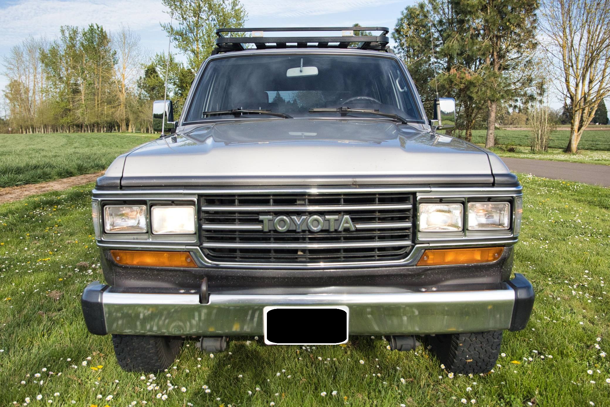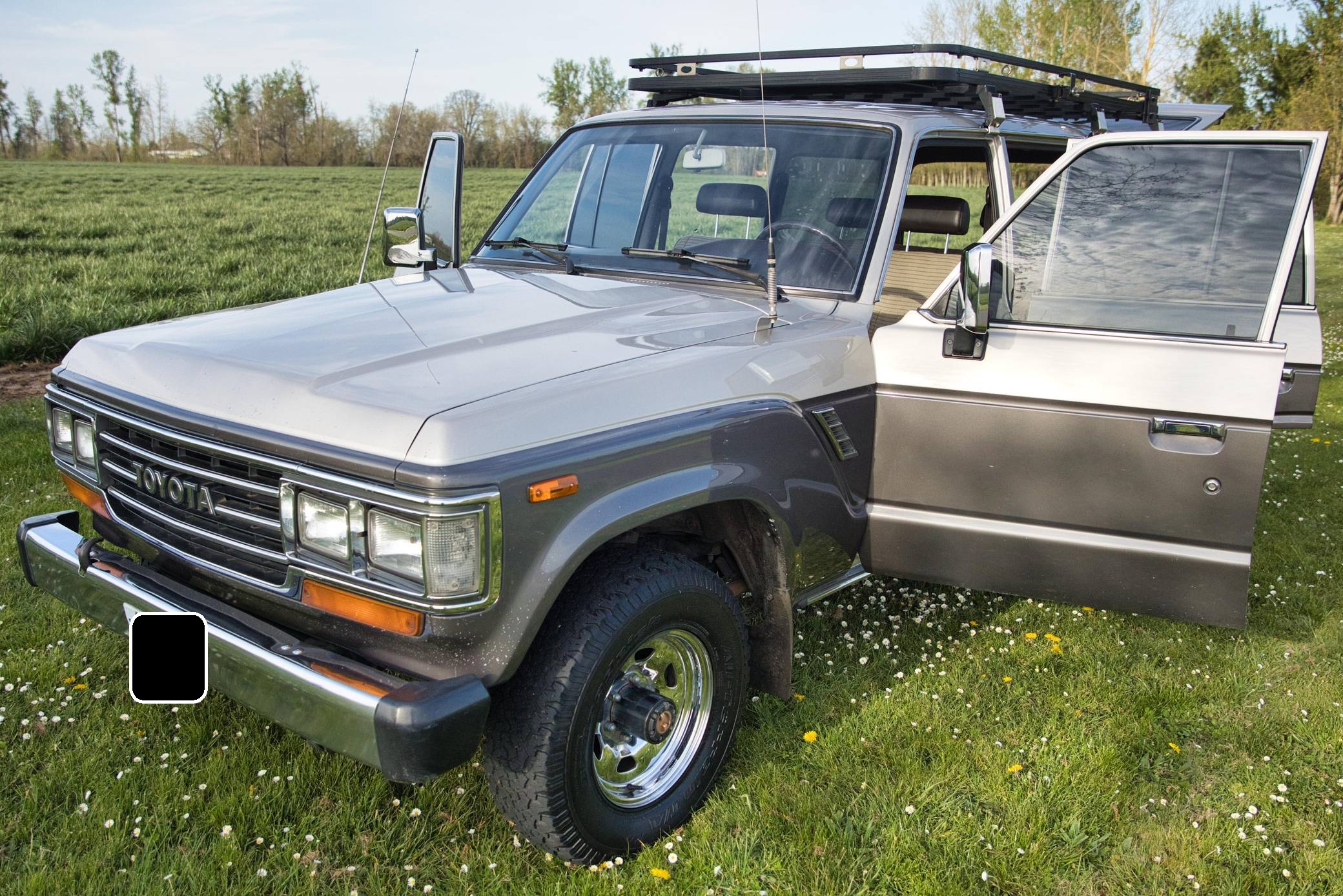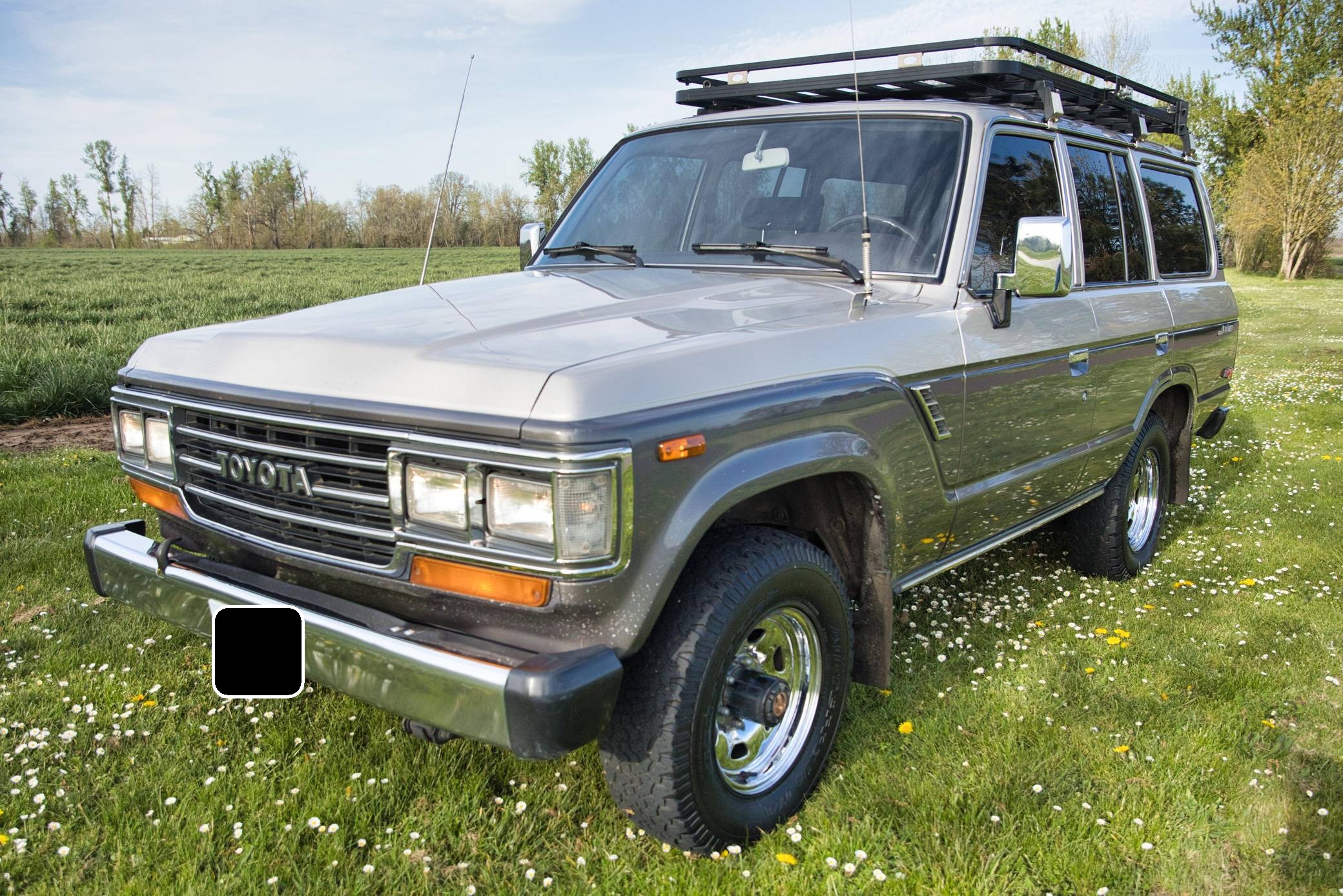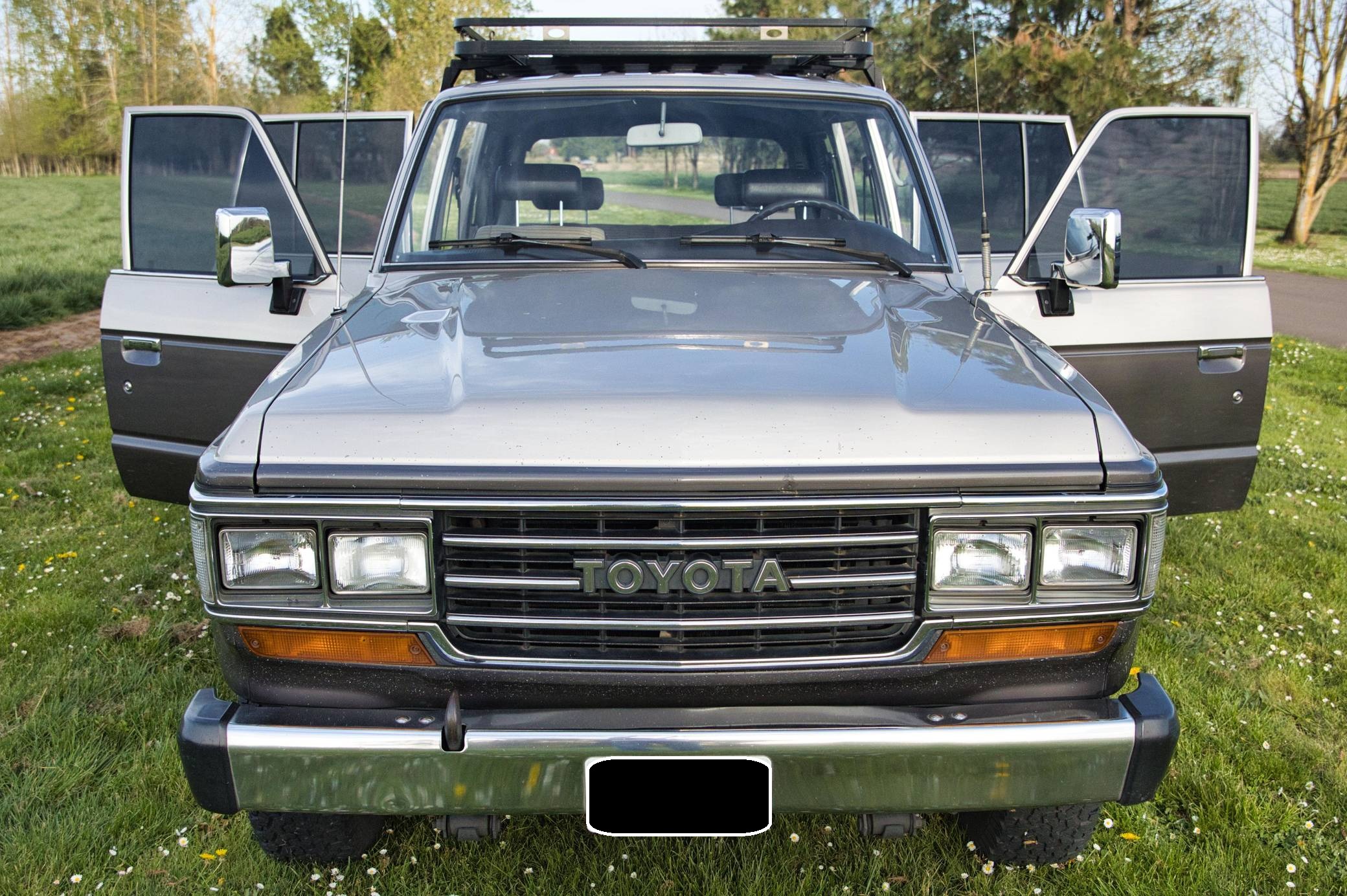 1990 Toyota Land Cruiser, finished in two-tone Metallic Beige and Metallic Gray with a tan interior. Equipment includes 15-inch wheels, manually-locking front hubs, cloth upholstery, a split rear hatch, air conditioning, rear heat, power door locks, exterior mirrors, and windows, and more as detailed below. A partial list of modifications reported by the seller includes an aluminum roof rack with attachment points for recovery gear, a 2-inch towing receiver, 3M window tint, an aftermarket CD stereo and front door speakers, and an Accel ignition system. The 60-Series was Toyota's second generation of Land Cruiser station wagon and was intended to be more comfortable than the earlier FJ55 models while retaining the Land Cruiser's traditional off-road capabilities. The FJ62 succeeded the FJ60 model and was produced from 1988 to 1990 before being replaced by the 80-Series Land Cruiser. Power comes from a fuel-injected "3F-E" 4. 0-liter inline-6, rated at 155 horsepower and 220 lb-ft of torque. Output is sent to the rear or all four wheels through a 4-speed automatic transmission and 2-speed transfer case.