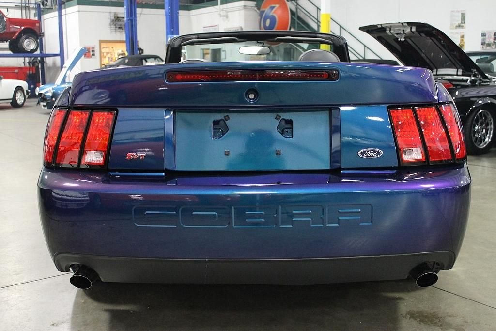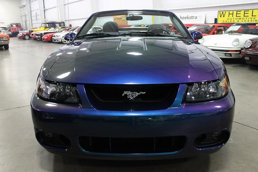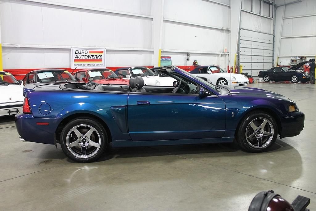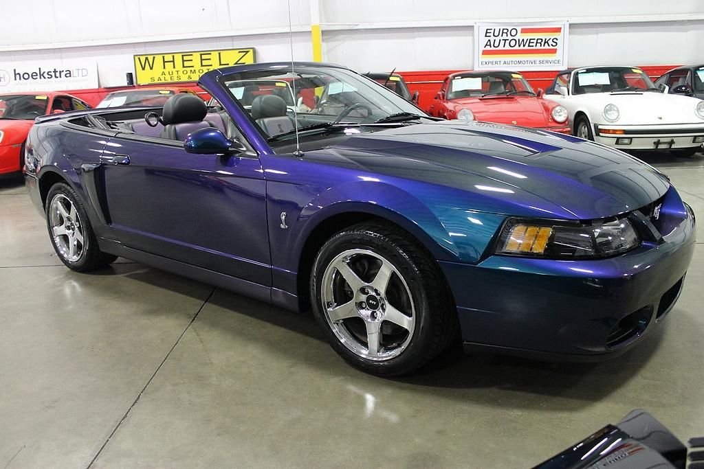 The redesigned Cobra for 2003 was fords most powerful modern mustang produced to date. Codenamed “Terminator” by the SVT development crew, the 2003 / 2004 SVT featured a host of improvements, most notable, a supercharged 4.6 liter DOHC V8 producing 390hp. Other improvements to the drive-train implemented to apply those horses included and aluminum fly wheel connected to a Tremec T-56 6-speed transmission, 3.55:1 rear axle ratio and stronger 31 spline half-shafts with improved upper and lower control arms. Together these modifications launched the SVT Cobra from 0 to 60 in just 4.5 seconds and quarter mile times as low as 12.4 seconds in stock form. As a special for 2004, SVT re-introduced the Mystic Cobra paint scheme from 1996 in new fashion. We are pleased to present this 2004 Ford Mustang Limited Edition SVT Cobra Convertible. Just out of a private collection, this one owner, low mile SVT Cobra convertible is #754 of 1896 units built for 2004 and has traveled only 9832 miles since new. It was purchased new at Don Woodhams, Inc. in South Haven Michigan and delivered with the Mystichrome Paint, a 3650.00 option on top of the lofty retail price of over 39 000.00. The paint however, is worth the price. This unique color manufactured by BASF changes from bright, metallic topaz transitioning to cobalt blue, then to royal purple and finally to deep Onyx Black. All depending the angle and lighting the car is viewed. Only 495 convertibles came with this paint scheme. The well-appointed interior is Black Leather with Mystichrome seat inserts. Today, this garage kept, enthusiast owned SVT presents itself is outstanding original condition. Driven sparingly, it is apparent that this one owner was purchased with collectability in mind and retains all the original documentation when purchased new including: original window sticker, original bill of sale, original MSO , original application for Title, original factory bumper quality lable, original factory key cards, factory road test mileage statement, selling dealer key tags, dealer delivery check list, Ford SVT welcome pack, SVT Certificate, Team Ford Racing Membership Card, and the still unopened SVT Owners Association Welcome kit. This 2004 Mustang SVT Cobra Convertible is an opportunity to acquire a car that represents the resurgence of American Horsepower. Its limited production and desirability make it an instant modern collectible. A low mile, documented example such as this will always have high demand and is an automotive investment that is a complete blast to drive.
