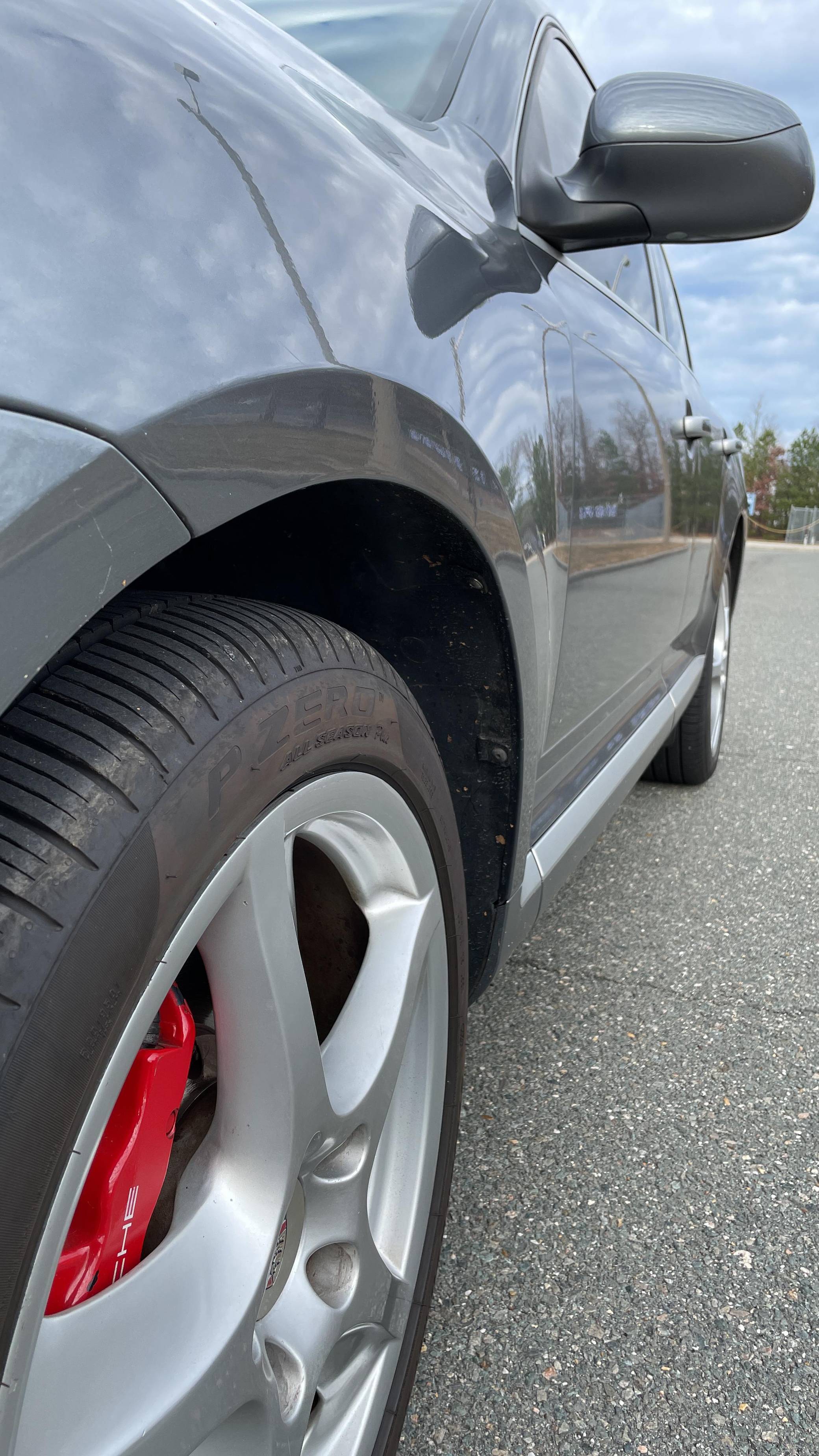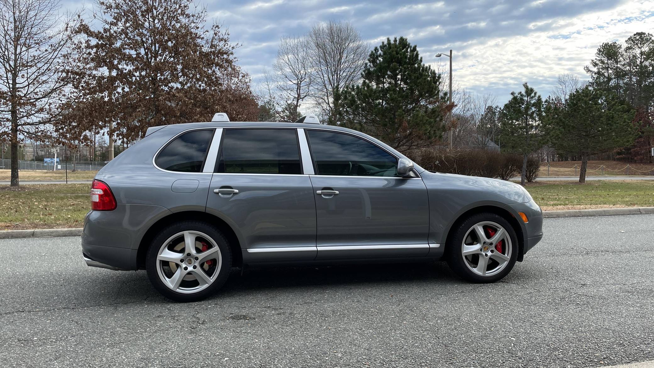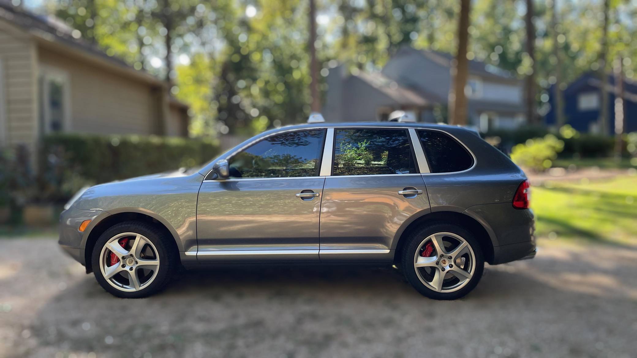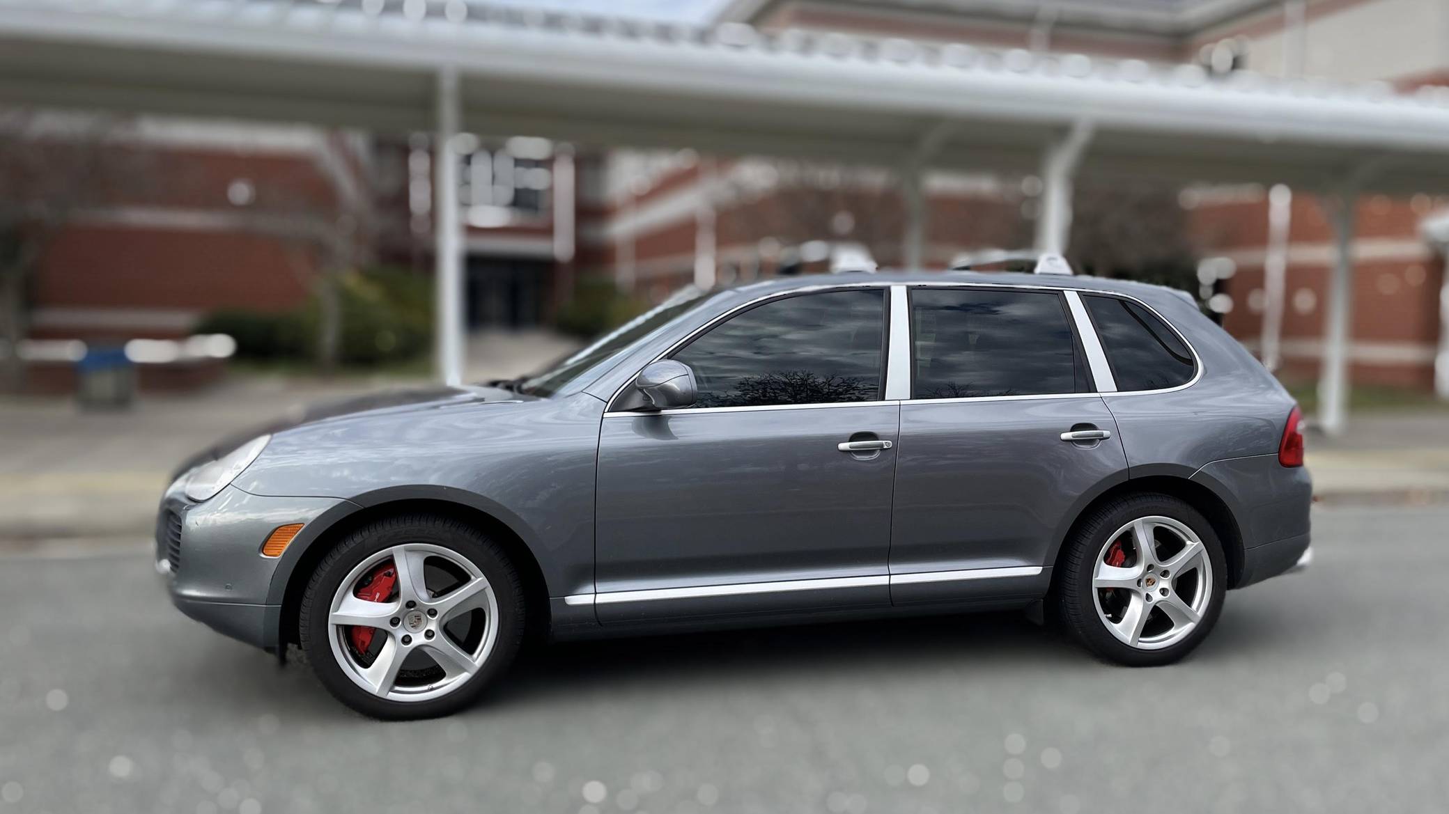 2006 Porsche Cayenne Turbo S, finished in Titanium Metallic with a black interior. Factory equipment on this Cayenne includes 20-inch wheels, Porsche Active Suspension Management (PASM), fog lights, roof rack crossbars, a sunroof, trailer hitch, leather upholstery, power-adjustable front seats, heated front and rear seats, a navigation system, and a Bose audio system, among others listed below. The sole modification reported by the seller is a set of aftermarket tail lights, though the factory taillights are included in the sale. Called "955" internally, the first-generation Cayenne made its American debut for the 2003 model year. It was a hugely controversial model at launch, but it quickly won over skeptics with its unusual blend of on-road performance and off-road prowess. It retired as the best-selling member of the Porsche range in 2010, and its replacement arrived shortly after. Power comes from a 4. 5-liter twin-turbocharged V8, rated at 520 horsepower and 530 lb-ft of torque. Output is sent to all four wheels through a 6-speed automatic transmission.