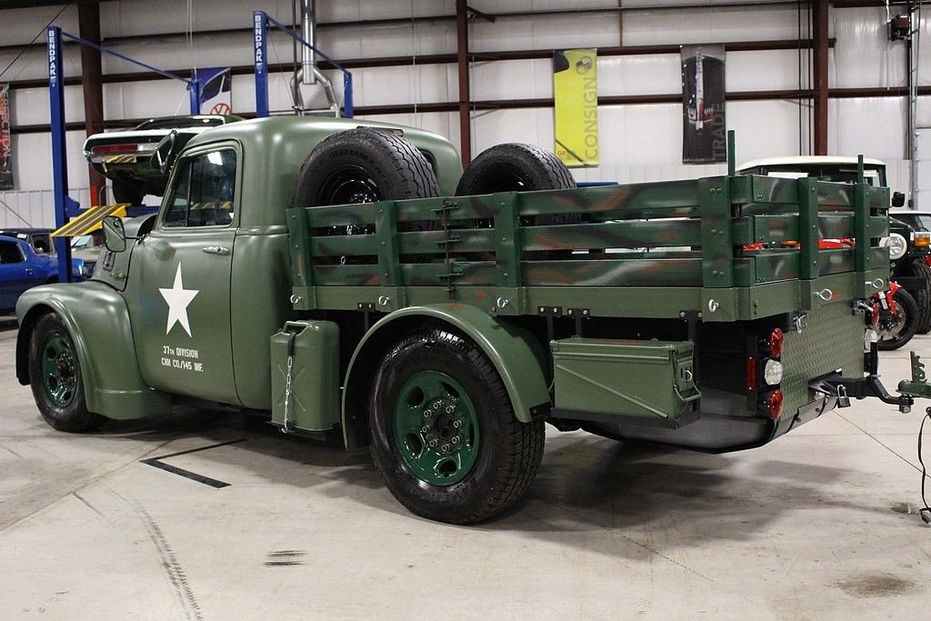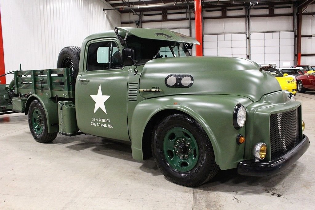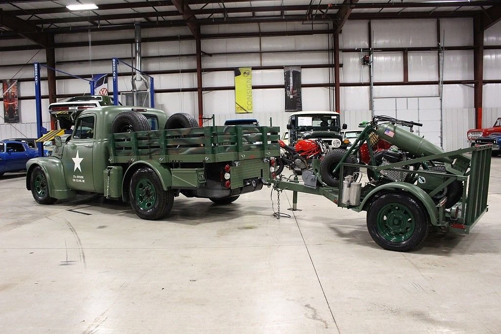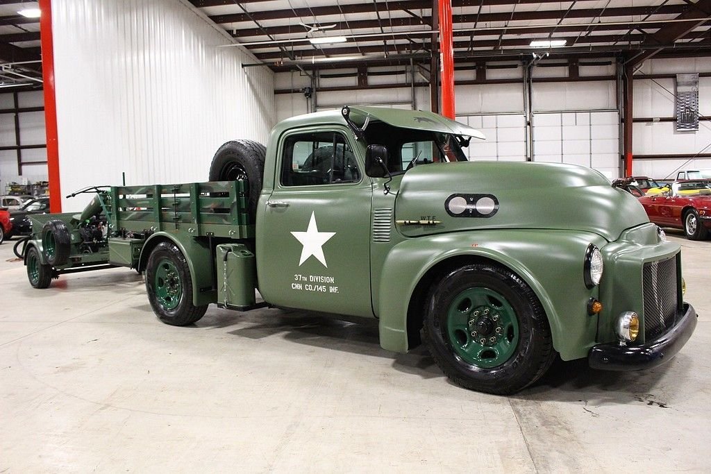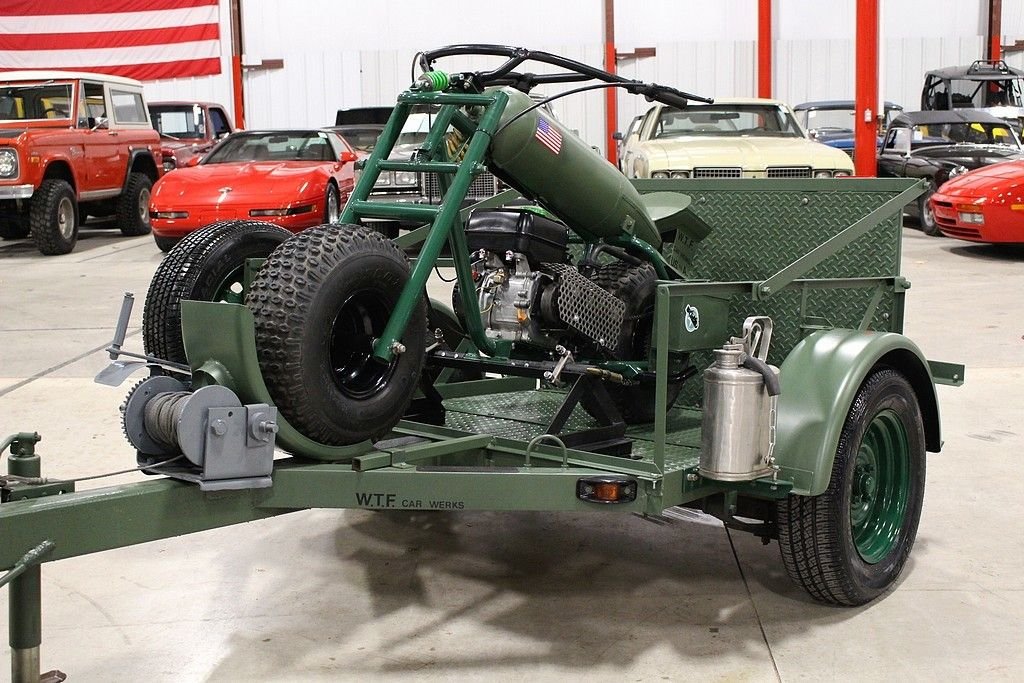 This 13 month build project was done with some very impressive thoughts and engineering. Built to honor the WW II 112th Medical Division that the father of the builder was assigned to during the Pacific theater. The truck started out a s 1997 ¾ ton pickup and was stripped of its sheet metal and mated to a 1953 GMC pickup cab and hood. The rear bed then was custom made to meet the look they desired and also to accommodate the scooter with special mounts. The 8 lug wheel setup gives a great look and mean look. Two extra spares are mounted on the bed. The paint is less than 3 months old and was finished with the flat army green and custom camo paint job on the wooden bed of trailer and rails. Extra gas cans and ammo boxes are mounted and strapped on to complete the look. A few extra dummy rounds of .50 caliber bullets complete the look with proper decals and the dual port holes on side and sun visor for front windshield. Custom grill give the mean look and the fangs could easily be removed or painted over. The new gas tank is located under the bed and the tow package is set to trailer the bike around or whatever else you may want to hook up. The brand new 350 Vortec V8 engine has less than 500 miles logged on it and vehicle runs and drives almost like a new vehicle. Great exhaust note that adds to the whole package. Interior is finished in gun metal grey and custom cut out steering wheel gives the truck a tank like feel. 3 cup holders that were custom made and will handle any beverage you like and ammo box center console has plenty of room to store your needs. Leather seats are in great shape and out of a modern Tahoe. The whole vehicle is in great shape and reflects the recent custom work. No signs of rust or issues and suspension is all new. The scooter is a calibration of many things, but the story is that the 100lb test bomb was an authentic from the field and is strapped and mounted onto a Baja scooter frame. The bike runs and fires right up with a pull of the rip cord and is decaled up and custom mounted to the trailer. Trailer is the same build quality of the bike and truck and has a convenient drop tail gate with winch. As mentioned, this is something you most likely will not see again and the total build job was stated as well over $55k in parts, material and labor. It is always cheaper to buy a project done then starting from scratch. This combo represents a ton of value and one that should be considered for any avid collector, military aficionado or the person that likes to have the coolest vehicle in the 4th of July parade.