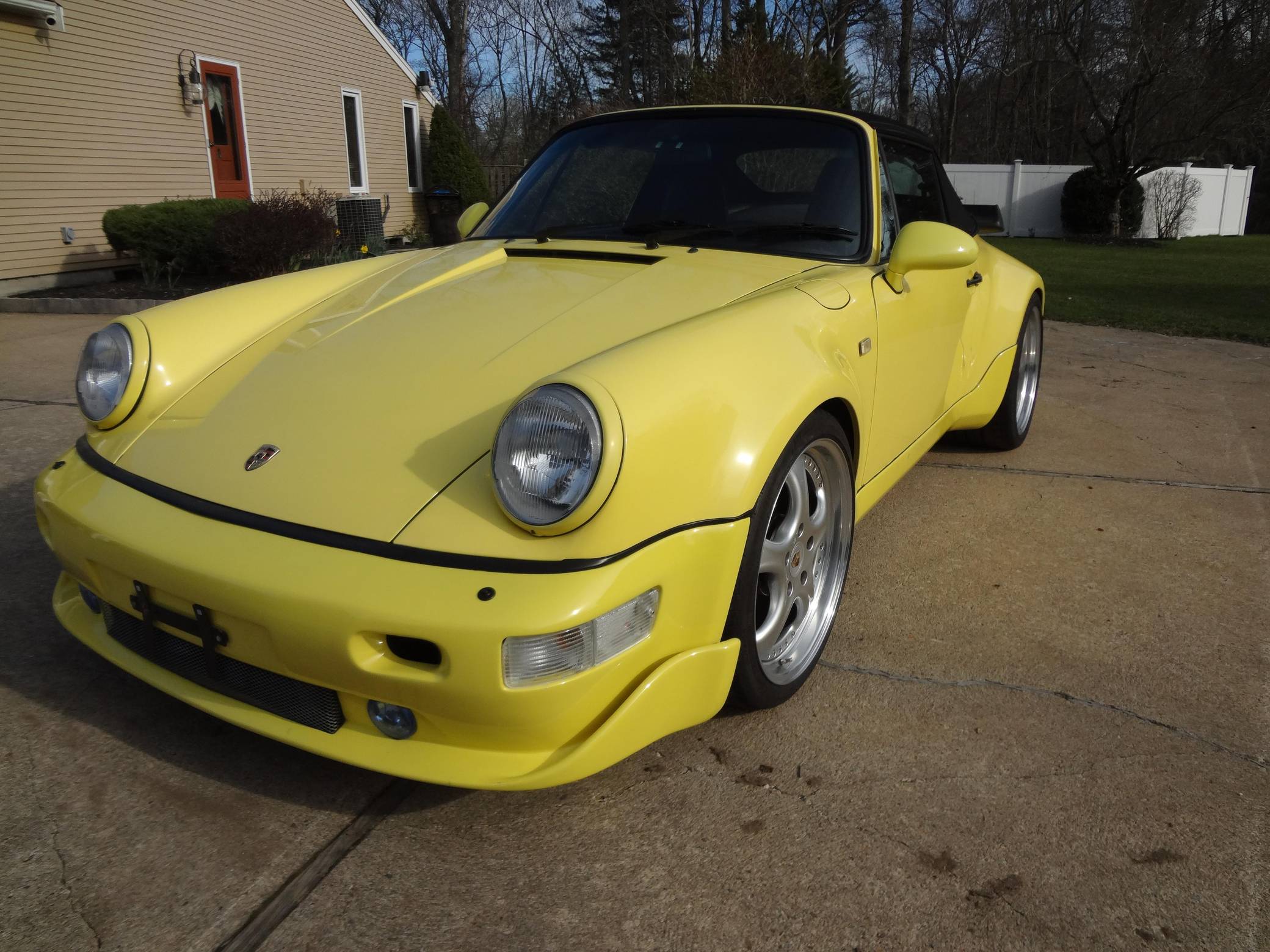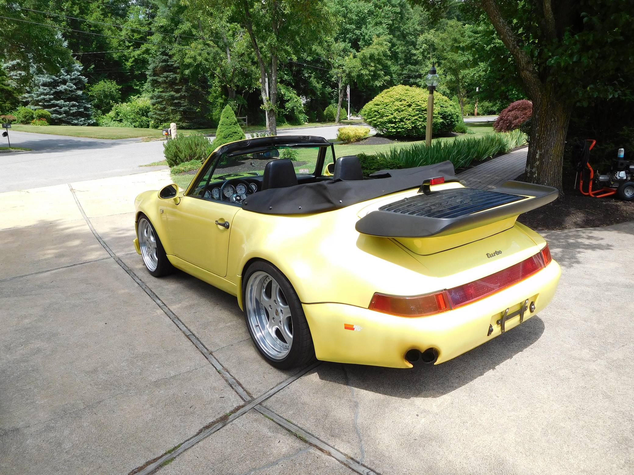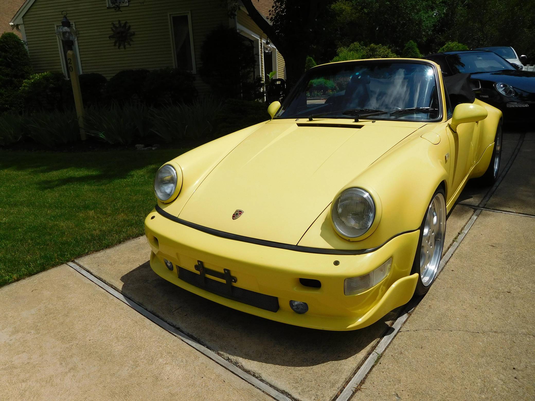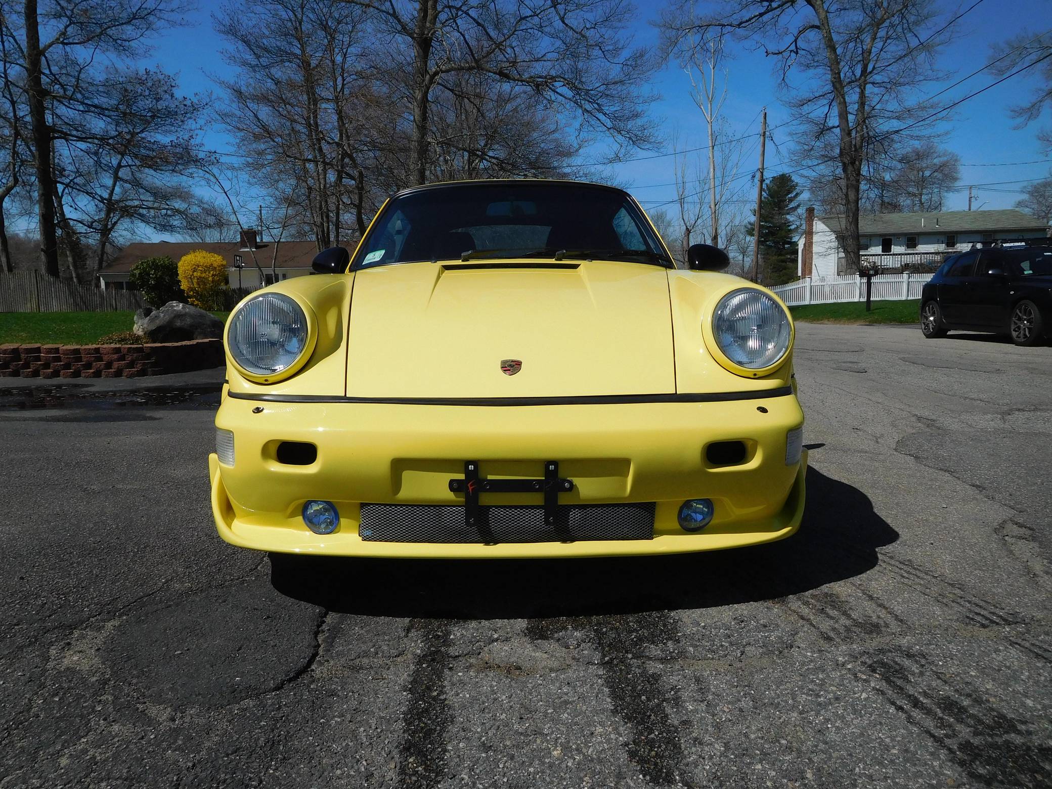 1988 Porsche 911 Turbo Cabriolet, finished in yellow with a black soft top and a black interior. Extensively modified, this 911 is powered by a turbocharged flat-6 engine reportedly sourced from a 964-generation 911 Turbo and bored to 3. 5 liters. Other modifications reported by the seller include Patrick Motorsports front- and fender-mounted engine oil coolers, aftermarket parts in the exhaust system, 19-inch wheels, yellow exterior paint, a 964-style body kit, a MOMO steering wheel, and an aftermarket head unit. More details about the aftermarket parts installed on this car are provided below. Factory equipment includes a power-operated soft top and leather upholstery. Released for 1976, and called "930" internally, the first 911 Turbo instantly became Porsche's fastest and most expensive street-legal car. It left the American market after 1979 but made a triumphant return for the 1986 model year with a more powerful engine. The Turbo has been a core part of the 911 range since. Power comes from a 3. 5-liter turbocharged flat-6. The seller pegs its output between 400 and 450 horsepower, but a dyno sheet is not available. It spins the rear wheels via a 4-speed manual transmission.