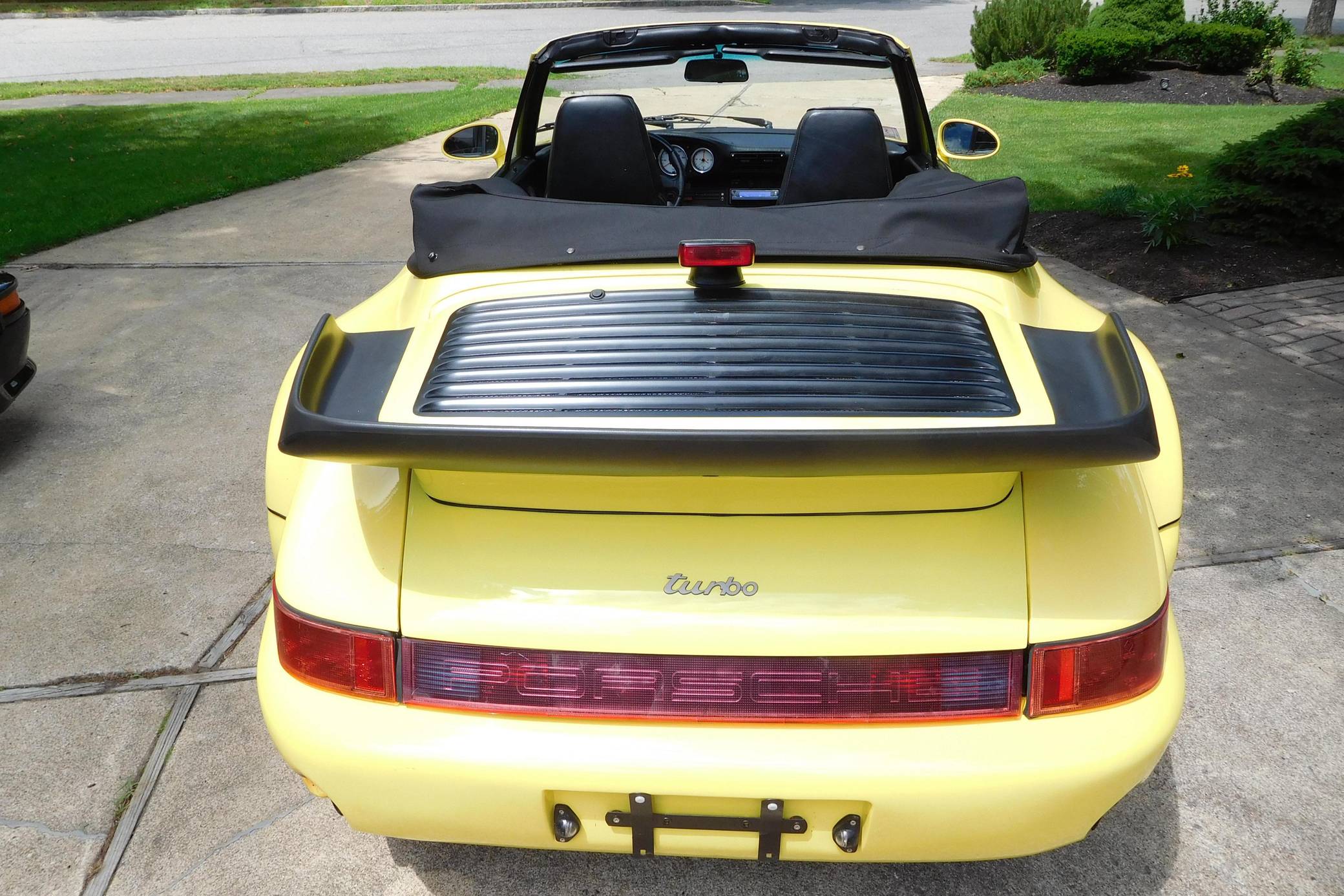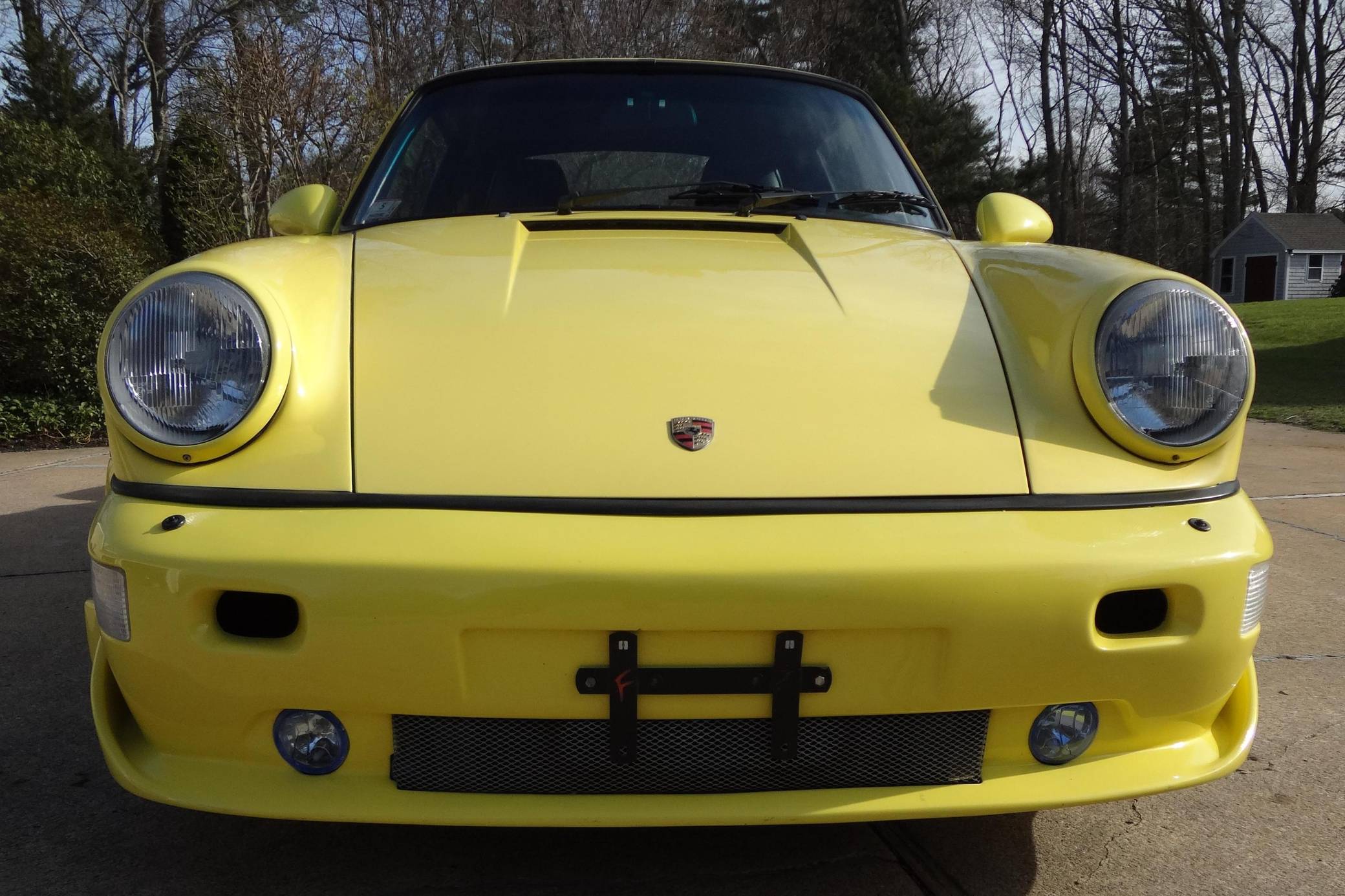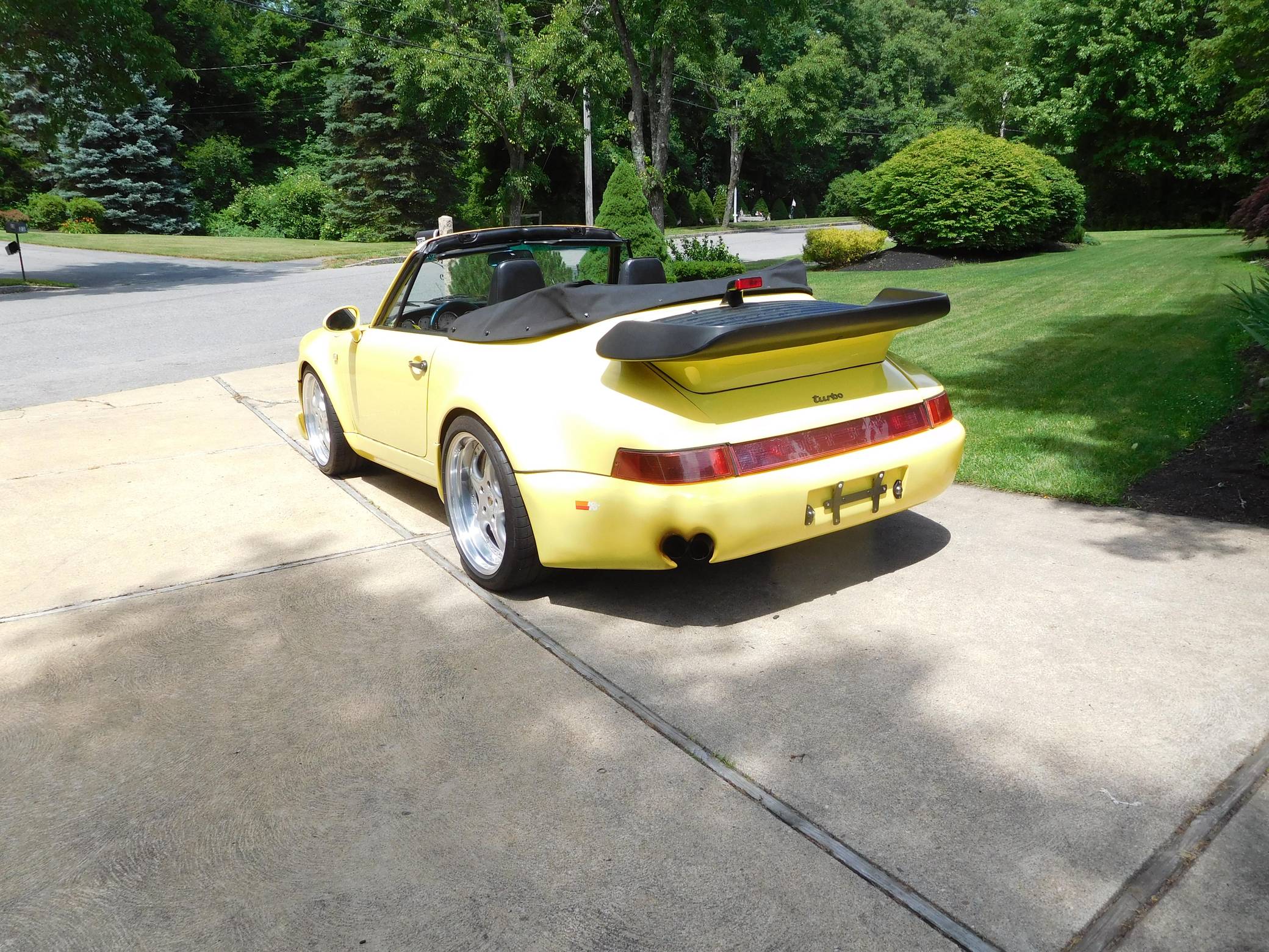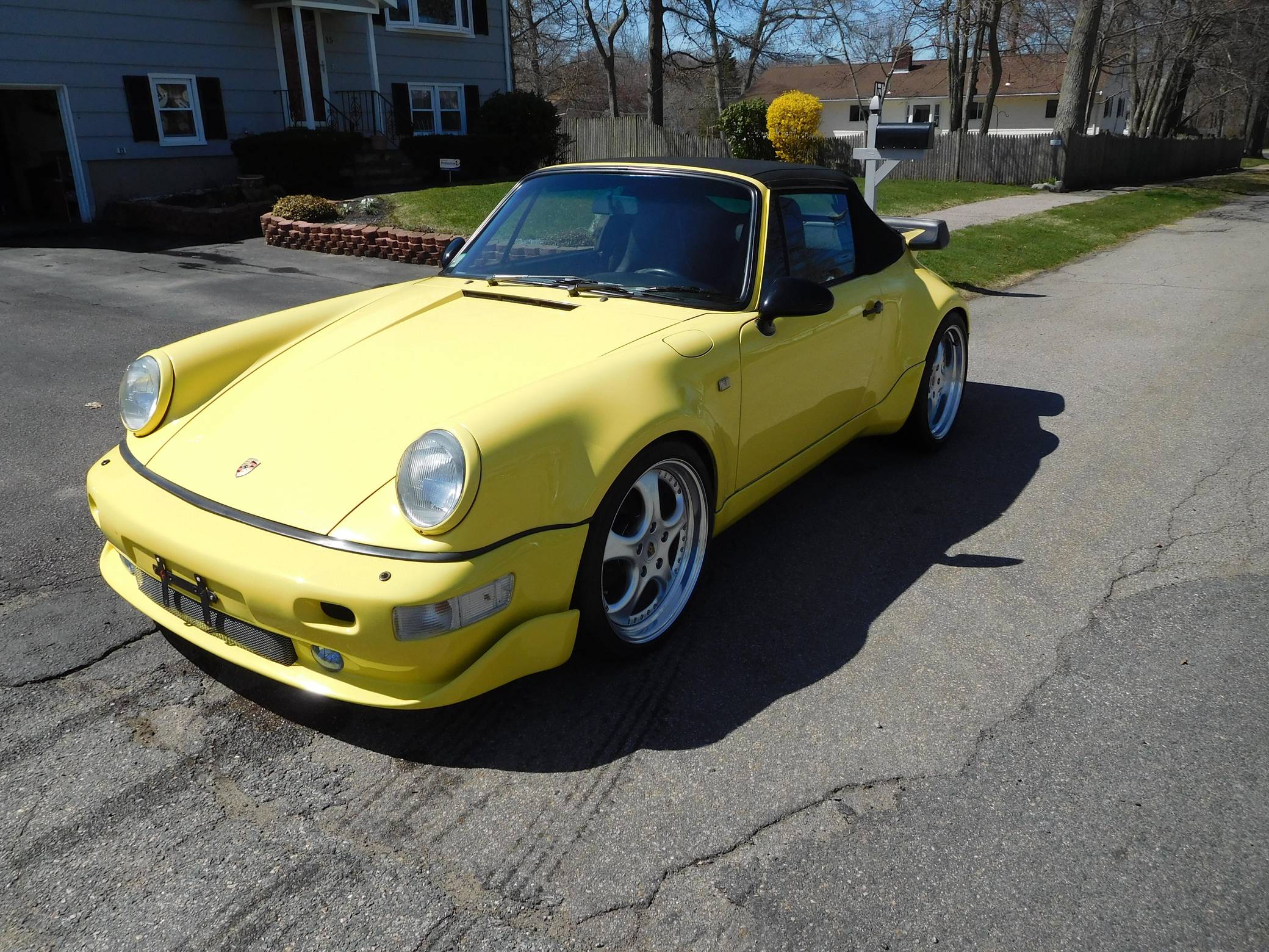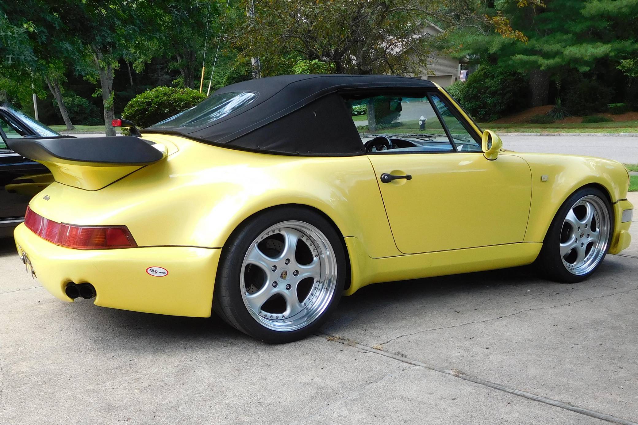 1988 Porsche 911 Turbo Cabriolet, finished in yellow with a black soft top and a black interior. Extensively modified, this 911 is powered by a turbocharged flat-6 engine reportedly sourced from a 964-generation 911 Turbo and bored to 3. 5 liters. Other modifications reported by the seller include Patrick Motorsports front- and fender-mounted engine oil coolers, aftermarket parts in the exhaust system, 19-inch wheels, yellow exterior paint, a 964-style body kit, a MOMO steering wheel, and an aftermarket head unit. More details about the aftermarket parts installed on this car are provided below. Factory equipment includes a power-operated soft top and leather upholstery. Released for 1976, and called "930" internally, the first 911 Turbo instantly became Porsche's fastest and most expensive street-legal car. It left the American market after 1979 but made a triumphant return for the 1986 model year with a more powerful engine. The Turbo has been a core part of the 911 range since. Power comes from a 3. 5-liter turbocharged flat-6. The seller pegs its output between 400 and 450 horsepower, but a dyno sheet is not available. It spins the rear wheels via a 4-speed manual transmission.