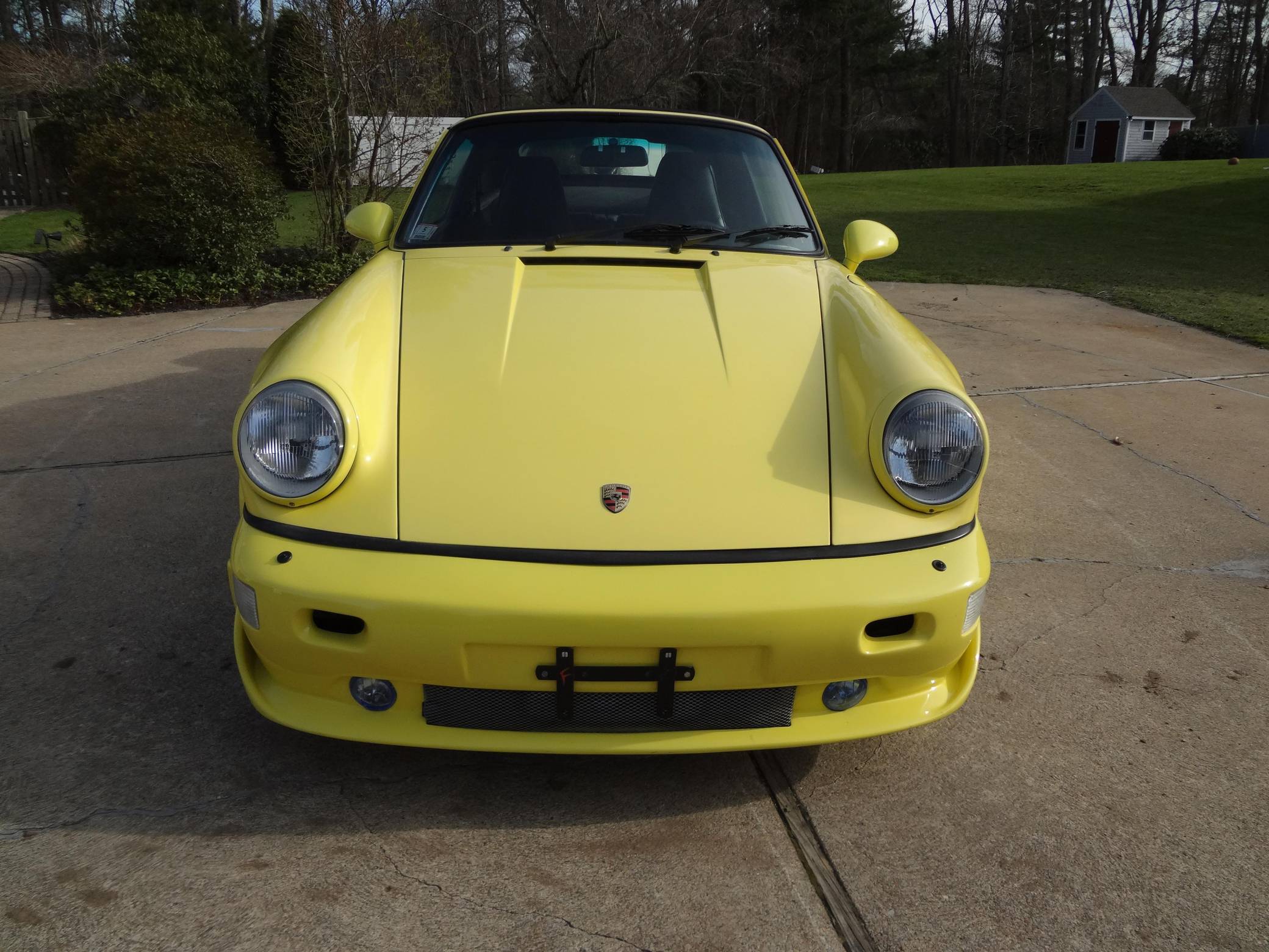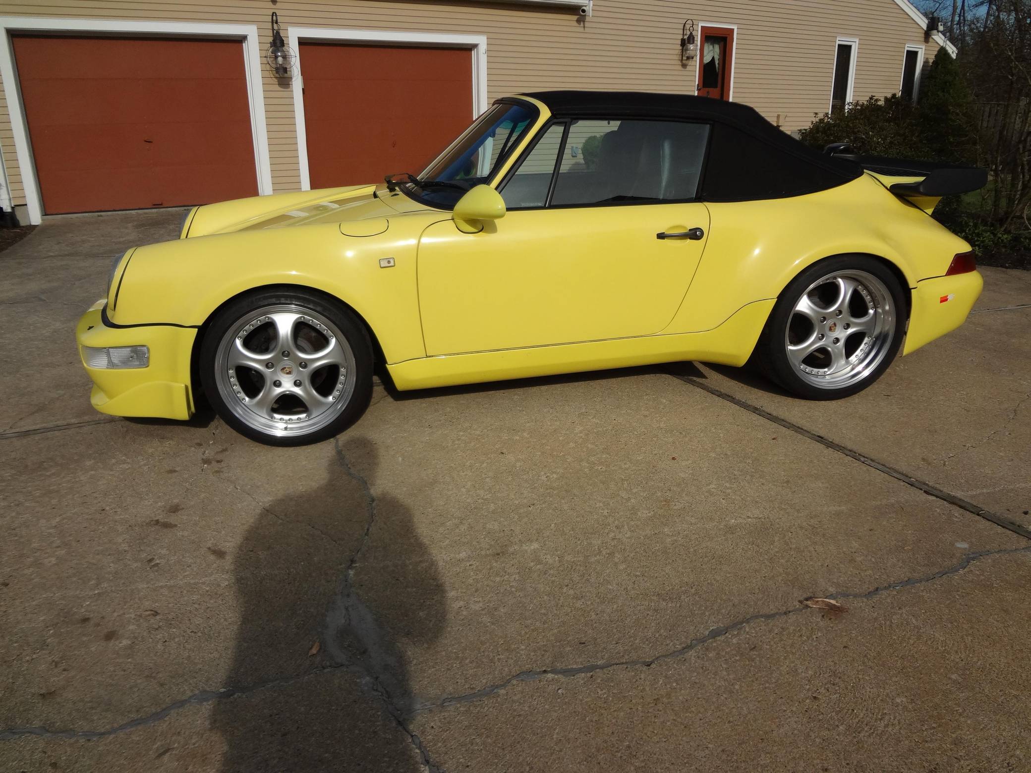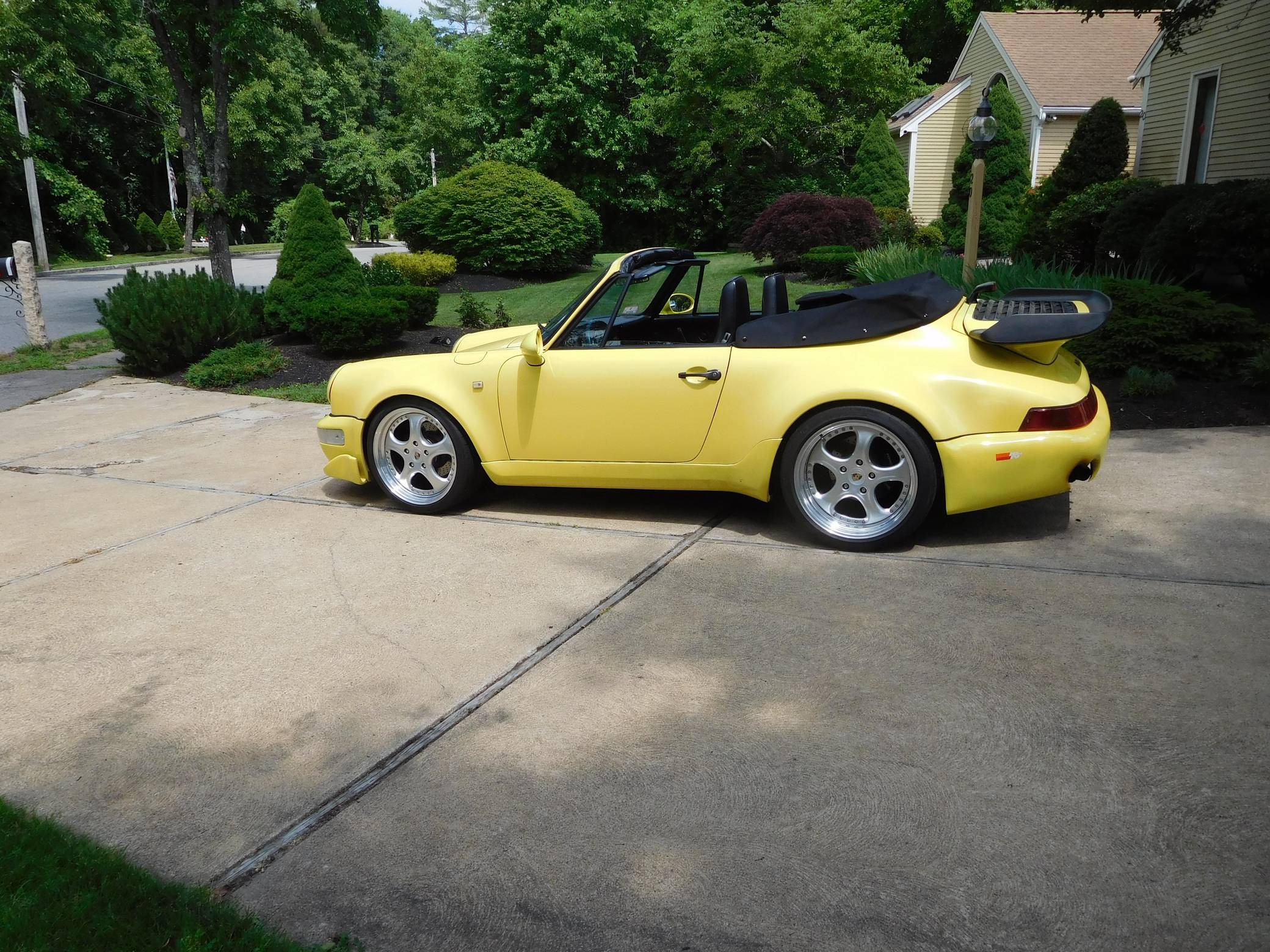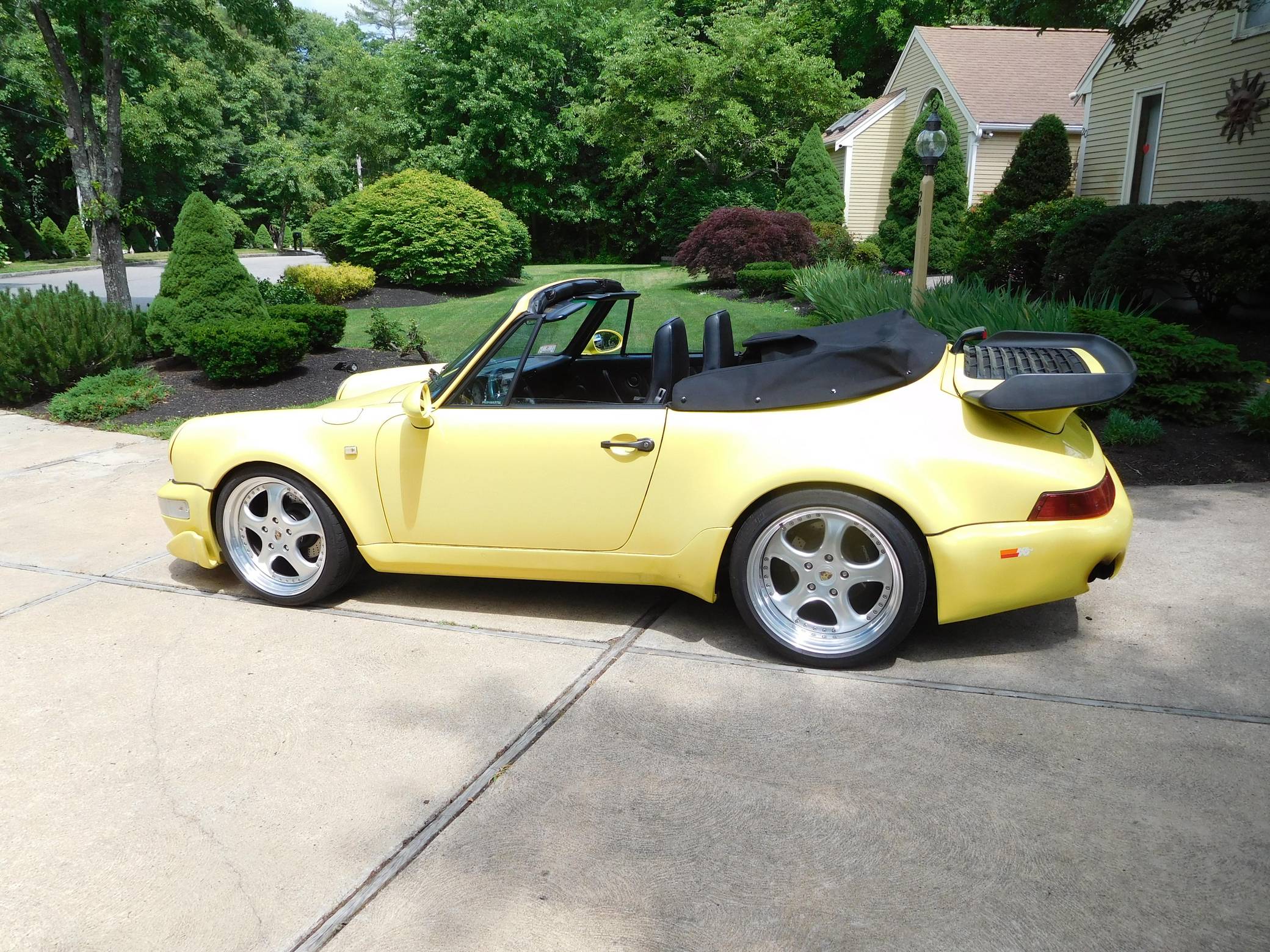 1988 Porsche 911 Turbo Cabriolet, finished in yellow with a black soft top and a black interior. Extensively modified, this 911 is powered by a turbocharged flat-6 engine reportedly sourced from a 964-generation 911 Turbo and bored to 3. 5 liters. Other modifications reported by the seller include Patrick Motorsports front- and fender-mounted engine oil coolers, aftermarket parts in the exhaust system, 19-inch wheels, yellow exterior paint, a 964-style body kit, a MOMO steering wheel, and an aftermarket head unit. More details about the aftermarket parts installed on this car are provided below. Factory equipment includes a power-operated soft top and leather upholstery. Released for 1976, and called "930" internally, the first 911 Turbo instantly became Porsche's fastest and most expensive street-legal car. It left the American market after 1979 but made a triumphant return for the 1986 model year with a more powerful engine. The Turbo has been a core part of the 911 range since. Power comes from a 3. 5-liter turbocharged flat-6. The seller pegs its output between 400 and 450 horsepower, but a dyno sheet is not available. It spins the rear wheels via a 4-speed manual transmission.
