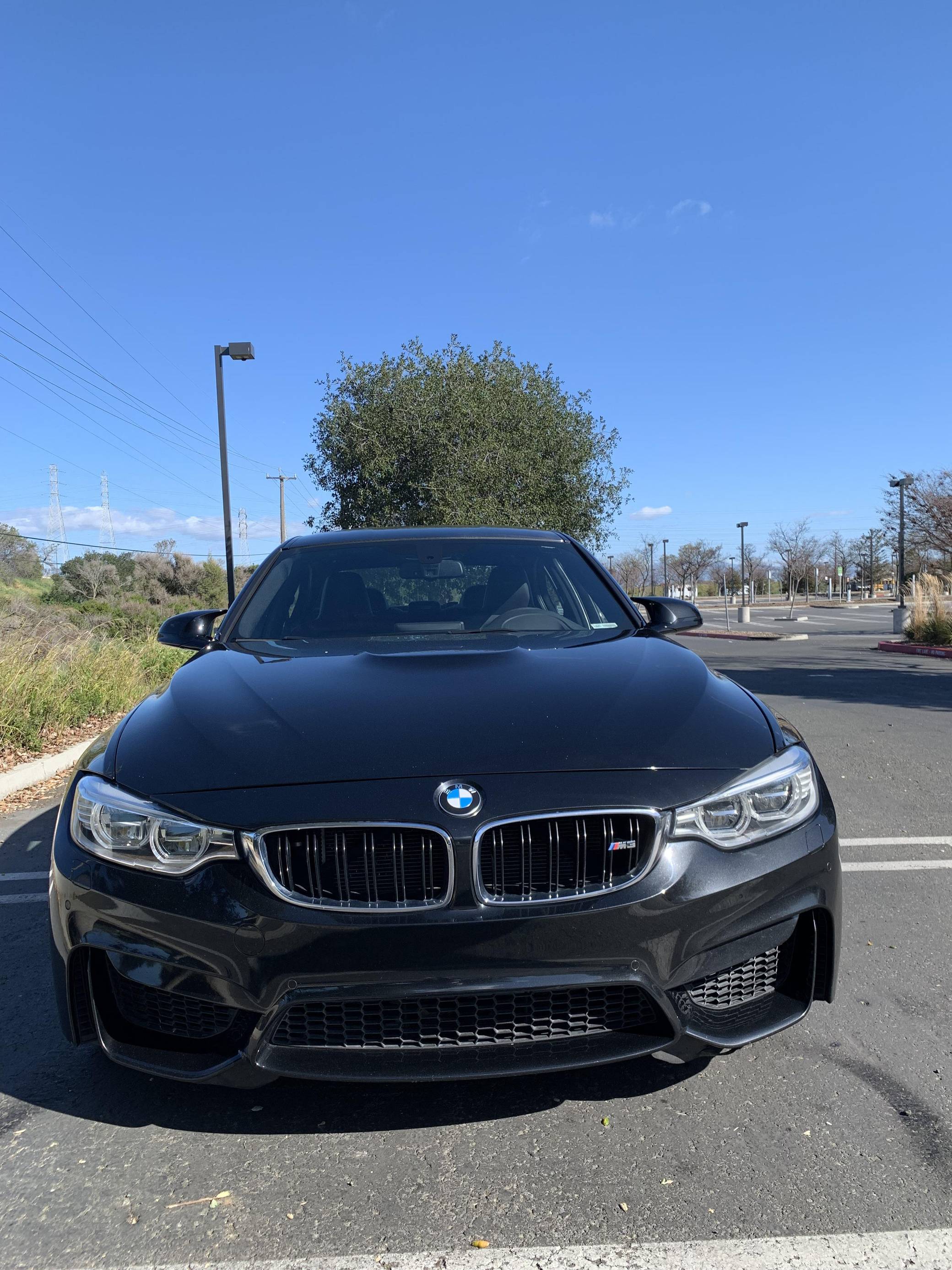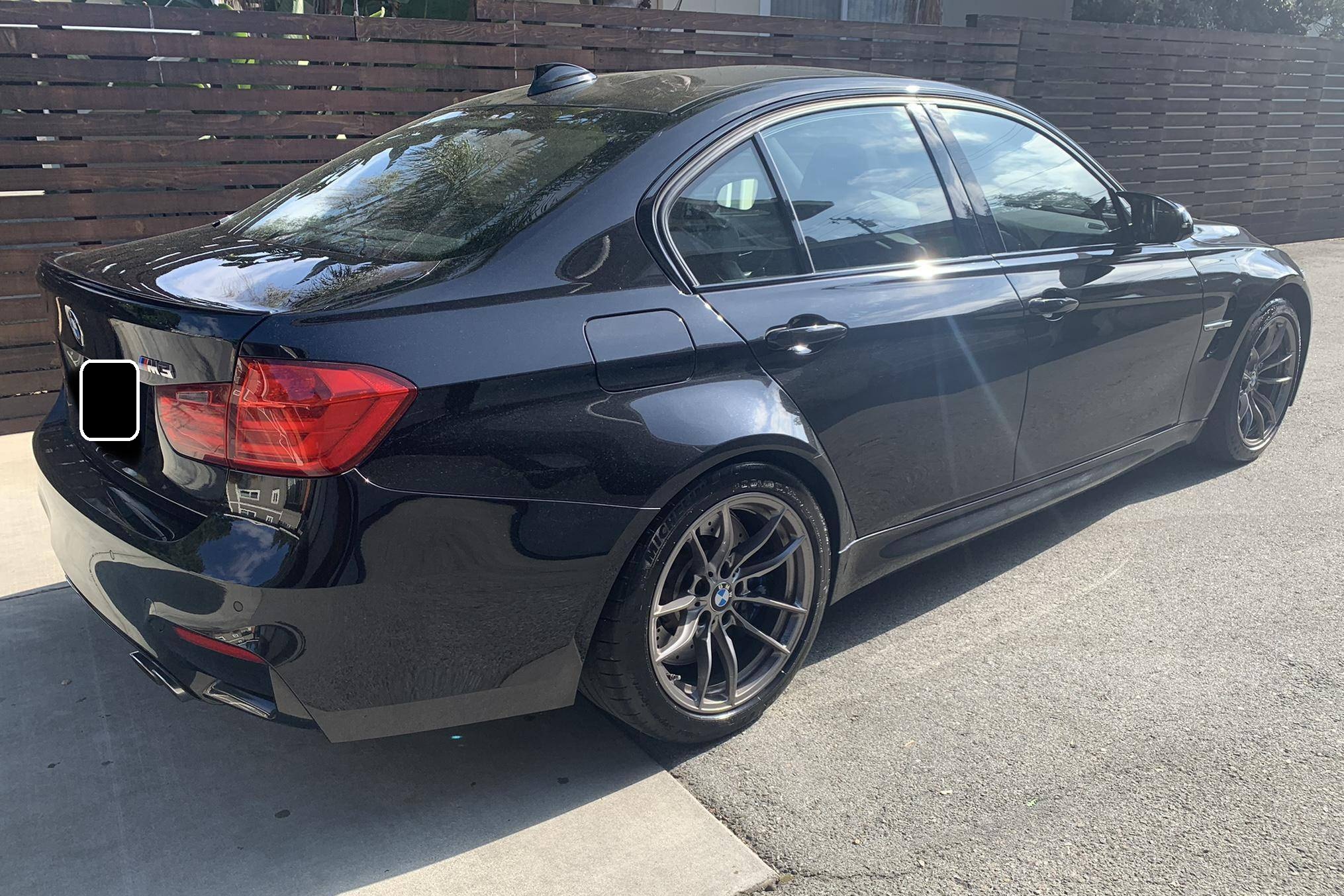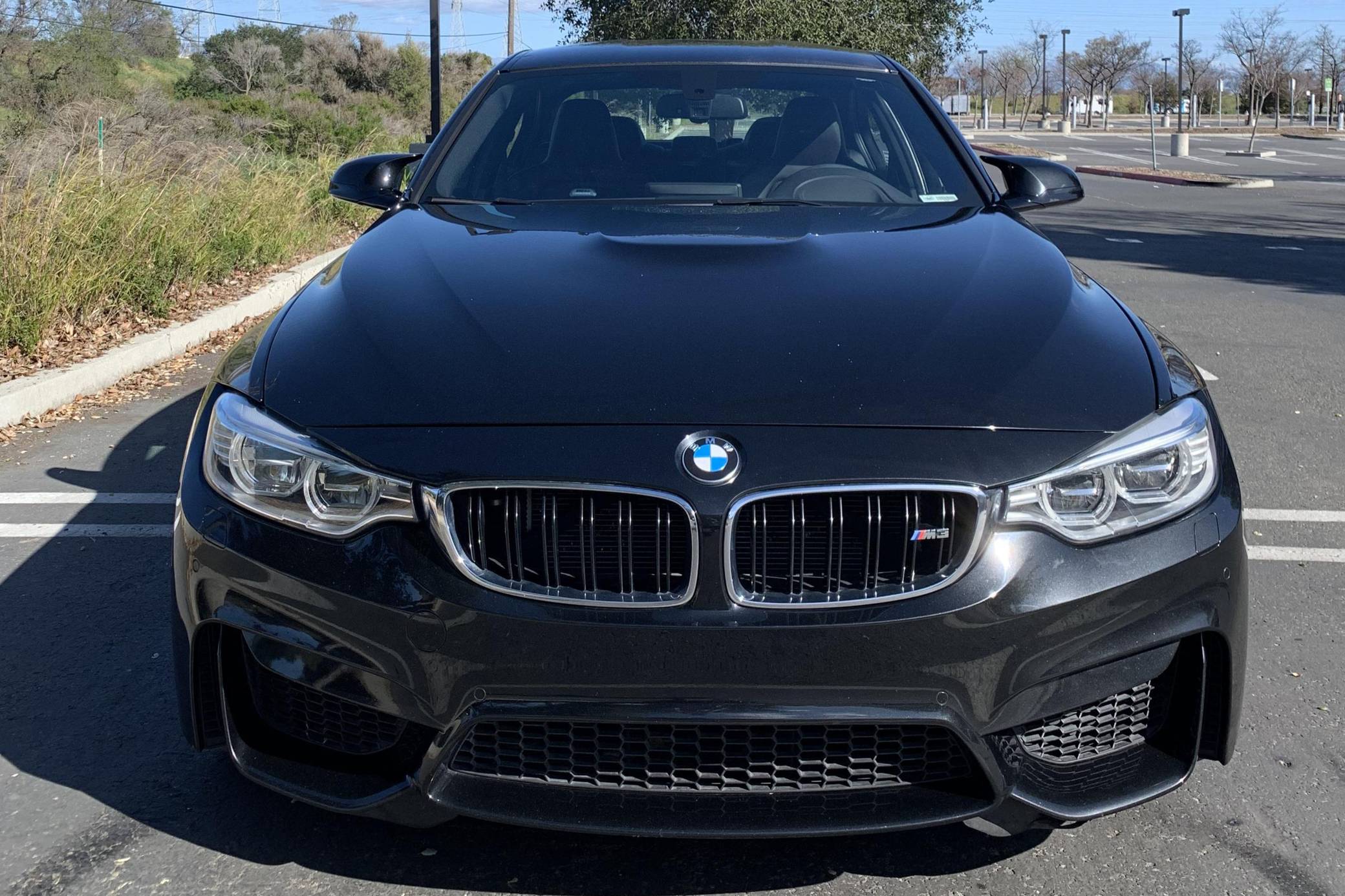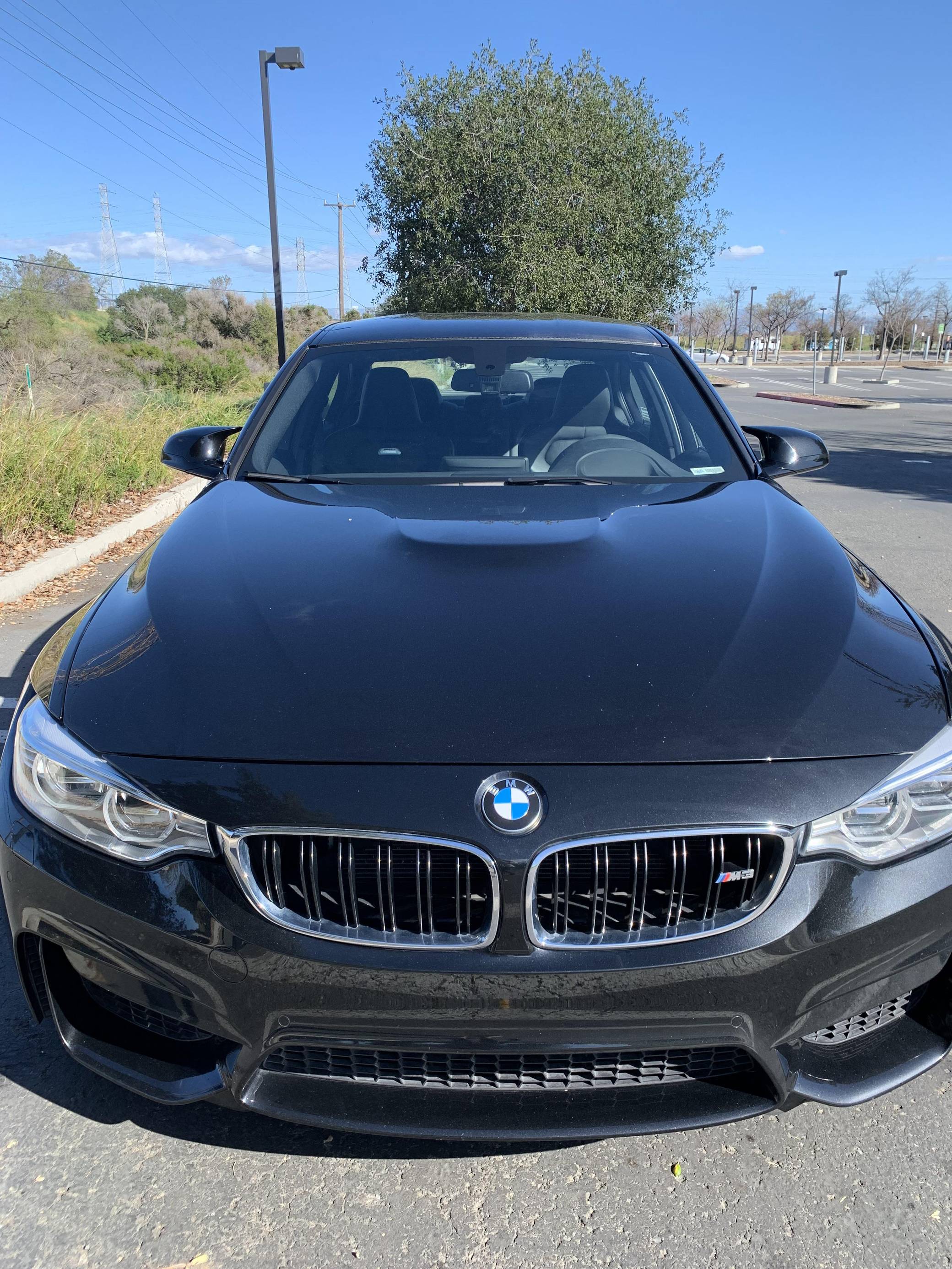 2015 BMW M3, finished in Black Sapphire Metallic with a black interior. This M3's odometer displays roughly 42,300 miles. Factory equipment includes 18-inch "Style 513M" wheels, a carbon fiber roof panel, carbon fiber interior trim, leather upholstery, heated and power-adjustable front seats, heated rear seats, a Harman Kardon surround sound system, front and rear parking sensors, and a head-up display. This car's build sheet is shown in the gallery, and the seller reports no modifications. After the high-revving V8 of the previous generation, the "F80" M3's return to an inline-6 was a breath of recirculated, torque-filled air. The twin-turbo "S55" engine is rated at only 9 more horsepower than the "E90"-generation's V8, but trading a pair of cylinders for turbochargers raises torque by a meaty 111 lb-ft. This generation of the M3 also wore a muscular-looking exterior design, and a carbon fiber roof panel was available to keep weight in check and lower the center of gravity. Production ended in 2018. Power comes from an "S55" 3. 0-liter turbocharged inline-6 engine, rated at 425 horsepower and 406 lb-ft of torque. Power is sent to the rear wheels via a 7-speed automatic transmission.