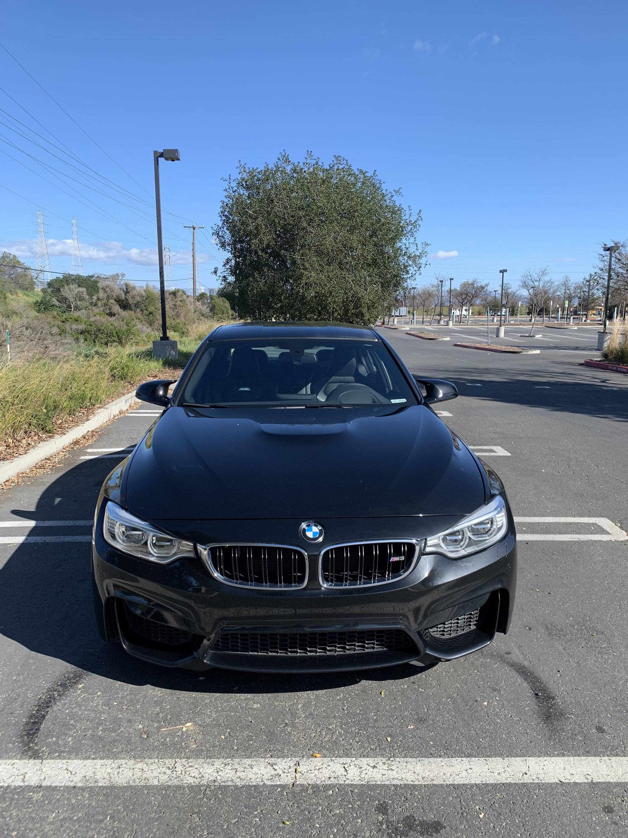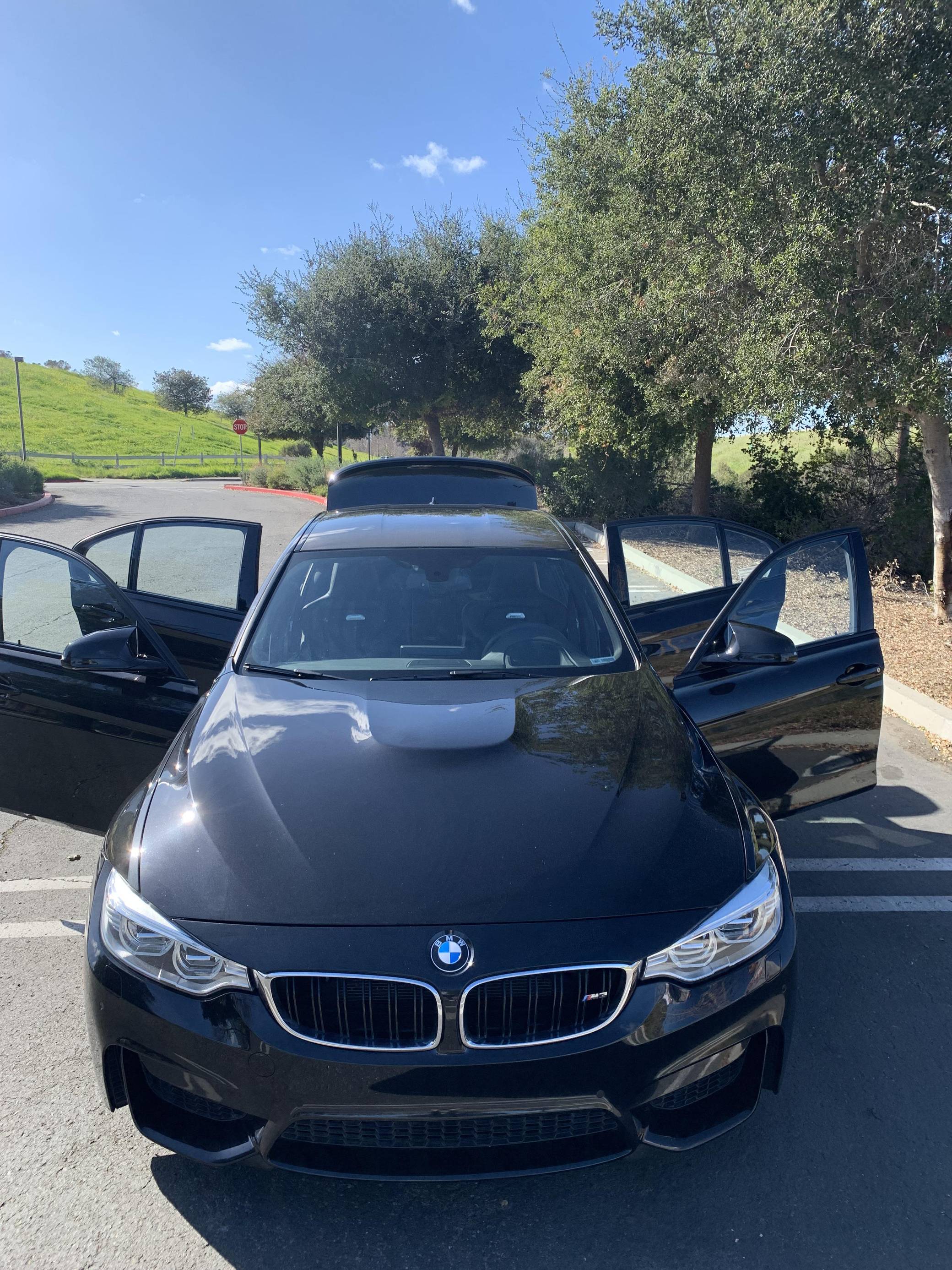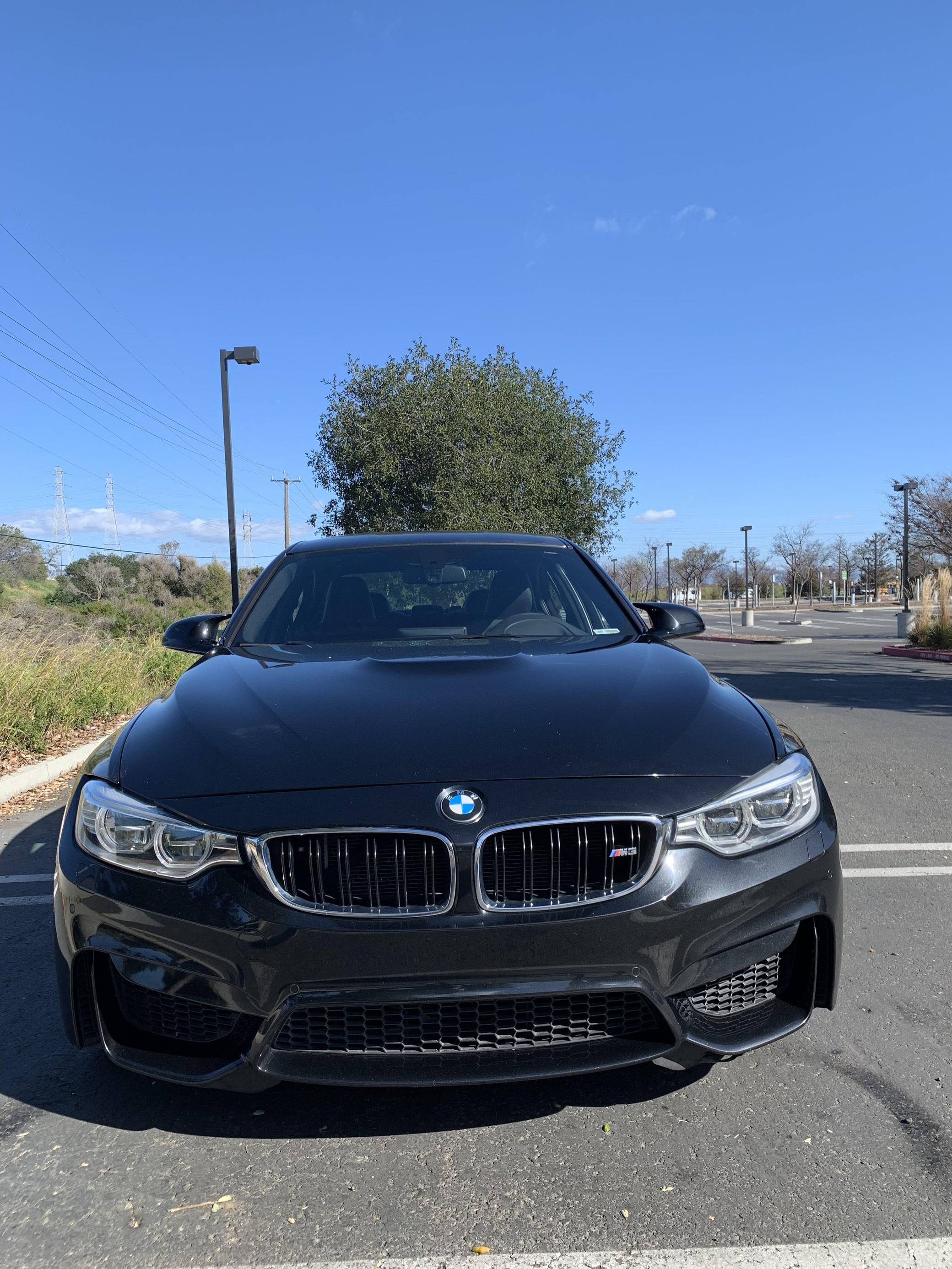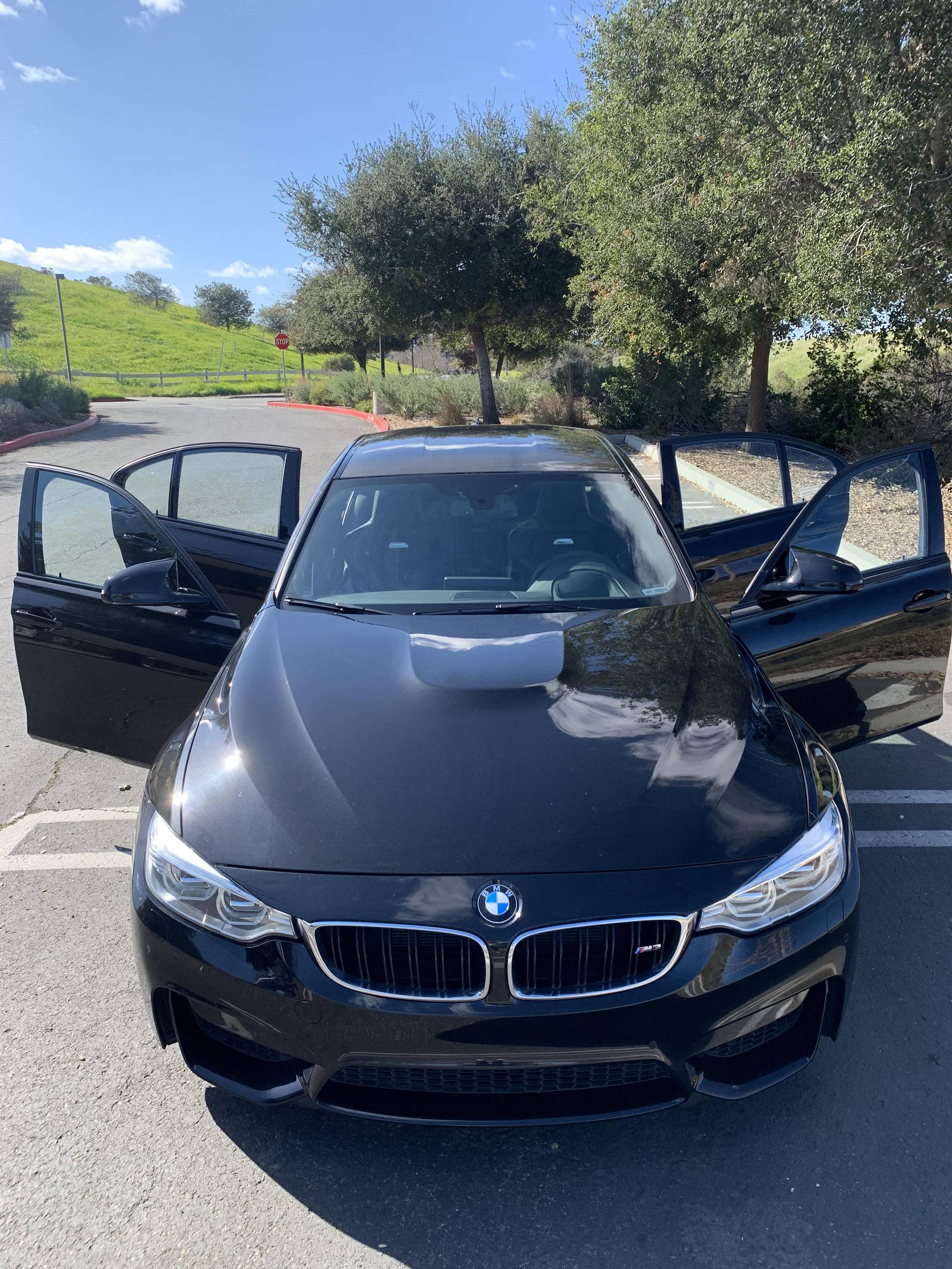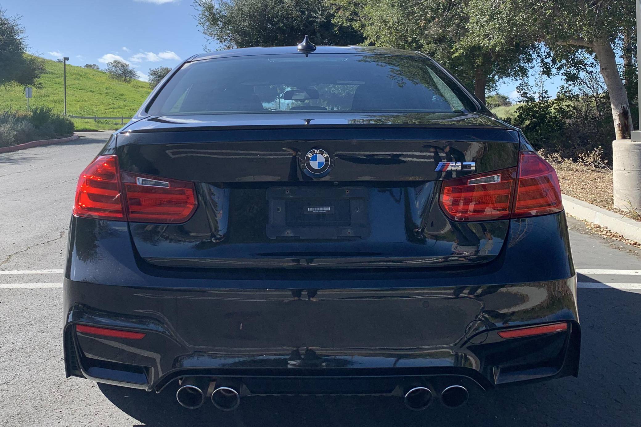 2015 BMW M3, finished in Black Sapphire Metallic with a black interior. This M3's odometer displays roughly 42,300 miles. Factory equipment includes 18-inch "Style 513M" wheels, a carbon fiber roof panel, carbon fiber interior trim, leather upholstery, heated and power-adjustable front seats, heated rear seats, a Harman Kardon surround sound system, front and rear parking sensors, and a head-up display. This car's build sheet is shown in the gallery, and the seller reports no modifications. After the high-revving V8 of the previous generation, the "F80" M3's return to an inline-6 was a breath of recirculated, torque-filled air. The twin-turbo "S55" engine is rated at only 9 more horsepower than the "E90"-generation's V8, but trading a pair of cylinders for turbochargers raises torque by a meaty 111 lb-ft. This generation of the M3 also wore a muscular-looking exterior design, and a carbon fiber roof panel was available to keep weight in check and lower the center of gravity. Production ended in 2018. Power comes from an "S55" 3. 0-liter turbocharged inline-6 engine, rated at 425 horsepower and 406 lb-ft of torque. Power is sent to the rear wheels via a 7-speed automatic transmission.