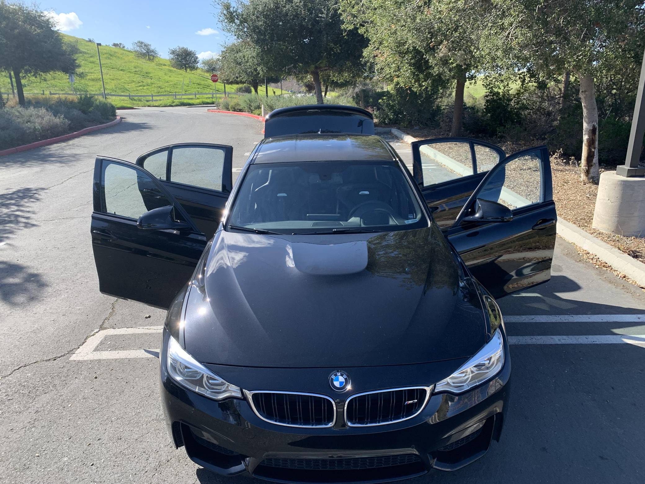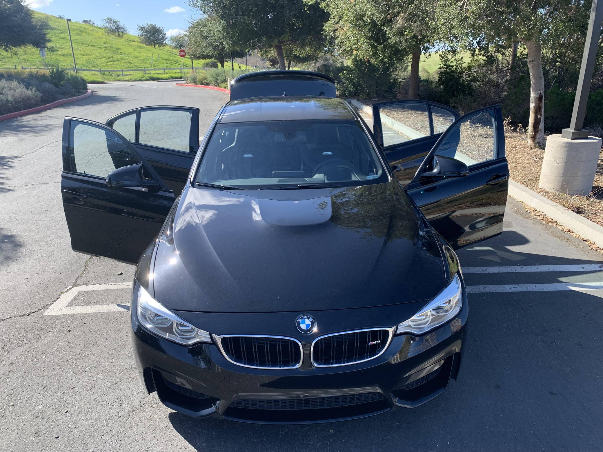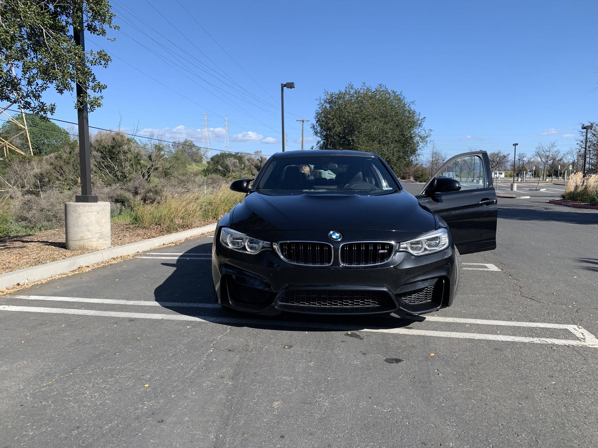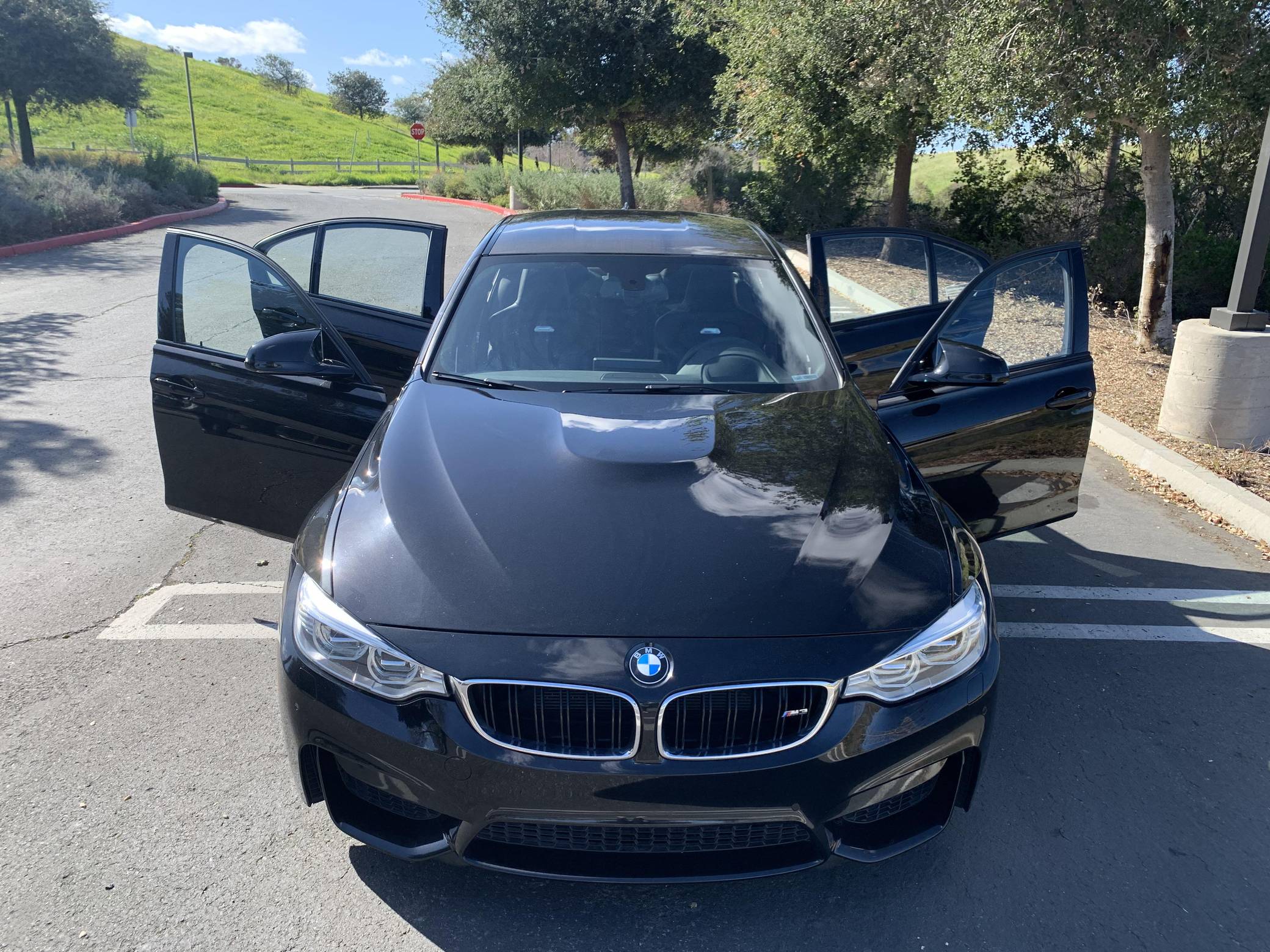 2015 BMW M3, finished in Black Sapphire Metallic with a black interior. This M3's odometer displays roughly 42,300 miles. Factory equipment includes 18-inch "Style 513M" wheels, a carbon fiber roof panel, carbon fiber interior trim, leather upholstery, heated and power-adjustable front seats, heated rear seats, a Harman Kardon surround sound system, front and rear parking sensors, and a head-up display. This car's build sheet is shown in the gallery, and the seller reports no modifications. After the high-revving V8 of the previous generation, the "F80" M3's return to an inline-6 was a breath of recirculated, torque-filled air. The twin-turbo "S55" engine is rated at only 9 more horsepower than the "E90"-generation's V8, but trading a pair of cylinders for turbochargers raises torque by a meaty 111 lb-ft. This generation of the M3 also wore a muscular-looking exterior design, and a carbon fiber roof panel was available to keep weight in check and lower the center of gravity. Production ended in 2018. Power comes from an "S55" 3. 0-liter turbocharged inline-6 engine, rated at 425 horsepower and 406 lb-ft of torque. Power is sent to the rear wheels via a 7-speed automatic transmission.