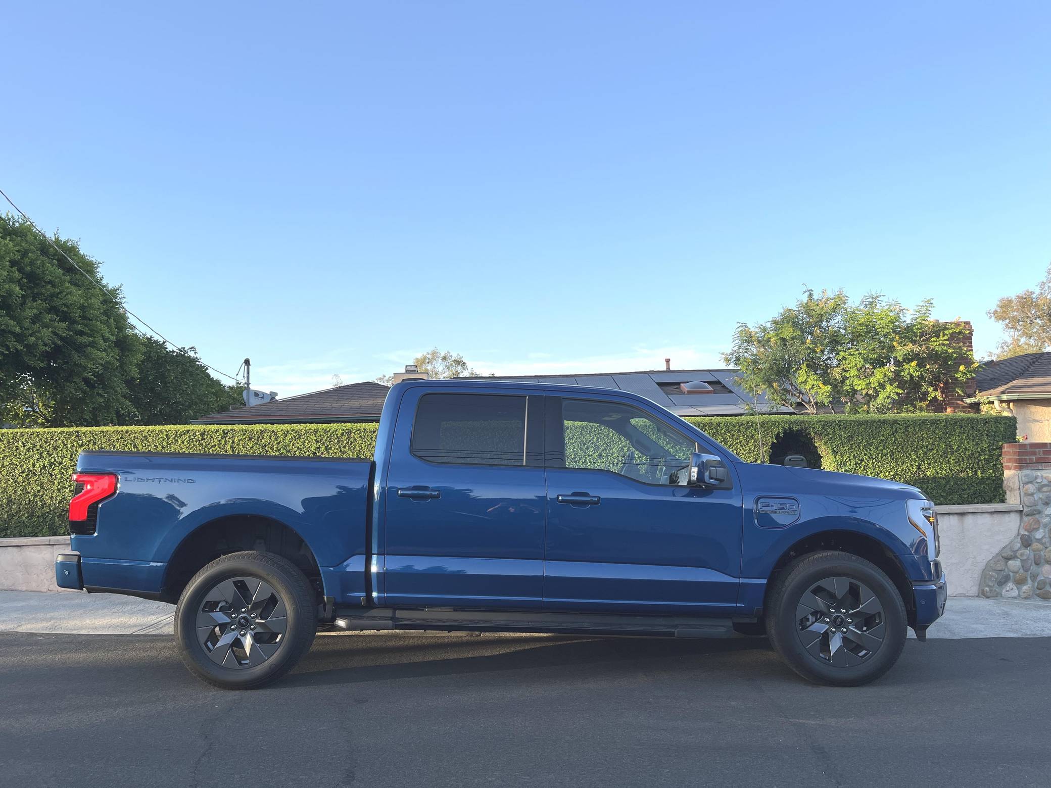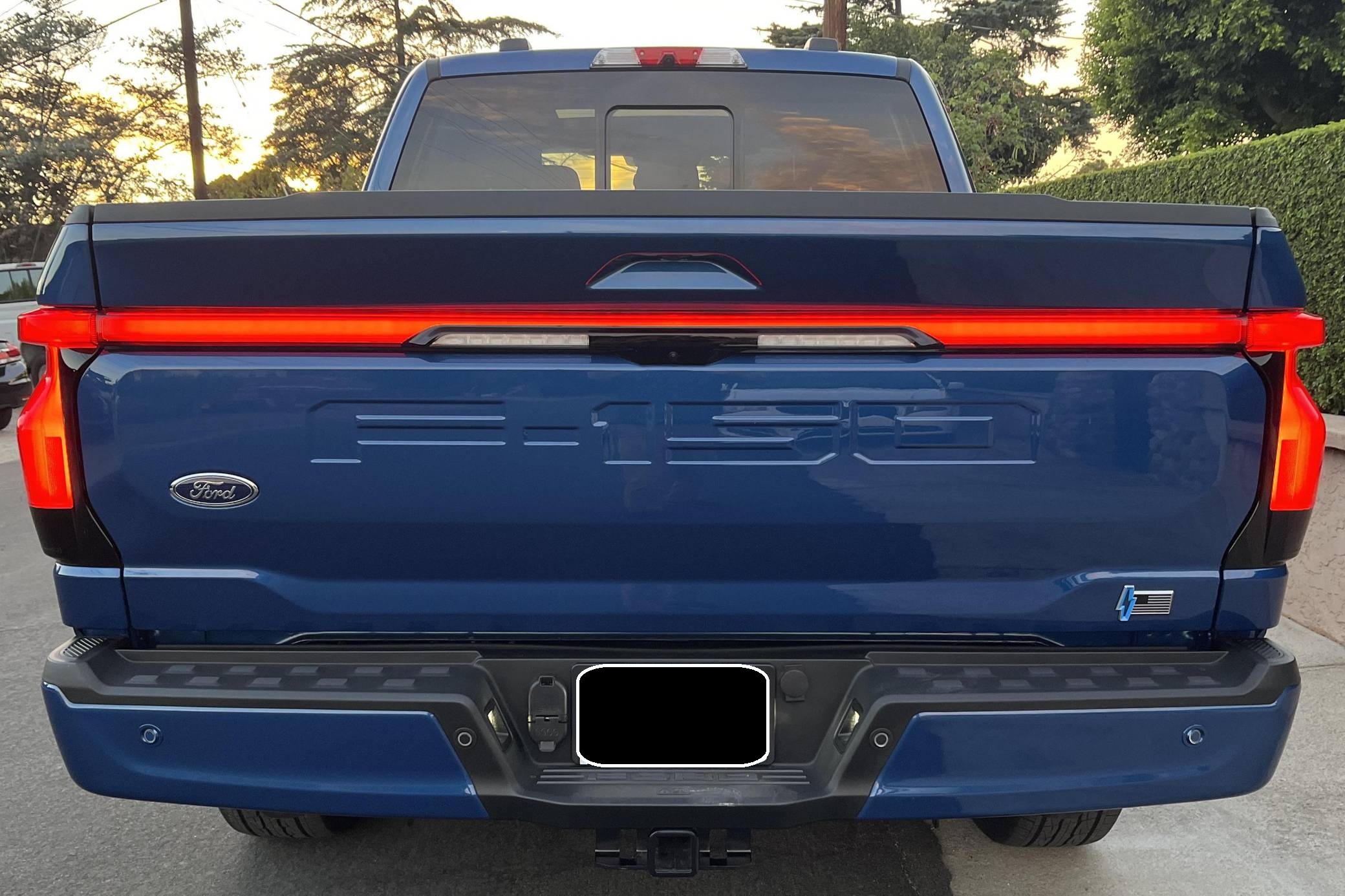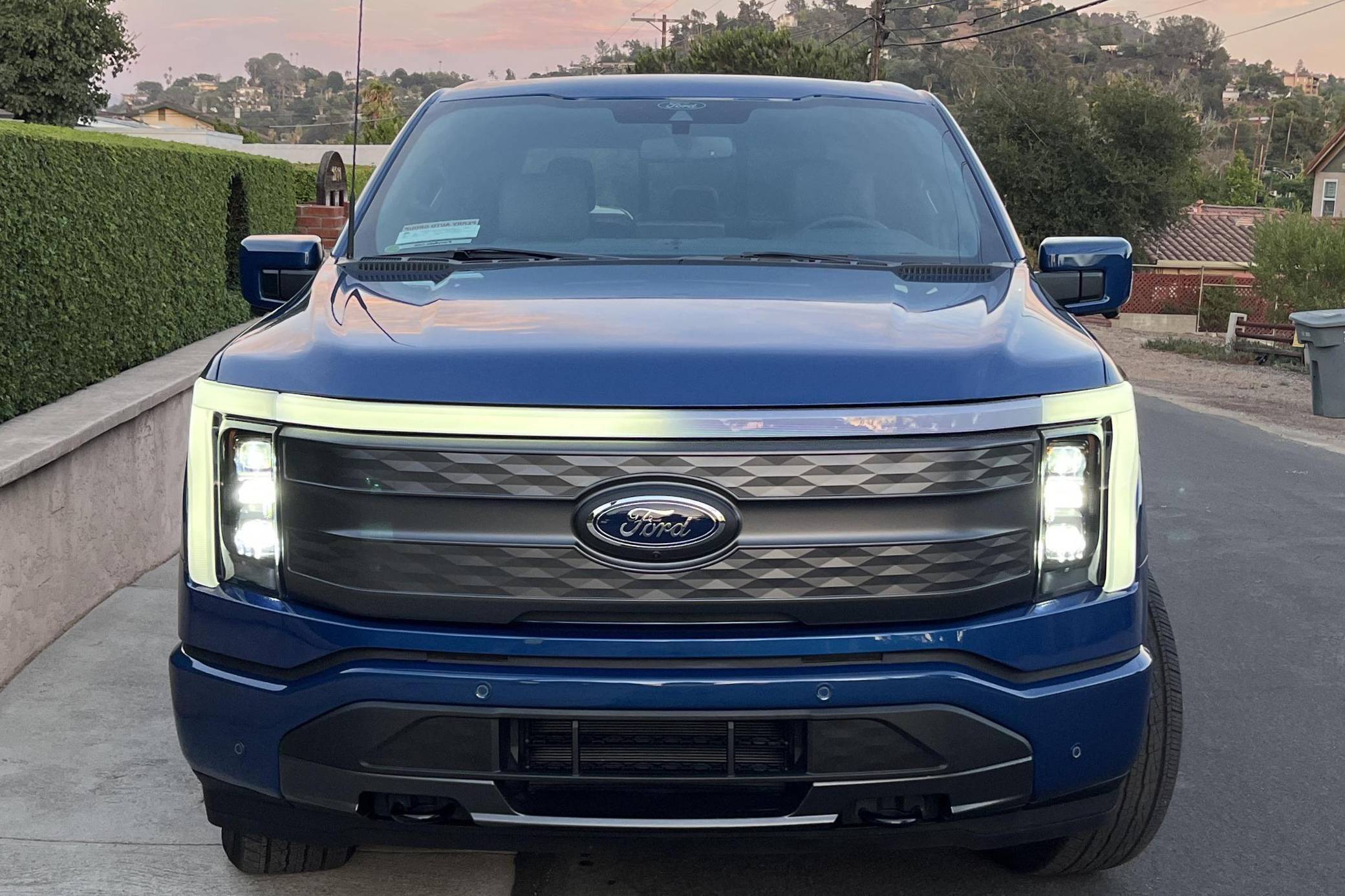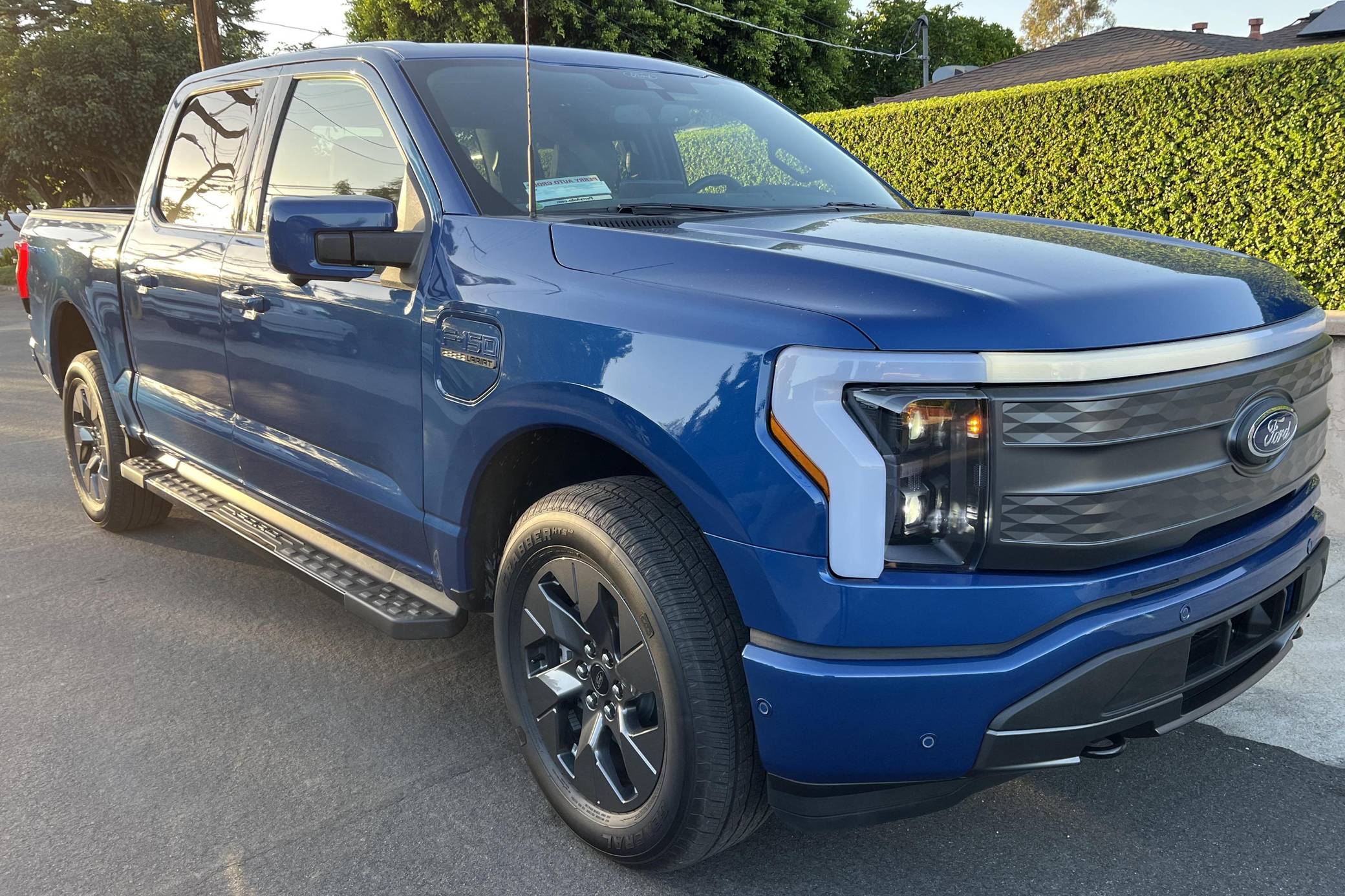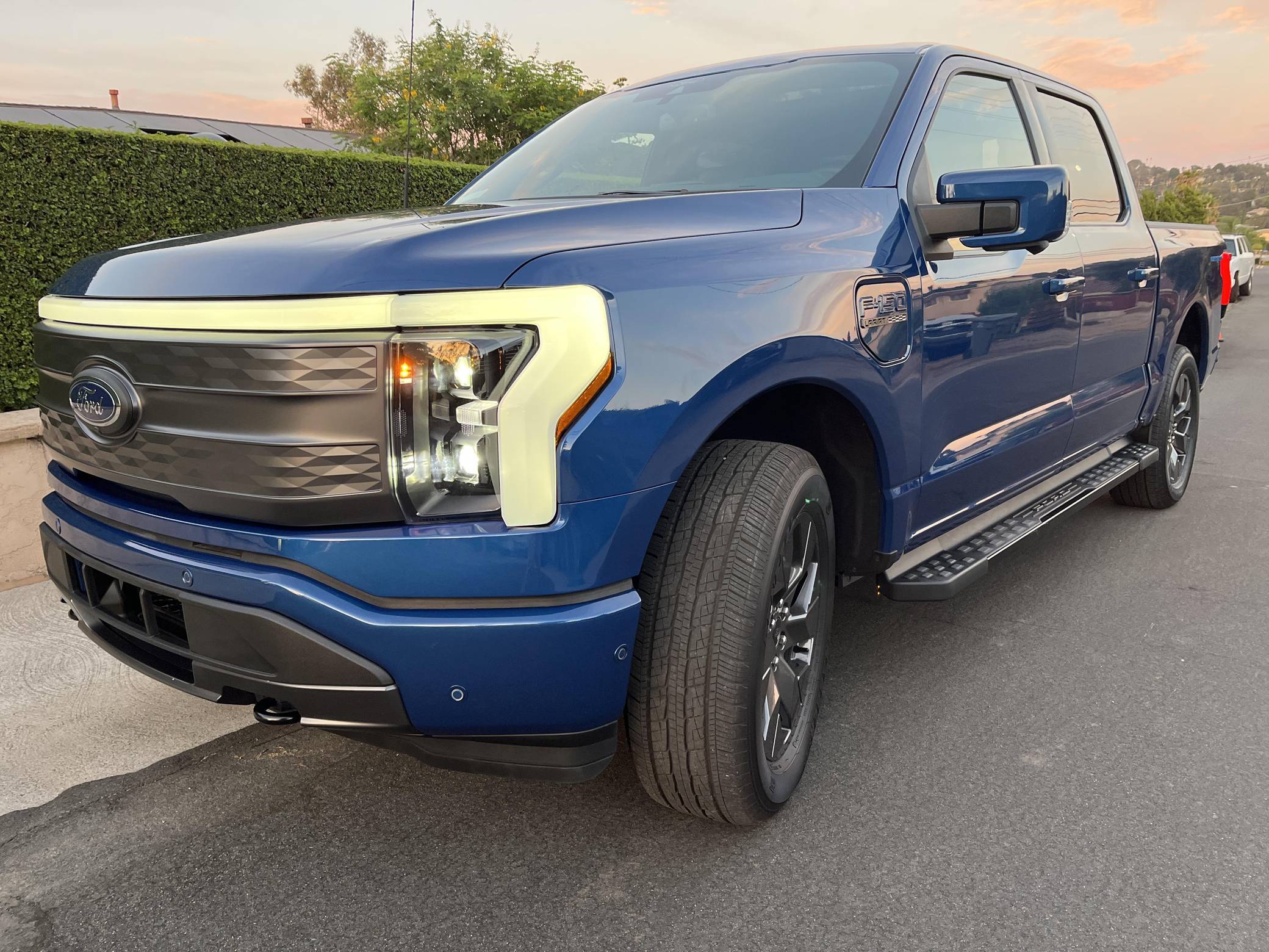 2022 Ford F-150 Lightning Lariat, finished in Atlast Blue Metallic with a black interior. The odometer on this F-150 Lightning currently displays 700 miles. Factory equipment includes 20-inch wheels, LED headlights, a power-operated tailgate with an integrated assist step, leather upholstery, heated, ventilated, and power-adjustable front seats, a heated steering wheel, power-adjustable pedals, a 15. 5-inch touchscreen for the SYNC4 infotainment system, and an 8-speaker B&O sound system. The seller reports no modifications. Formerly used on a high-performance variant of the F-150, the Lightning nameplate was revived for the 2022 model year by Ford's first series-produced electric truck. Every member of the line-up offers dual electric motors for through-the-road all-wheel drive, but buyers have two battery packs to choose from and driving range varies accordingly. Power comes from a pair of electric motors (one per axle), which draw electricity from a 131-kilowatt-hour lithium-ion battery pack to zap all four wheels with 580 horsepower and 775 lb-ft of torque. The Lightning earned a maximum driving range of 320 miles from the EPA.