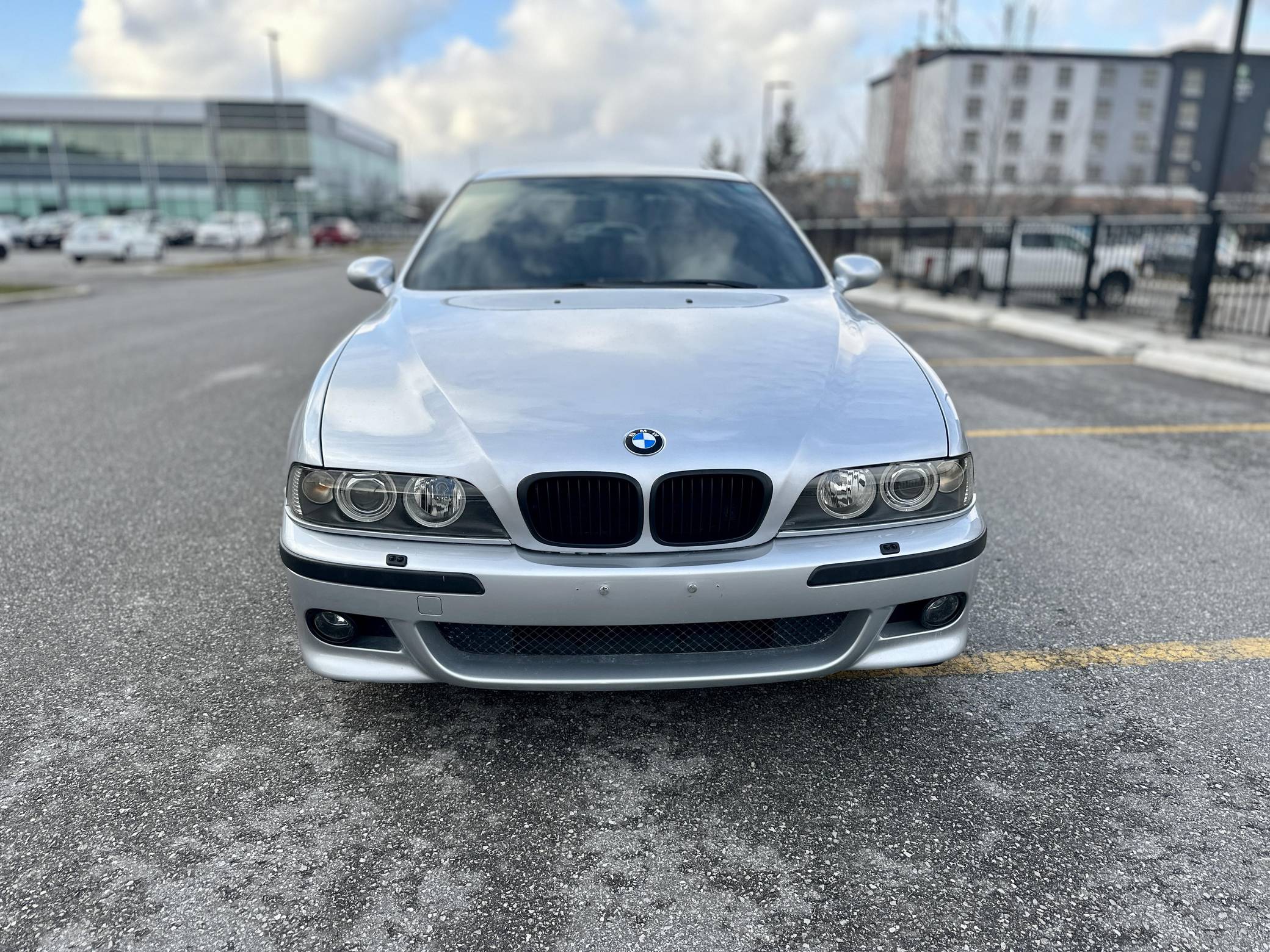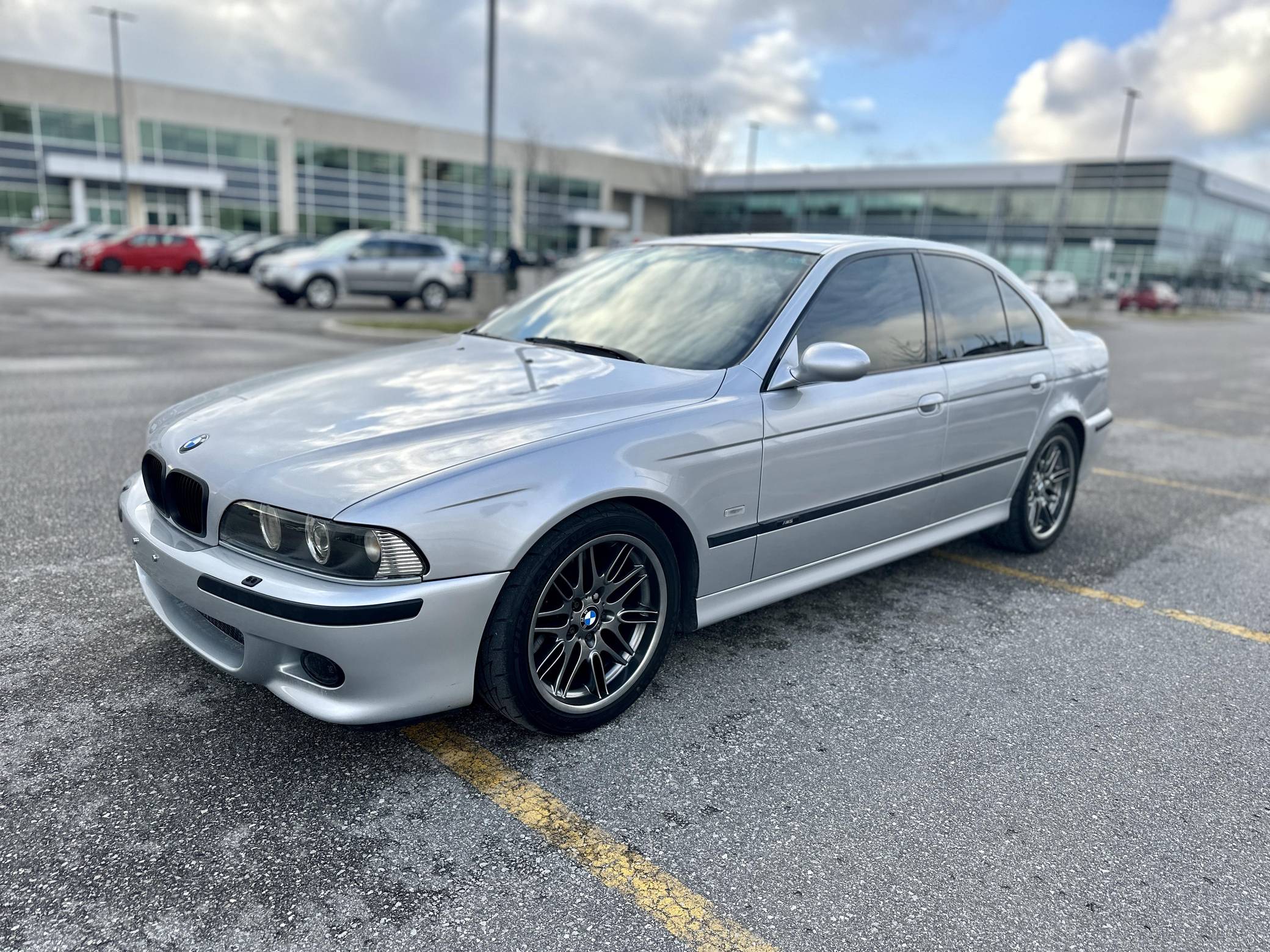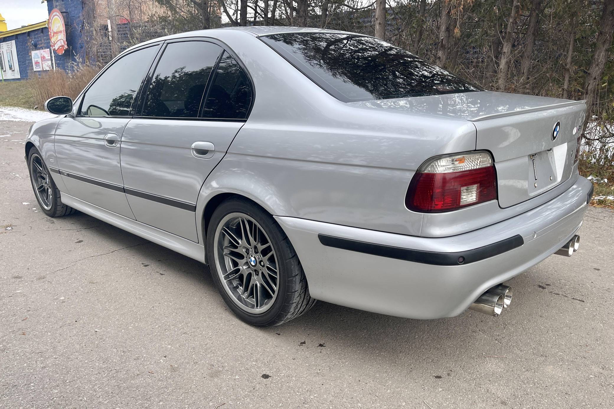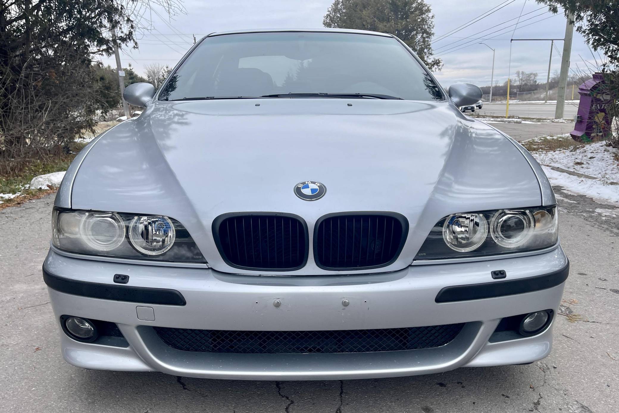 THIS… is a 2000 BMW M5, finished in Titanium Silver Metallic with a black and Le Mans Blue interior. It's equipped with a metric instrument cluster, and its odometer shows about 211,600 kilometers, which represents around 131,500 miles. The attached U. S. According to the build sheet provided in the gallery, factory equipment includes 18-inch Style 65 wheels, Park Distance Control, headlight washers, a power sunroof, heated and power-adjustable front seats with driver-side memory, and a 6-disc CD changer. Modifications reported by the seller include MagnaFlow exhaust components, black kidney grilles, aftermarket headlights, tinted windows, and an aftermarket steering wheel, shift knob, and shift boot. Heralded by brand enthusiasts as the best of its breed, the "E39"-generation M5 arrived in America for the 2000 model year. It was the first of several M-developed cars powered by a V8 engine, and it was exclusively available with a 6-speed manual transmission. Car & Driver crowned it "the most desirable sedan in the world" in 2000. Power comes from an "S62" 4. 9-liter V8, rated at 394 horsepower and 369 lb-ft of torque. Output is sent to the rear wheels via a 6-speed manual transmission.