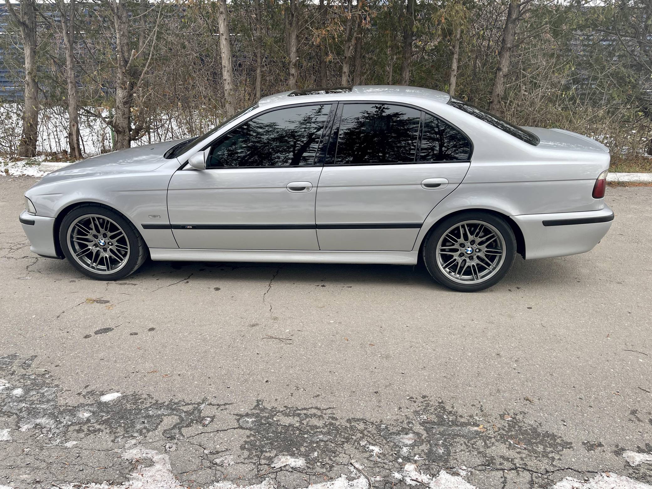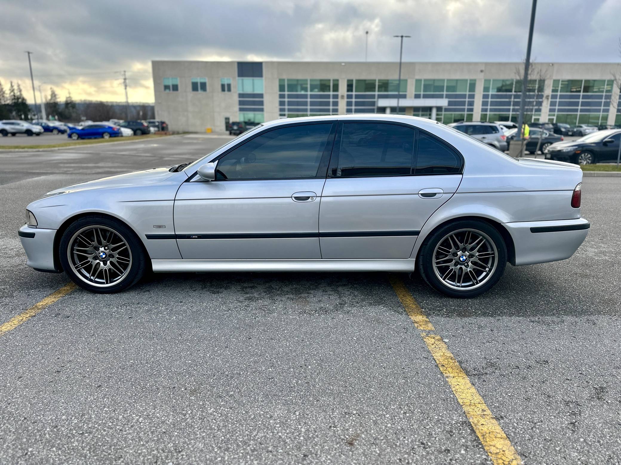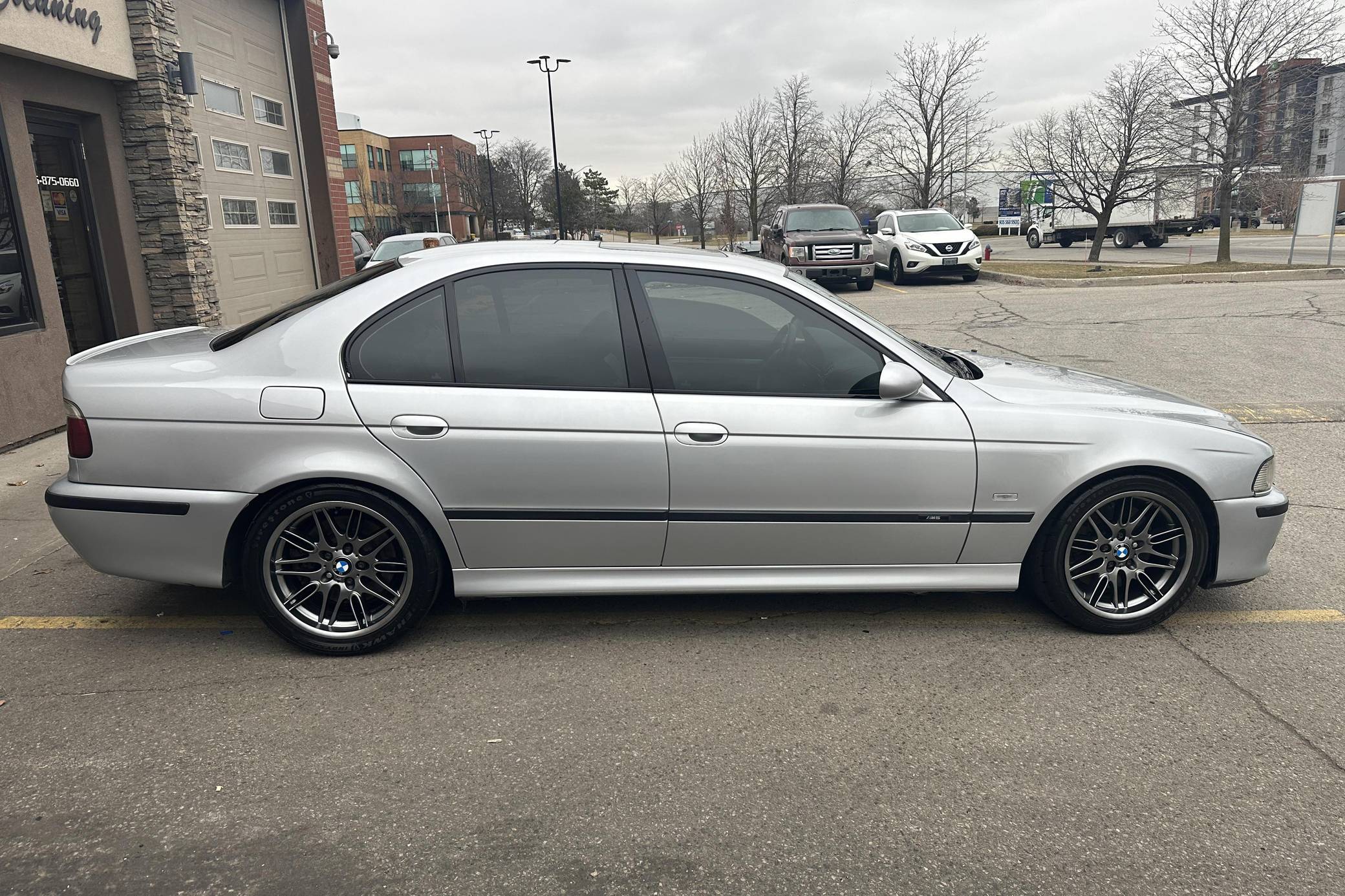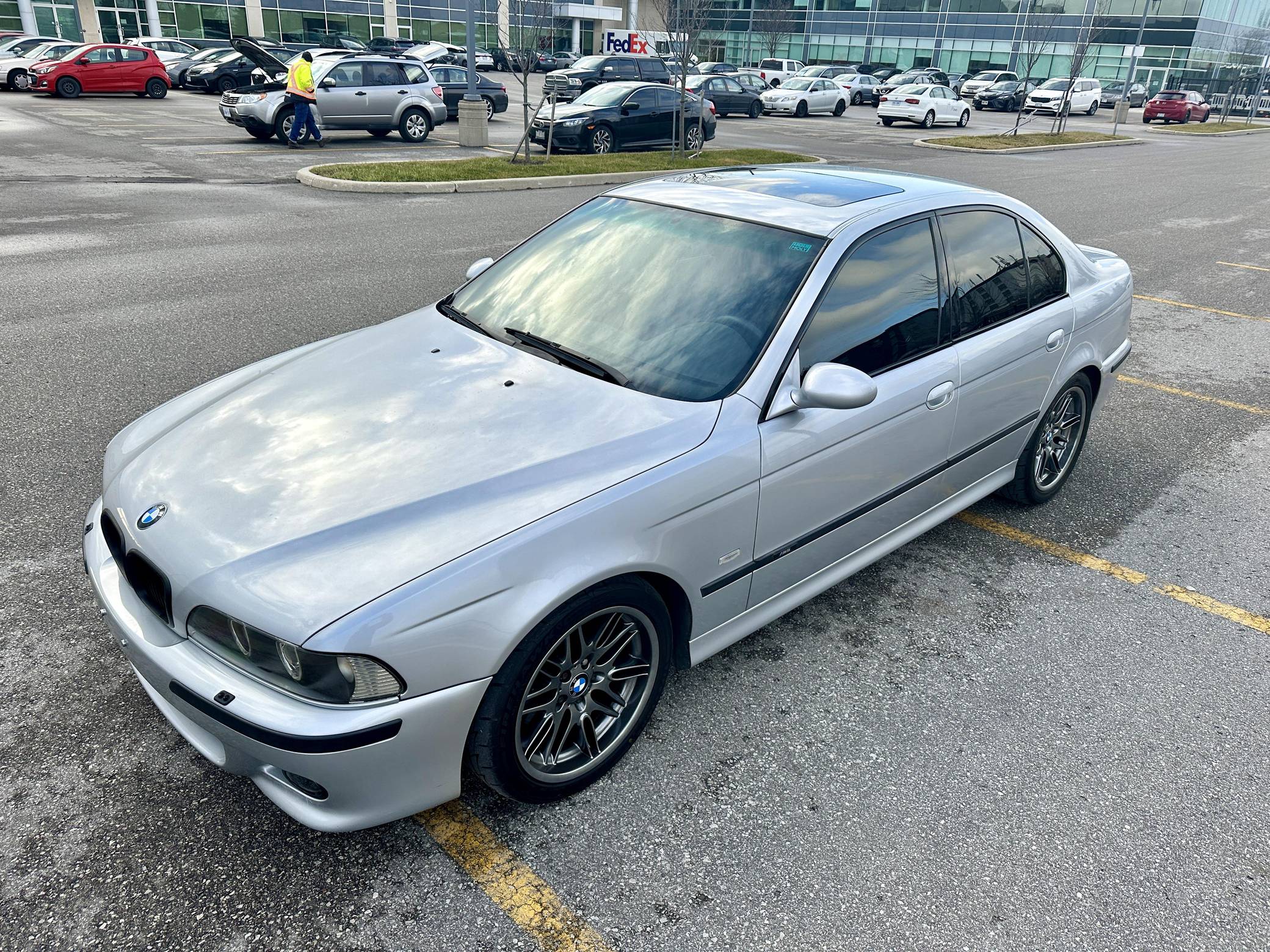THIS… is a 2000 BMW M5, finished in Titanium Silver Metallic with a black and Le Mans Blue interior. It's equipped with a metric instrument cluster, and its odometer shows about 211,600 kilometers, which represents around 131,500 miles. The attached U. S. According to the build sheet provided in the gallery, factory equipment includes 18-inch Style 65 wheels, Park Distance Control, headlight washers, a power sunroof, heated and power-adjustable front seats with driver-side memory, and a 6-disc CD changer. Modifications reported by the seller include MagnaFlow exhaust components, black kidney grilles, aftermarket headlights, tinted windows, and an aftermarket steering wheel, shift knob, and shift boot. Heralded by brand enthusiasts as the best of its breed, the "E39"-generation M5 arrived in America for the 2000 model year. It was the first of several M-developed cars powered by a V8 engine, and it was exclusively available with a 6-speed manual transmission. Car & Driver crowned it "the most desirable sedan in the world" in 2000. Power comes from an "S62" 4. 9-liter V8, rated at 394 horsepower and 369 lb-ft of torque. Output is sent to the rear wheels via a 6-speed manual transmission.