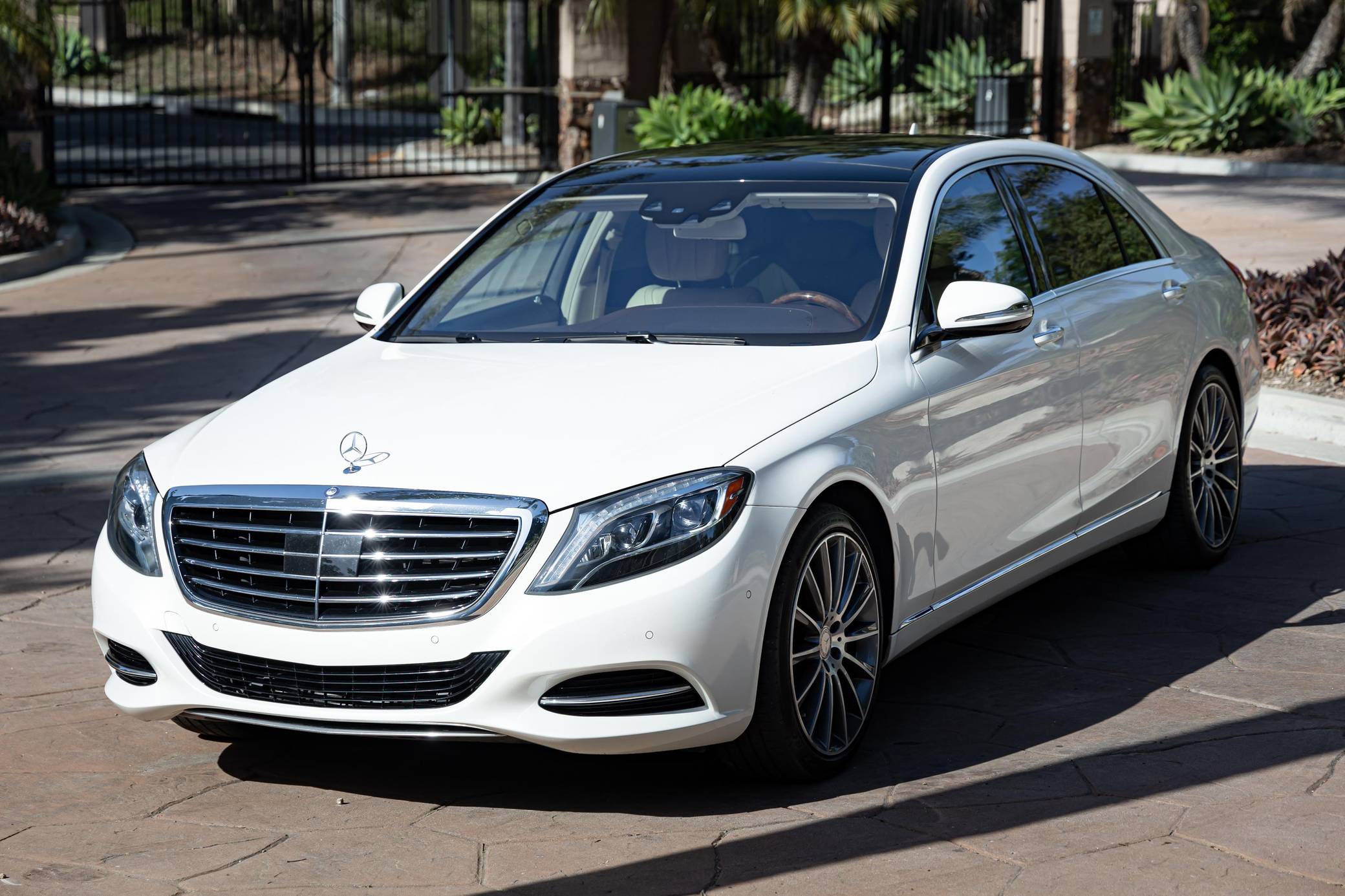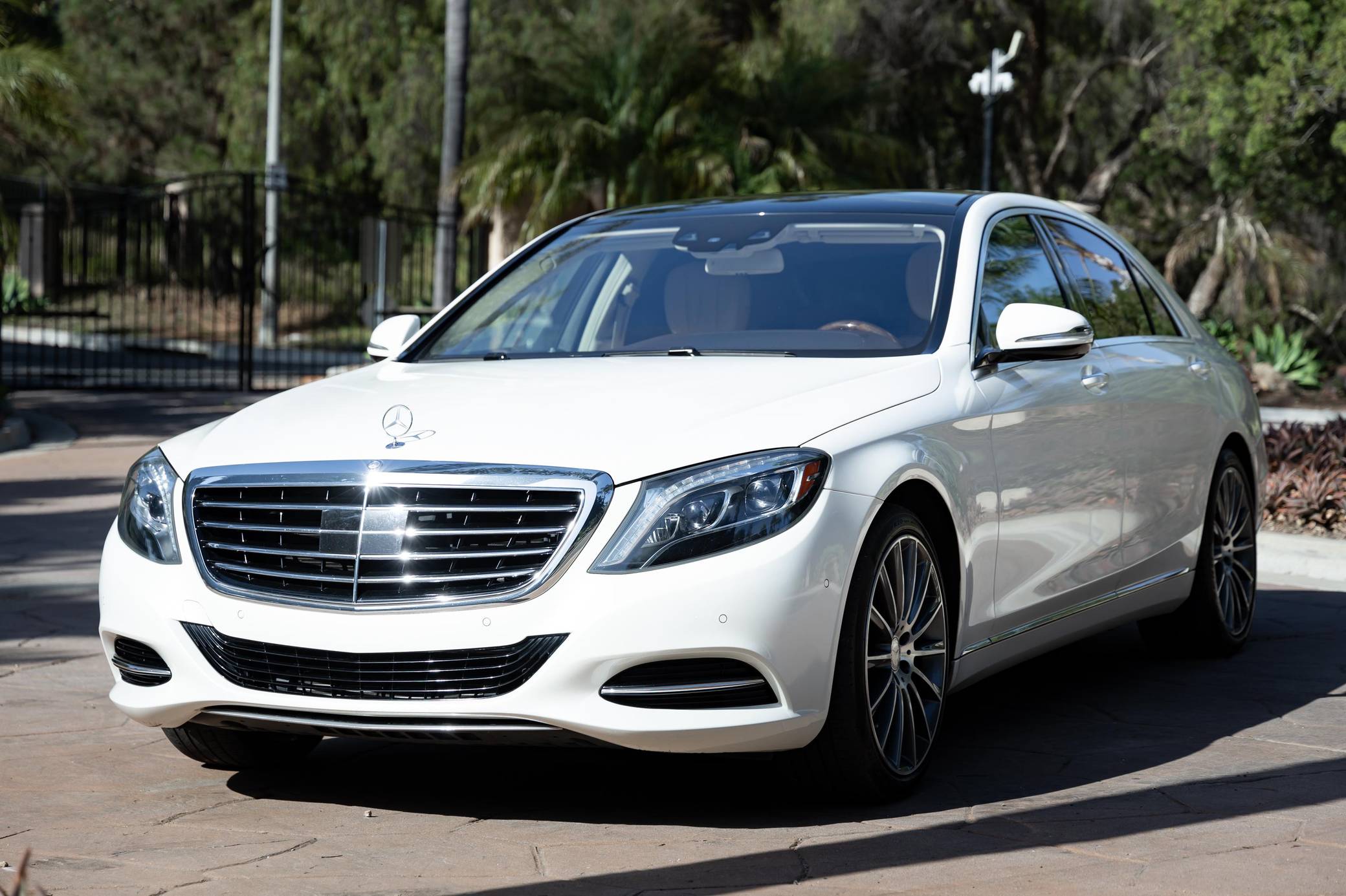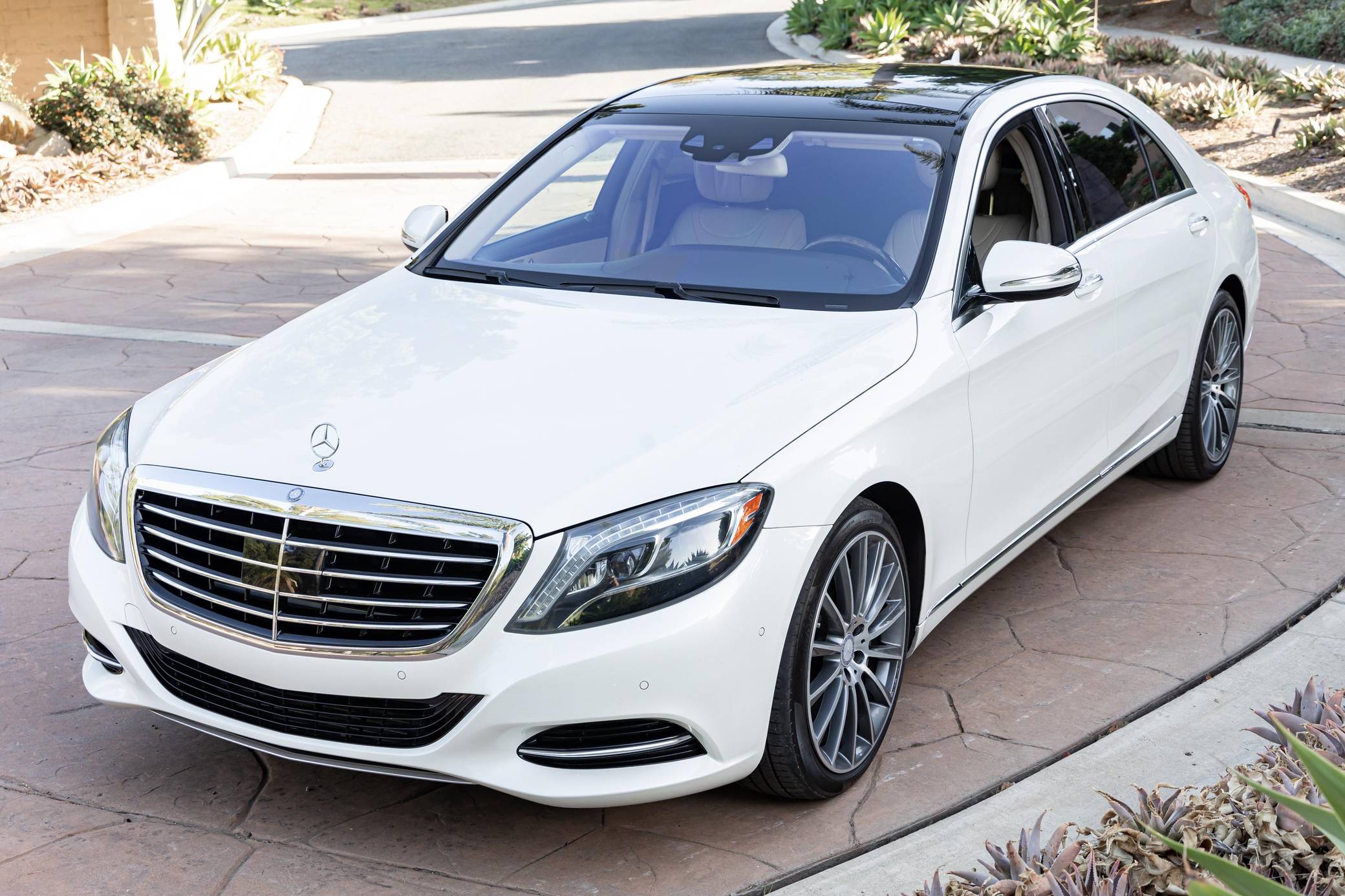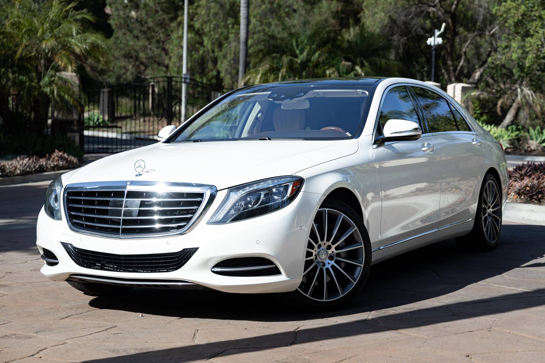 2014 Mercedes-Benz S550, finished in Diamond White Metallic with a Silk Beige and Espresso Brown interior Factory equipment includes the Premium and Driver Assistance packages, 20-inch AMG wheels, dynamic LED headlights, a sunroof, leather upholstery, a Burmester premium sound system, and more as listed below. Modifications are limited to 20-inch AMG wheels. Mercedes-Benz introduced the W222-generation S-Class for the 2014 model year. It was bigger than its predecessor, packed with state-of-the-art tech features, and characterized by a more streamlined design. It was developed from the inside out, according to Mercedes-Benz, and it set a new segment benchmark in interior comfort. Production ended in 2020. Power comes from an "M278" turbocharged 4. 7-liter V8, rated at 449 horsepower and 516 lb-ft of torque. Output is sent to the rear wheels via a 7-speed automatic transmission.