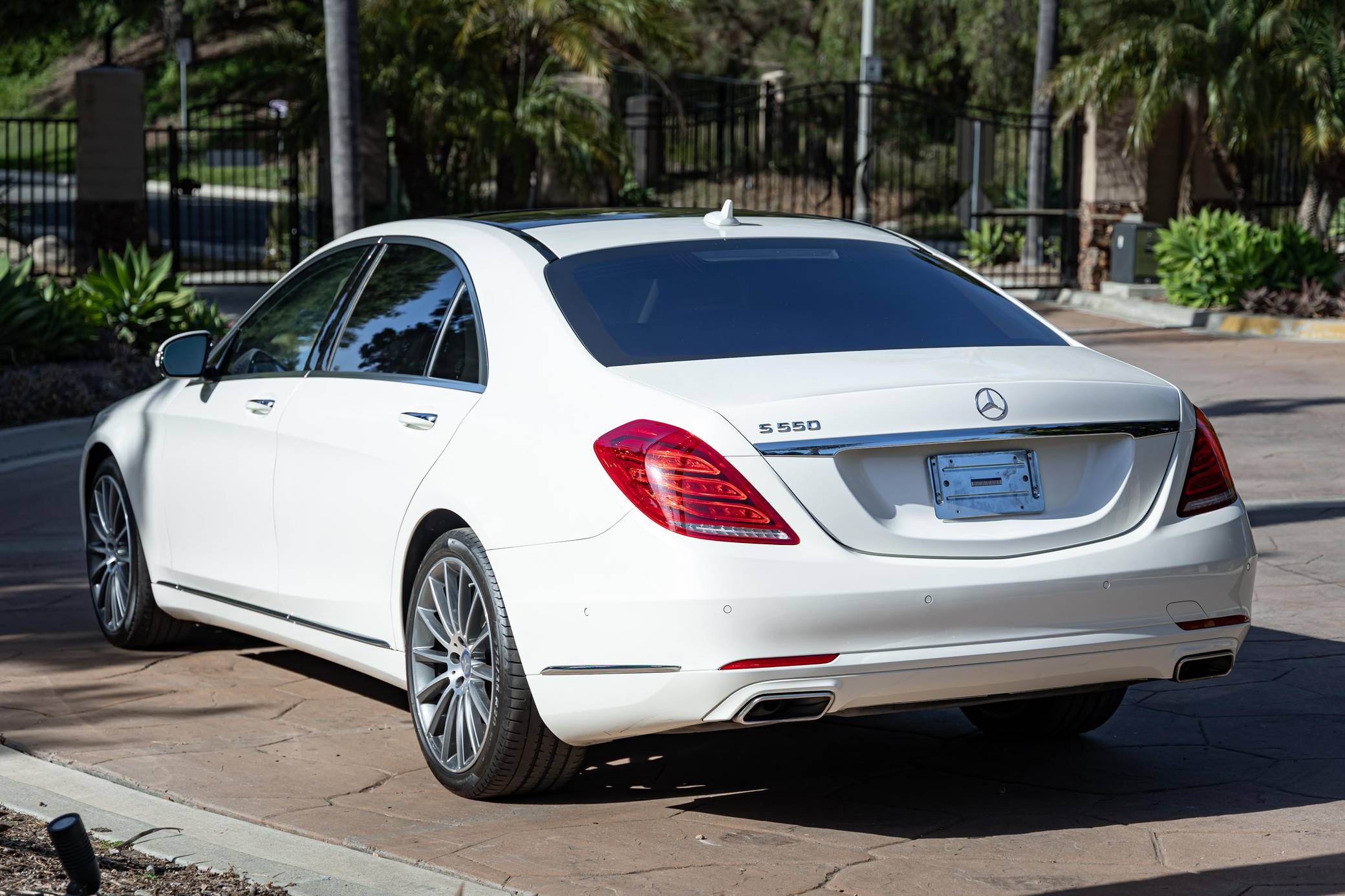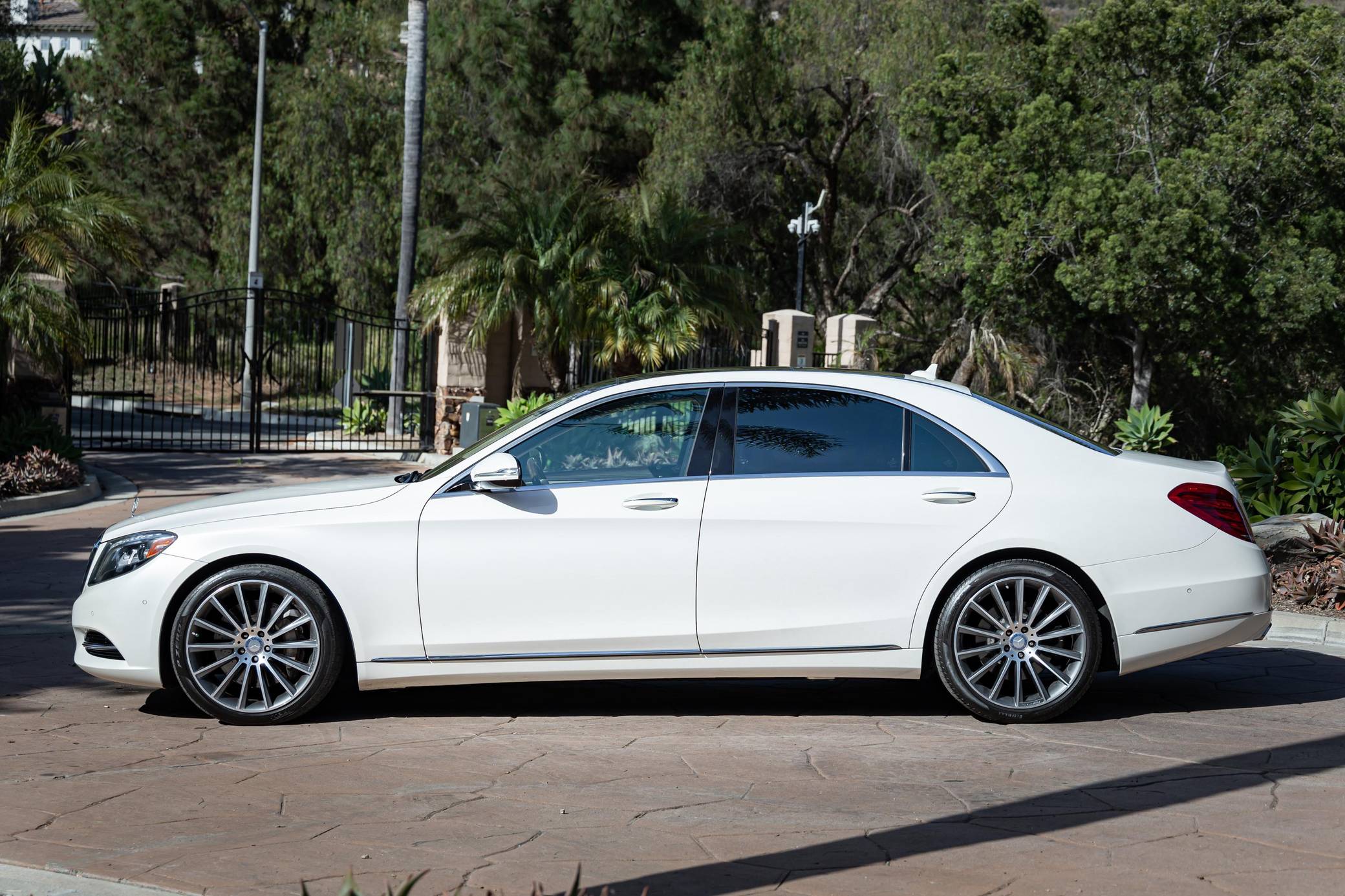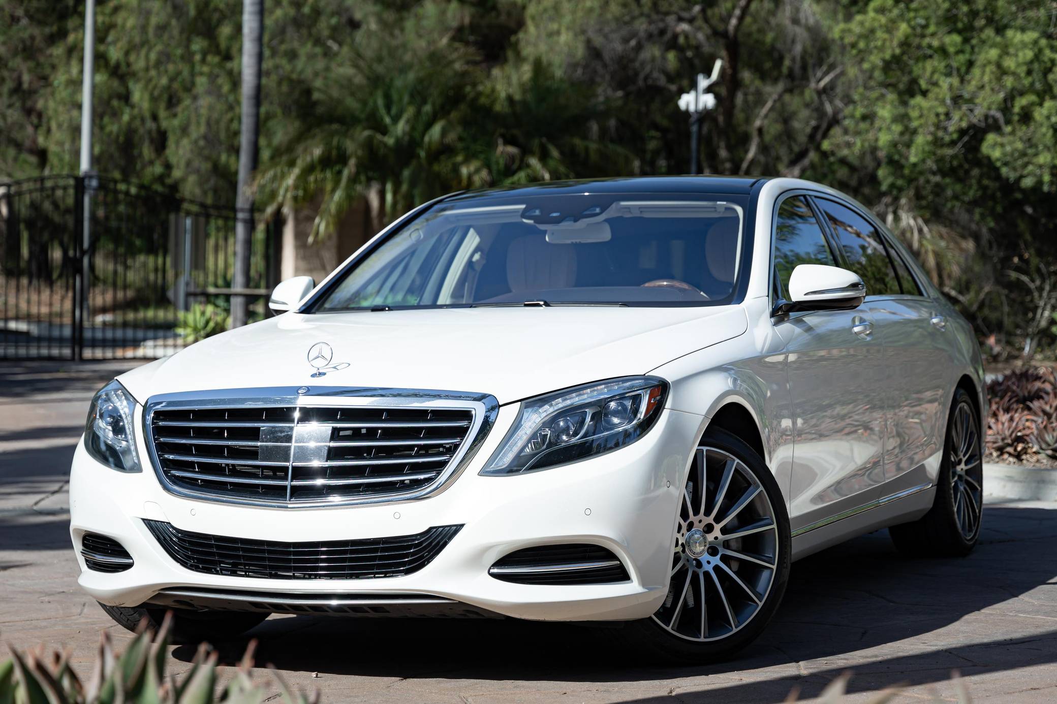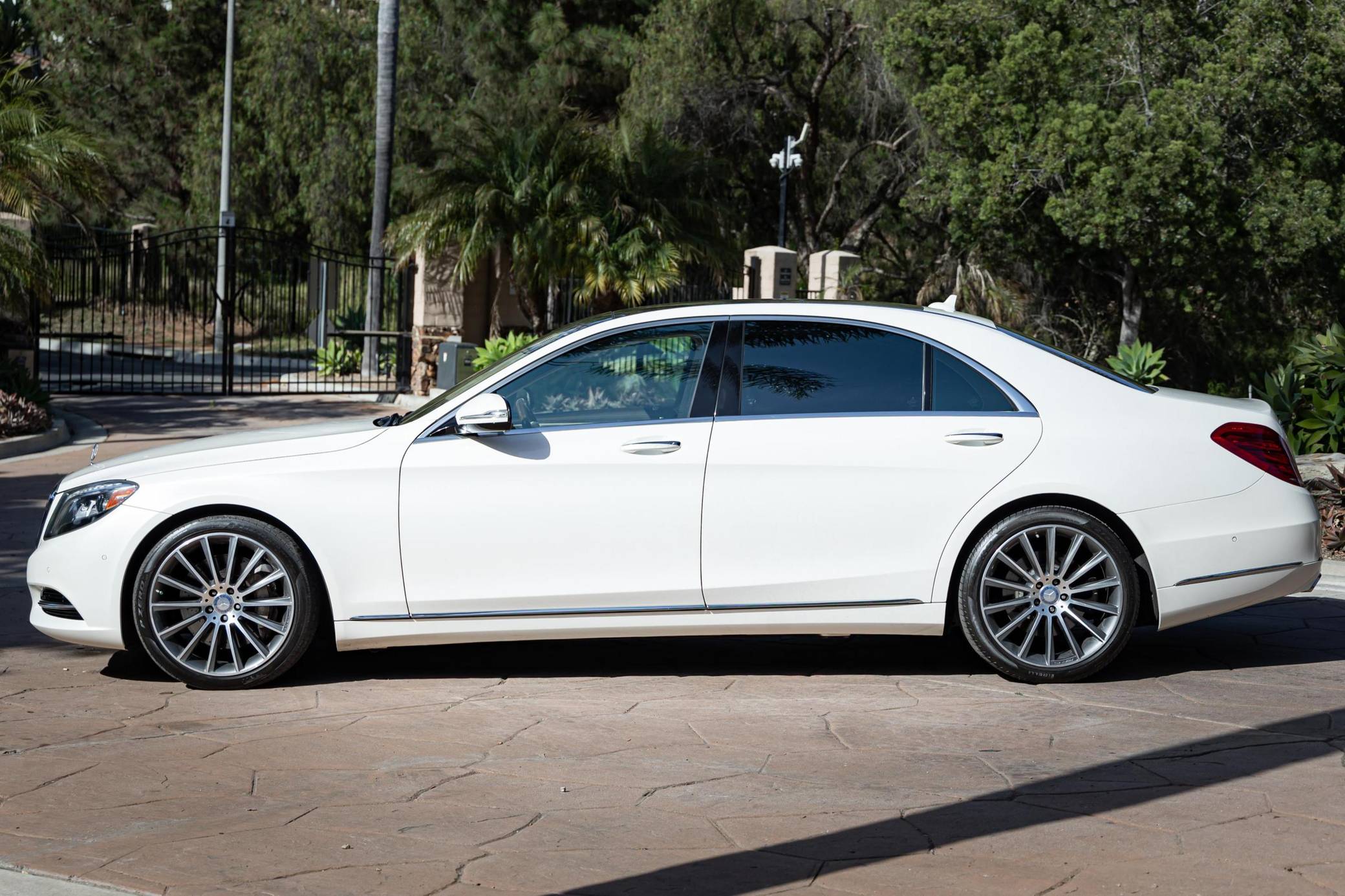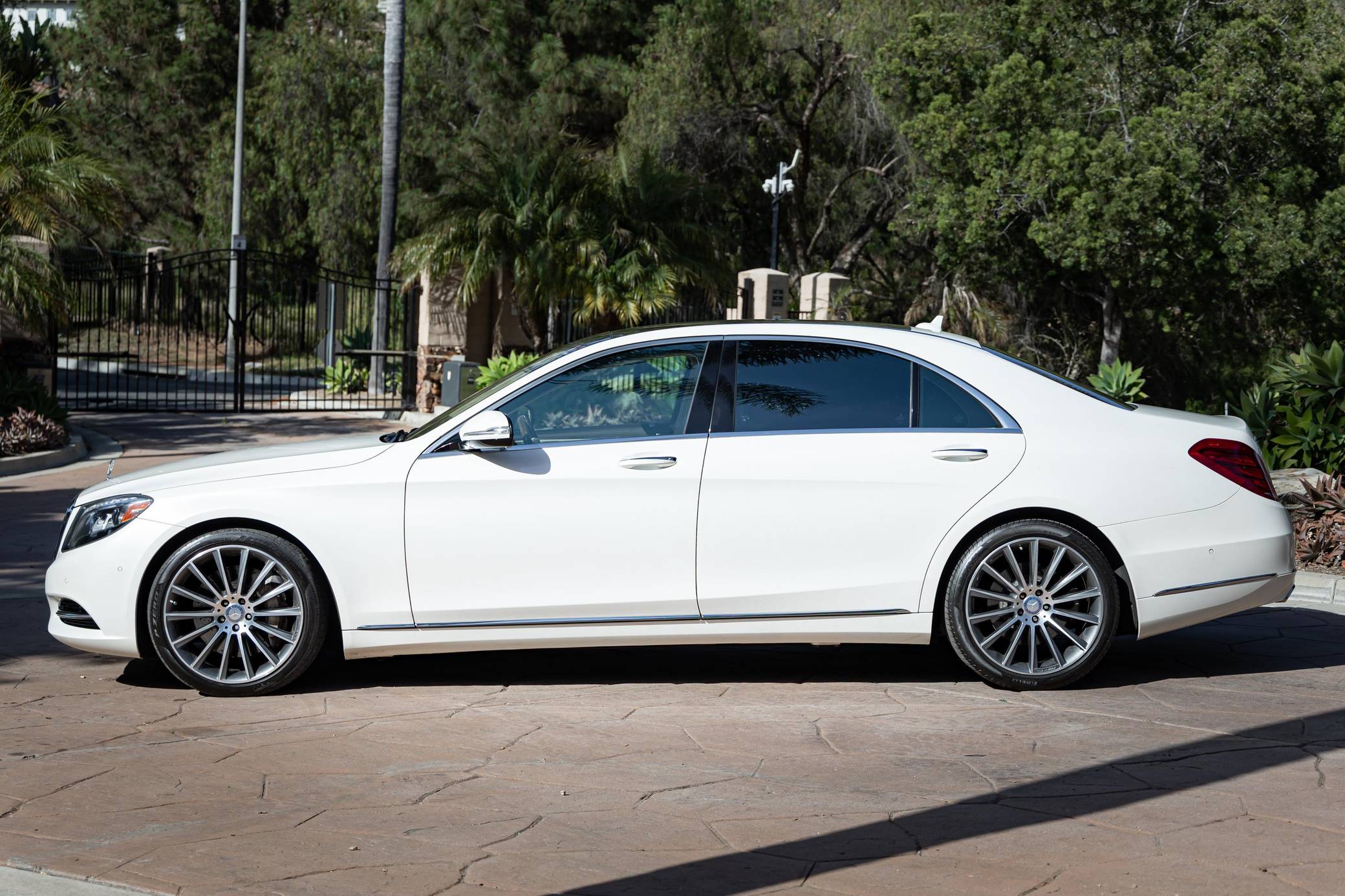 2014 Mercedes-Benz S550, finished in Diamond White Metallic with a Silk Beige and Espresso Brown interior Factory equipment includes the Premium and Driver Assistance packages, 20-inch AMG wheels, dynamic LED headlights, a sunroof, leather upholstery, a Burmester premium sound system, and more as listed below. Modifications are limited to 20-inch AMG wheels. Mercedes-Benz introduced the W222-generation S-Class for the 2014 model year. It was bigger than its predecessor, packed with state-of-the-art tech features, and characterized by a more streamlined design. It was developed from the inside out, according to Mercedes-Benz, and it set a new segment benchmark in interior comfort. Production ended in 2020. Power comes from an "M278" turbocharged 4. 7-liter V8, rated at 449 horsepower and 516 lb-ft of torque. Output is sent to the rear wheels via a 7-speed automatic transmission.