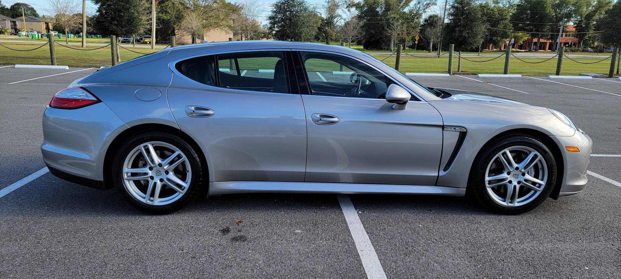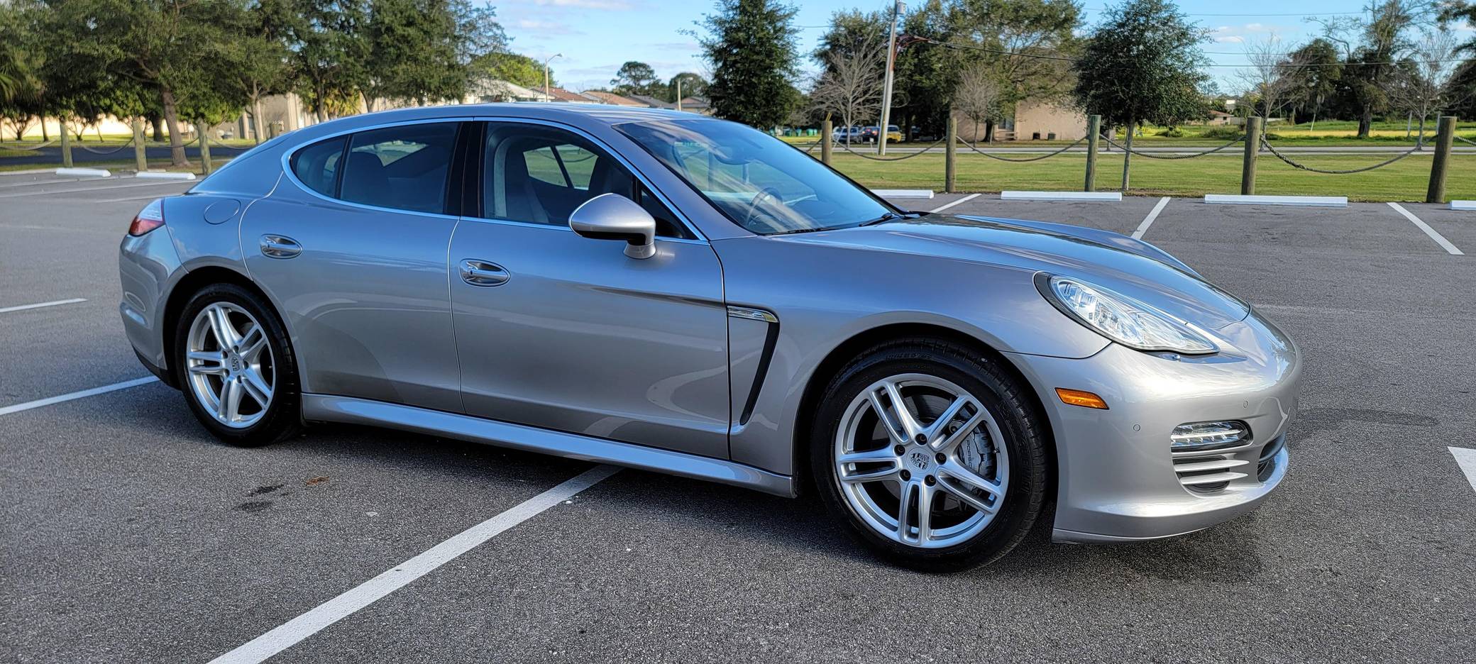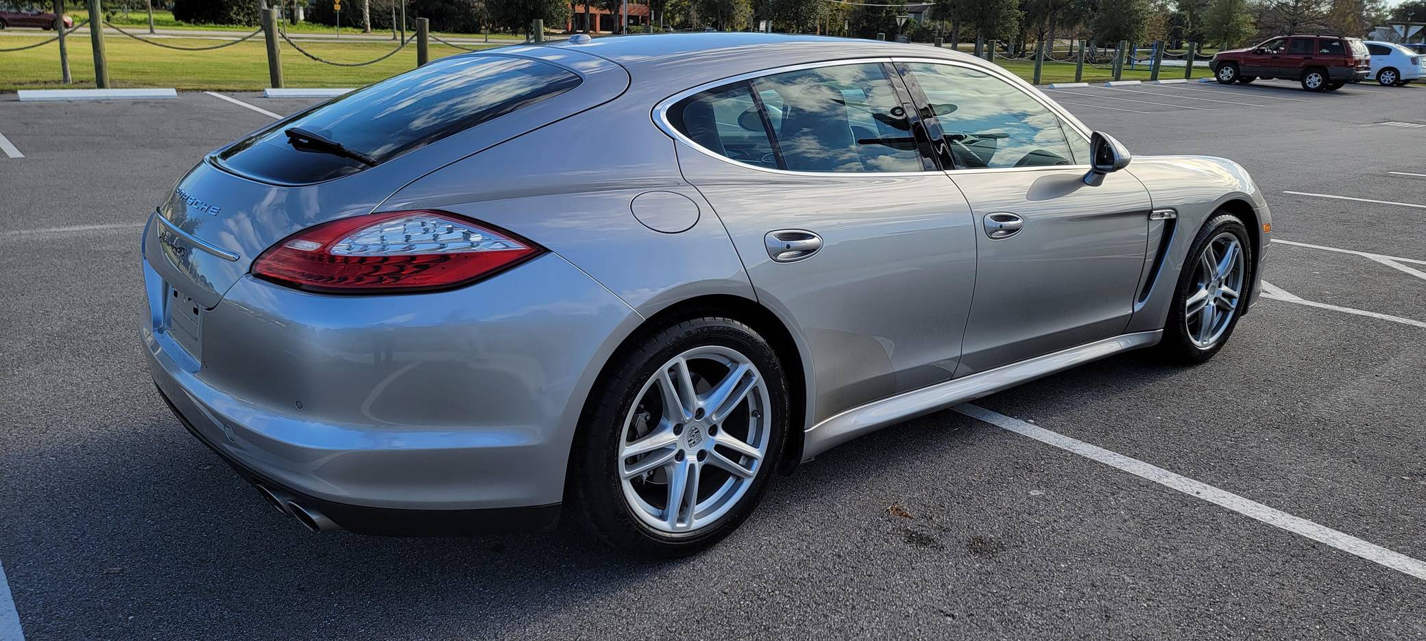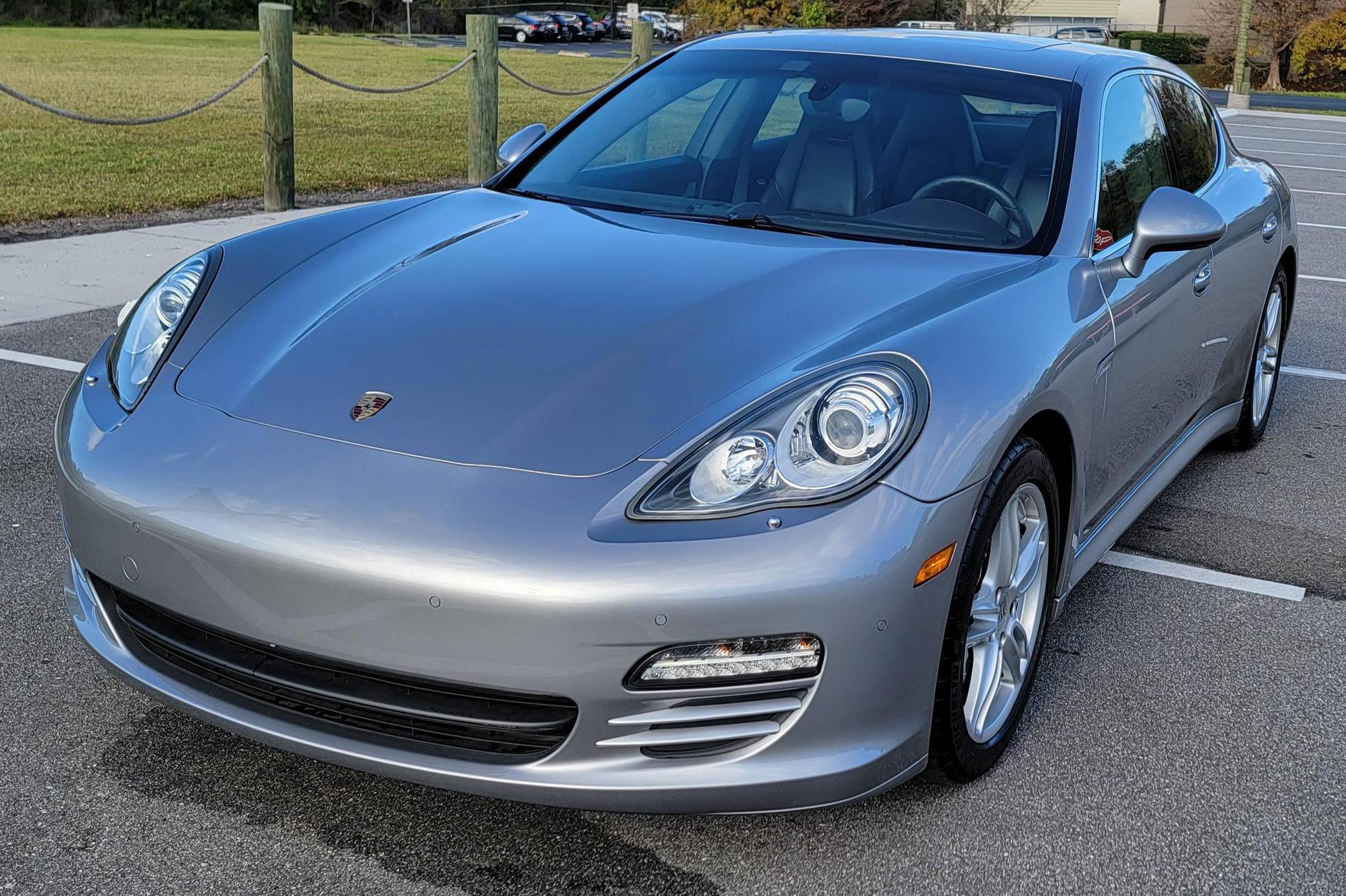 2010 Porsche Panamera 4S, finished in GT Silver Metallic with an Espresso interior. This sedan's odometer displays about 42,800 miles. It's equipped with the Sport Chrono Package Plus, an adaptive air suspension system, a rear window wiper, walnut interior trim, heated, ventilated, and power-adjustable front seats, heated and ventilated rear seats, front and rear parking sensors, and a rear-view camera among other features. The only modification reported by the seller is a set of 19-inch wheels from a Panamera Turbo. After several false starts, Porsche entered the sedan segment for the first time when it launched the original Panamera for 2010. While its design and its very existence were controversial, the Panamera ultimately drew praise as the sportiest model in its segment and it achieved this distinction without sacrificing comfort or luxury. The 4S model was positioned near the middle of the line-up. Power comes from a 4. 8-liter V8, rated at 400 horsepower and 369 lb-ft of torque. It spins the four wheels via a 7-speed automatic transmission and a permanent all-wheel-drive system.