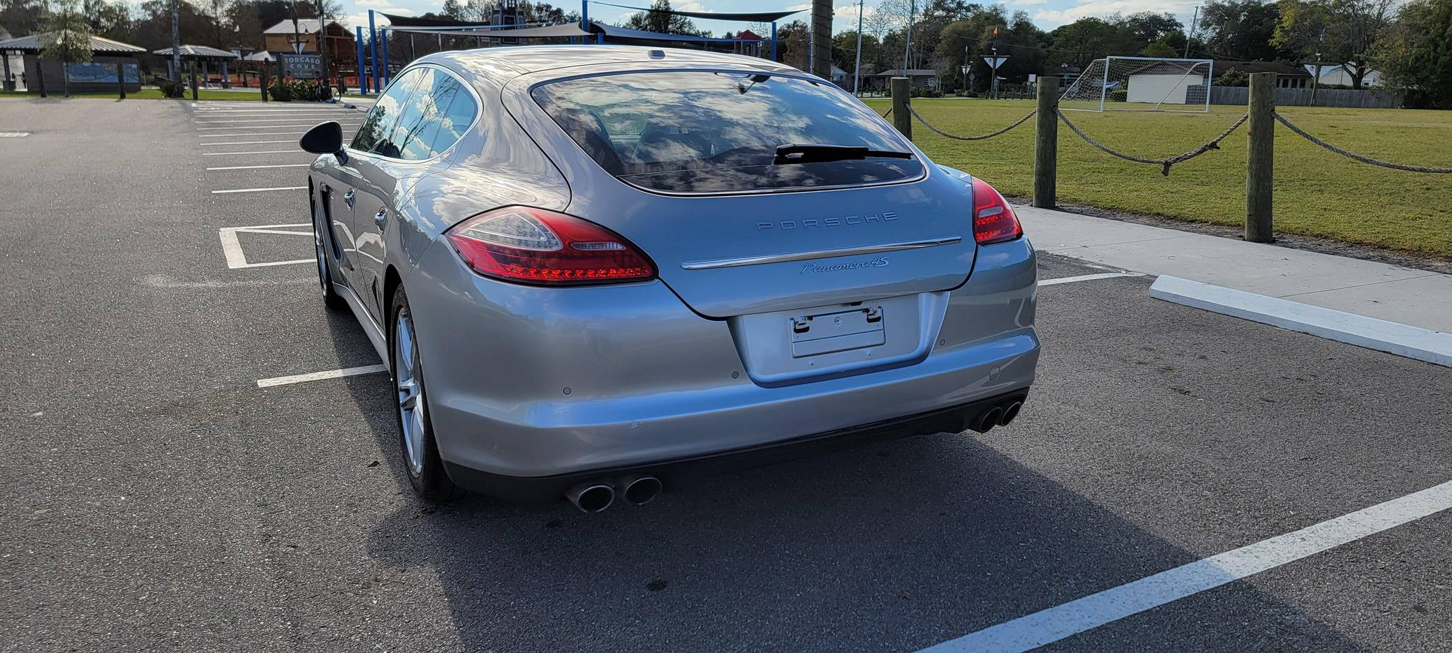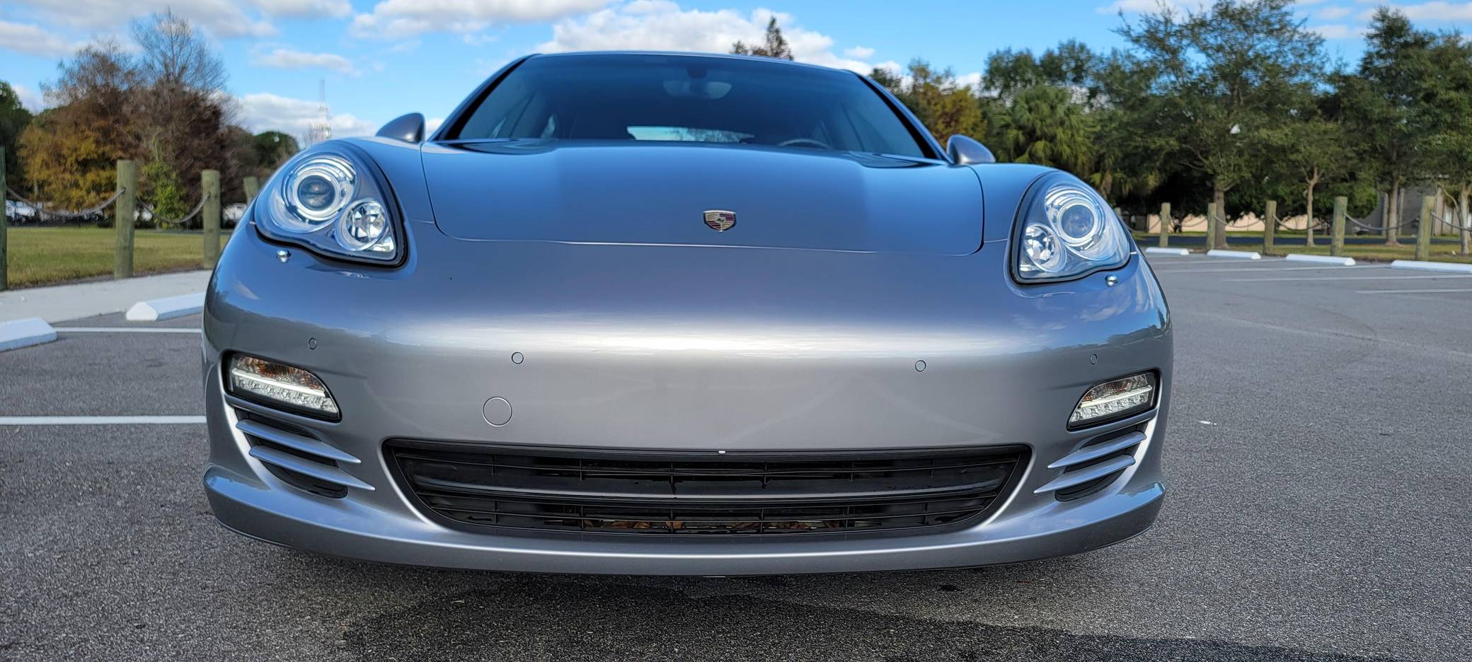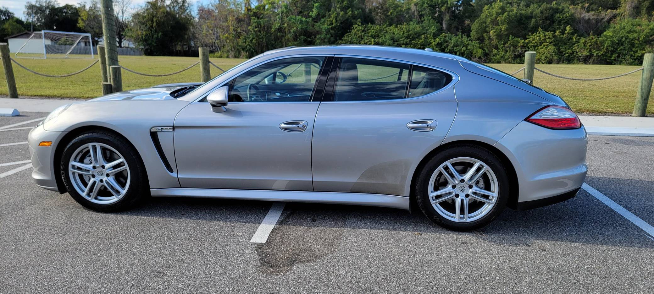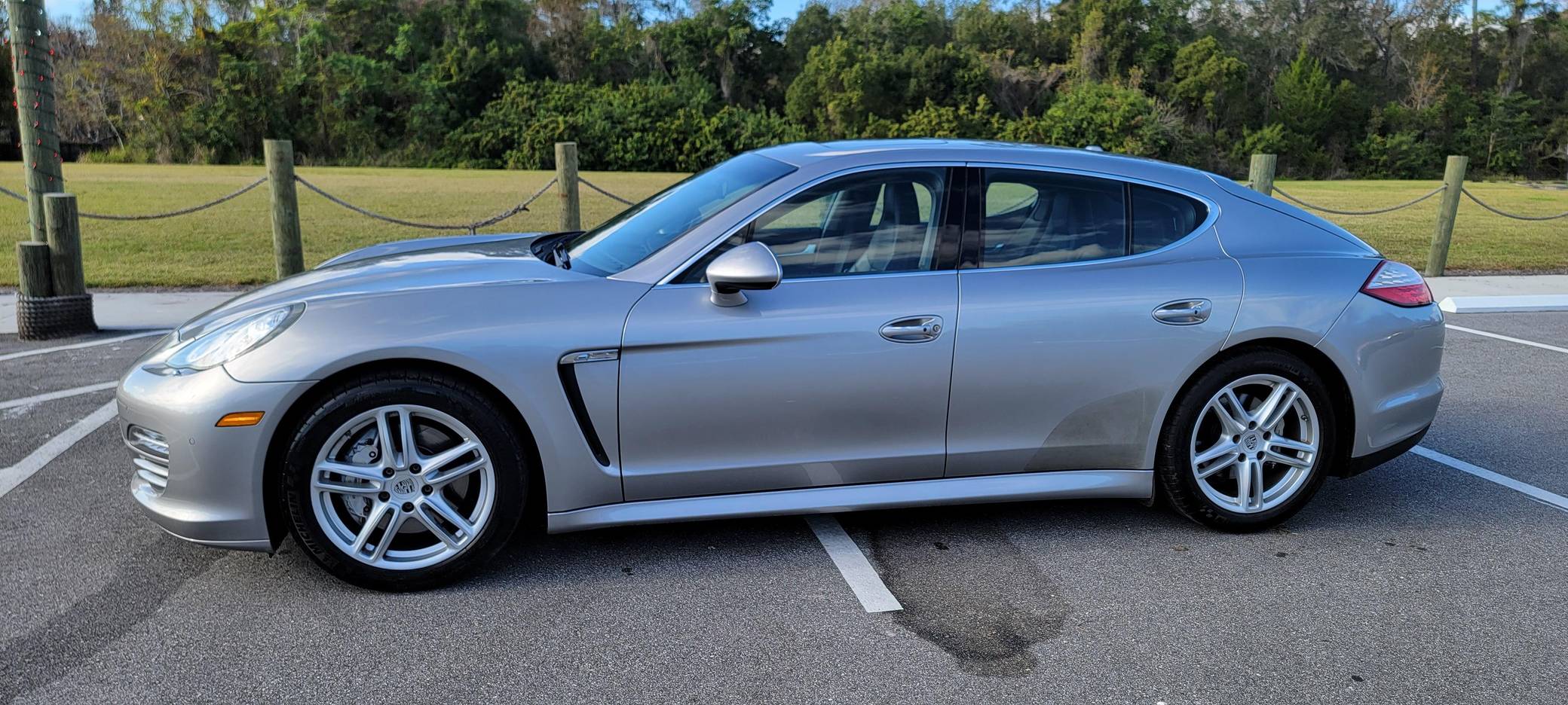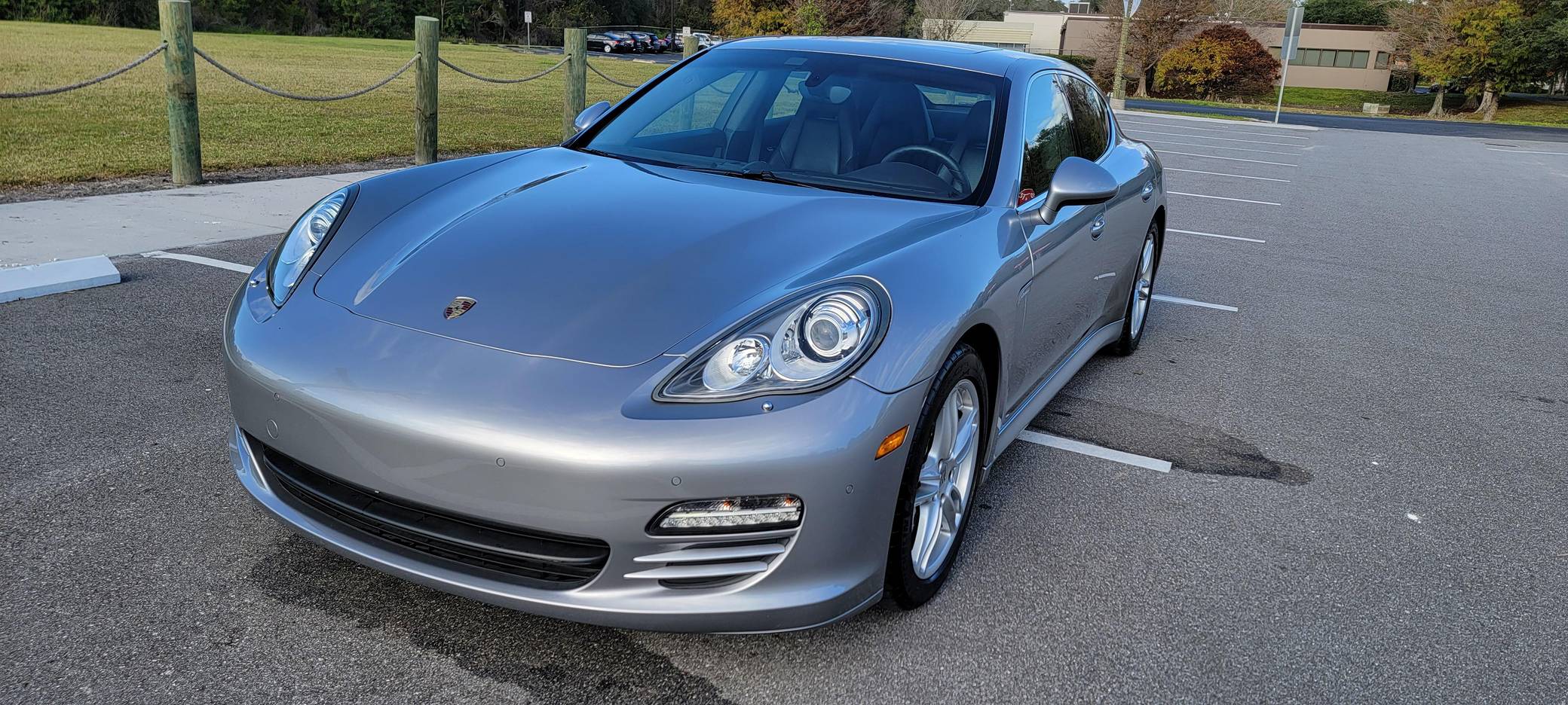 2010 Porsche Panamera 4S, finished in GT Silver Metallic with an Espresso interior. This sedan's odometer displays about 42,800 miles. It's equipped with the Sport Chrono Package Plus, an adaptive air suspension system, a rear window wiper, walnut interior trim, heated, ventilated, and power-adjustable front seats, heated and ventilated rear seats, front and rear parking sensors, and a rear-view camera among other features. The only modification reported by the seller is a set of 19-inch wheels from a Panamera Turbo. After several false starts, Porsche entered the sedan segment for the first time when it launched the original Panamera for 2010. While its design and its very existence were controversial, the Panamera ultimately drew praise as the sportiest model in its segment and it achieved this distinction without sacrificing comfort or luxury. The 4S model was positioned near the middle of the line-up. Power comes from a 4. 8-liter V8, rated at 400 horsepower and 369 lb-ft of torque. It spins the four wheels via a 7-speed automatic transmission and a permanent all-wheel-drive system.