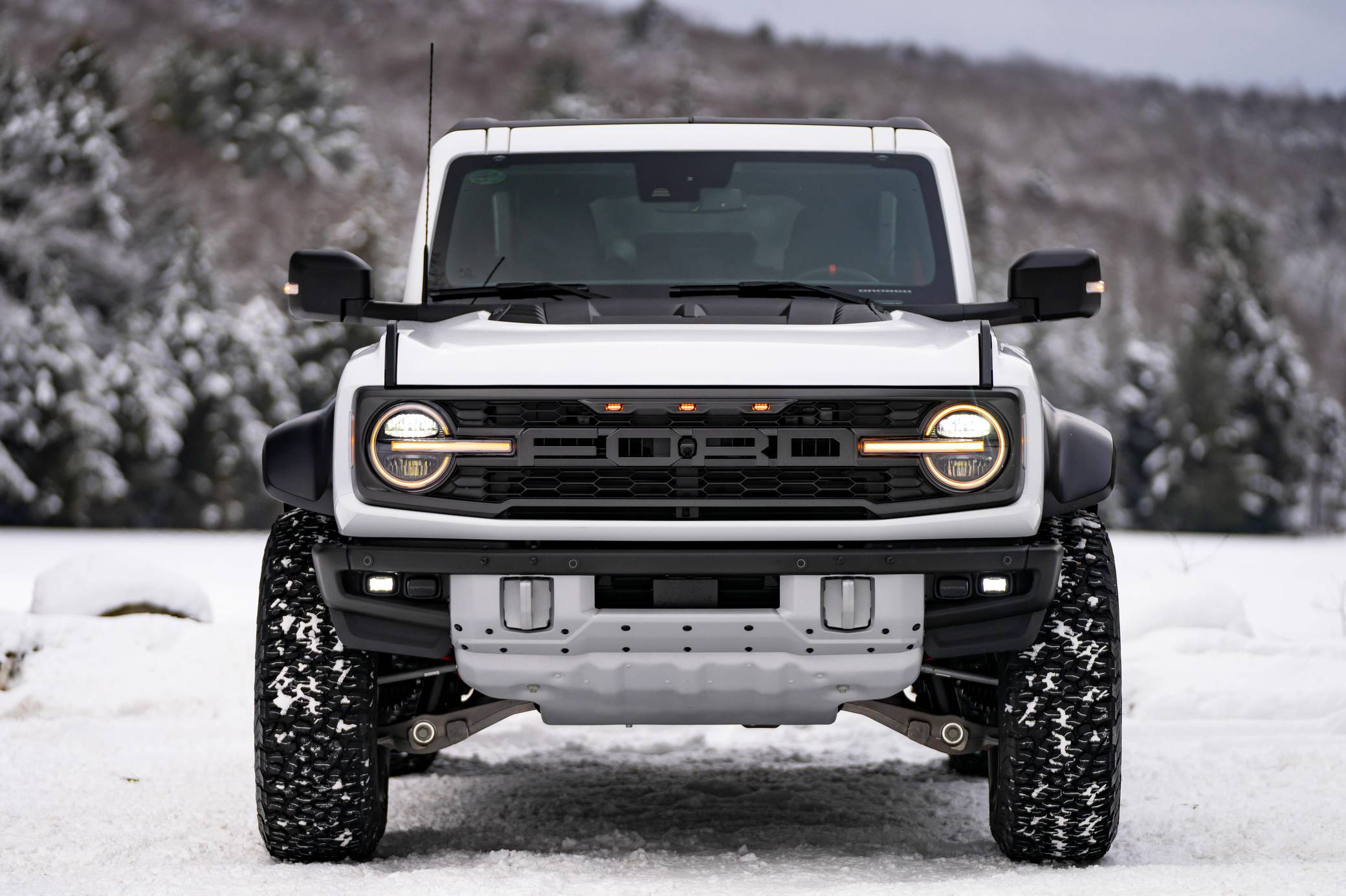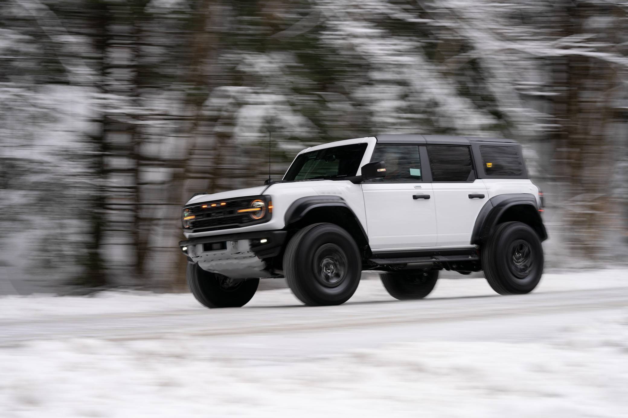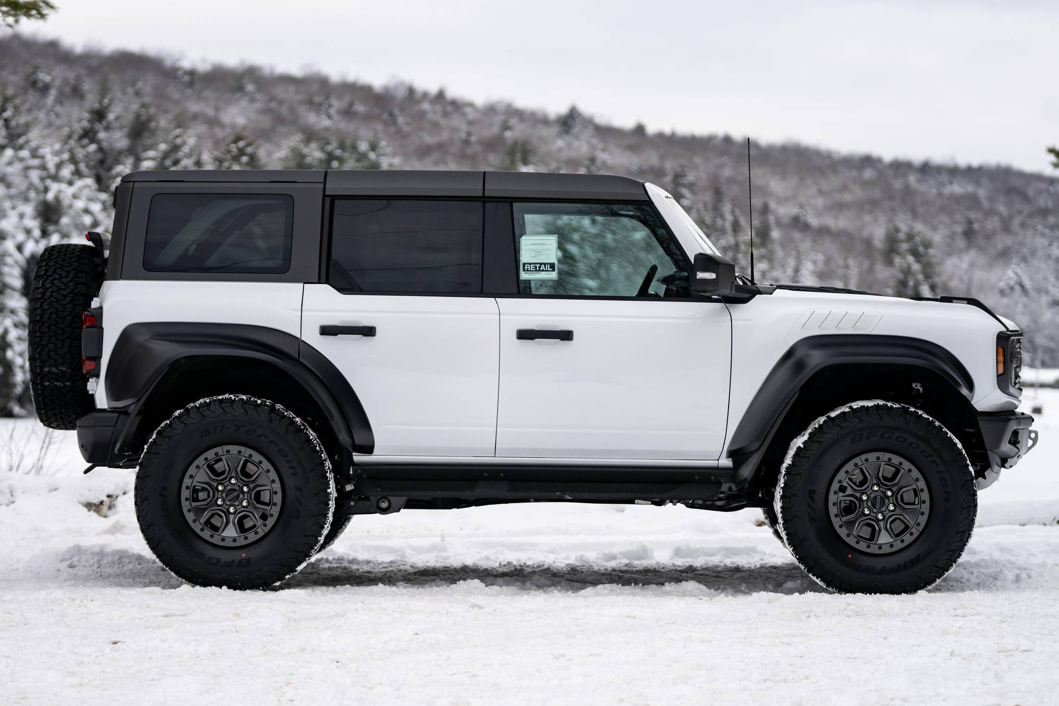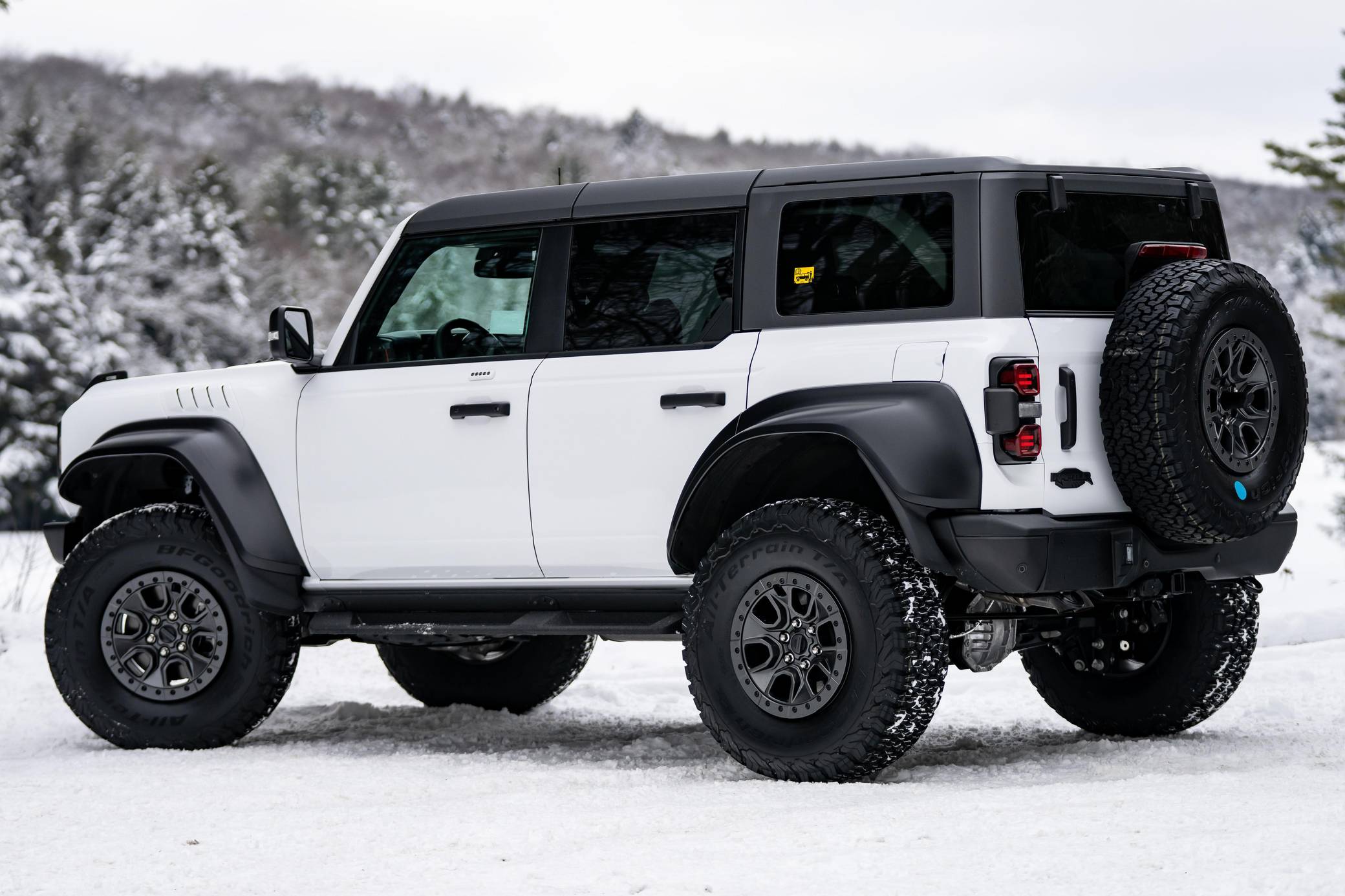 THIS… is a 2022 Ford Bronco Raptor, finished in Oxford White with an Onyx and Blue interior. 0 suspension system, FOX Live Valve dampers, a heavy-duty modular front bumper with Rigid LED fog lights, a molded-in-color hardtop, leather and suede upholstery, and Code Orange seat belts. The seller reports no modifications. The sixth-generation Bronco was introduced for 2021, ending a 25-year hiatus and nearly a decade of speculation about its return. Retro styling, body-on-frame construction, and a suite of off-road equipment help to ensure this truck lives up to the Bronco name. It's not all old-school, however; modern features like an available 12-inch touchscreen and a wireless phone charger bring it into the 21st century. Launched for 2022, the long-awaited Raptor builds on the standard Bronco with a more powerful engine, huge tires tucked under correspondingly wide wheel arch flares, and a model-specific suspension system that includes FOX Factory Live Valve dampers. It's still available new today. Power comes from a 3. 0-liter twin-turbocharged "EcoBoost" V6, rated at 418 horsepower and 440 lb-ft of torque. Output is sent to all four wheels via a 10-speed automatic transmission and a 2-speed transfer case.