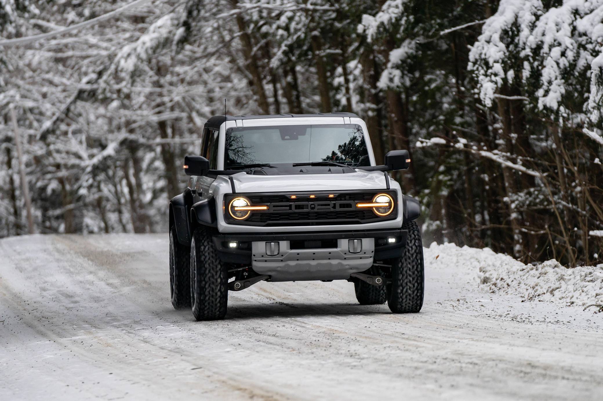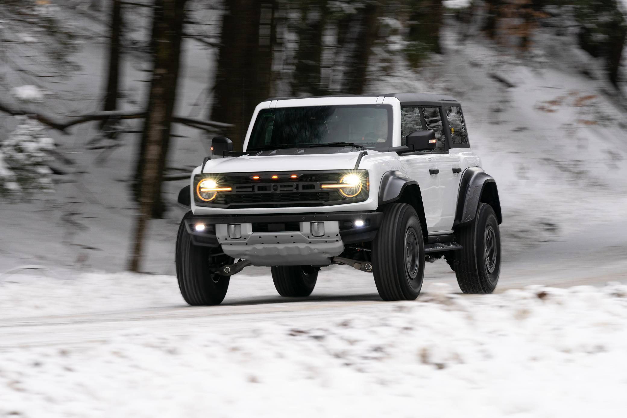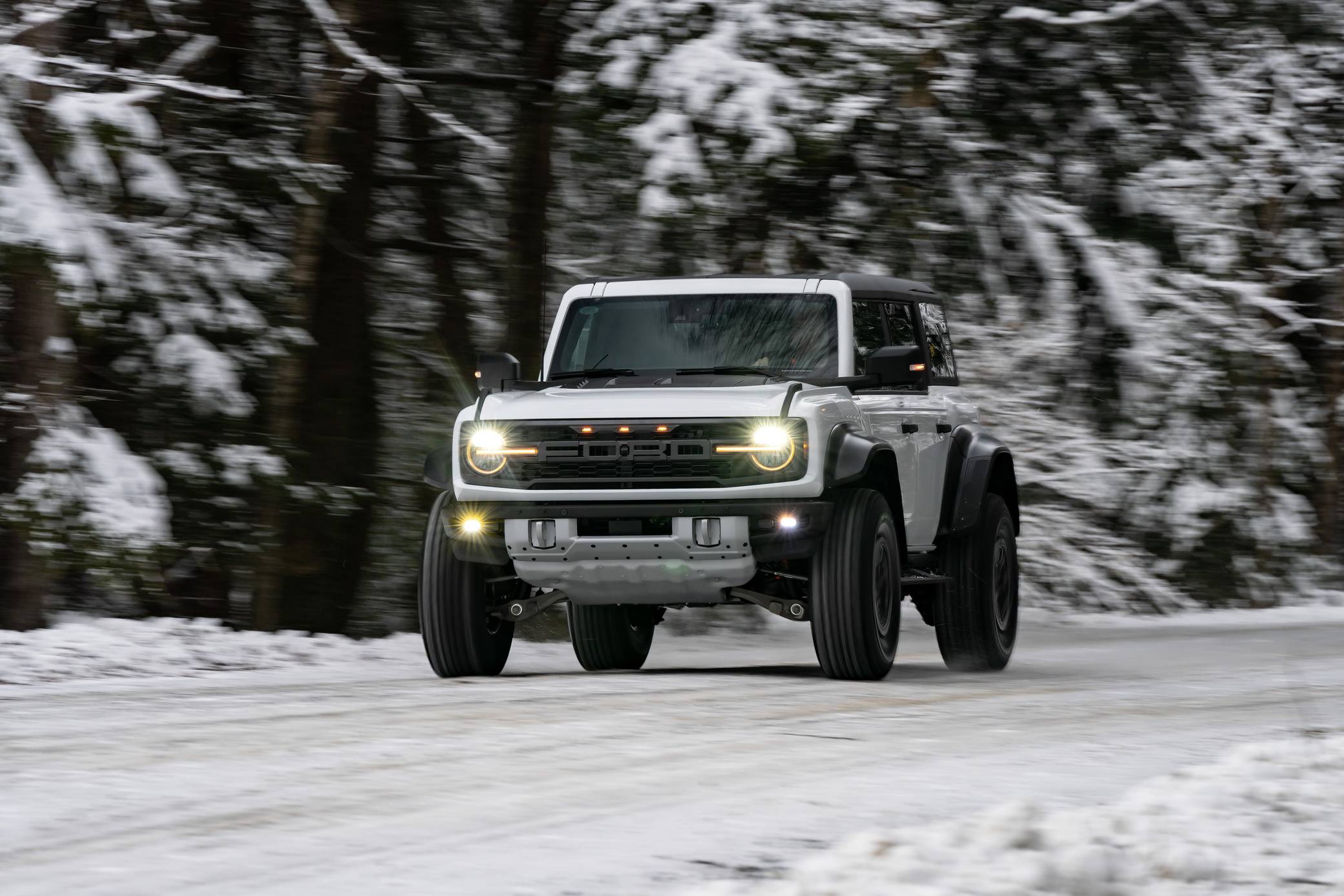 THIS… is a 2022 Ford Bronco Raptor, finished in Oxford White with an Onyx and Blue interior. 0 suspension system, FOX Live Valve dampers, a heavy-duty modular front bumper with Rigid LED fog lights, a molded-in-color hardtop, leather and suede upholstery, and Code Orange seat belts. The seller reports no modifications. The sixth-generation Bronco was introduced for 2021, ending a 25-year hiatus and nearly a decade of speculation about its return. Retro styling, body-on-frame construction, and a suite of off-road equipment help to ensure this truck lives up to the Bronco name. It's not all old-school, however; modern features like an available 12-inch touchscreen and a wireless phone charger bring it into the 21st century. Launched for 2022, the long-awaited Raptor builds on the standard Bronco with a more powerful engine, huge tires tucked under correspondingly wide wheel arch flares, and a model-specific suspension system that includes FOX Factory Live Valve dampers. It's still available new today. Power comes from a 3. 0-liter twin-turbocharged "EcoBoost" V6, rated at 418 horsepower and 440 lb-ft of torque. Output is sent to all four wheels via a 10-speed automatic transmission and a 2-speed transfer case.