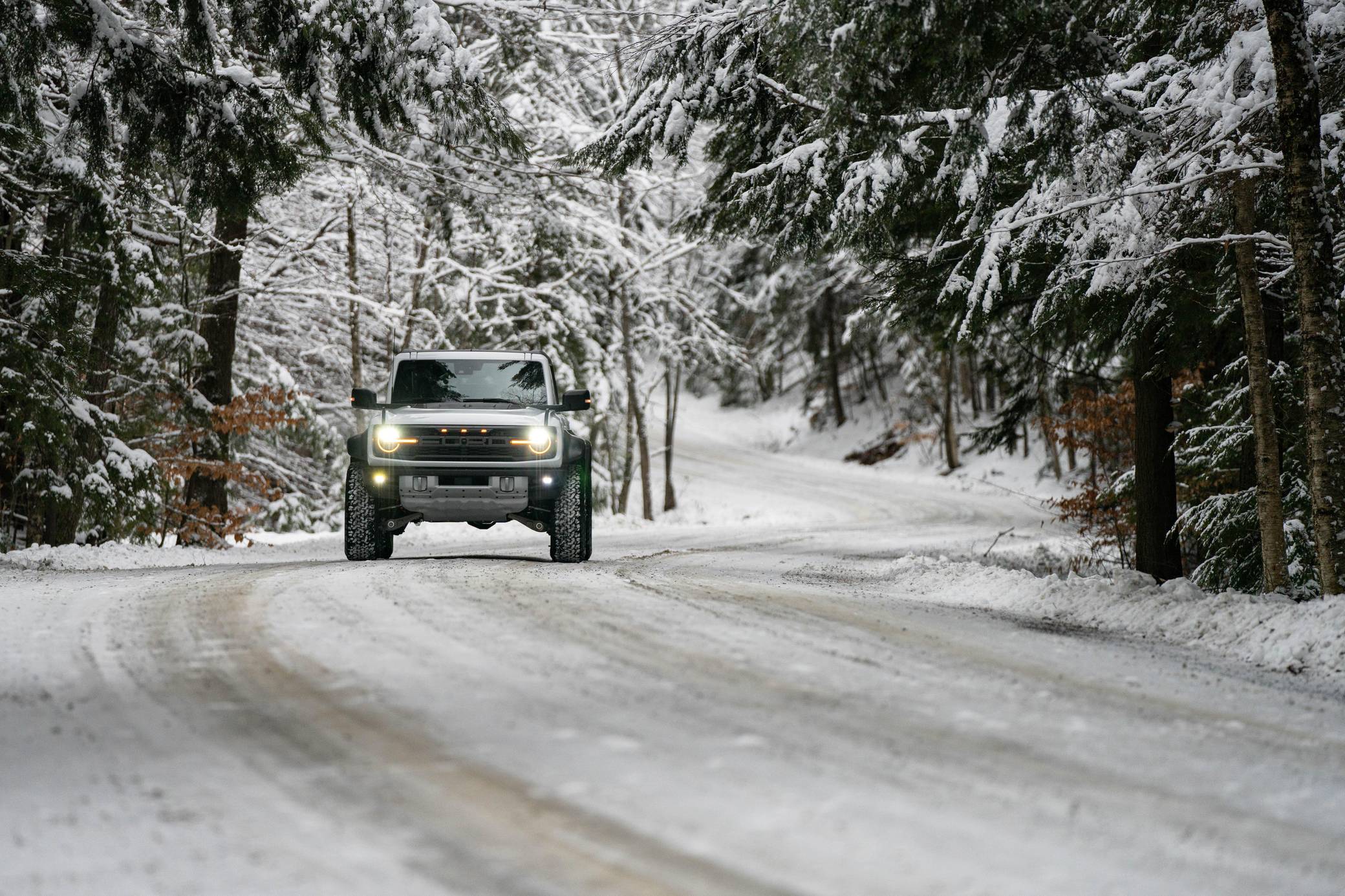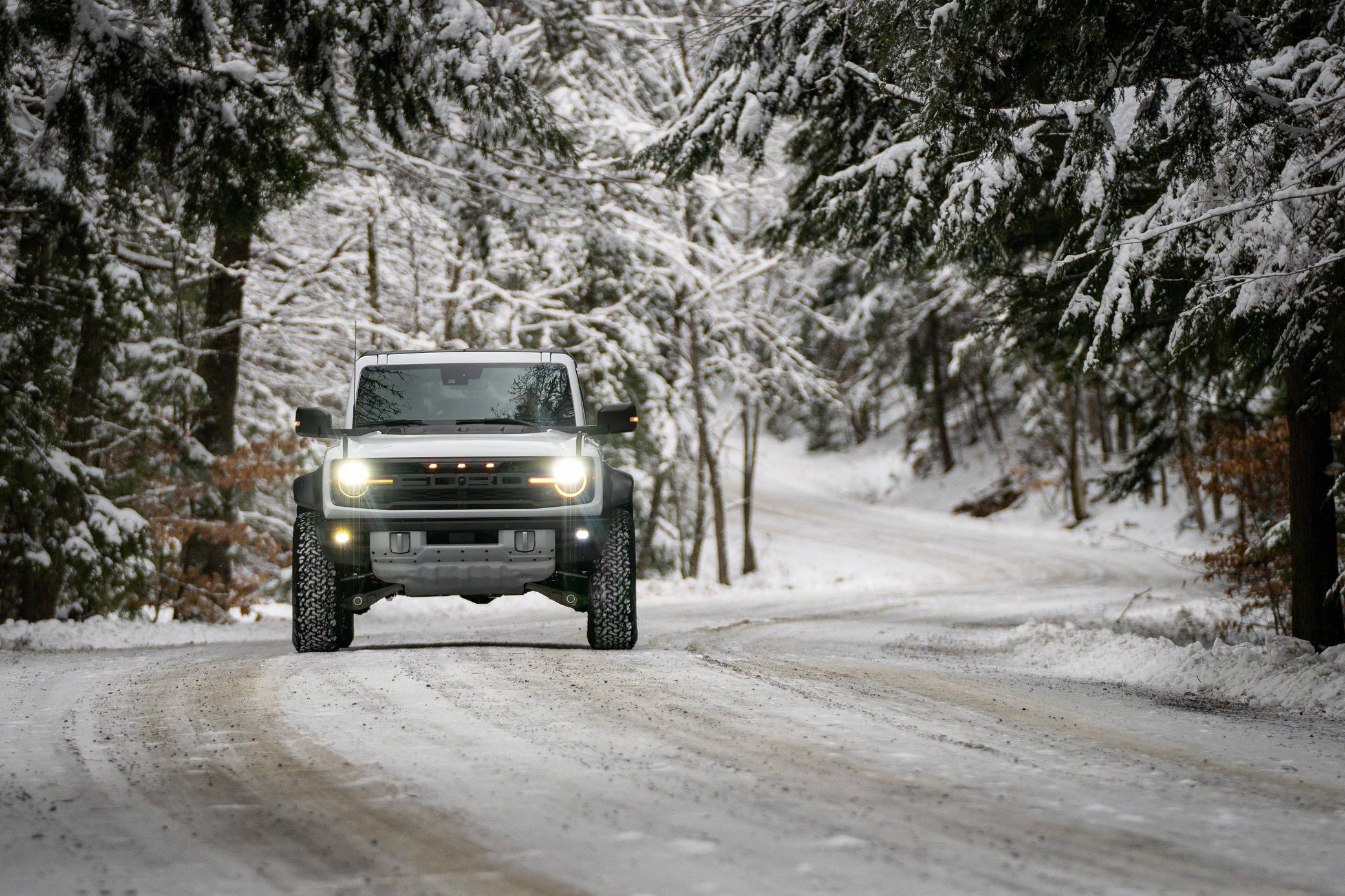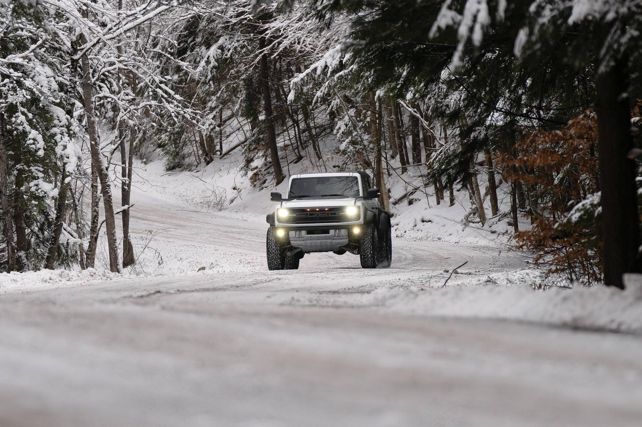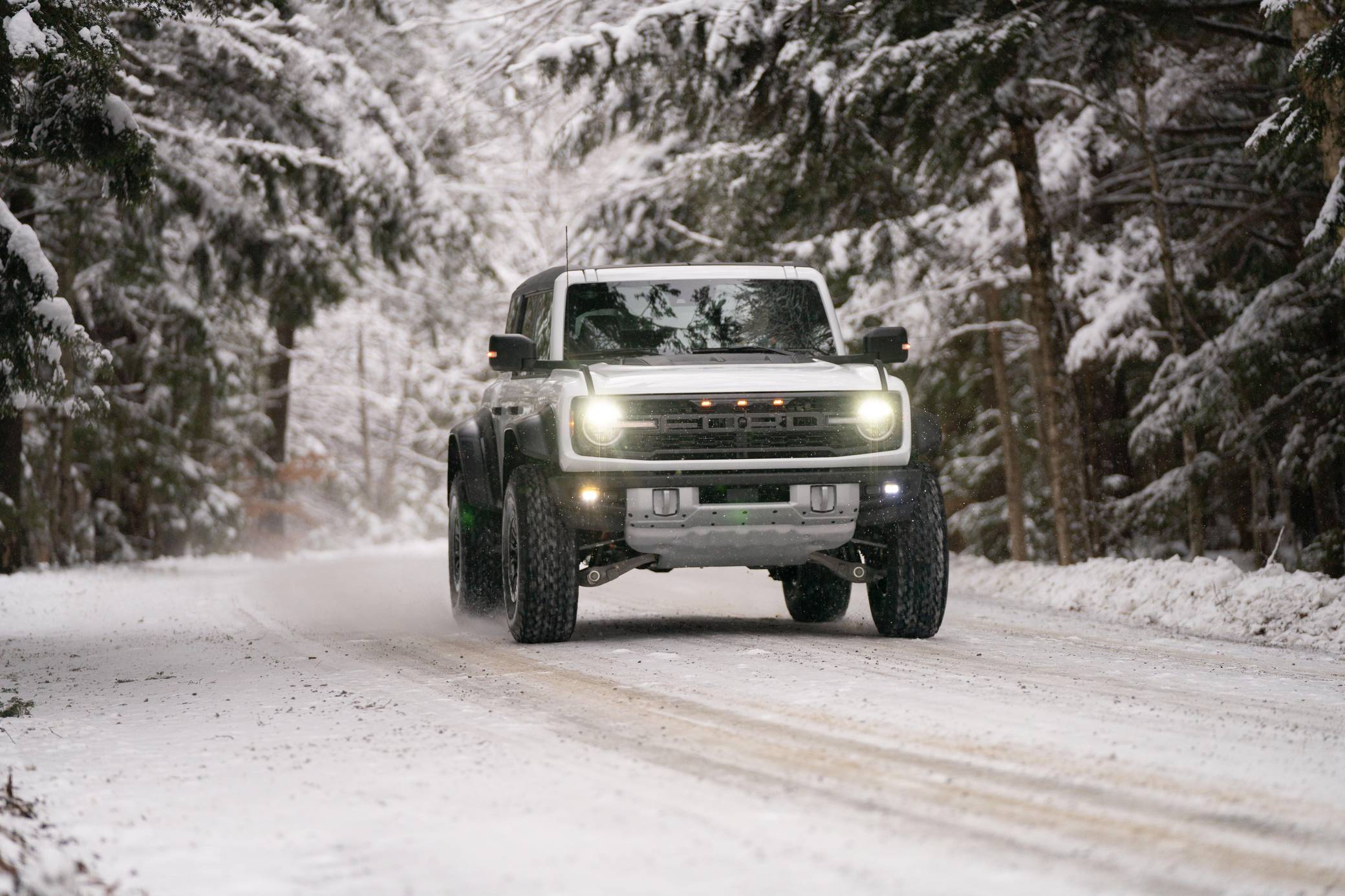 THIS… is a 2022 Ford Bronco Raptor, finished in Oxford White with an Onyx and Blue interior. 0 suspension system, FOX Live Valve dampers, a heavy-duty modular front bumper with Rigid LED fog lights, a molded-in-color hardtop, leather and suede upholstery, and Code Orange seat belts. The seller reports no modifications. The sixth-generation Bronco was introduced for 2021, ending a 25-year hiatus and nearly a decade of speculation about its return. Retro styling, body-on-frame construction, and a suite of off-road equipment help to ensure this truck lives up to the Bronco name. It's not all old-school, however; modern features like an available 12-inch touchscreen and a wireless phone charger bring it into the 21st century. Launched for 2022, the long-awaited Raptor builds on the standard Bronco with a more powerful engine, huge tires tucked under correspondingly wide wheel arch flares, and a model-specific suspension system that includes FOX Factory Live Valve dampers. It's still available new today. Power comes from a 3. 0-liter twin-turbocharged "EcoBoost" V6, rated at 418 horsepower and 440 lb-ft of torque. Output is sent to all four wheels via a 10-speed automatic transmission and a 2-speed transfer case.