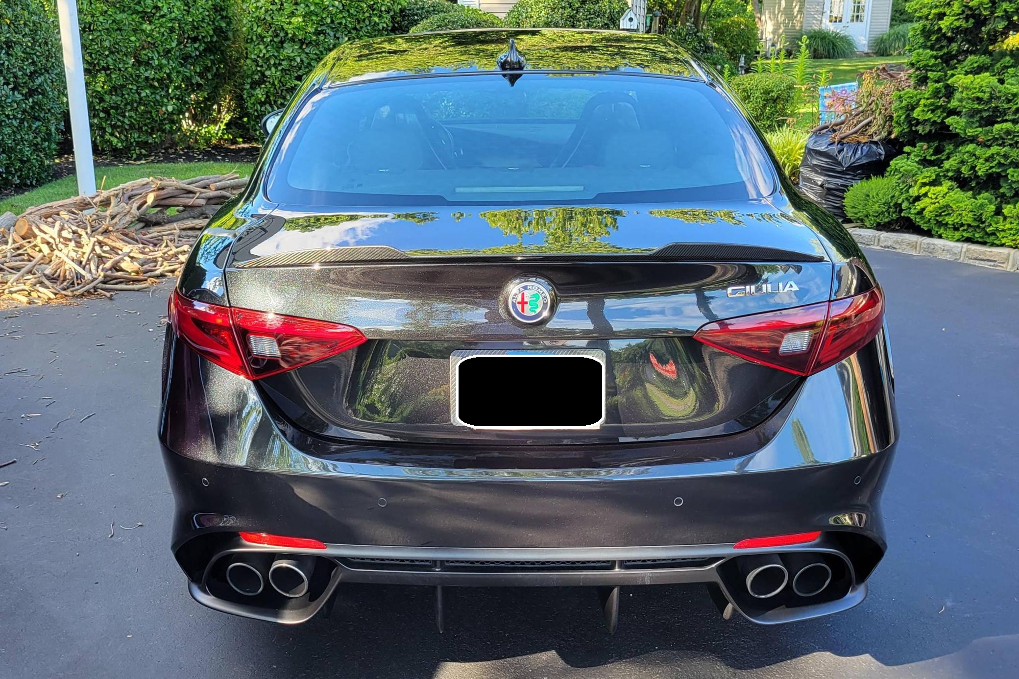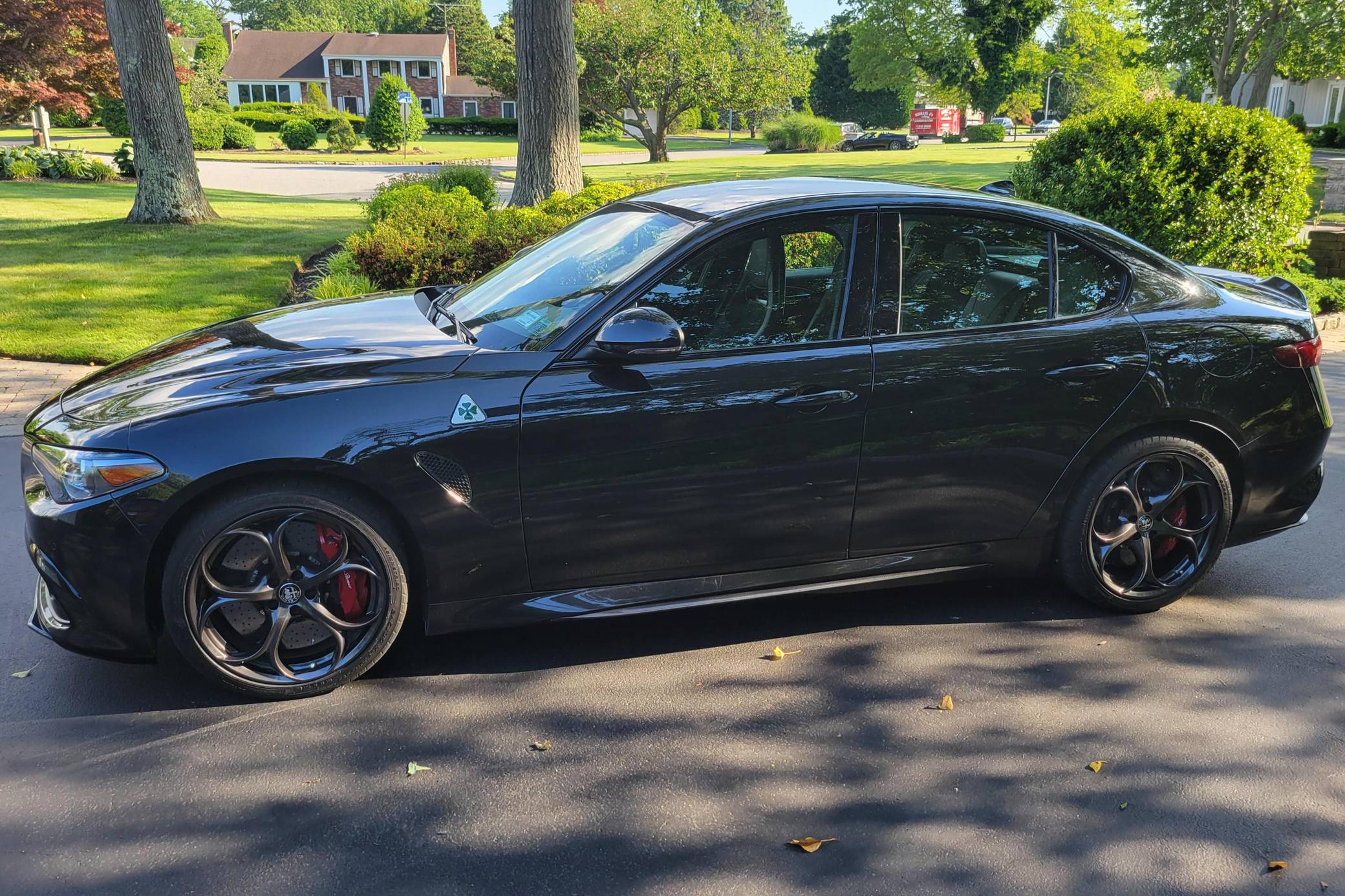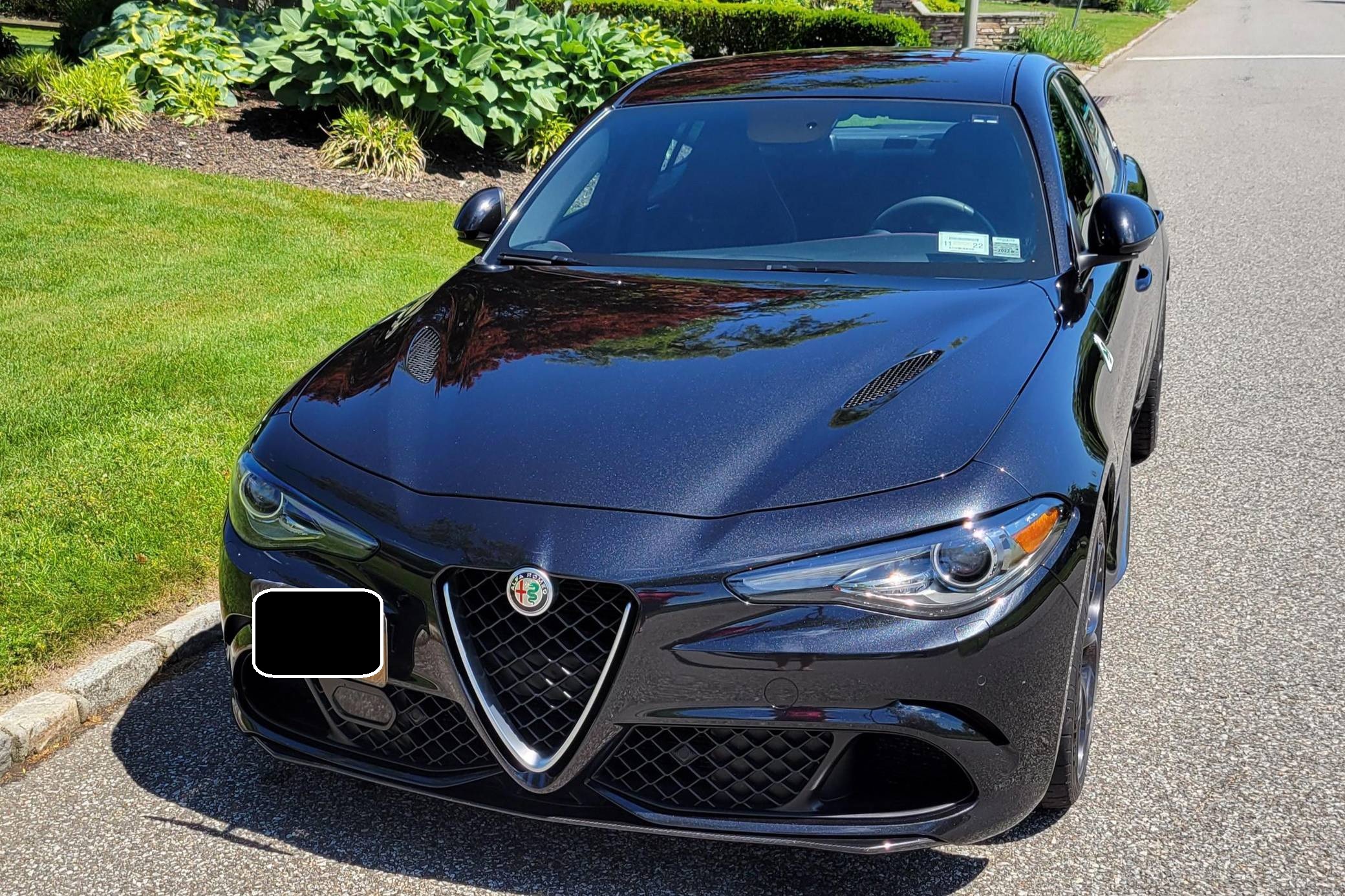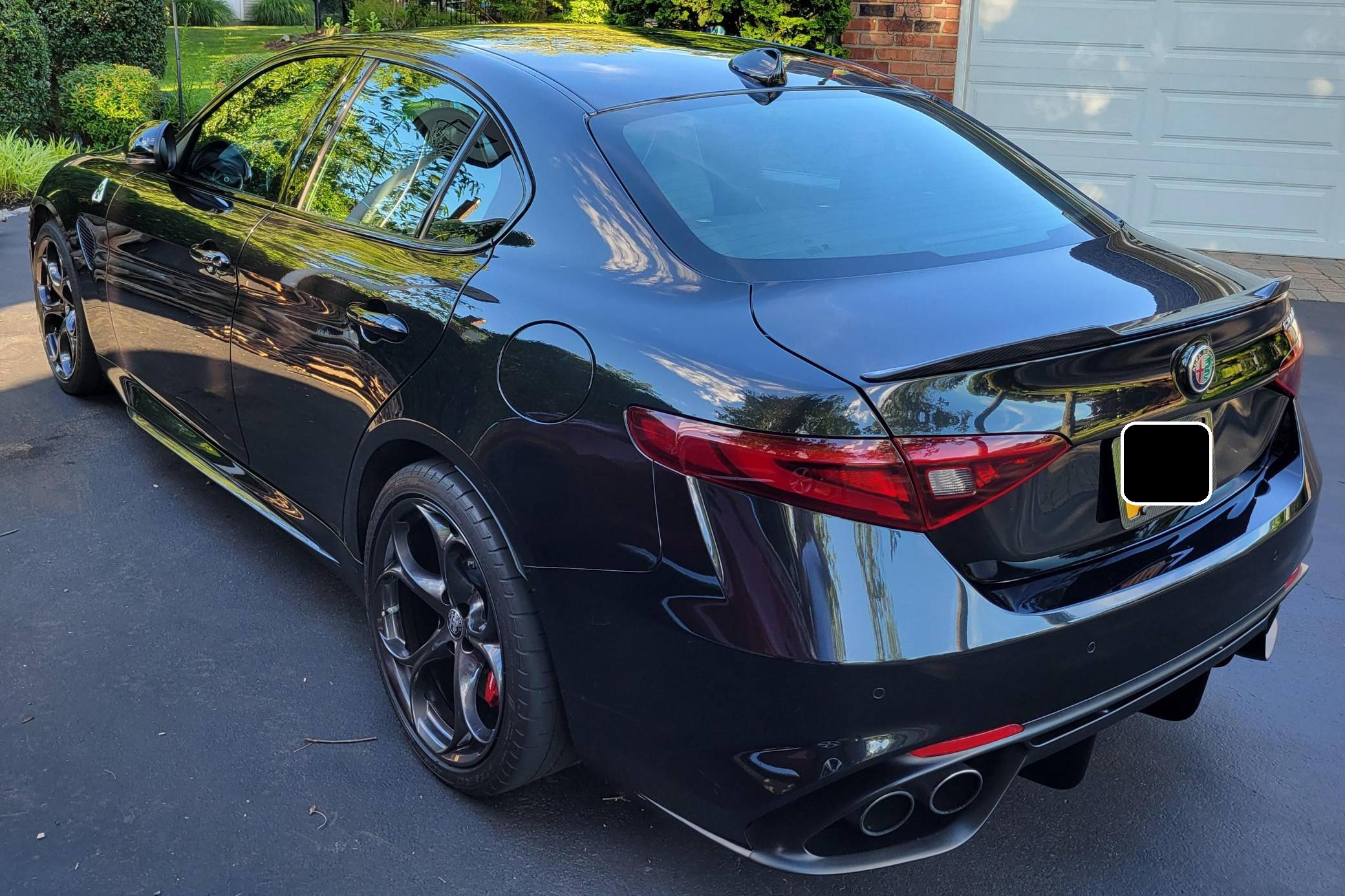 2017 Alfa Romeo Giulia Quadrifoglio, finished in Vulcano Black with a black and red interior. No modifications have been reported by the seller. The Alfa Romeo Giulia Quadrifoglio — which means "four-leaf clover" in Italian — has been praised by automotive journalists and enthusiasts for its exotic styling and outstanding performance. It broke the Nürburgring's Nordschleife record for a production sedan with a time of 7 minutes 39 seconds and was named MotorTrend Car of the Year in 2018. Power comes from a Ferrari-derived "F154" 2. 9-liter twin-turbocharged V6 engine, rated at 505 horsepower and 443 lb-ft of torque. Output is sent to the rear wheels via an 8-speed automatic transmission.