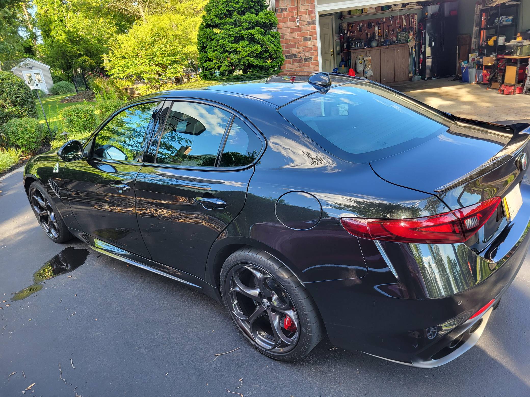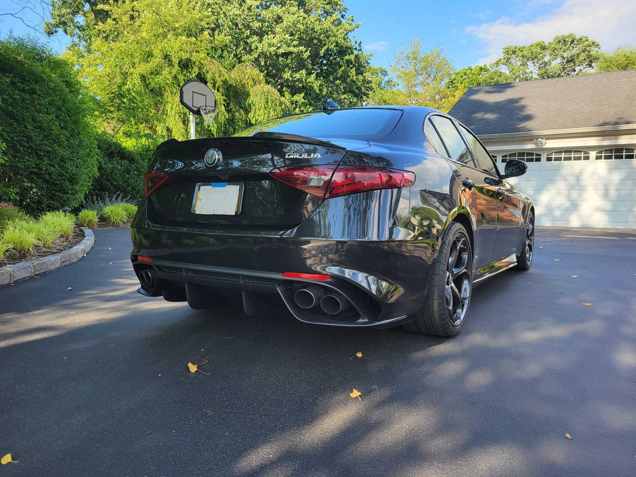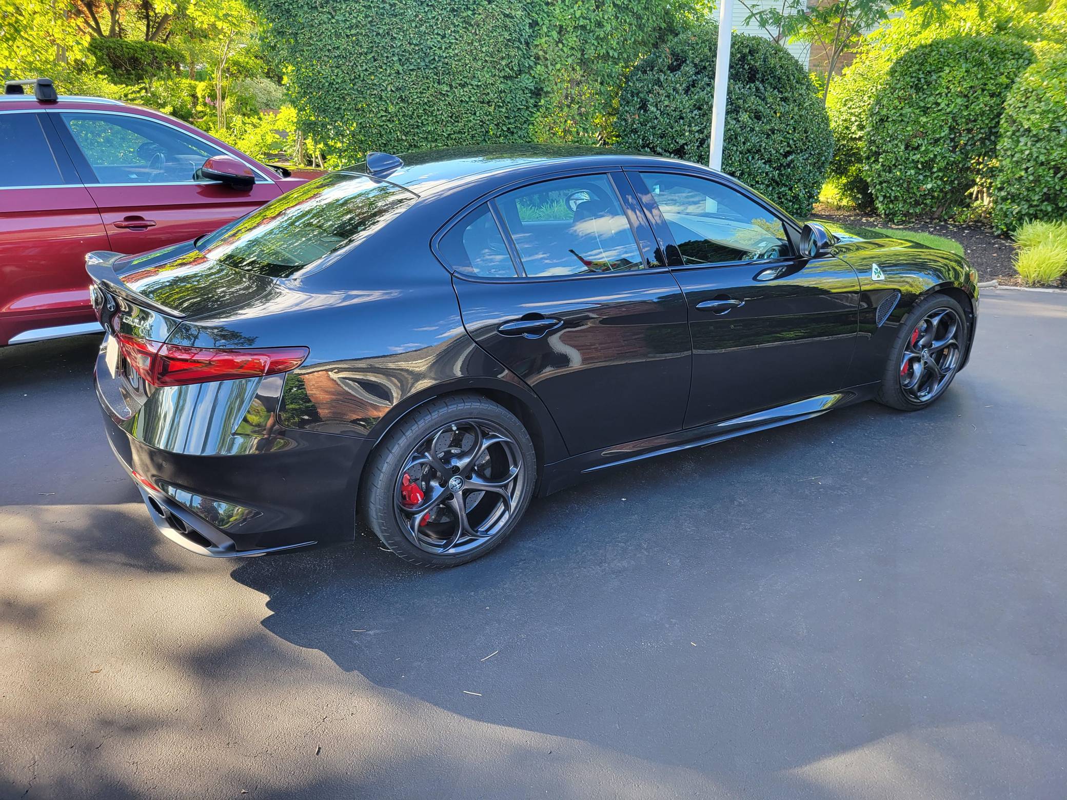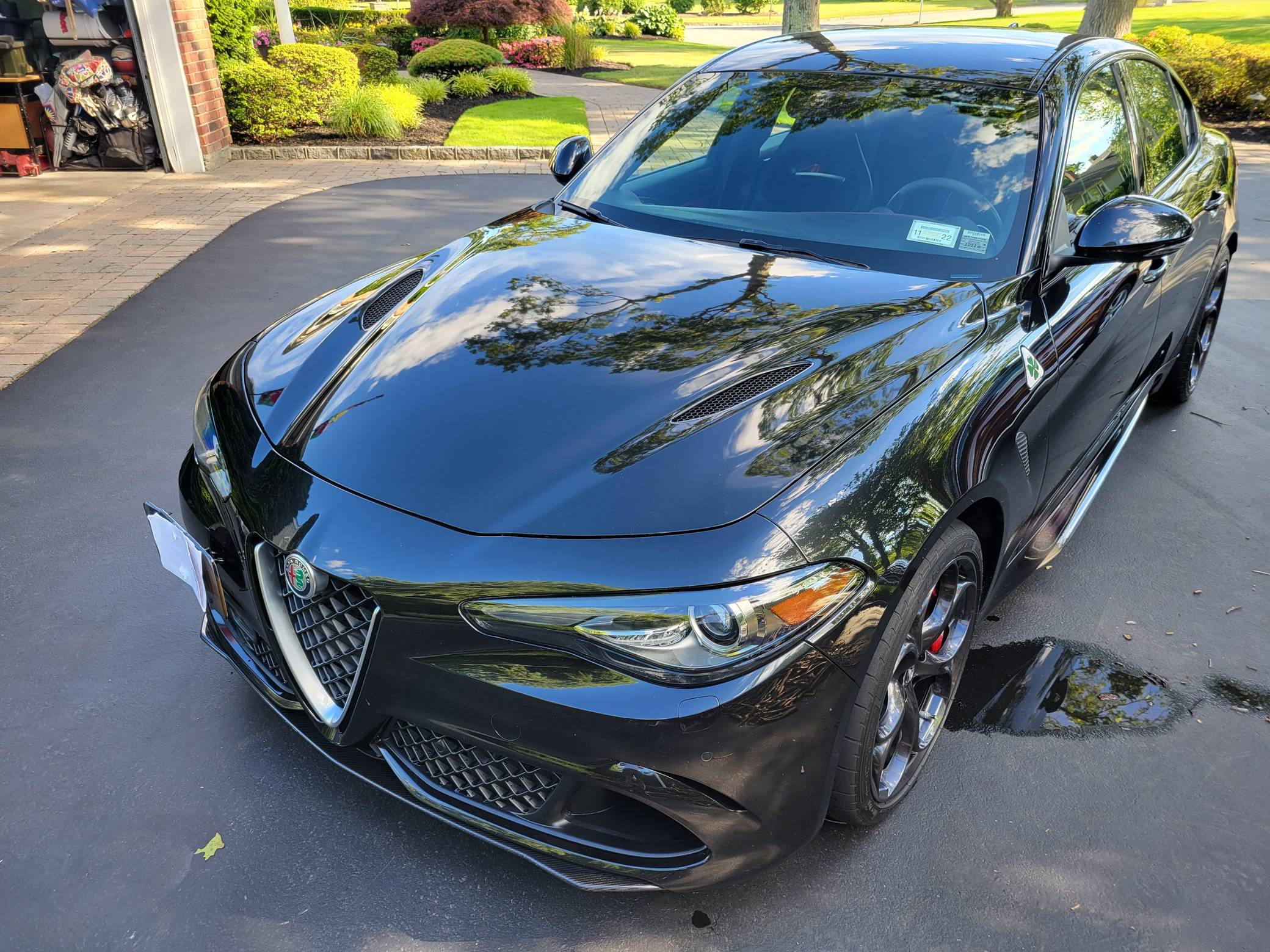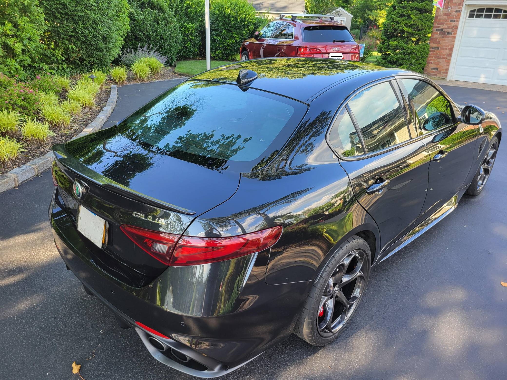 2017 Alfa Romeo Giulia Quadrifoglio, finished in Vulcano Black with a black and red interior. No modifications have been reported by the seller. The Alfa Romeo Giulia Quadrifoglio — which means "four-leaf clover" in Italian — has been praised by automotive journalists and enthusiasts for its exotic styling and outstanding performance. It broke the Nürburgring's Nordschleife record for a production sedan with a time of 7 minutes 39 seconds and was named MotorTrend Car of the Year in 2018. Power comes from a Ferrari-derived "F154" 2. 9-liter twin-turbocharged V6 engine, rated at 505 horsepower and 443 lb-ft of torque. Output is sent to the rear wheels via an 8-speed automatic transmission.