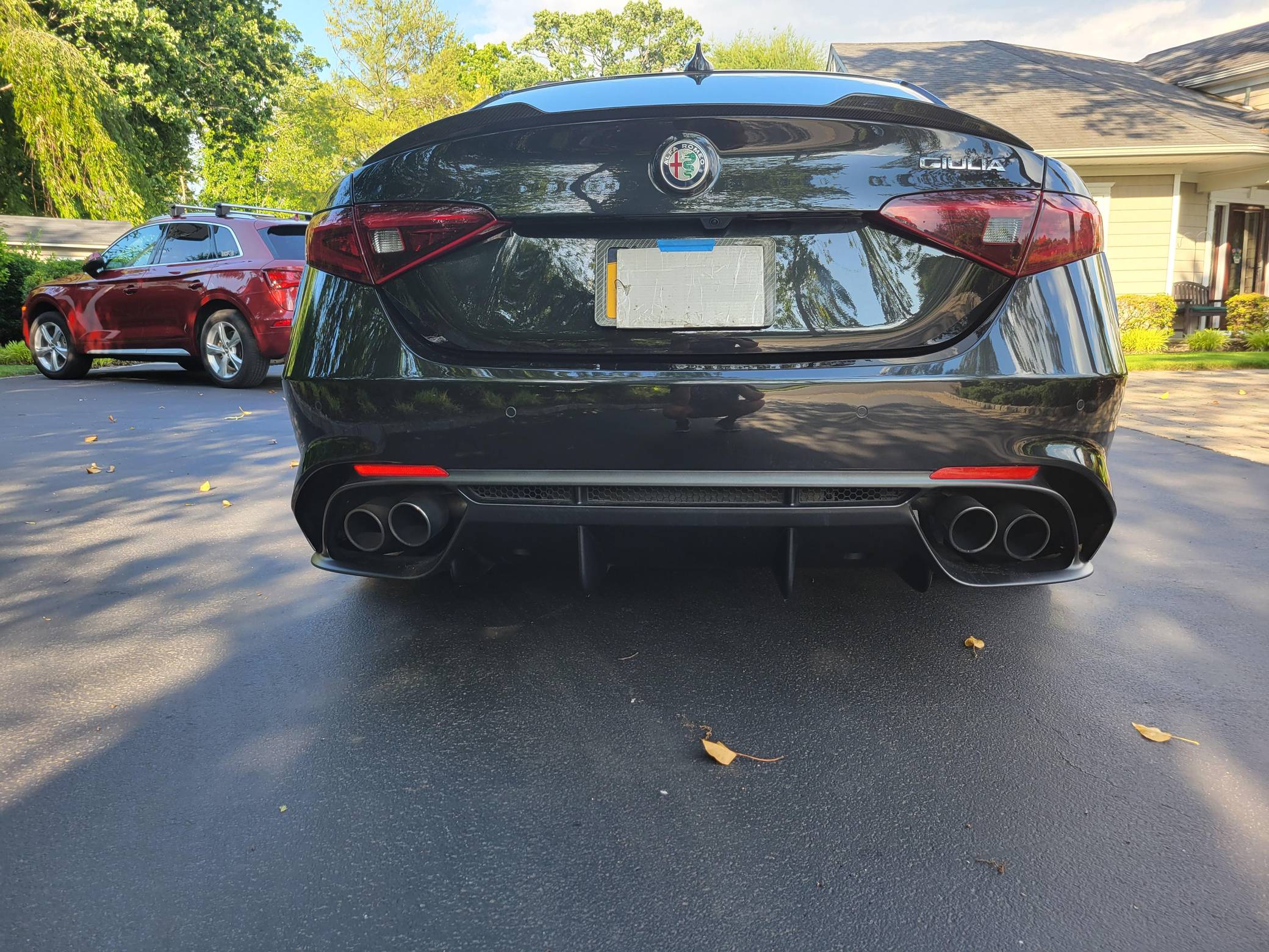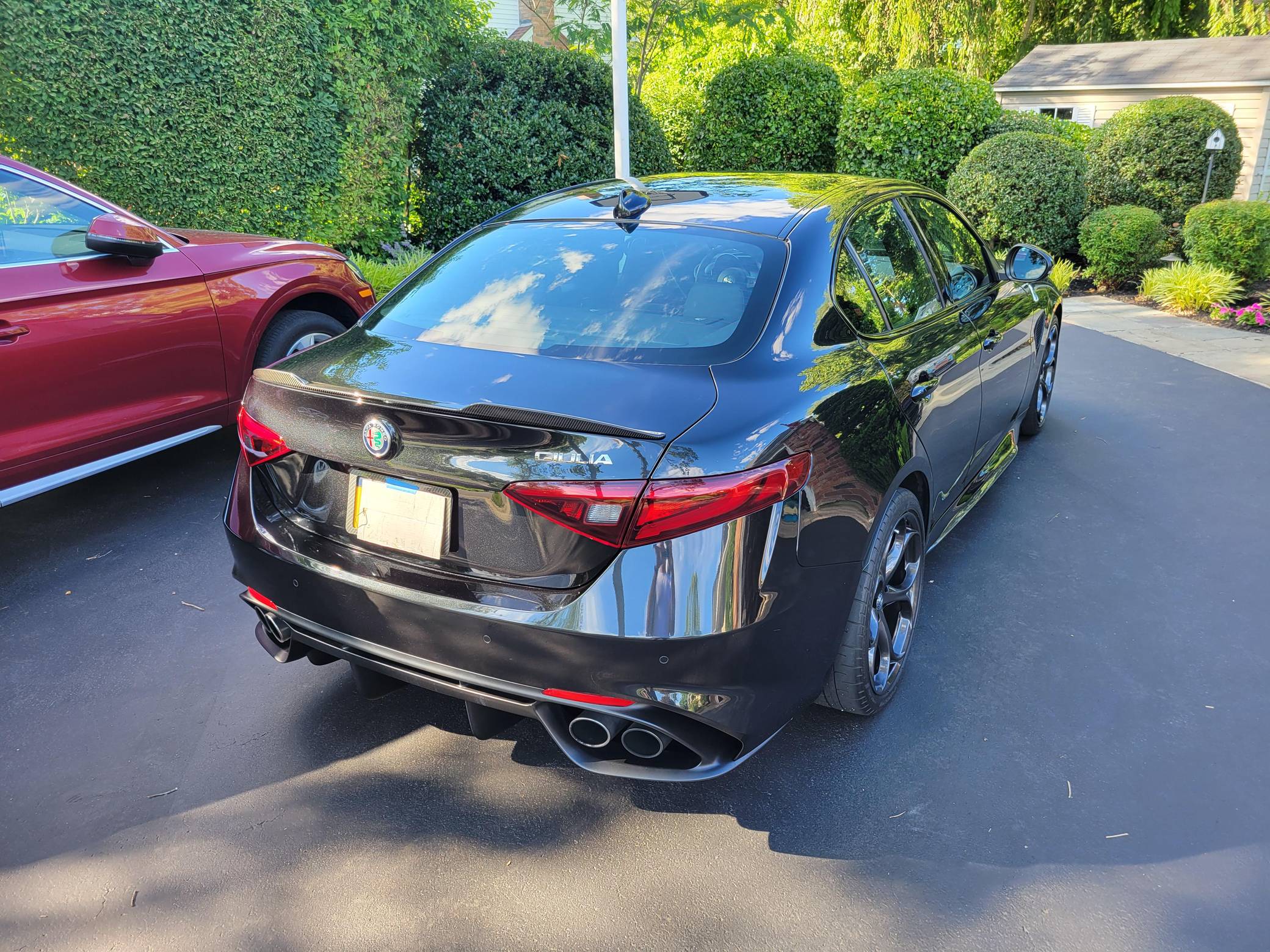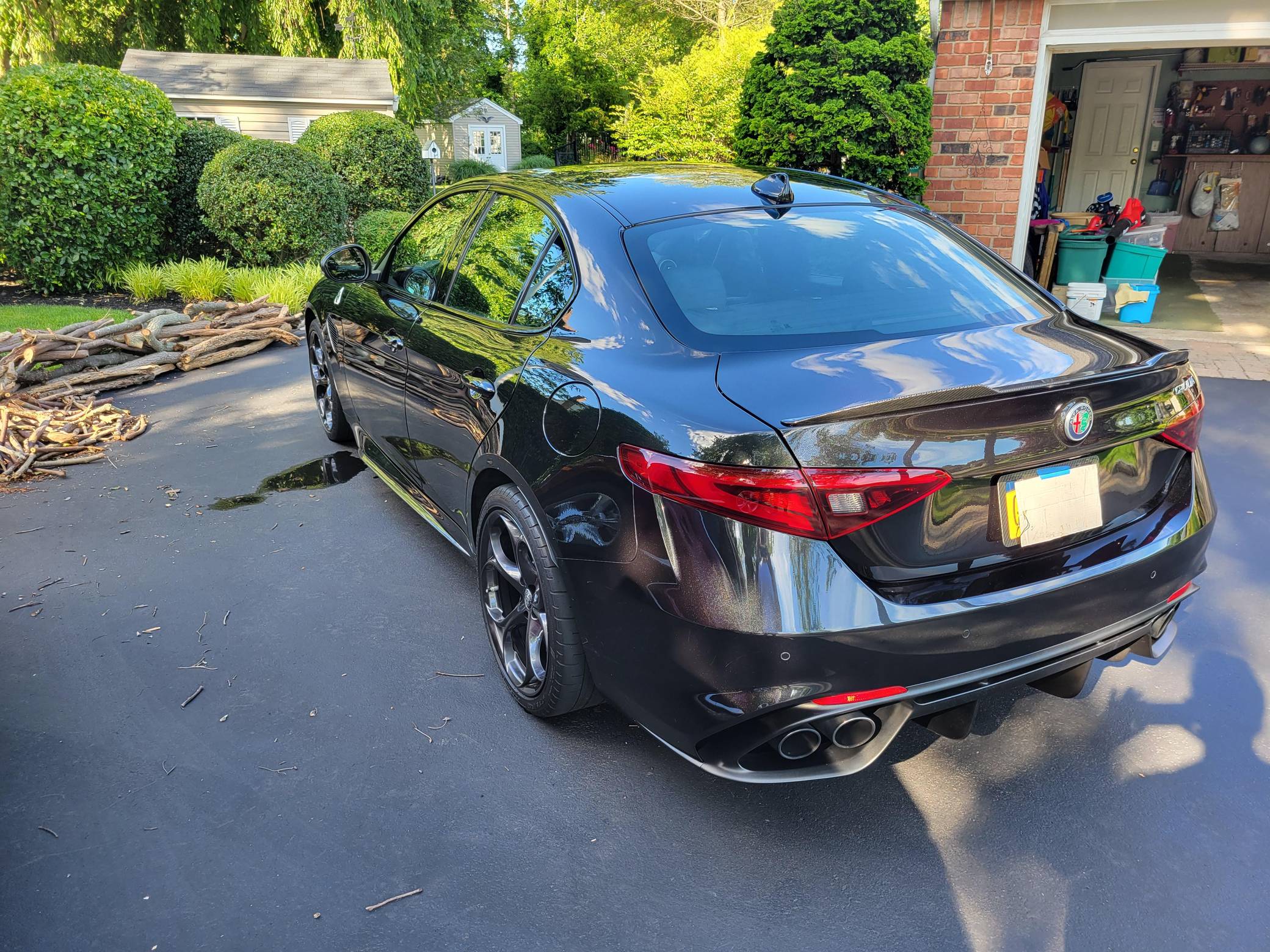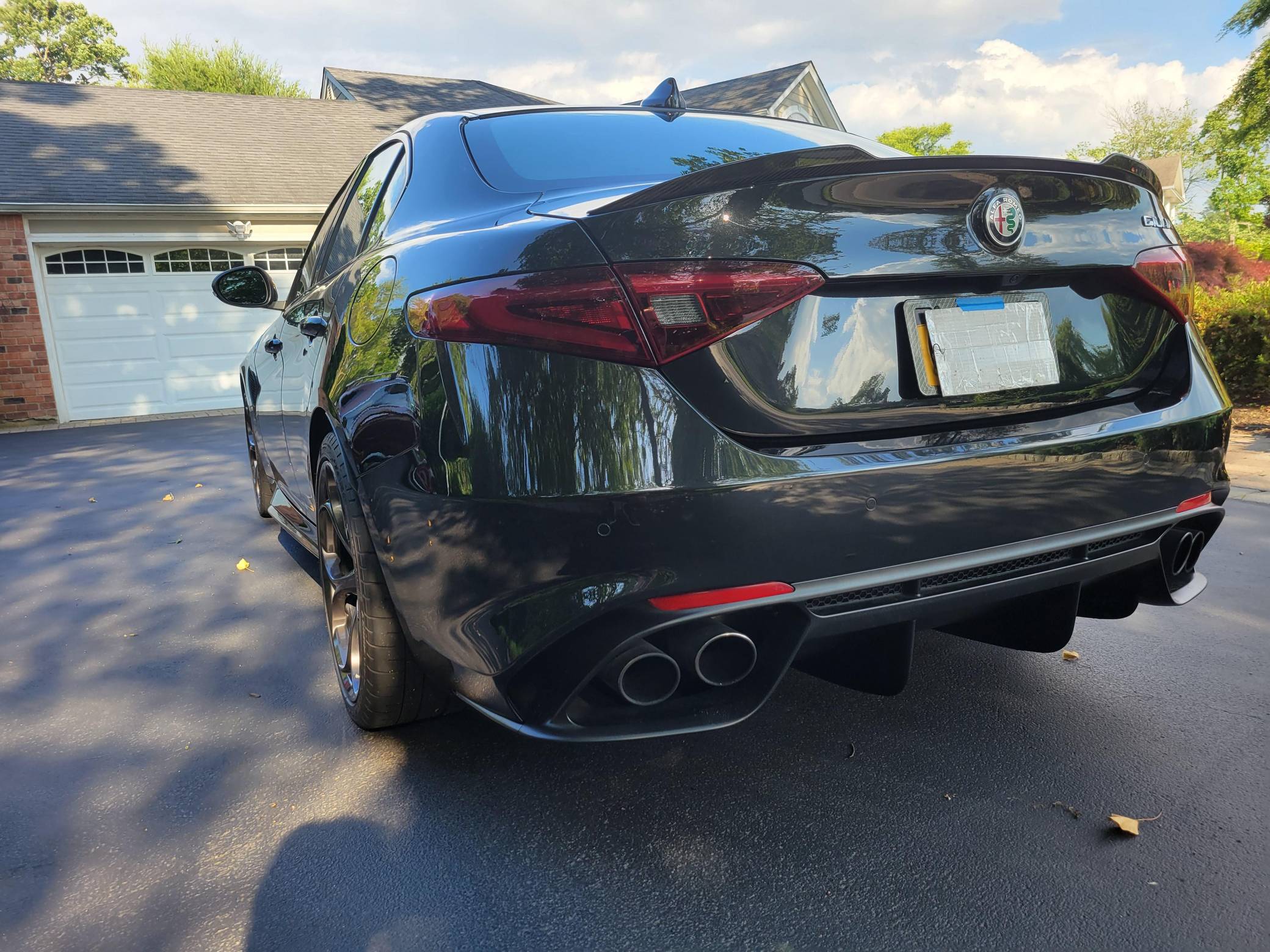 2017 Alfa Romeo Giulia Quadrifoglio, finished in Vulcano Black with a black and red interior. No modifications have been reported by the seller. The Alfa Romeo Giulia Quadrifoglio — which means "four-leaf clover" in Italian — has been praised by automotive journalists and enthusiasts for its exotic styling and outstanding performance. It broke the Nürburgring's Nordschleife record for a production sedan with a time of 7 minutes 39 seconds and was named MotorTrend Car of the Year in 2018. Power comes from a Ferrari-derived "F154" 2. 9-liter twin-turbocharged V6 engine, rated at 505 horsepower and 443 lb-ft of torque. Output is sent to the rear wheels via an 8-speed automatic transmission.