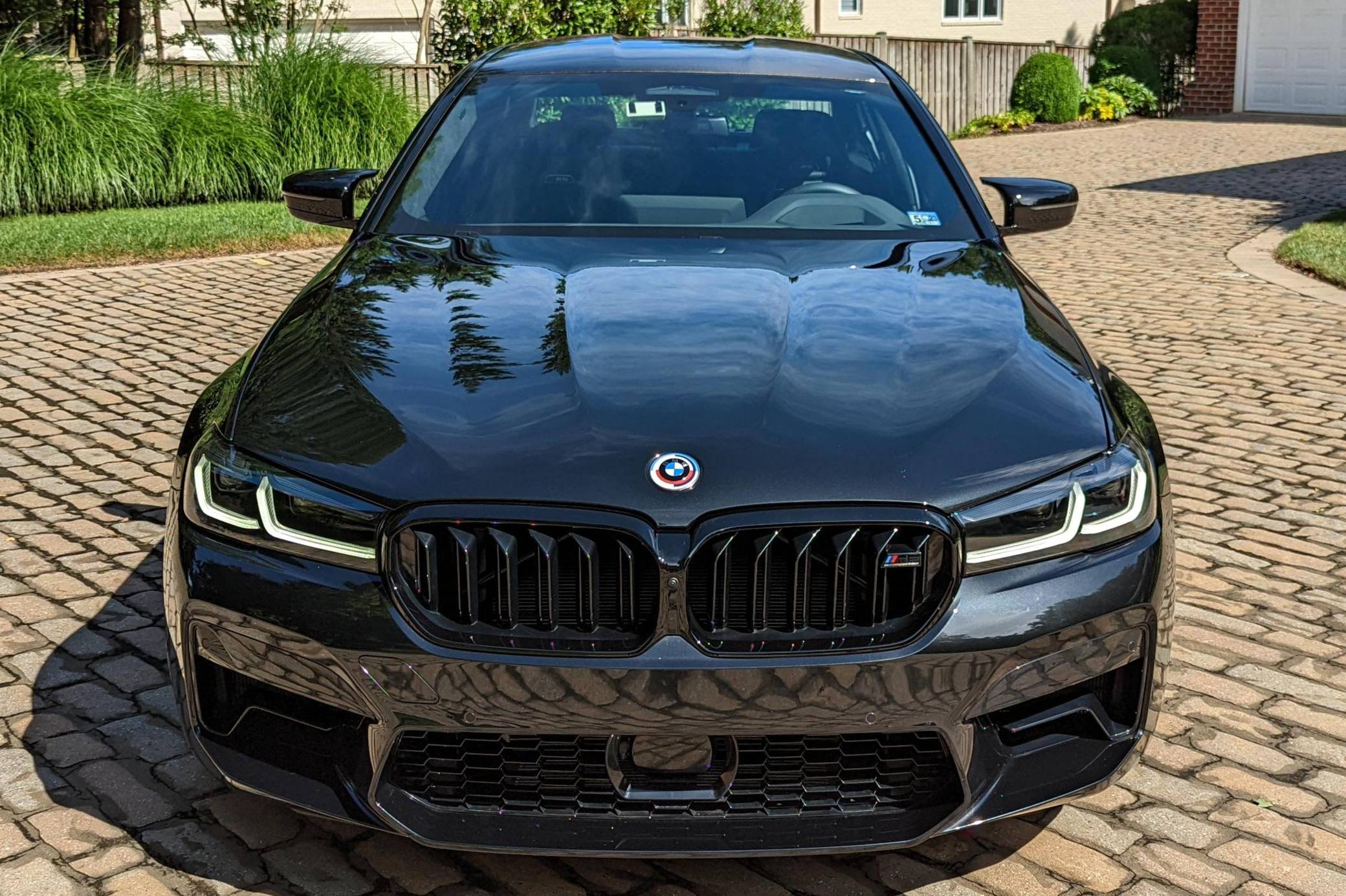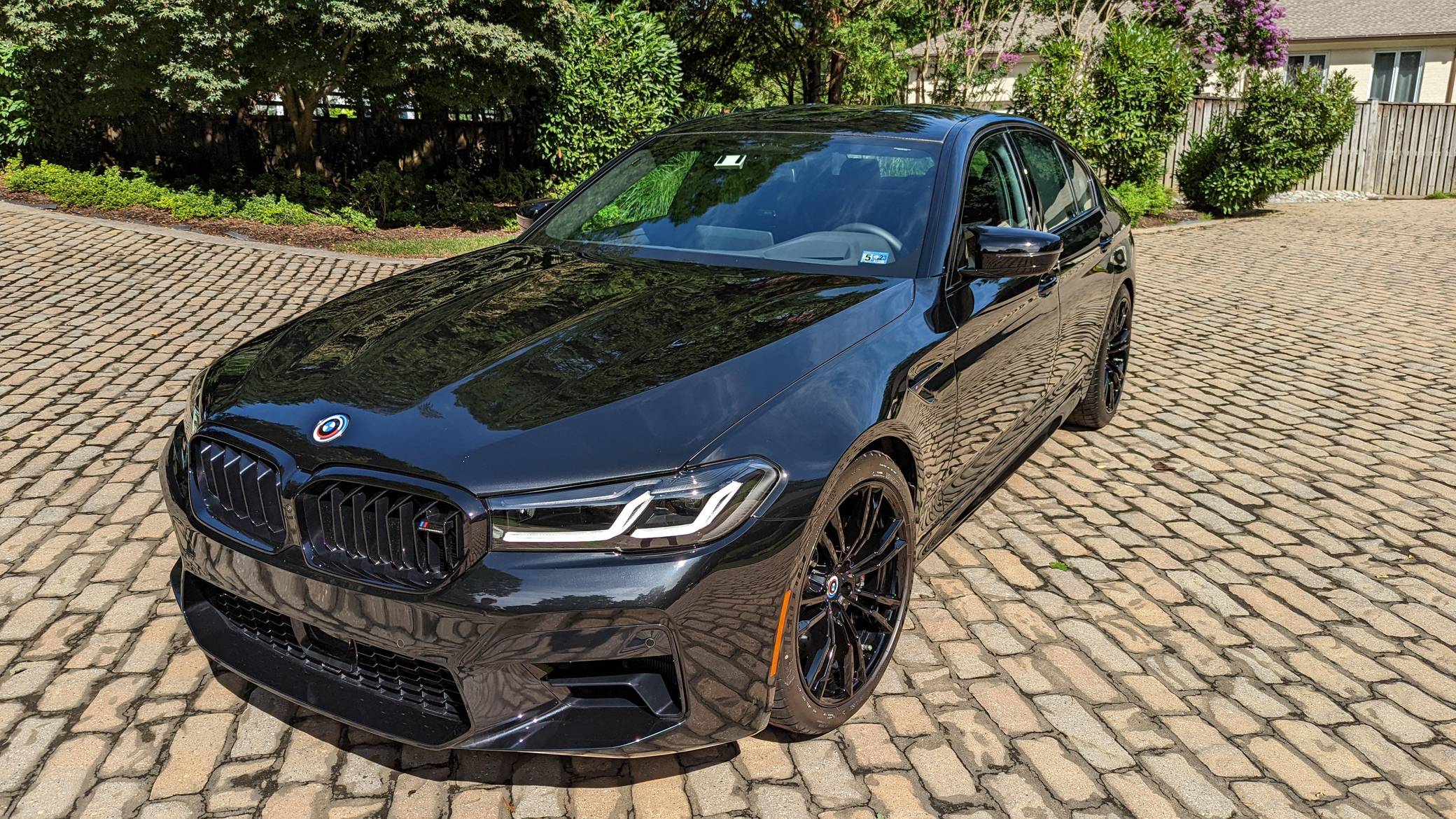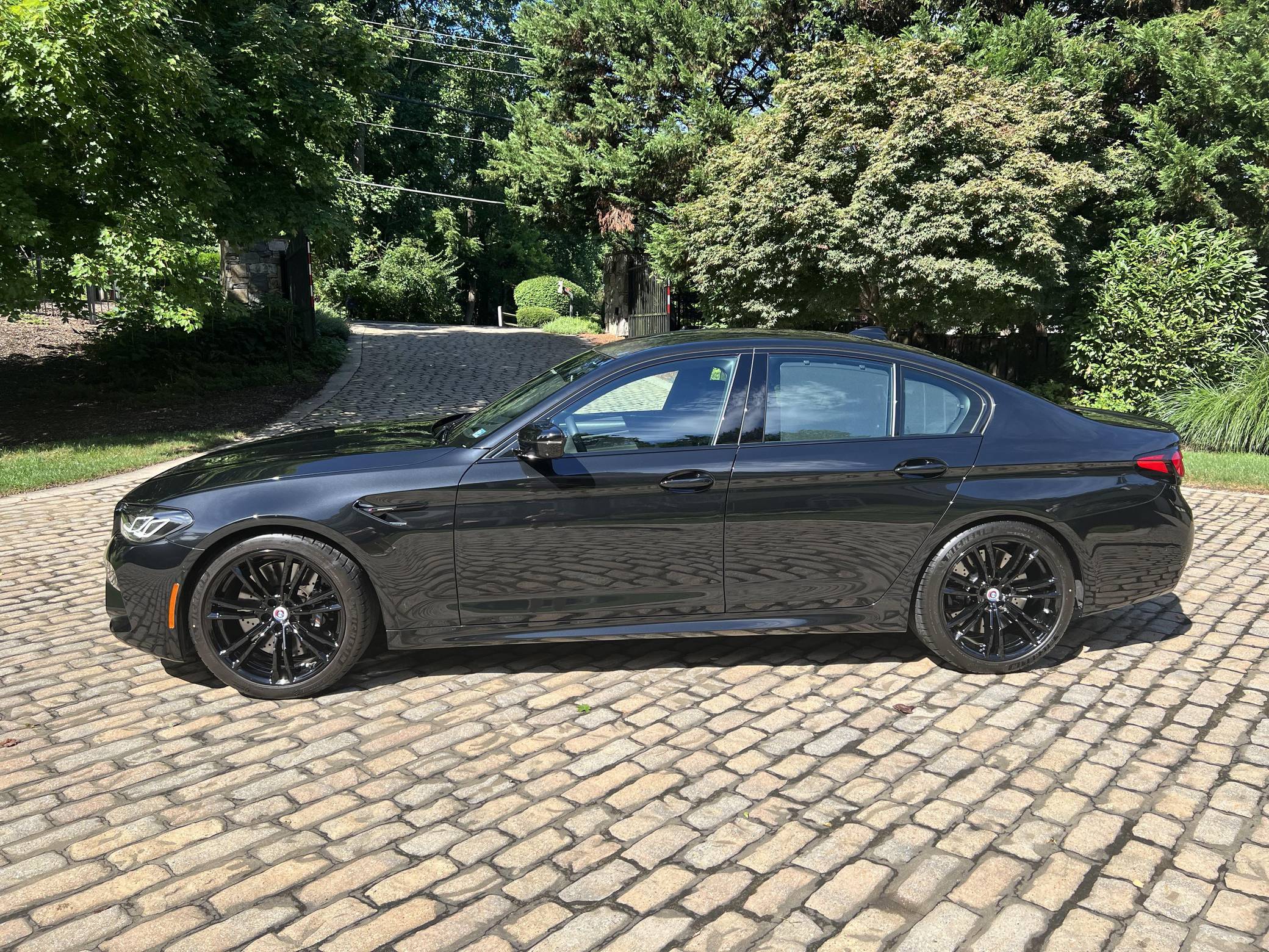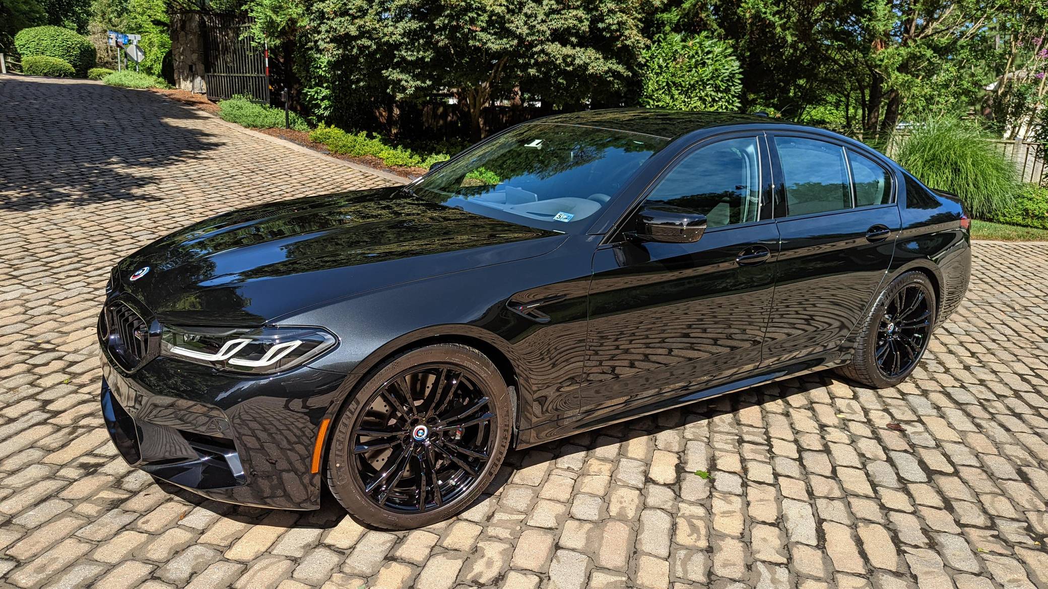 2022 BMW M5 Competition, finished in Black Sapphire Metallic with a black interior. The odometer displays approximately 1,900 miles. A partial list of notable equipment includes the Competition, Drivers Assistance Pro, and Executive Packages, remote engine start, M Compound brakes, adaptive full LED headlights, extended Merino leather upholstery, ventilated and power-adjustable front seats, a heated steering wheel, and 4-zone climate control, among others listed below. The seller reports no modifications. BMW introduced the sixth-generation M5 for the 2018 model year. Based on the G30 5 Series, the F90 received significant chassis modifications from BMW M earning a different chassis designation compared to the standard car; a first in BMW M5 history. It's also the first M5 equipped with xDrive all-wheel drive. The system is rear-biased in its standard configuration to provide better traction without sacrificing handling, but it can be switched off to make the M5 fully rear-wheel drive. Power comes from a twin-turbocharged 4. 4-liter V8, which produces 617 horsepower and 553 lb-ft of torque. It powers all four wheels via an 8-speed M Steptronic automatic transmission and M xDrive all-wheel drive system.