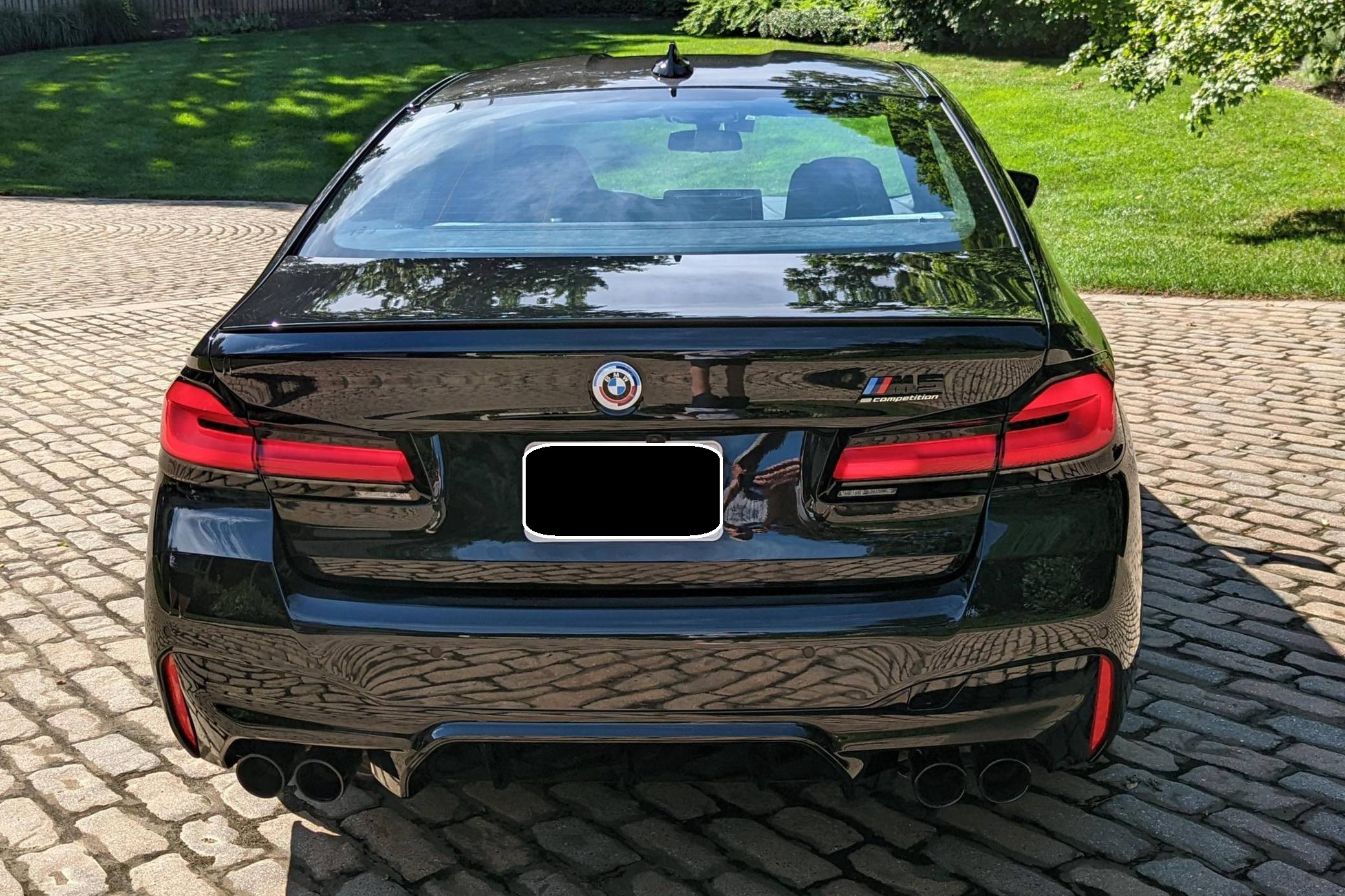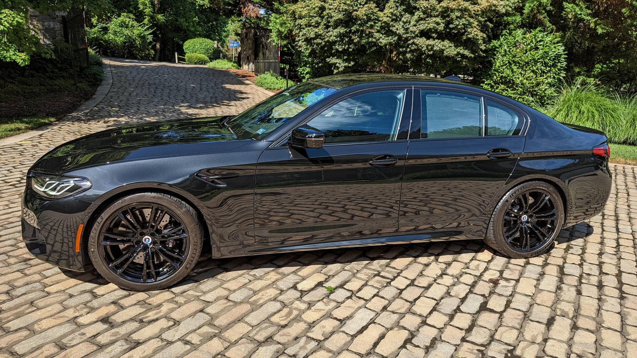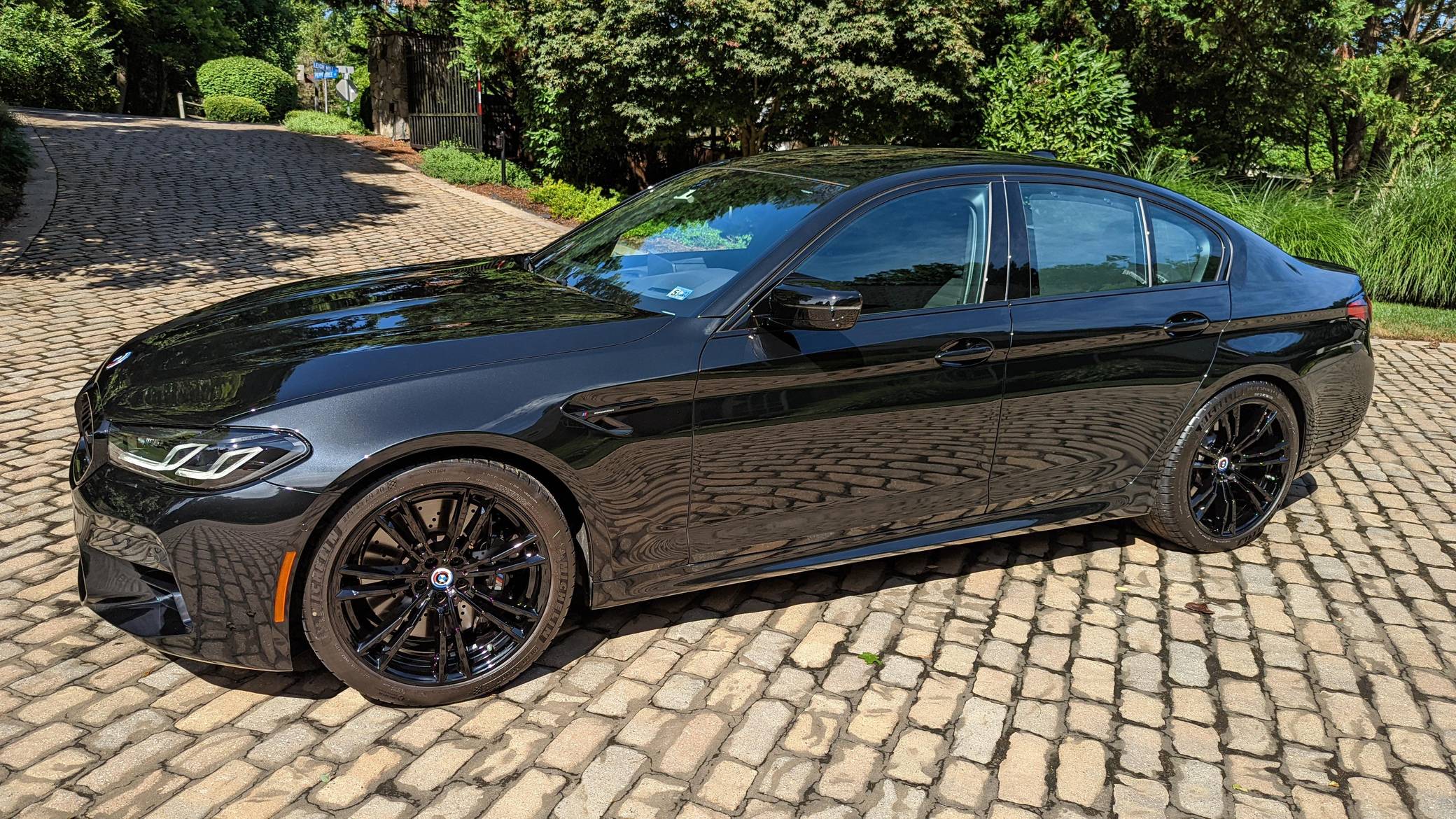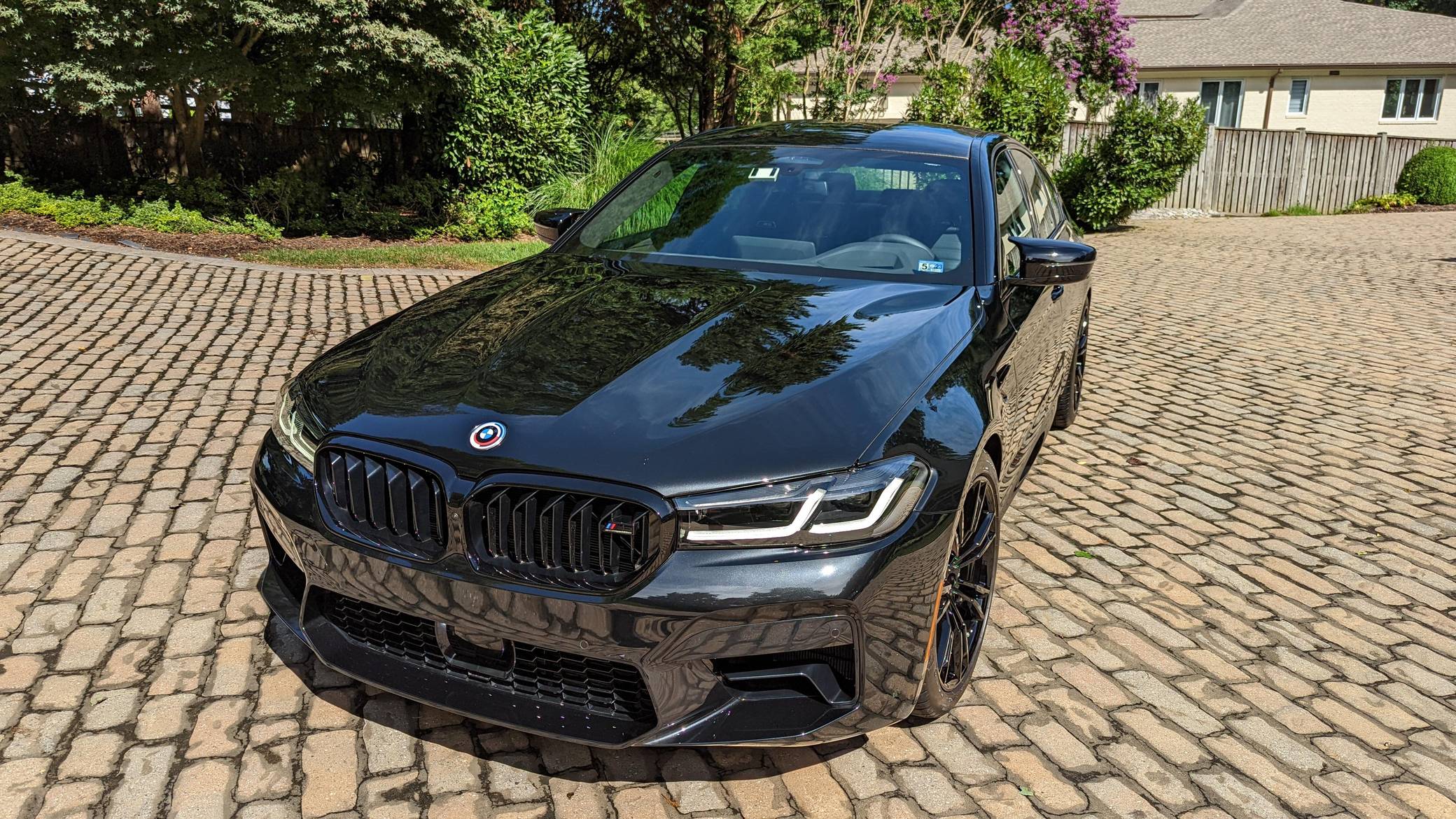 2022 BMW M5 Competition, finished in Black Sapphire Metallic with a black interior. The odometer displays approximately 1,900 miles. A partial list of notable equipment includes the Competition, Drivers Assistance Pro, and Executive Packages, remote engine start, M Compound brakes, adaptive full LED headlights, extended Merino leather upholstery, ventilated and power-adjustable front seats, a heated steering wheel, and 4-zone climate control, among others listed below. The seller reports no modifications. BMW introduced the sixth-generation M5 for the 2018 model year. Based on the G30 5 Series, the F90 received significant chassis modifications from BMW M earning a different chassis designation compared to the standard car; a first in BMW M5 history. It's also the first M5 equipped with xDrive all-wheel drive. The system is rear-biased in its standard configuration to provide better traction without sacrificing handling, but it can be switched off to make the M5 fully rear-wheel drive. Power comes from a twin-turbocharged 4. 4-liter V8, which produces 617 horsepower and 553 lb-ft of torque. It powers all four wheels via an 8-speed M Steptronic automatic transmission and M xDrive all-wheel drive system.