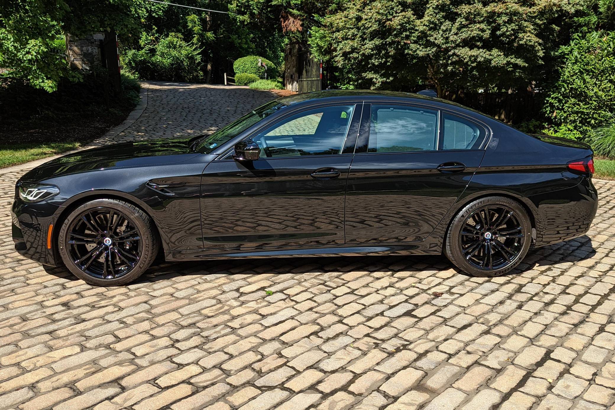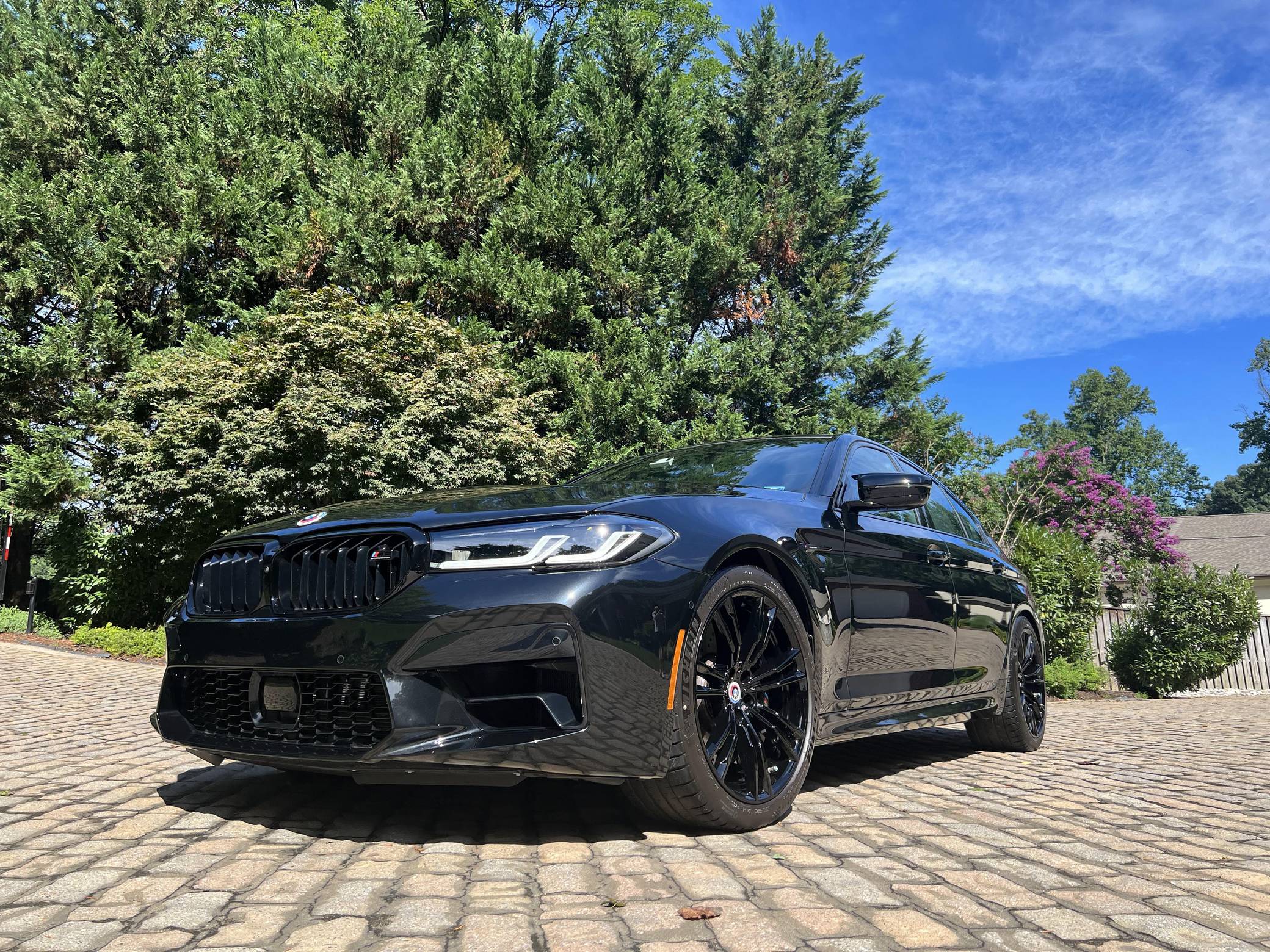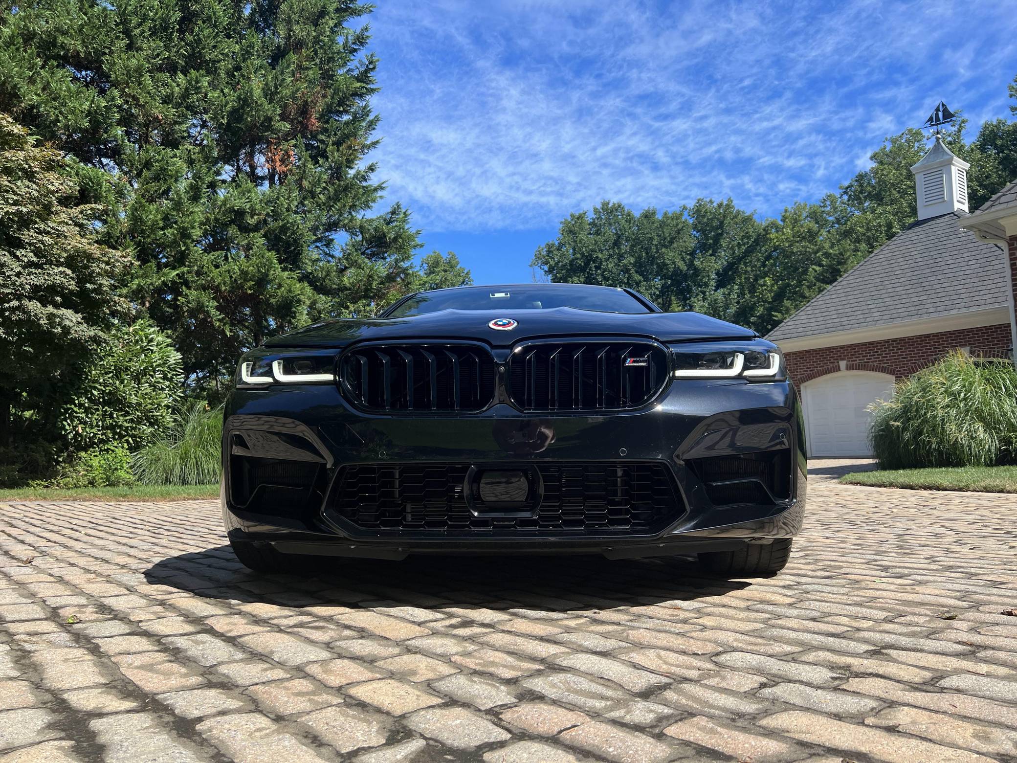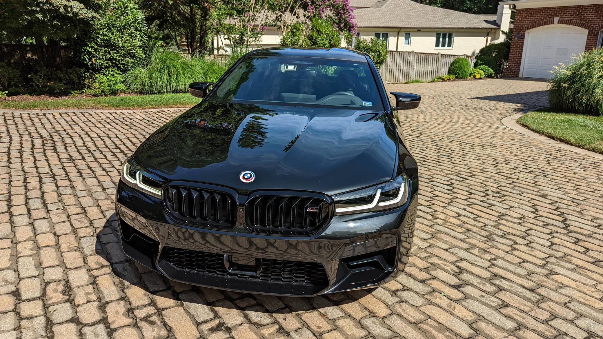 2022 BMW M5 Competition, finished in Black Sapphire Metallic with a black interior. The odometer displays approximately 1,900 miles. A partial list of notable equipment includes the Competition, Drivers Assistance Pro, and Executive Packages, remote engine start, M Compound brakes, adaptive full LED headlights, extended Merino leather upholstery, ventilated and power-adjustable front seats, a heated steering wheel, and 4-zone climate control, among others listed below. The seller reports no modifications. BMW introduced the sixth-generation M5 for the 2018 model year. Based on the G30 5 Series, the F90 received significant chassis modifications from BMW M earning a different chassis designation compared to the standard car; a first in BMW M5 history. It's also the first M5 equipped with xDrive all-wheel drive. The system is rear-biased in its standard configuration to provide better traction without sacrificing handling, but it can be switched off to make the M5 fully rear-wheel drive. Power comes from a twin-turbocharged 4. 4-liter V8, which produces 617 horsepower and 553 lb-ft of torque. It powers all four wheels via an 8-speed M Steptronic automatic transmission and M xDrive all-wheel drive system.
