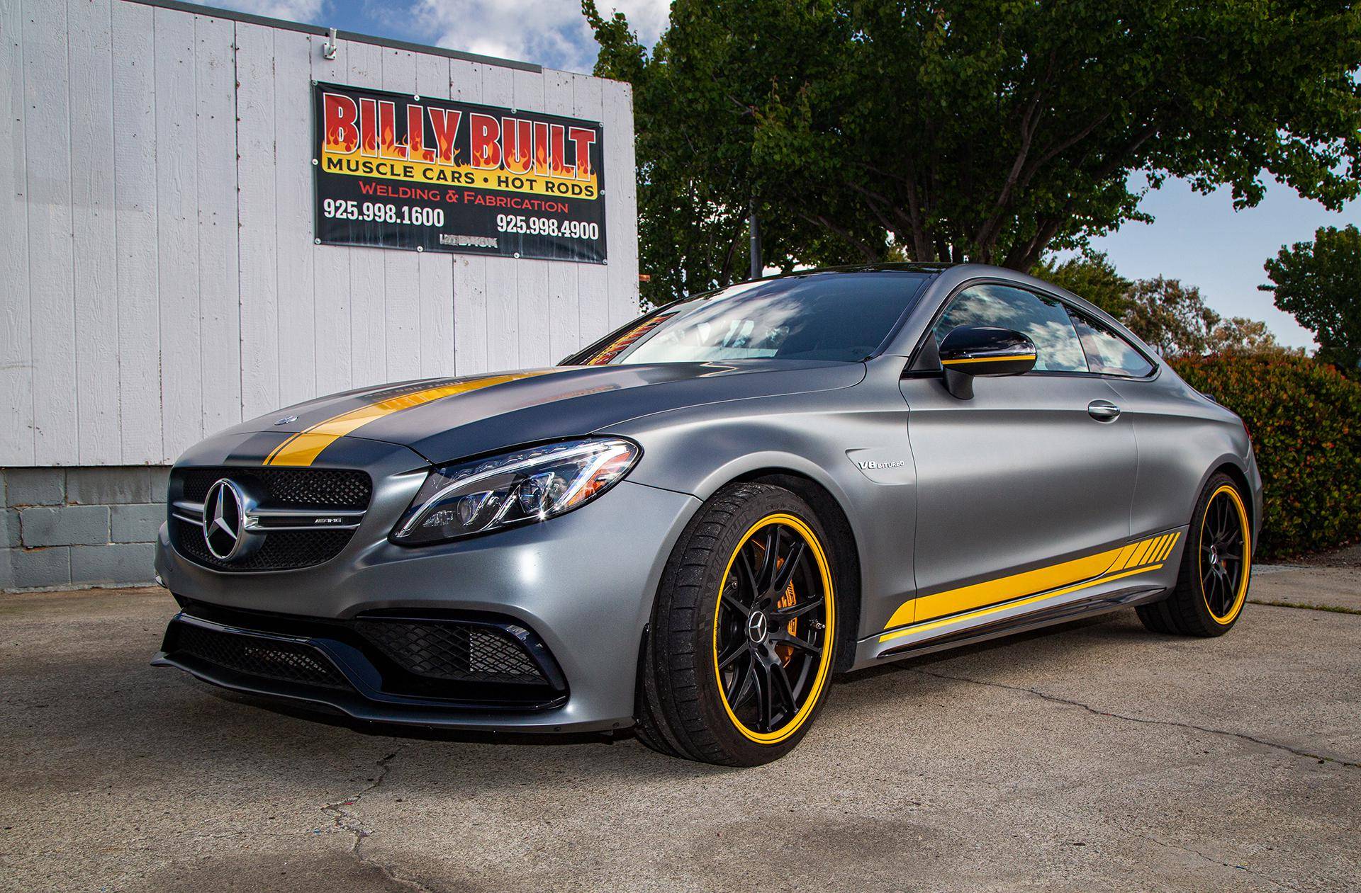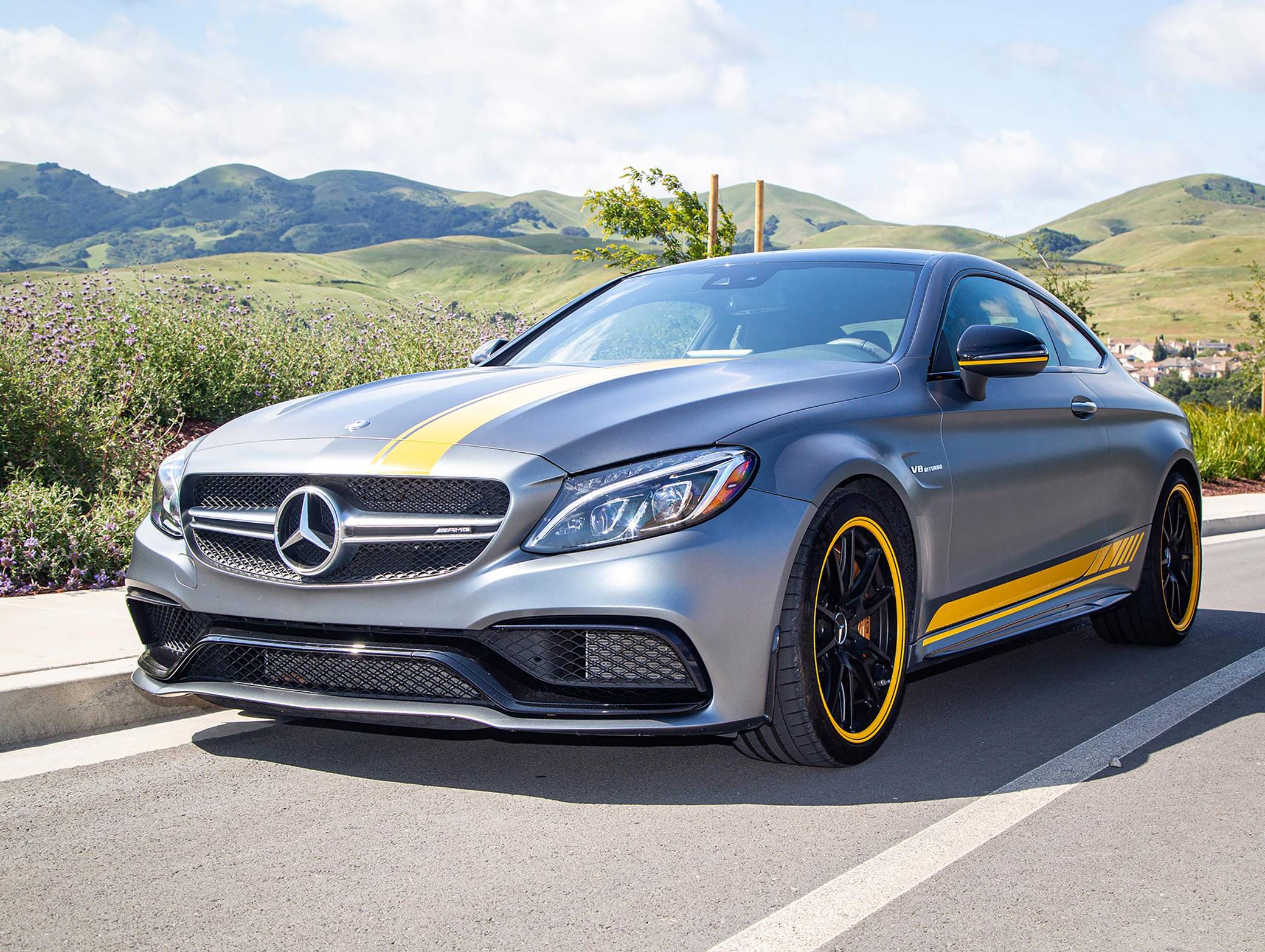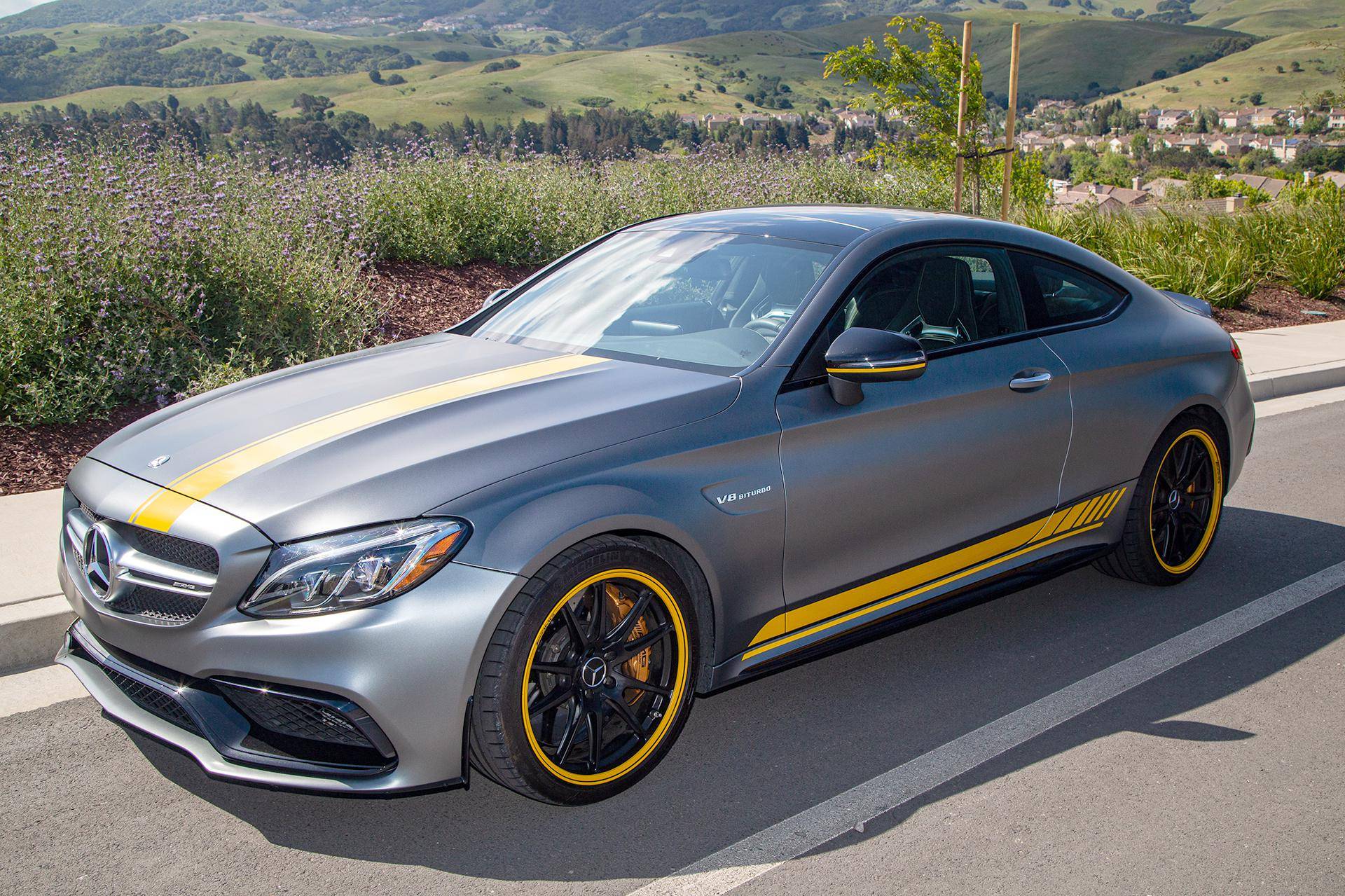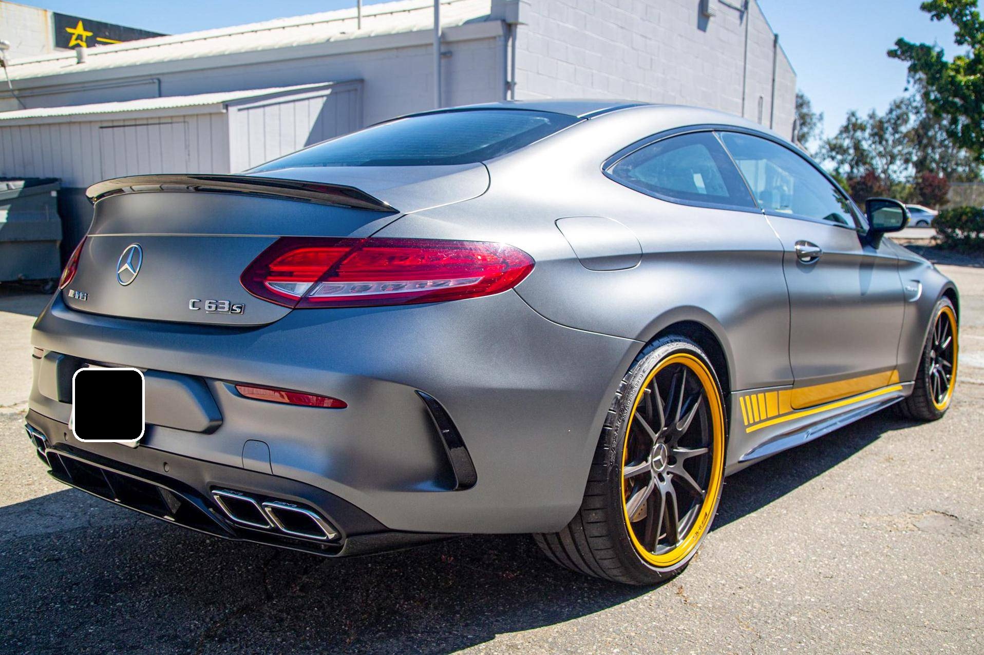 2017 Mercedes-AMG C63 S Coupe, finished in Designo Selenite Grey Magno with a black interior. This coupe's odometer displays about 25,500 miles. It's equipped with the Edition 1 package, dynamic engine mounts, LED exterior lighting, a panoramic sunroof, matte carbon fiber interior trim, AMG performance front sport seats, and a Burmester surround sound system. Mercedes-AMG introduced the "W205"-based C63 for the 2015 model year, shortly after it morphed into a sub-brand within Mercedes-Benz. Offered as a sedan and as a coupe, the C63 surfed the downsizing wave sweeping across the industry by trading displacement for forced induction, yet it was quicker and sharper to drive than its predecessor. Production ended in 2021, and Mercedes-AMG has confirmed that it won't build another V8-powered C63. Power comes from a 4. 0-liter twin-turbocharged V8, rated at 503 horsepower and 516 lb-ft of torque. The engine spins the rear wheels via a 7-speed automatic transmission.