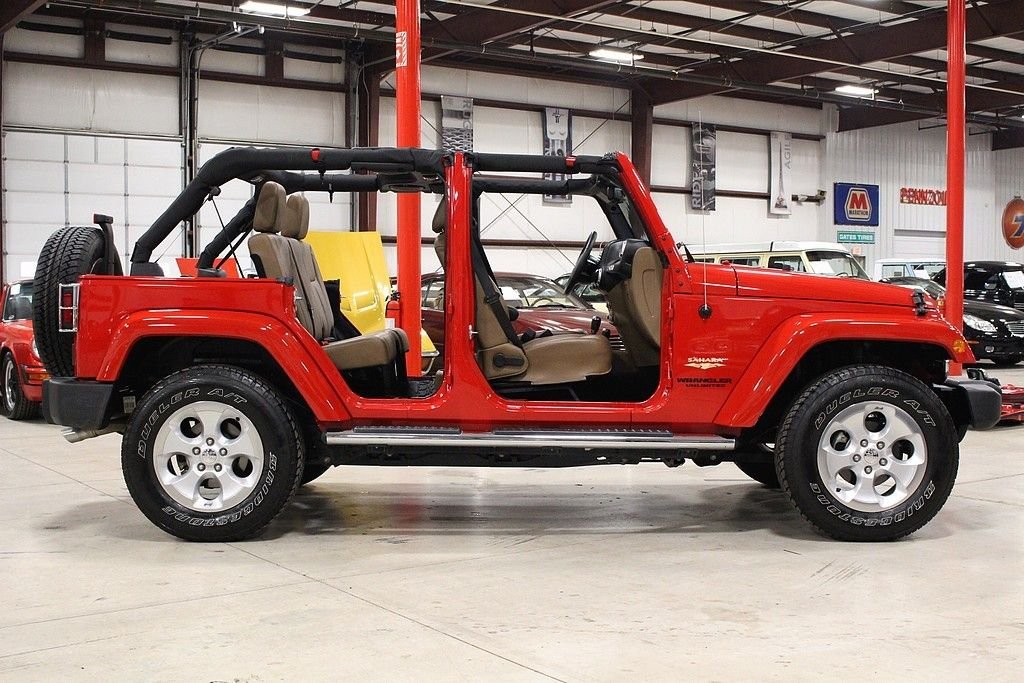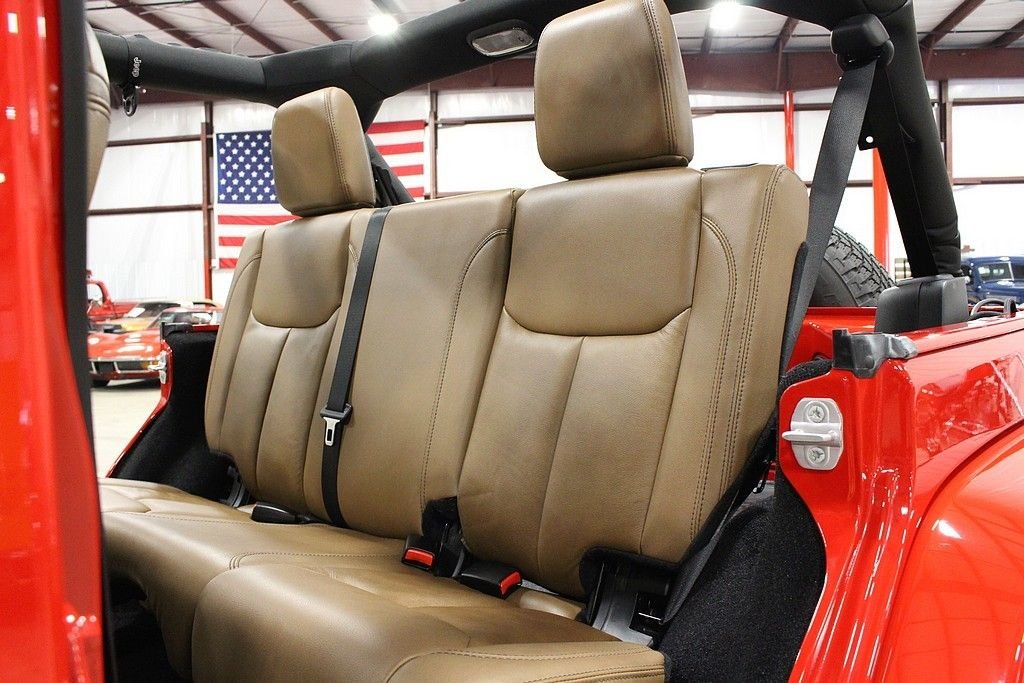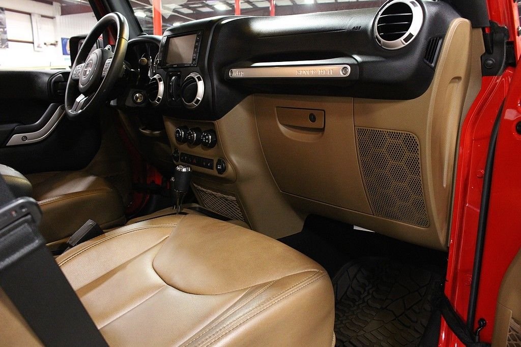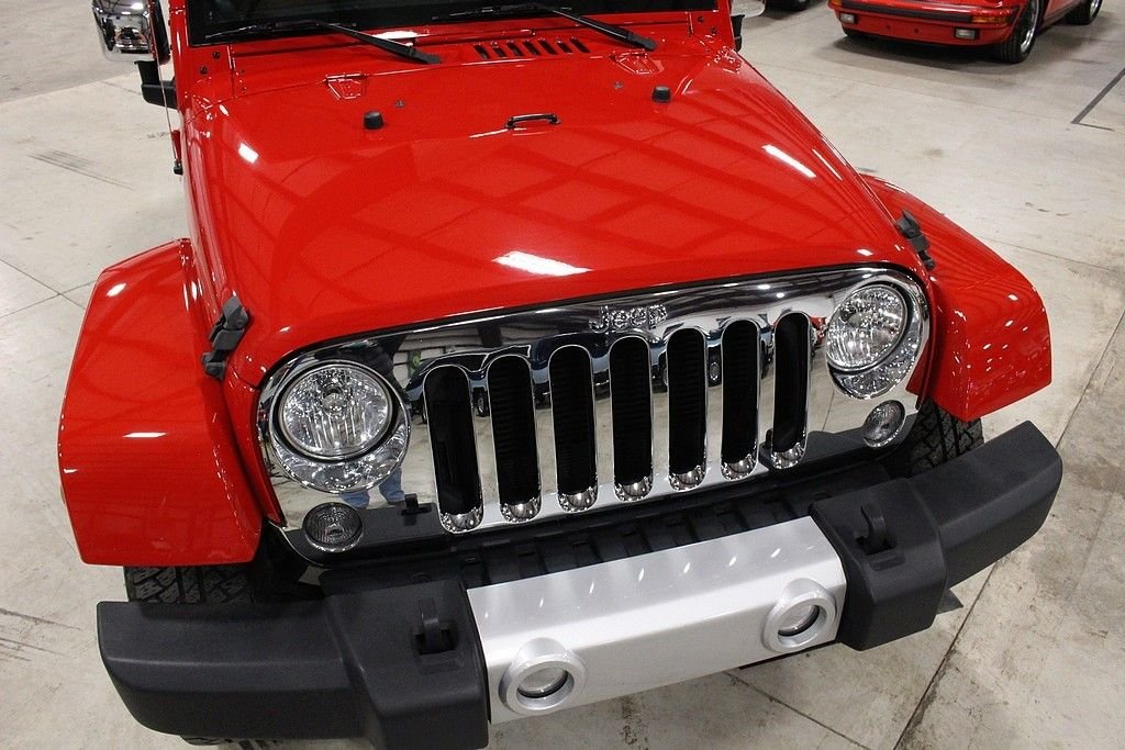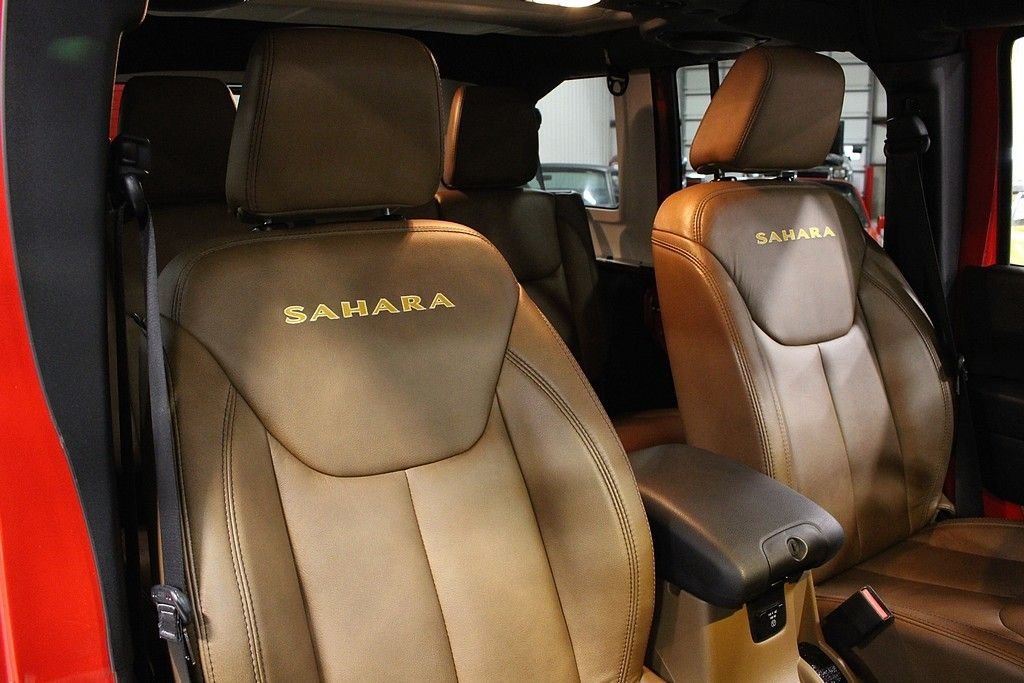 Pleased to offer this very stylish Jeep Wrangler Unlimited Sahara for your consideration. This 4dr version has been a very hot seller for Jeep and with the updated 3.6L engine with 285HP this mean machine will get you anywhere you want to travel or explore. The Sahara model is quite impressive with the standard creature comforts and this particular one is heavily optioned with factory features. Full power windows, power locks, mirrors, keyless entry and remote starter are just a few that are standard. Auto climate control and the 18in alloy wheels are impressive features along with the standard traction control and DANA front axles and solid rear axle that will get you out of any situation. This gorgeous Flame Red Wrangler is extremely nice with a very strong list of options from the factory. Paint looks as new and the interior is free from any signs of abuse. The Sahara model gives you some great features but this one comes with the following factory installed features; Leather trimmed seats, heated front seats, Bluetooth phone setup, Navigation system, tire pressure monitor, on-board computer, Chrome Edition Package which gives you chrome exhaust tip, chrome front grill, chrome side mirrors, chrome rear tail light covers, chrome side step bars, and chrome fuel filler door. This Sahara also comes with the expensive option of the Freedom color coded hard top which gives you the ability to pop out the front two panels for an open air feel without taking off the full top. Tow package and rear window wiper and defrost complete the top. Vehicle also comes with a class II tow package and 3.73 rear axle. Further options include the front side airbags, Slush mats by Mopar, 5-speed automatic transmission with hill decent control, Trac-Lok differential rear axle, and rounding out with the XM radio setup with remote USB port and full soft top. This is not your standard or basic Wrangler, MSRP was over $45k and these may be the best resale value vehicles on the market for any new vehicle. Car has been pampered and driven with care. The cool contrasting Saddle leather gives the Jeep a great look and stands out from the traditional black interiors. This car stands out from the rest and we highly encourage you to take a closer look at this very cool and fun Wrangler.
