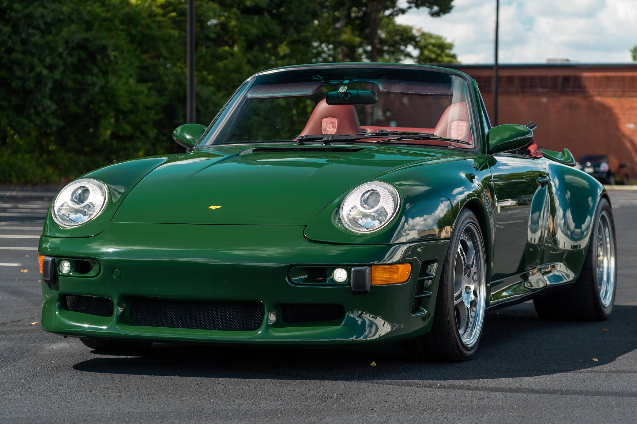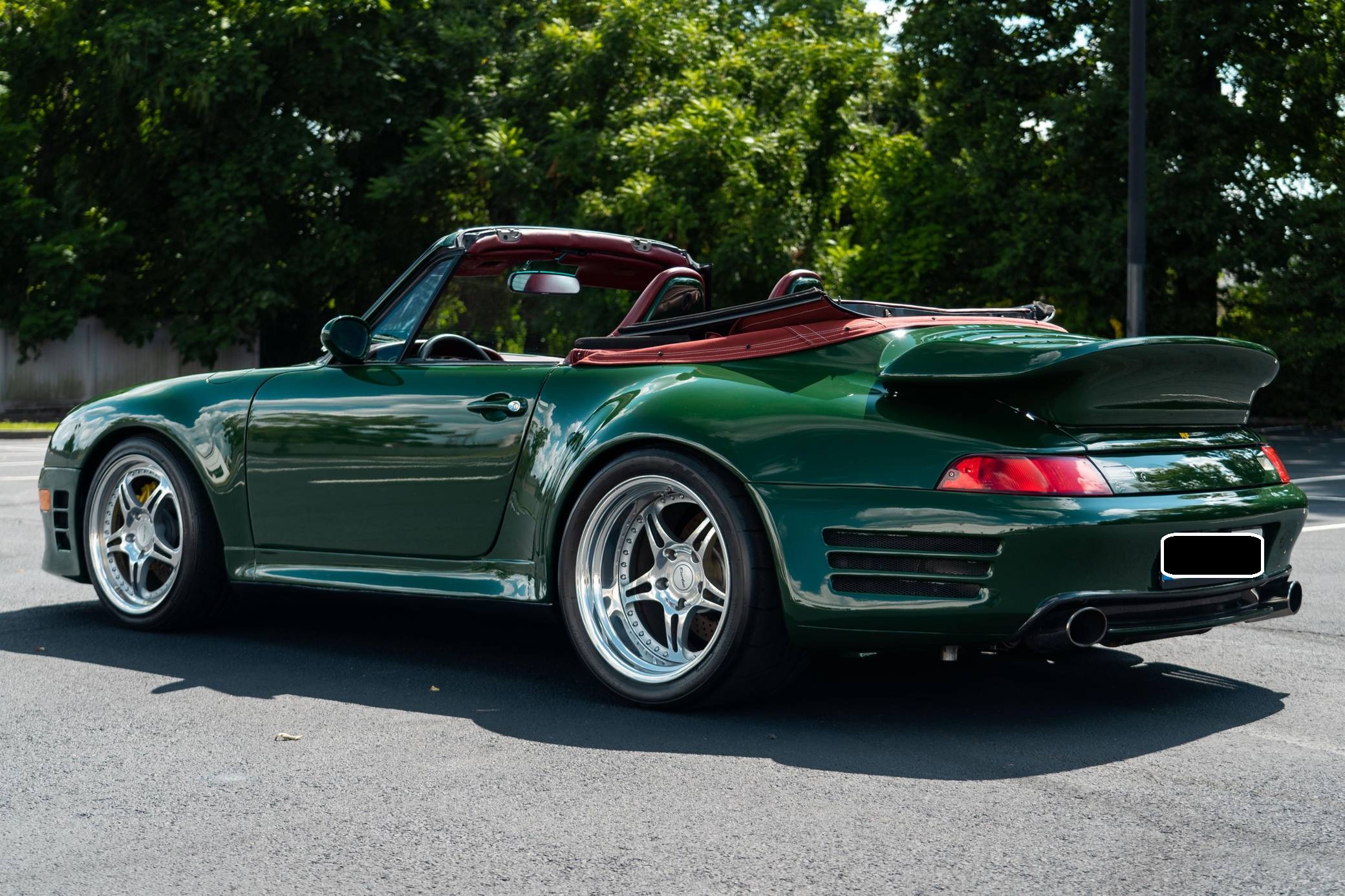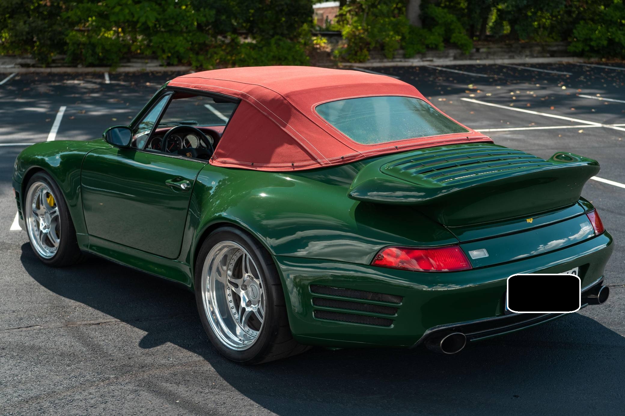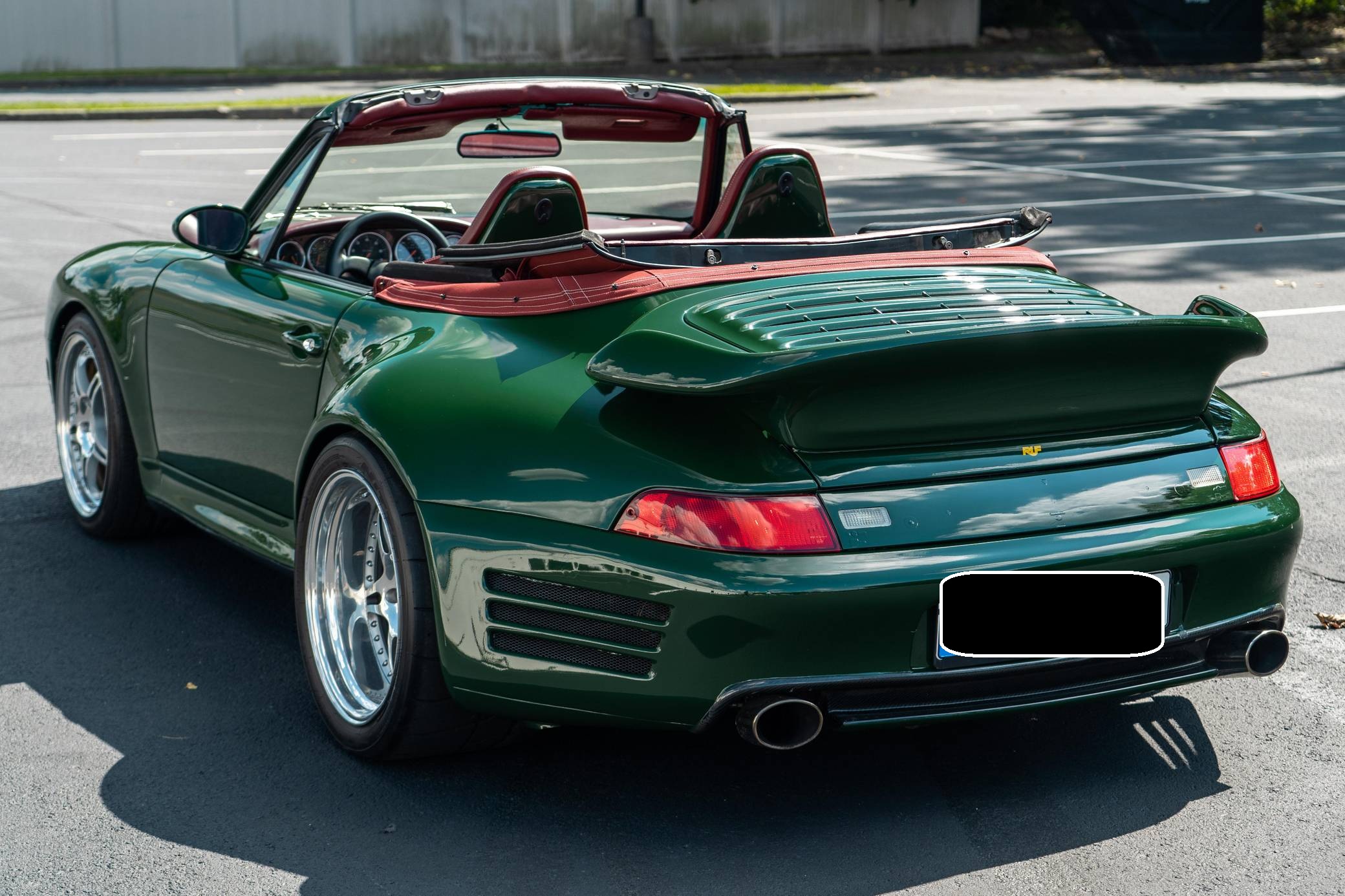 1984 Porsche 911 Carrera Cabriolet, finished in silver with a green exterior wrap, a red soft top, and a red interior. Extensively modified, this 911 is equipped with a 3. 8-liter flat-6 engine, a Turbonetics T3 "Stage 3" twin-turbocharger kit, a Fuel Air Spark Technology twin-plug fuel injection system, 18-inch HRE wheels, adjustable coilovers, a steel wide-body kit, a "whale tail"-style decklid, a soft top from a 1997 911, front sport seats from a 996-generation 911, a boost gauge in the instrument cluster, and a Continental head unit, according to the seller. More details about the aftermarket parts installed on this car are provided below. Porsche introduced the 911 Carrera for the 1984 model year as a replacement for the SC, and a full convertible was offered at launch. Every member of the Carrera line-up gained a bigger engine and minor visual changes, like fog lights integrated into the lower part of the front end. Power comes from a 3. 8-liter twin-turbocharged flat-6 reportedly built by Promotive, Inc. in Harrison, Arkansas. The seller estimates that it makes about 780 horsepower but a dyno sheet is not available. The engine spins the rear wheels via a "G50" 5-speed manual transmission.