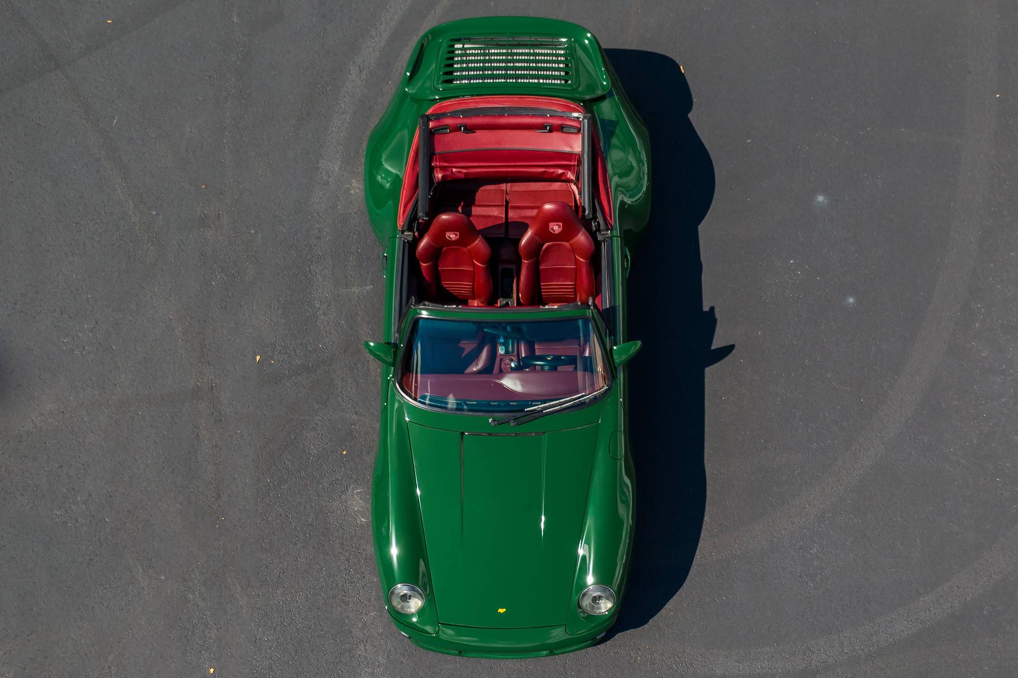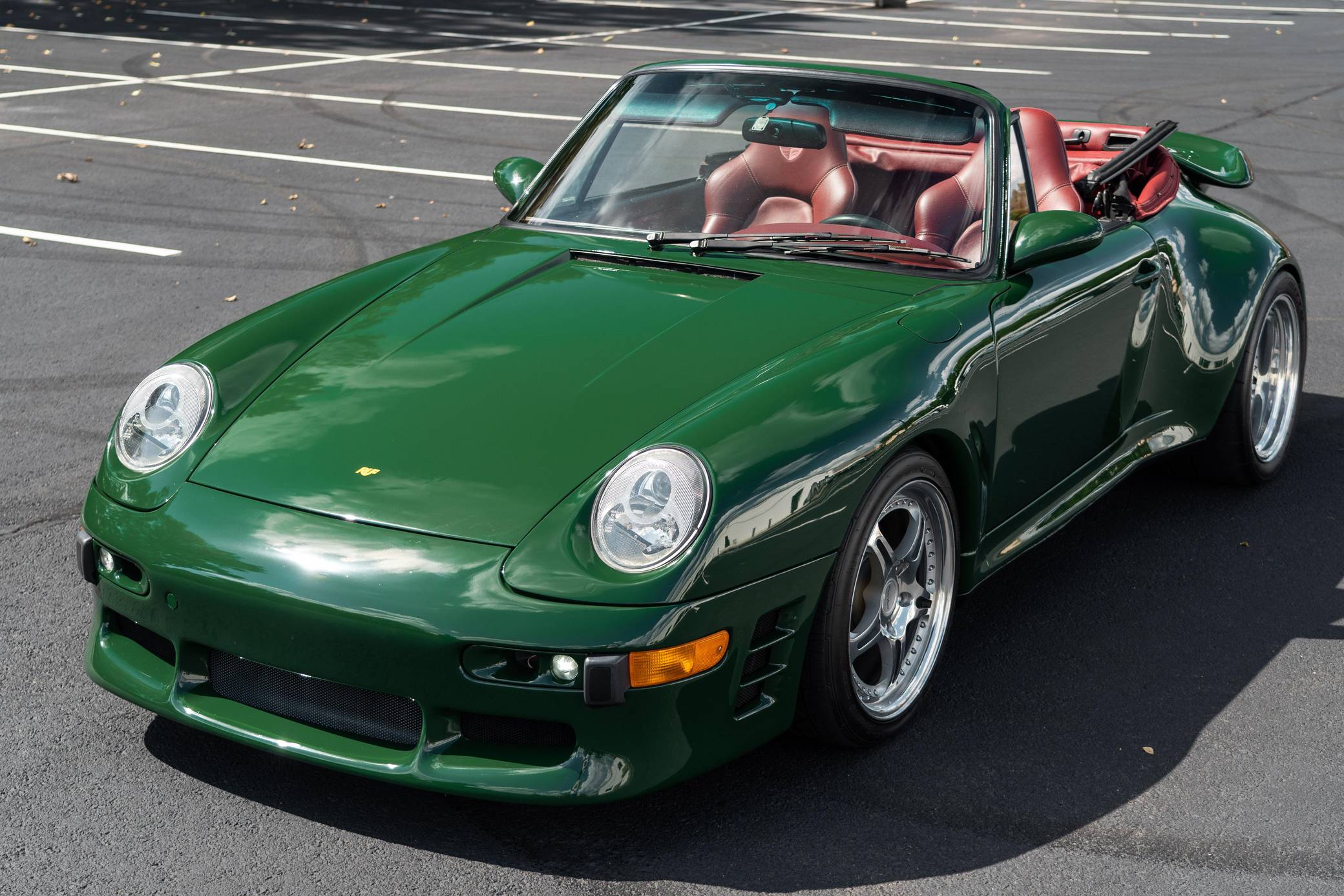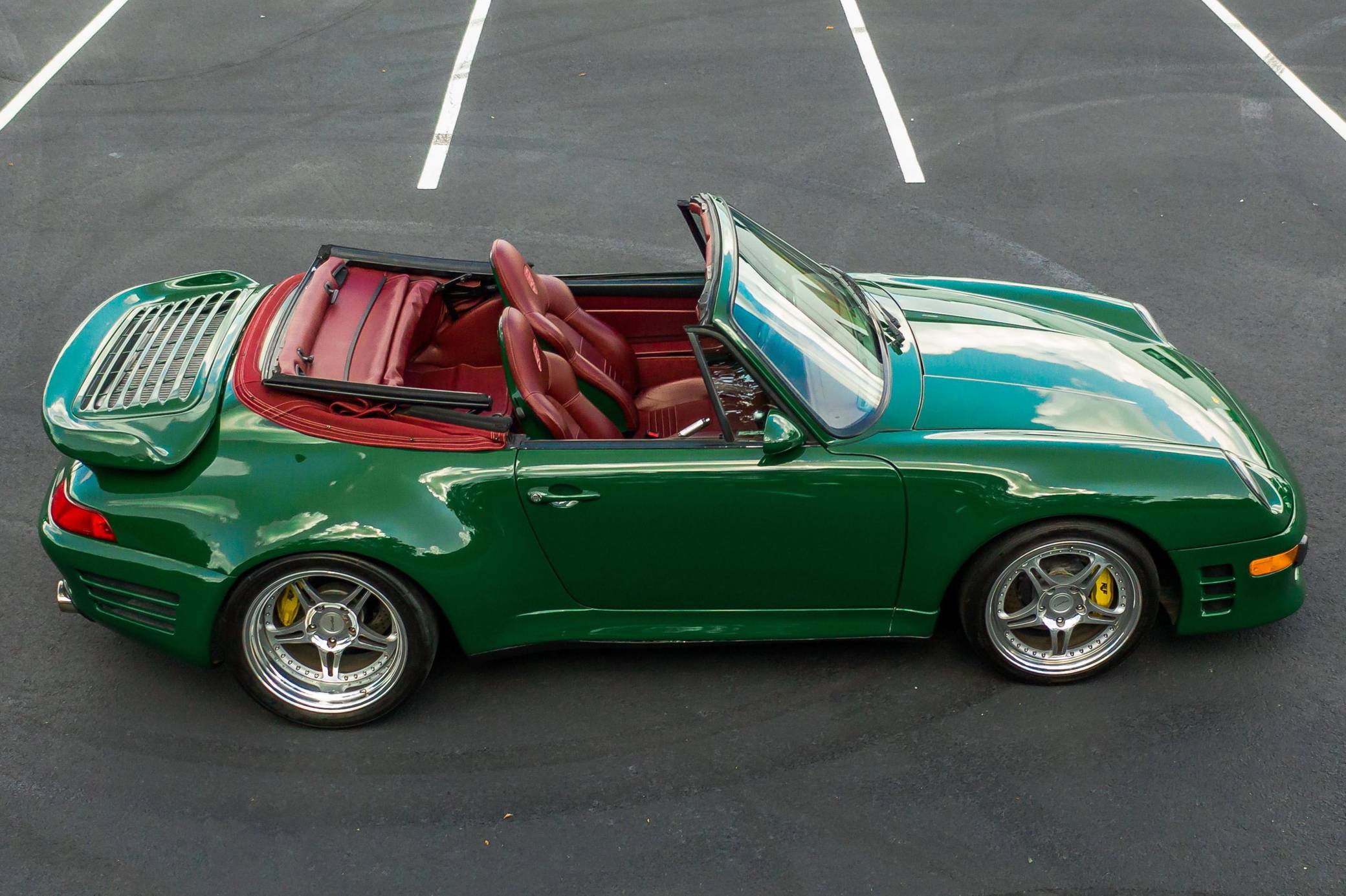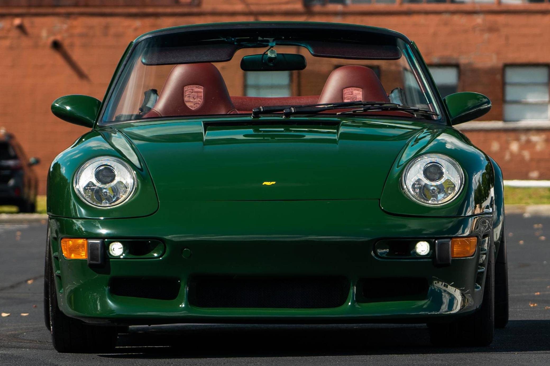 1984 Porsche 911 Carrera Cabriolet, finished in silver with a green exterior wrap, a red soft top, and a red interior. Extensively modified, this 911 is equipped with a 3. 8-liter flat-6 engine, a Turbonetics T3 "Stage 3" twin-turbocharger kit, a Fuel Air Spark Technology twin-plug fuel injection system, 18-inch HRE wheels, adjustable coilovers, a steel wide-body kit, a "whale tail"-style decklid, a soft top from a 1997 911, front sport seats from a 996-generation 911, a boost gauge in the instrument cluster, and a Continental head unit, according to the seller. More details about the aftermarket parts installed on this car are provided below. Porsche introduced the 911 Carrera for the 1984 model year as a replacement for the SC, and a full convertible was offered at launch. Every member of the Carrera line-up gained a bigger engine and minor visual changes, like fog lights integrated into the lower part of the front end. Power comes from a 3. 8-liter twin-turbocharged flat-6 reportedly built by Promotive, Inc. in Harrison, Arkansas. The seller estimates that it makes about 780 horsepower but a dyno sheet is not available. The engine spins the rear wheels via a "G50" 5-speed manual transmission.