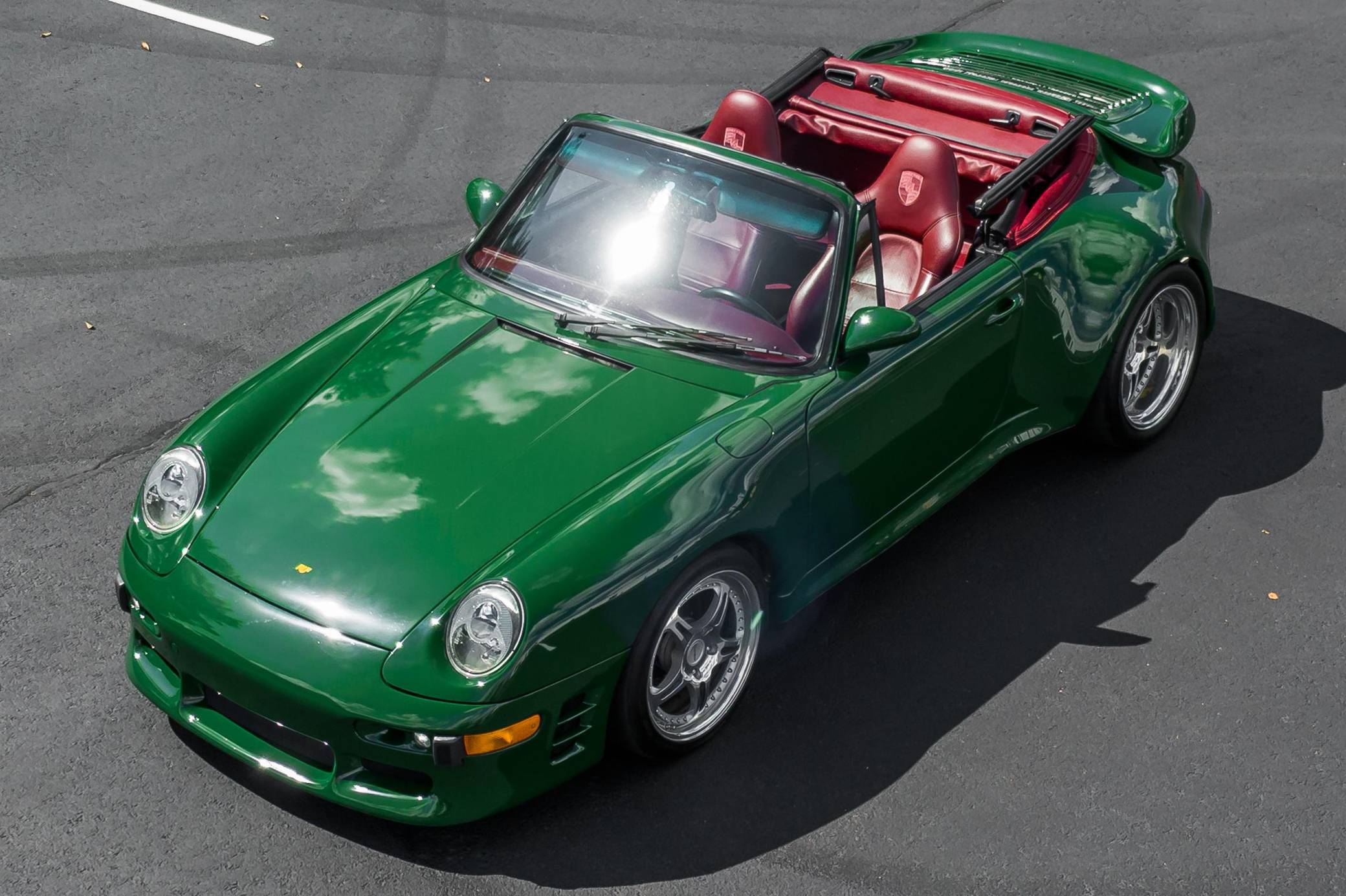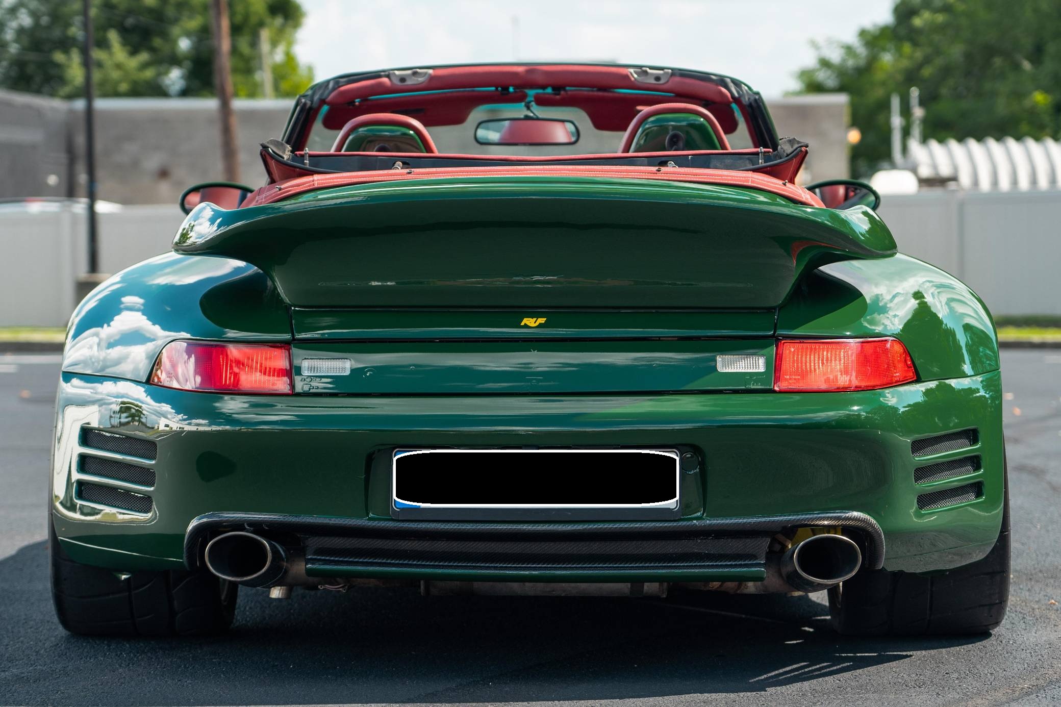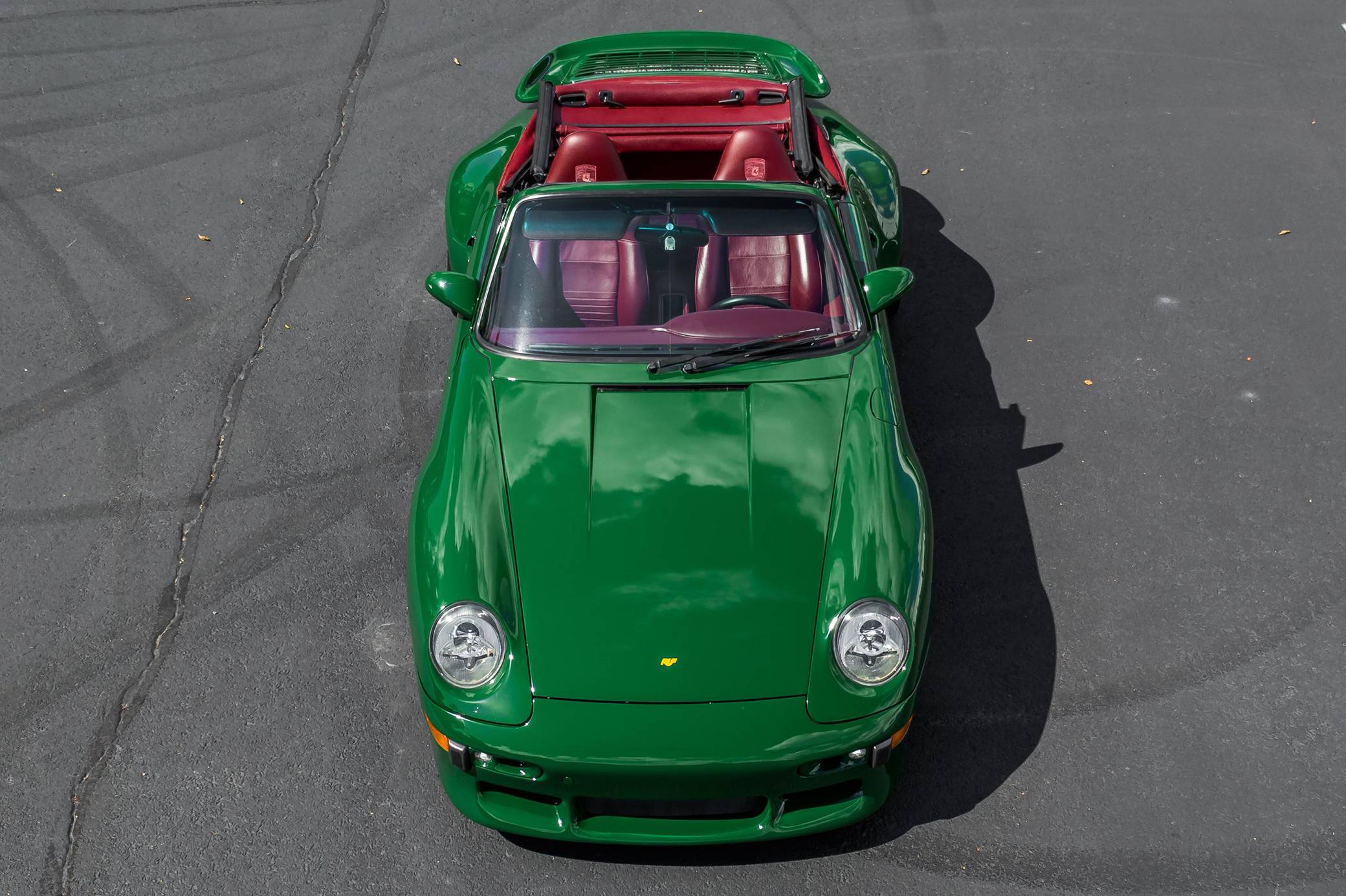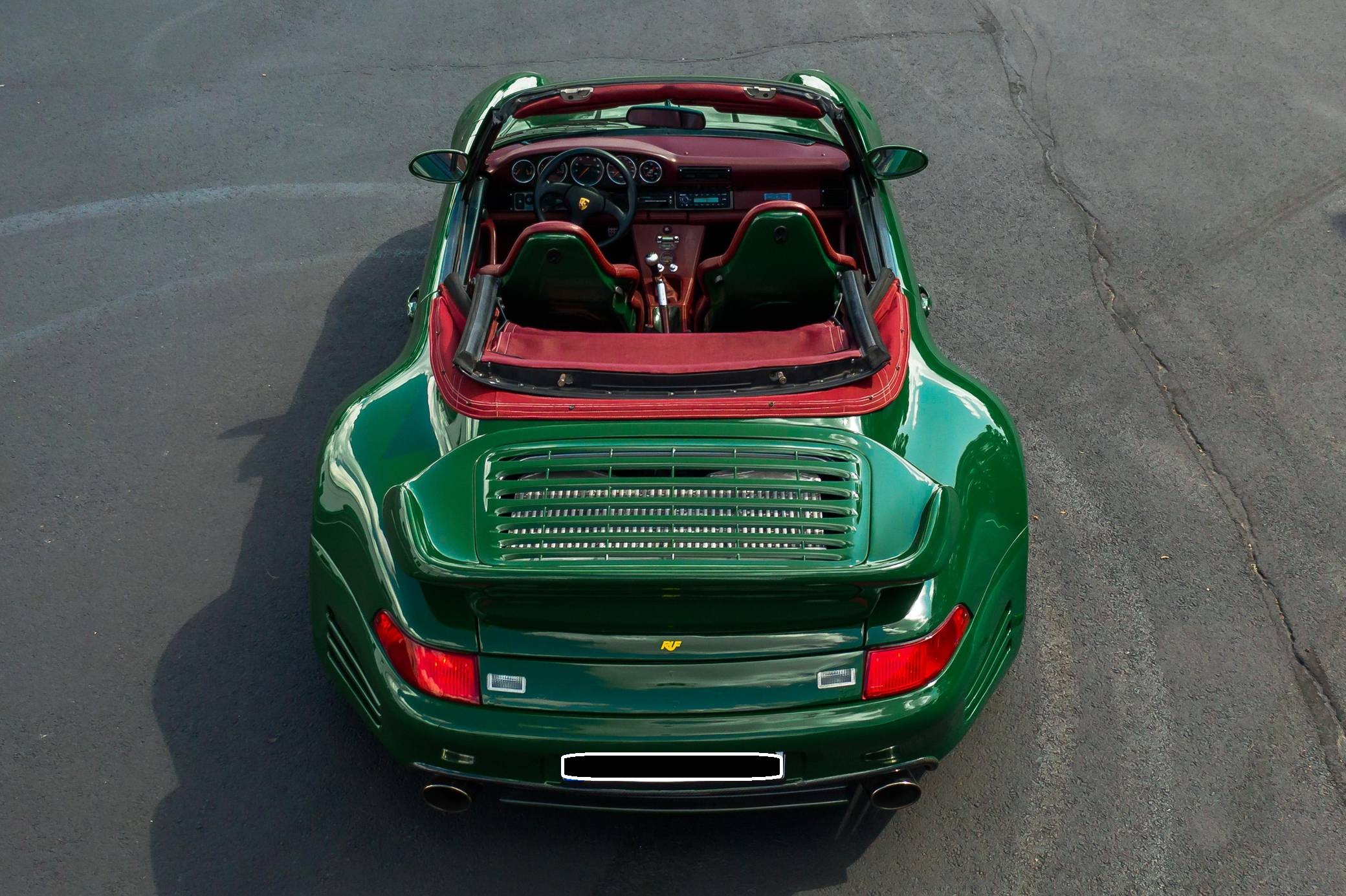 1984 Porsche 911 Carrera Cabriolet, finished in silver with a green exterior wrap, a red soft top, and a red interior. Extensively modified, this 911 is equipped with a 3. 8-liter flat-6 engine, a Turbonetics T3 "Stage 3" twin-turbocharger kit, a Fuel Air Spark Technology twin-plug fuel injection system, 18-inch HRE wheels, adjustable coilovers, a steel wide-body kit, a "whale tail"-style decklid, a soft top from a 1997 911, front sport seats from a 996-generation 911, a boost gauge in the instrument cluster, and a Continental head unit, according to the seller. More details about the aftermarket parts installed on this car are provided below. Porsche introduced the 911 Carrera for the 1984 model year as a replacement for the SC, and a full convertible was offered at launch. Every member of the Carrera line-up gained a bigger engine and minor visual changes, like fog lights integrated into the lower part of the front end. Power comes from a 3. 8-liter twin-turbocharged flat-6 reportedly built by Promotive, Inc. in Harrison, Arkansas. The seller estimates that it makes about 780 horsepower but a dyno sheet is not available. The engine spins the rear wheels via a "G50" 5-speed manual transmission.