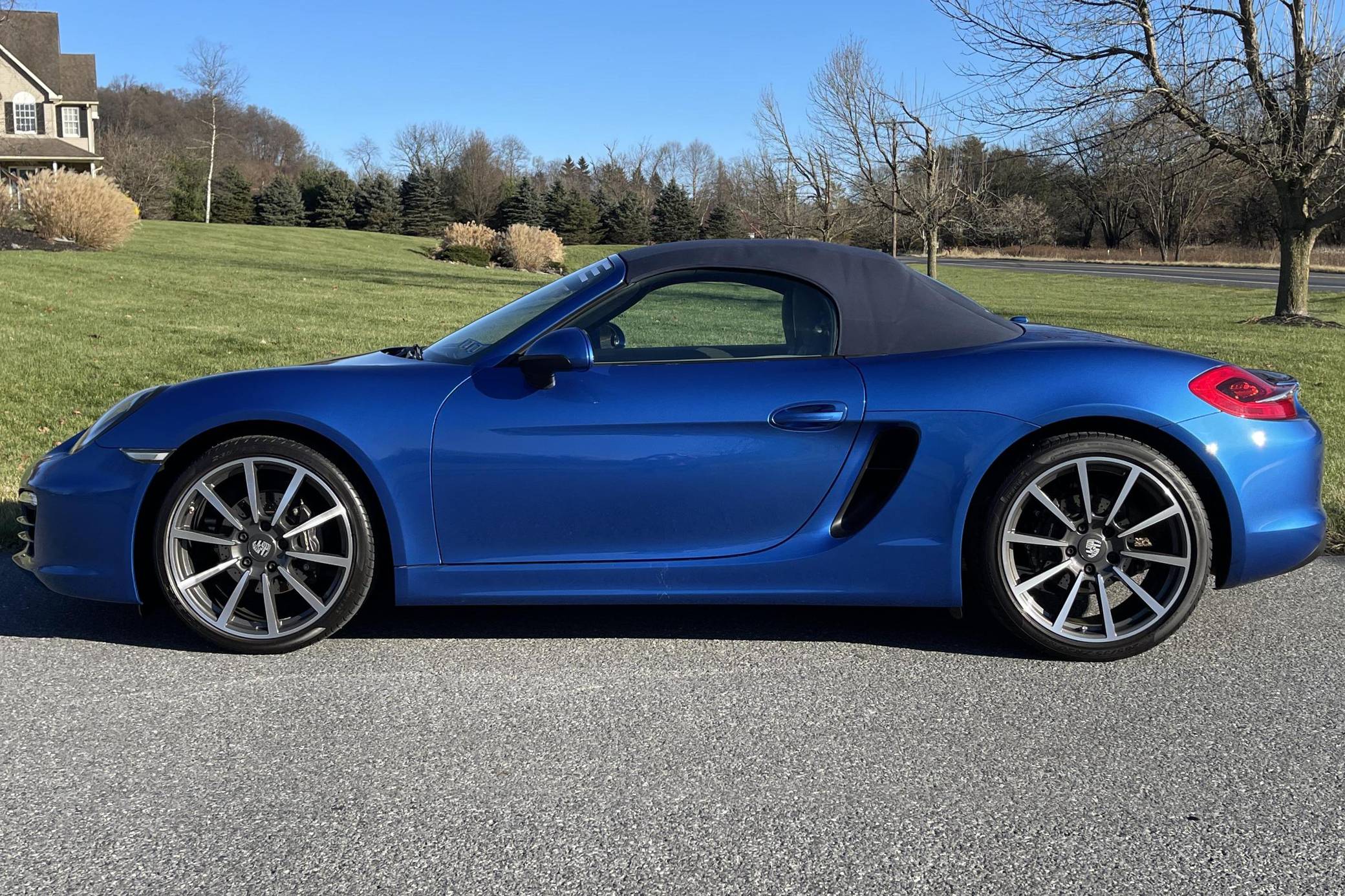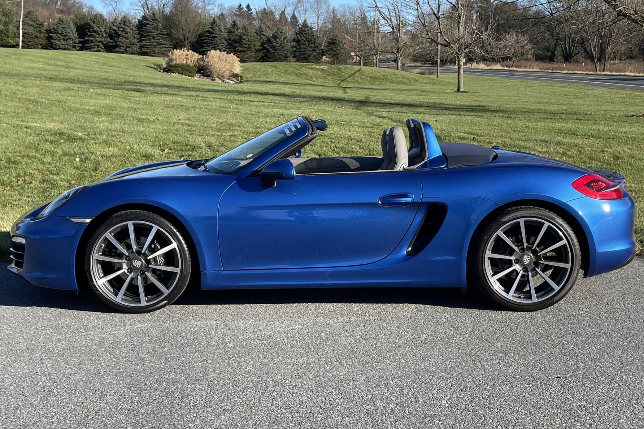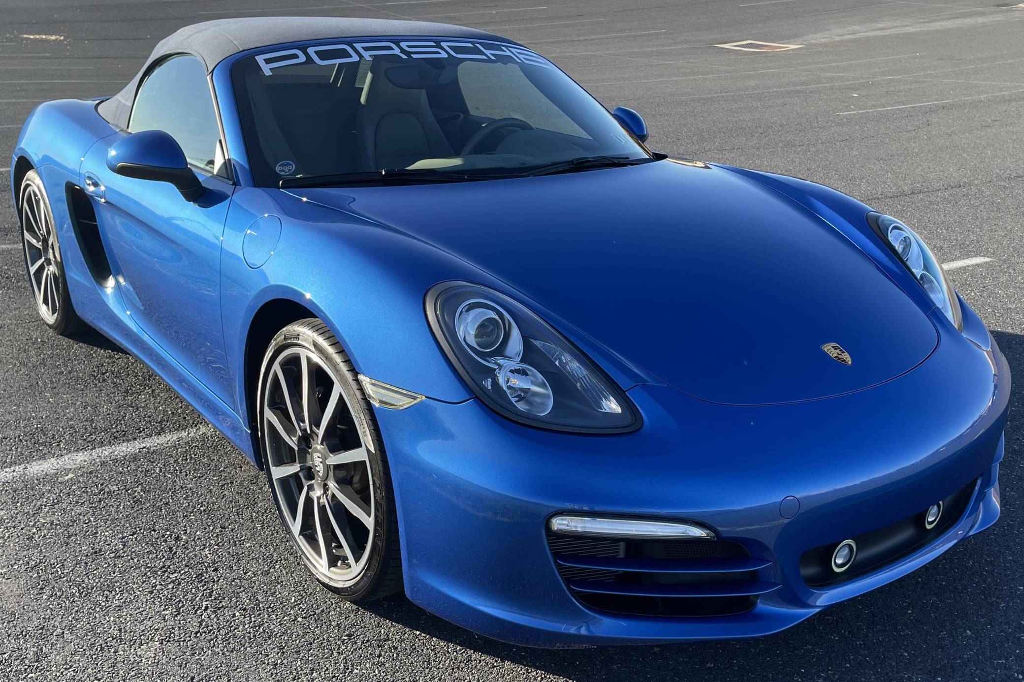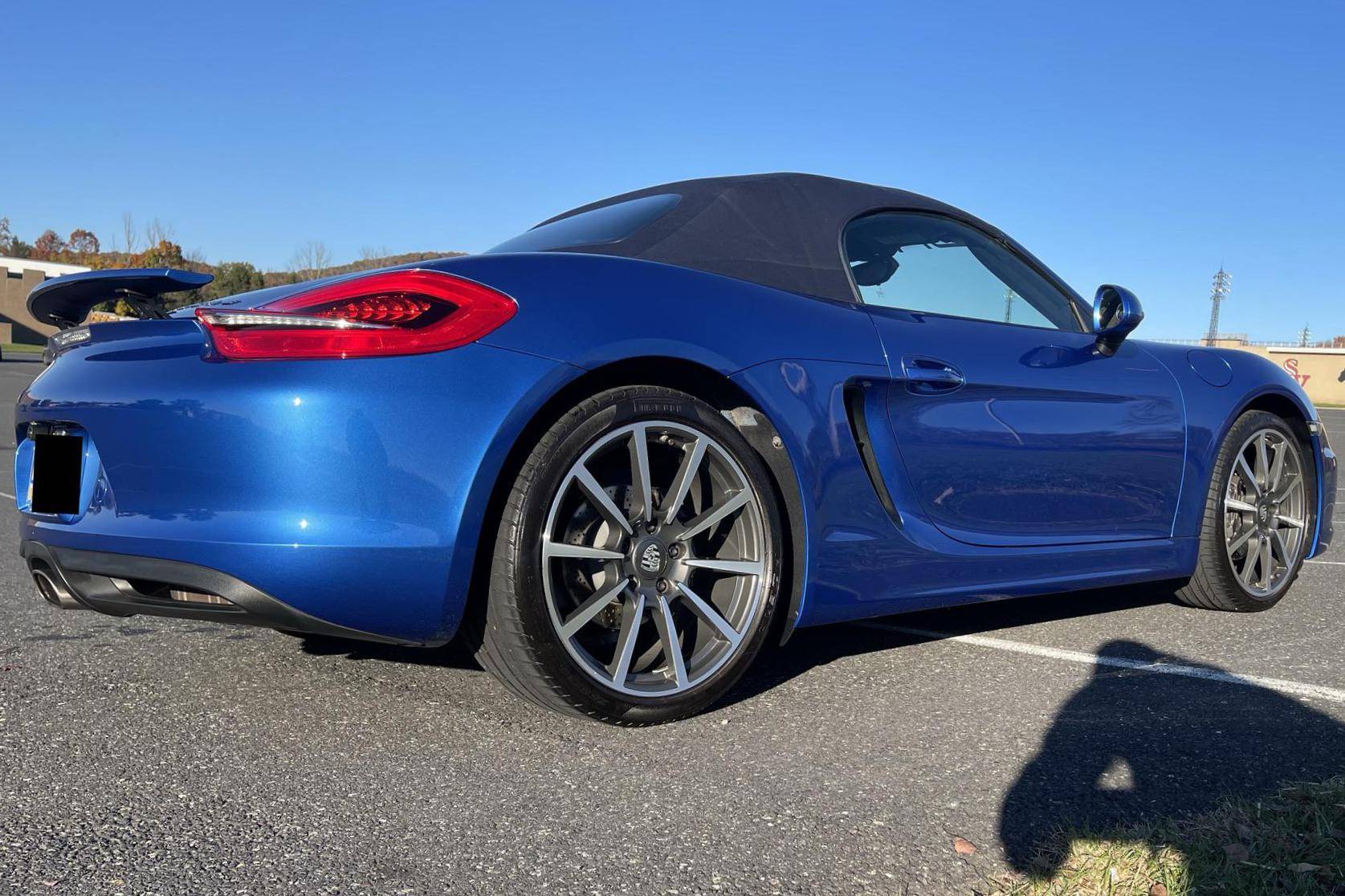 THIS. . . is a 2014 Porsche Boxster, finished in Sapphire Blue Metallic with a blue soft top and a Platinum Grey interior. The odometer on this Boxster displays about 11,800 miles. Modifications reported by the seller include front fog lights, a "Porsche" sticker on the windshield, and a rear-view camera. The "981"-generation Boxster was sold from 2013 through 2016 as Porsche's entry-level sports car. It was the final generation of the Boxster with a standard, naturally-aspirated flat-6 engine as standard, making it a favorite among Porsche purists. Power comes from a 2. 7-liter flat-6 engine, rated at 265 horsepower and 206 lb-ft of torque. Output is sent to the rear wheels through a 7-speed "PDK" dual-clutch automatic transmission.