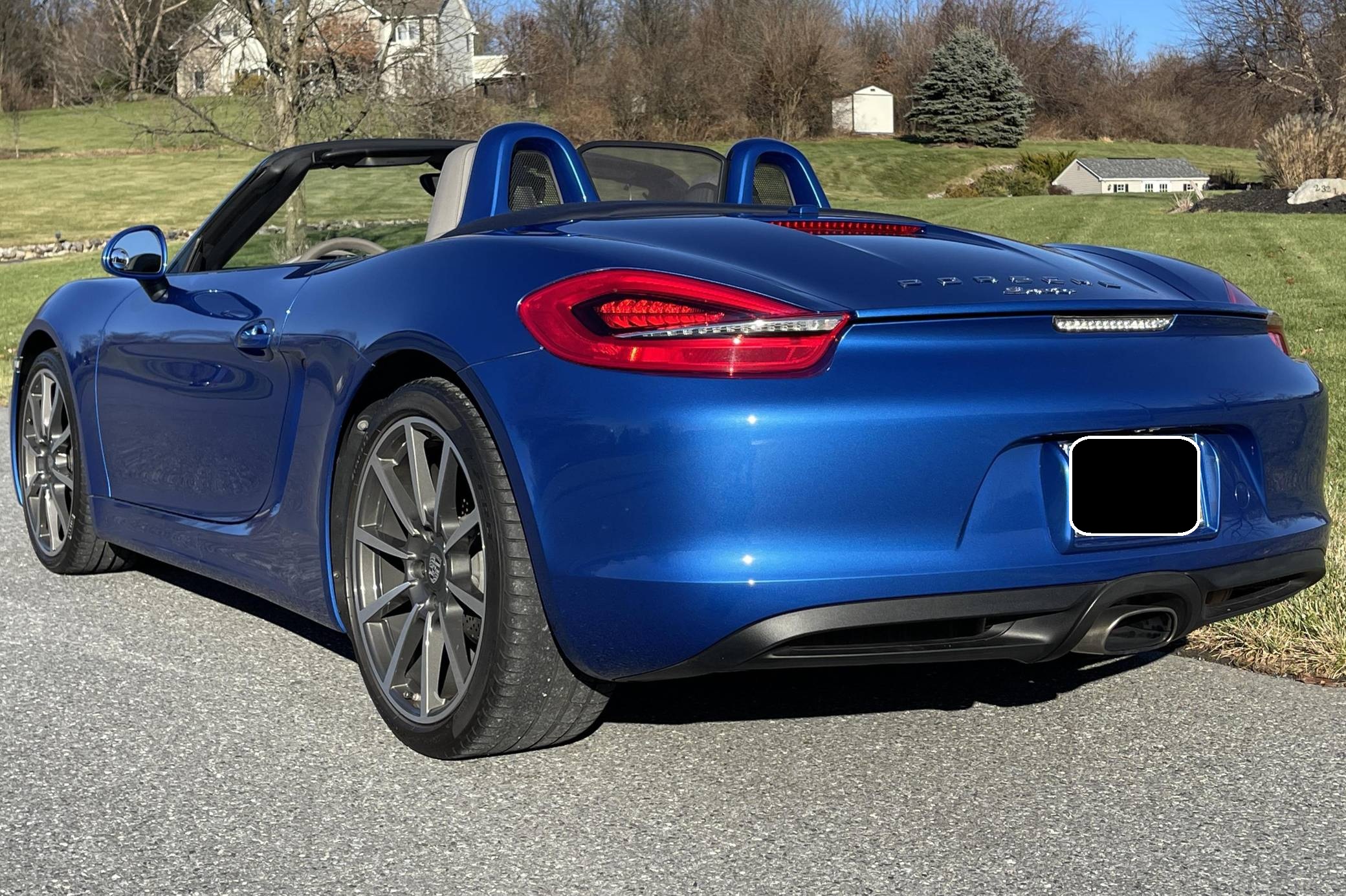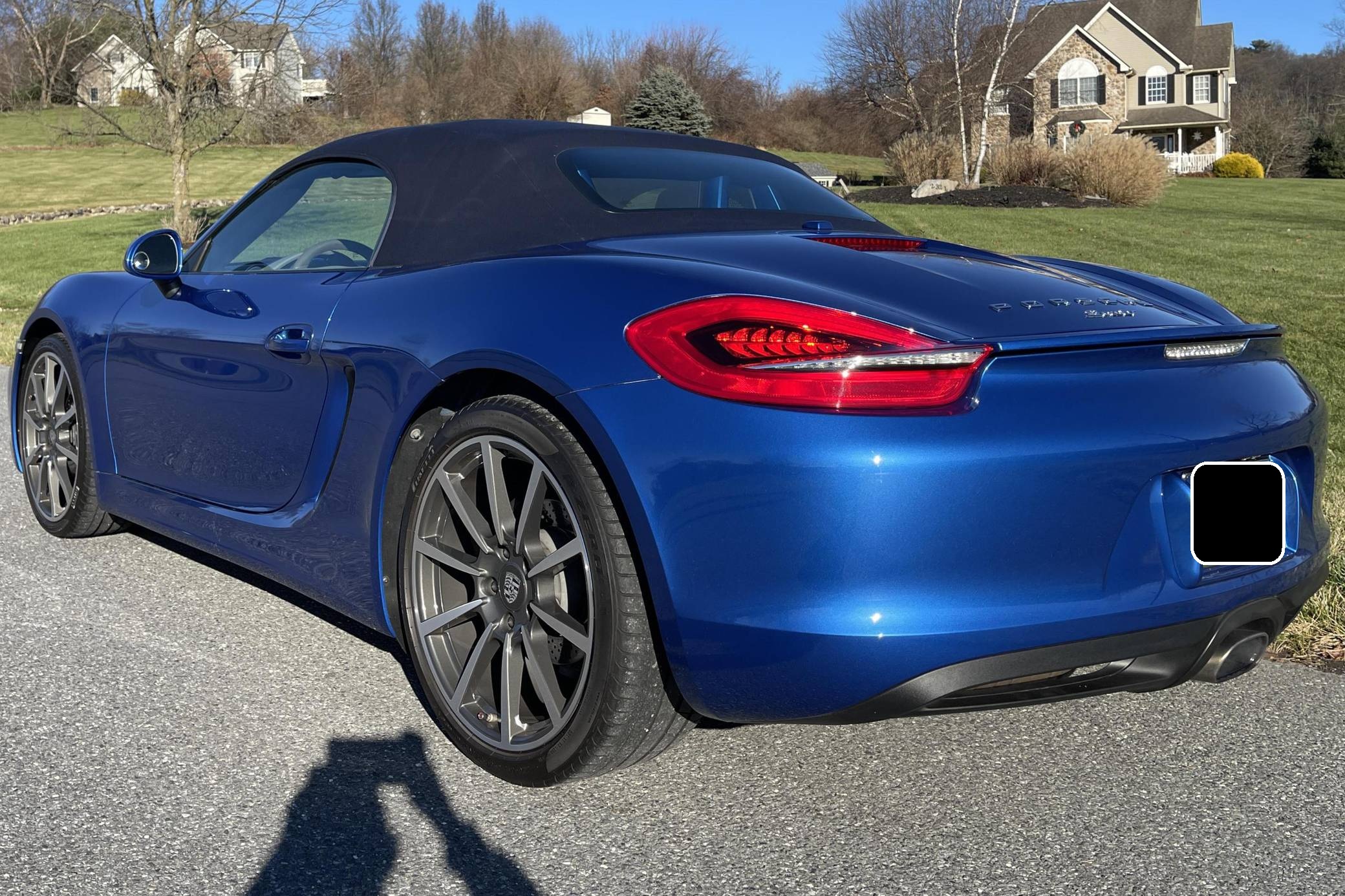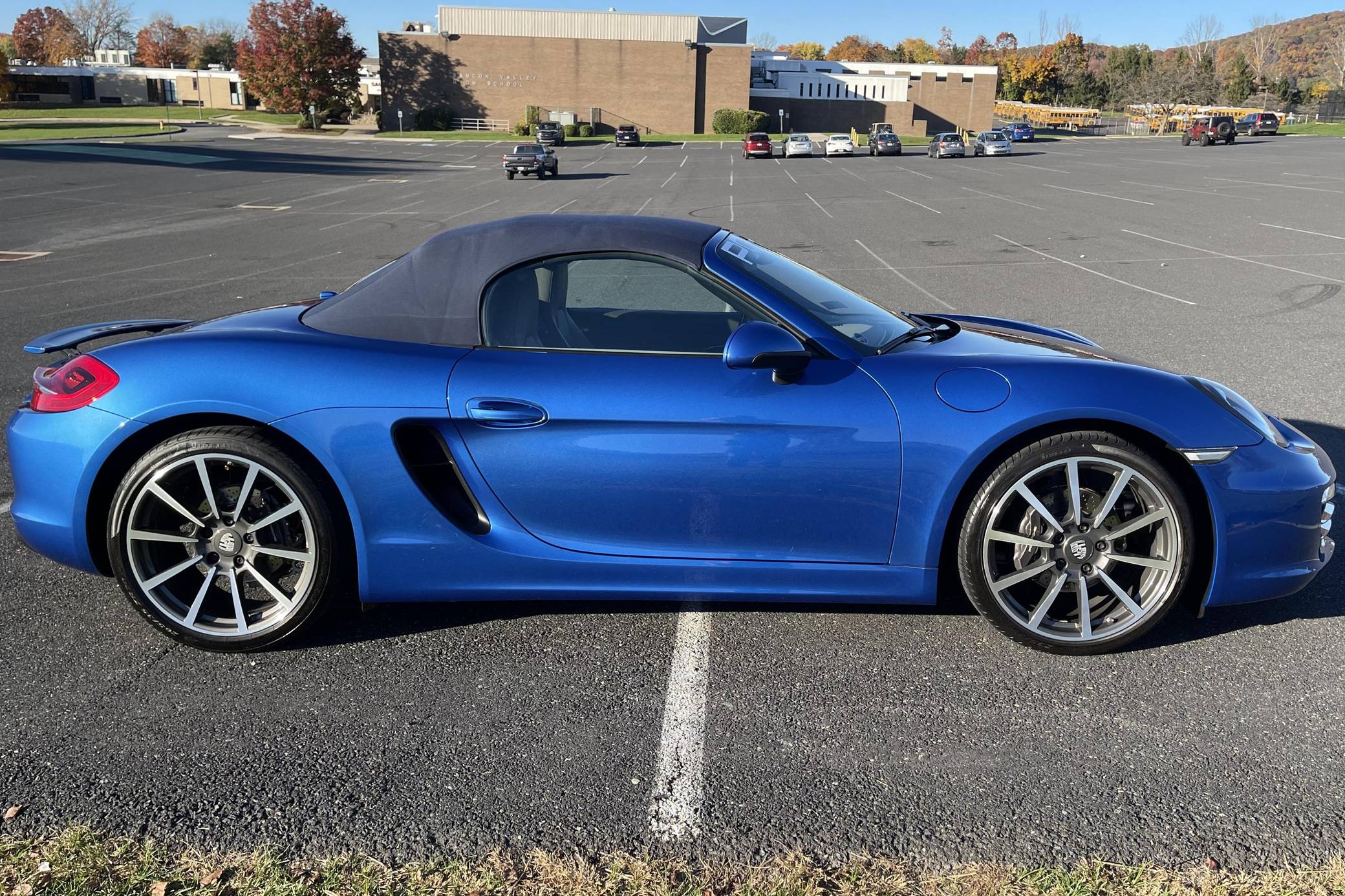 THIS. . . is a 2014 Porsche Boxster, finished in Sapphire Blue Metallic with a blue soft top and a Platinum Grey interior. The odometer on this Boxster displays about 11,800 miles. Modifications reported by the seller include front fog lights, a "Porsche" sticker on the windshield, and a rear-view camera. The "981"-generation Boxster was sold from 2013 through 2016 as Porsche's entry-level sports car. It was the final generation of the Boxster with a standard, naturally-aspirated flat-6 engine as standard, making it a favorite among Porsche purists. Power comes from a 2. 7-liter flat-6 engine, rated at 265 horsepower and 206 lb-ft of torque. Output is sent to the rear wheels through a 7-speed "PDK" dual-clutch automatic transmission.