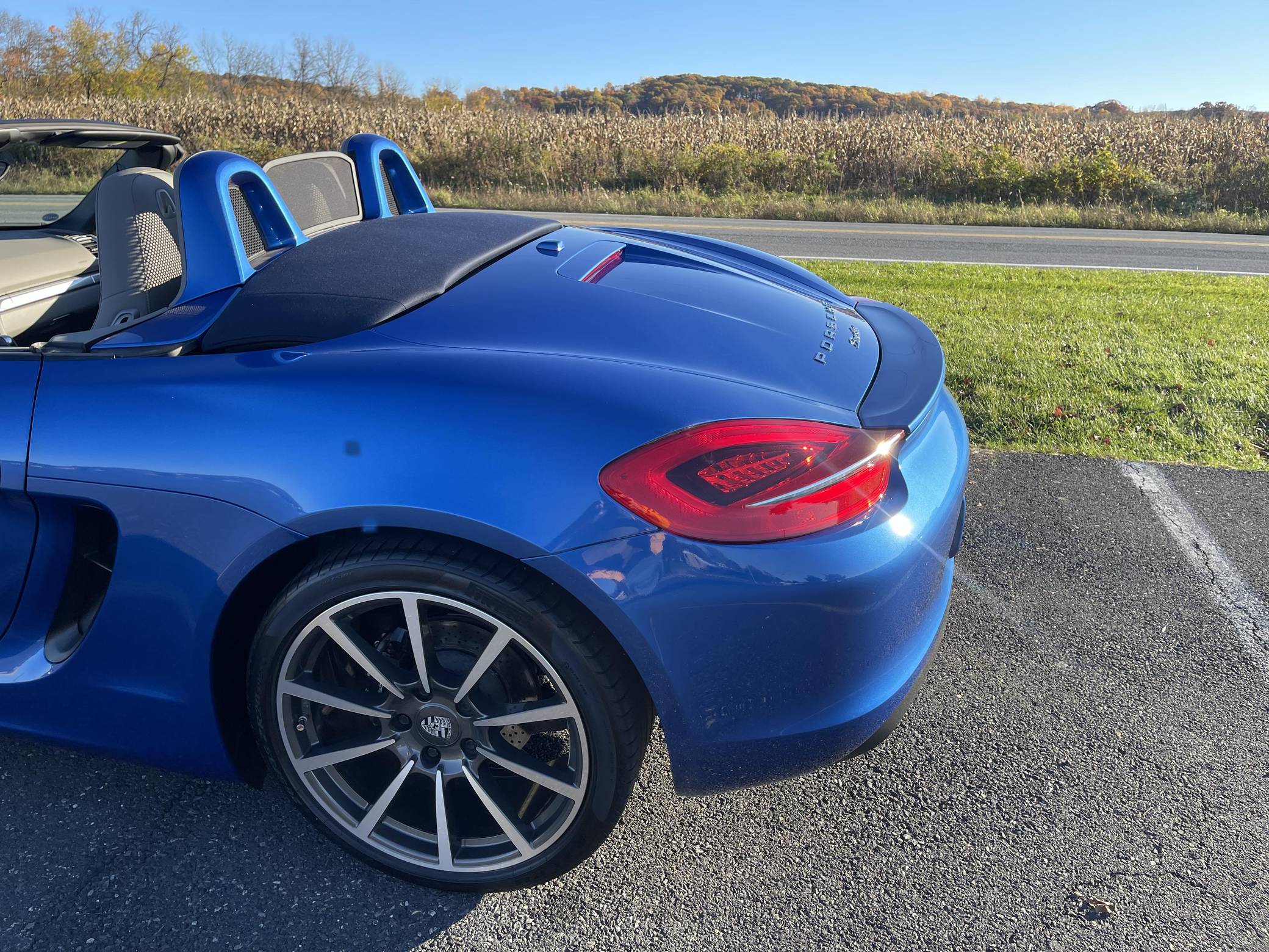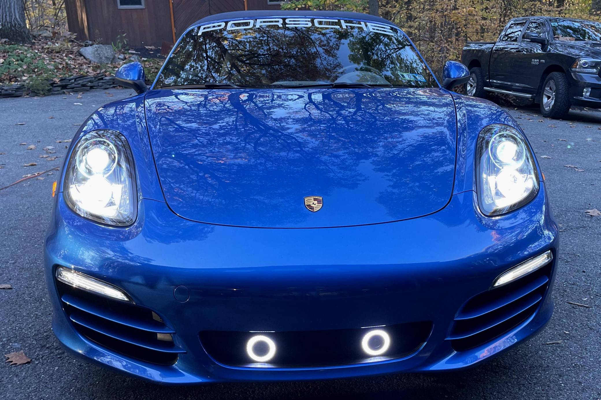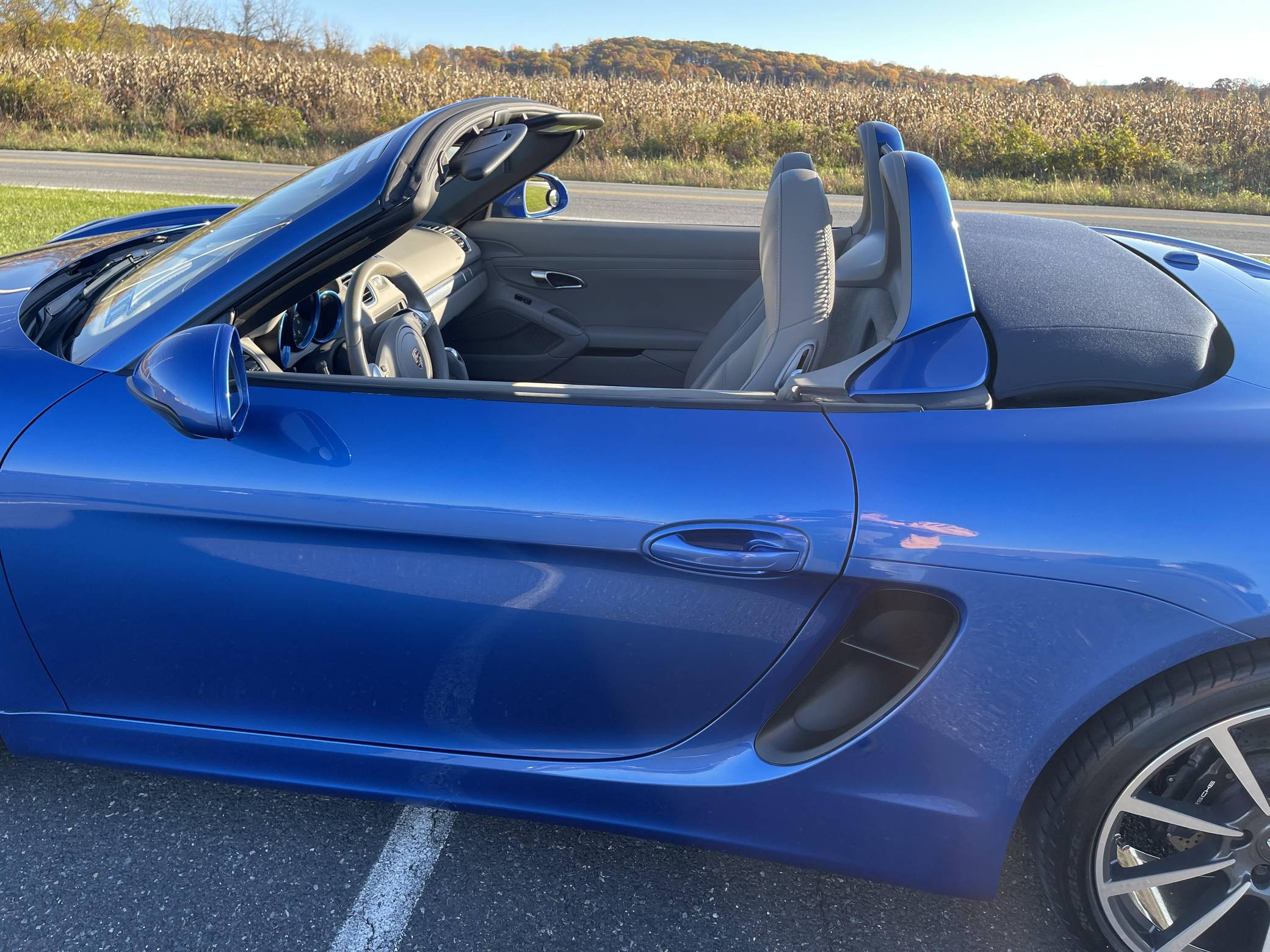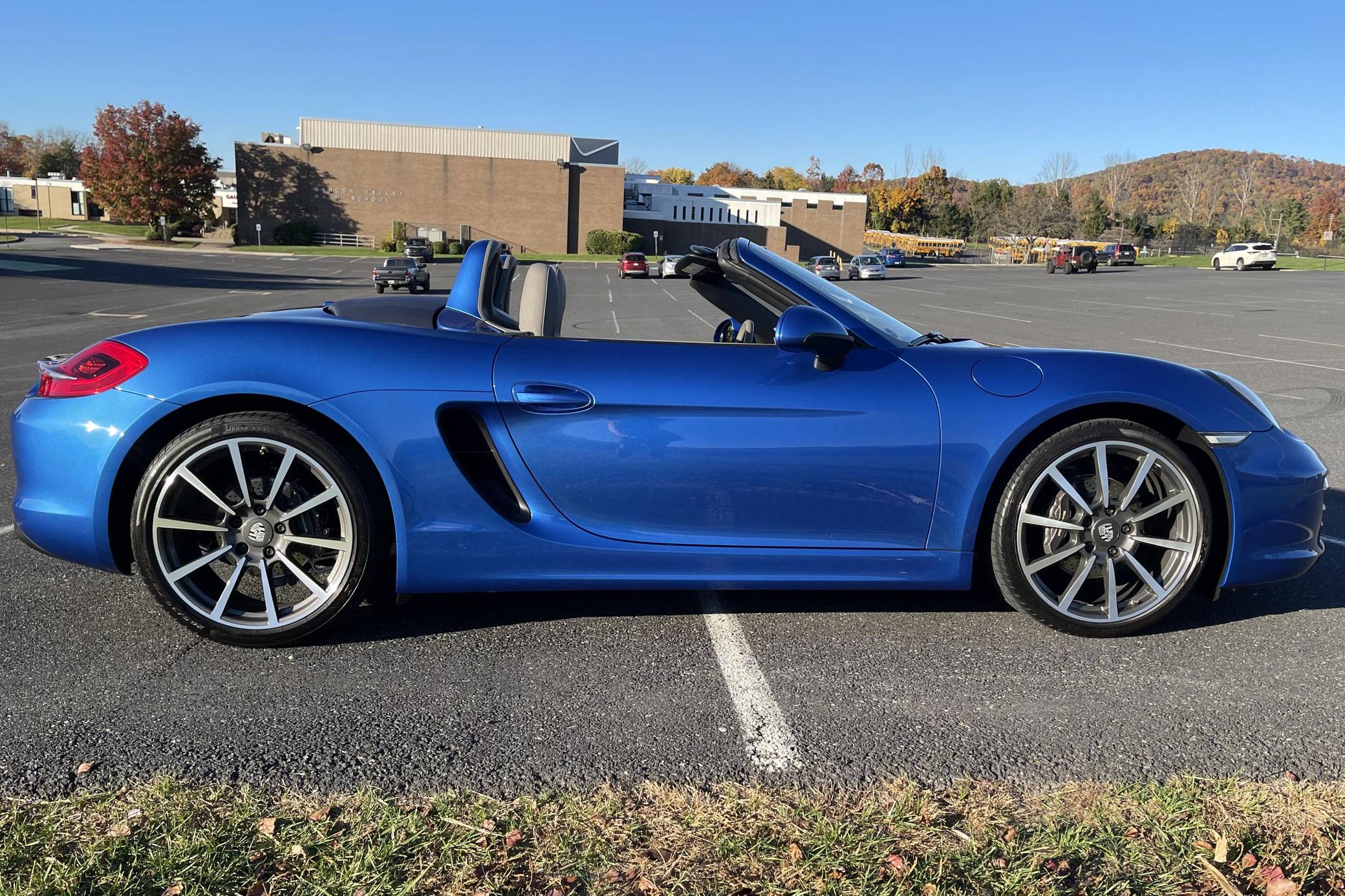 THIS. . . is a 2014 Porsche Boxster, finished in Sapphire Blue Metallic with a blue soft top and a Platinum Grey interior. The odometer on this Boxster displays about 11,800 miles. Modifications reported by the seller include front fog lights, a "Porsche" sticker on the windshield, and a rear-view camera. The "981"-generation Boxster was sold from 2013 through 2016 as Porsche's entry-level sports car. It was the final generation of the Boxster with a standard, naturally-aspirated flat-6 engine as standard, making it a favorite among Porsche purists. Power comes from a 2. 7-liter flat-6 engine, rated at 265 horsepower and 206 lb-ft of torque. Output is sent to the rear wheels through a 7-speed "PDK" dual-clutch automatic transmission.