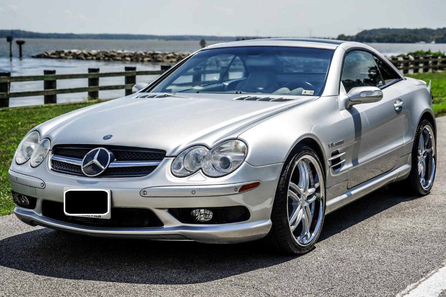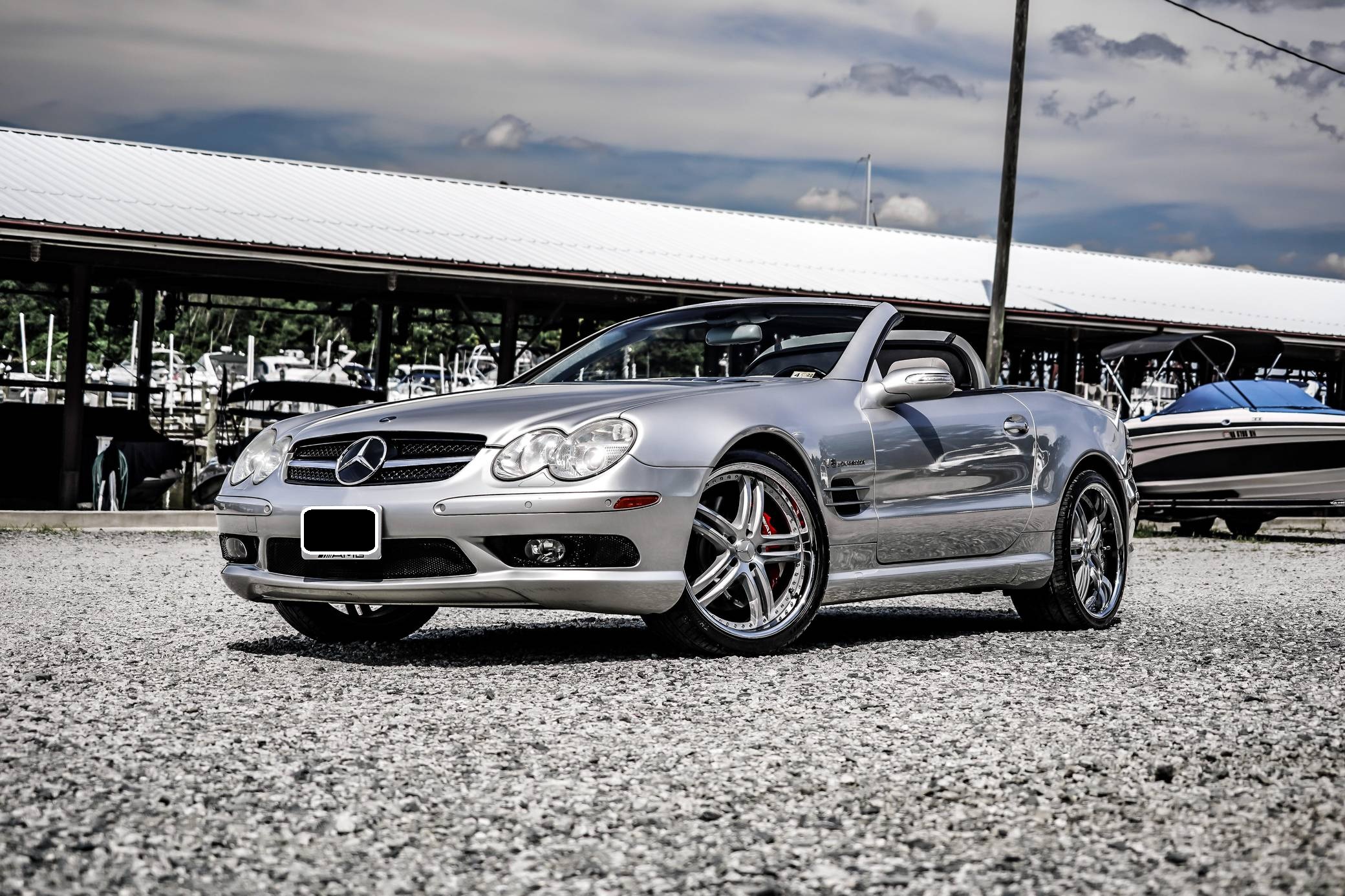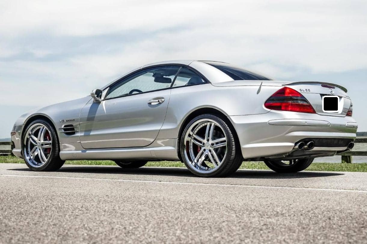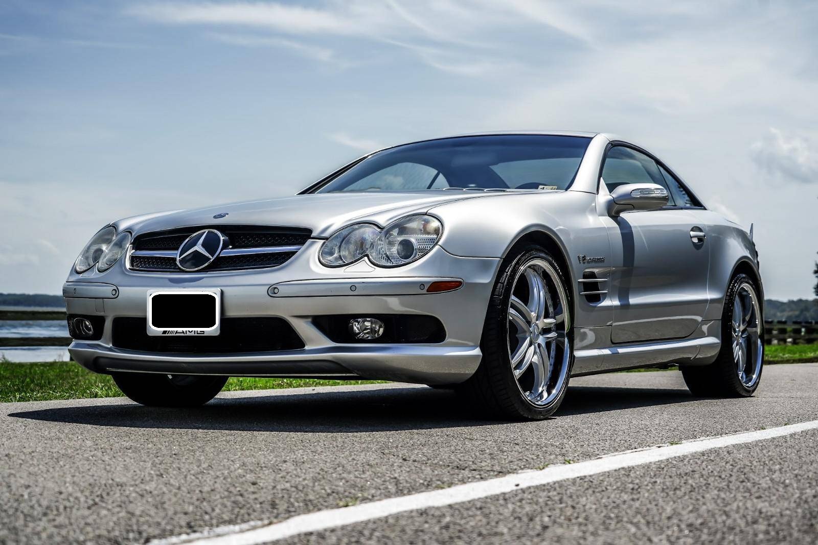 2004 Mercedes-Benz SL55 AMG, finished in Brilliant Silver Metallic with a gray interior. This convertible's odometer displays about 79,400 miles. Factory equipment includes the Active Body Control (ABC) suspension system, a power-operated hardtop, wood interior trim, leather upholstery, plus heated, ventilated, and power-adjustable multi-contour seats. This car's build sheet is pictured in the gallery. Modifications reported by the seller are limited to 20-inch wheels, red brake calipers, and a Sony touchscreen head unit. The factory 18-inch wheels are included in the sale. Called R230 internally, the first new SL of the 21st century made its debut for 2003 as a replacement for the venerable R129 model. It was appreciably quicker and far more advanced than its predecessor, it ditched the boxy lines for a sleeker and more rounded design that was aligned with the rest of the Mercedes-Benz range, and it came standard with a power-retractable hardtop. Production ended in 2011. Power comes from a 5. 4-liter supercharged V8, rated at 493 horsepower and 516 lb-ft of torque. Called "M113K" internally, it spins the rear wheels via a 5-speed automatic transmission.