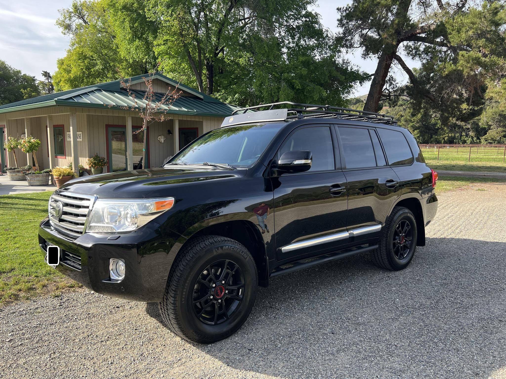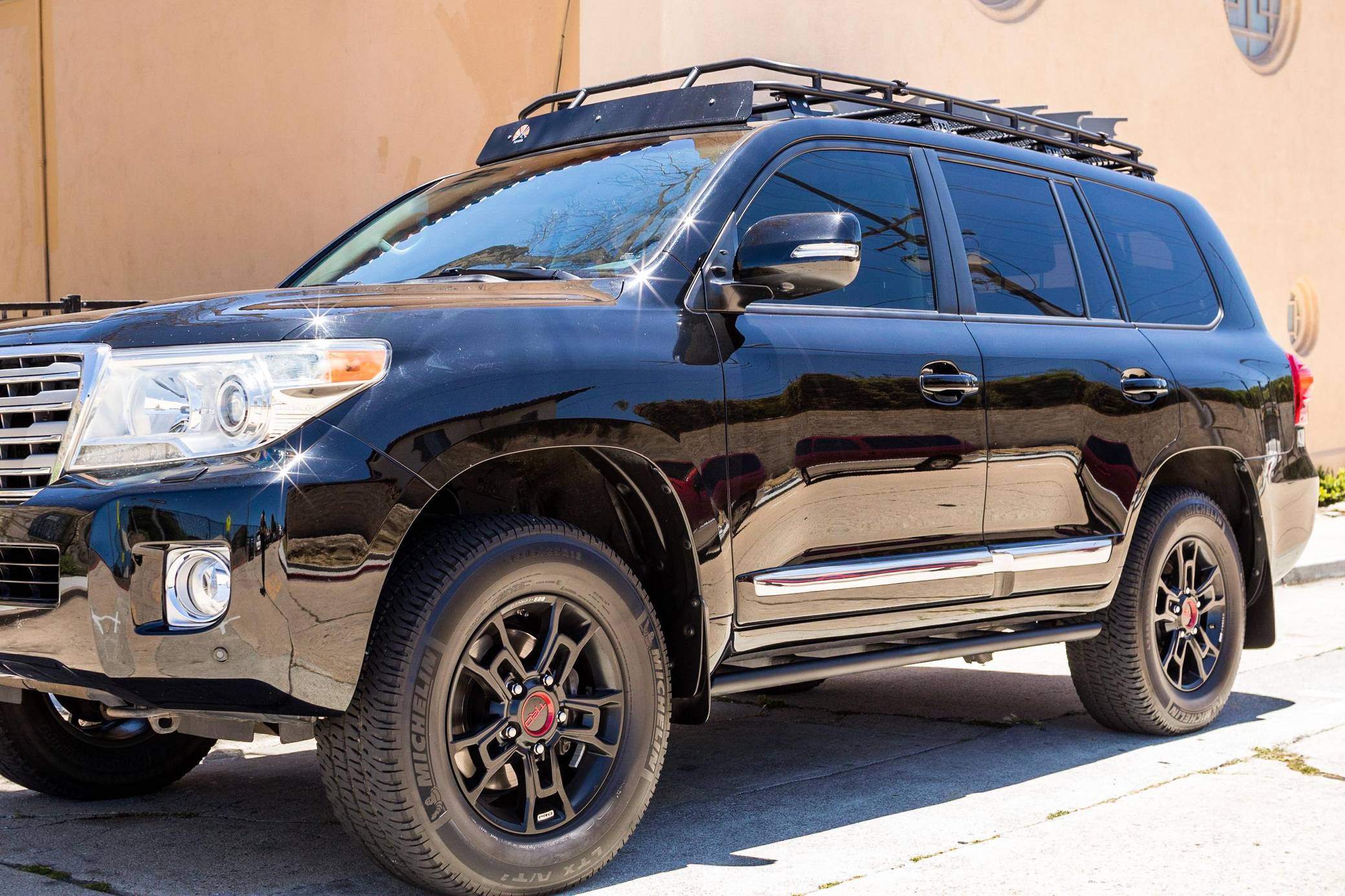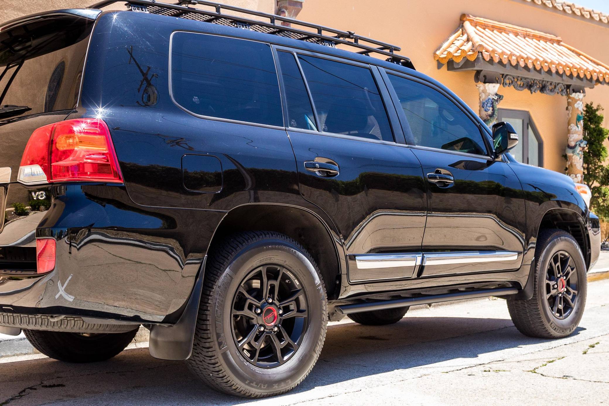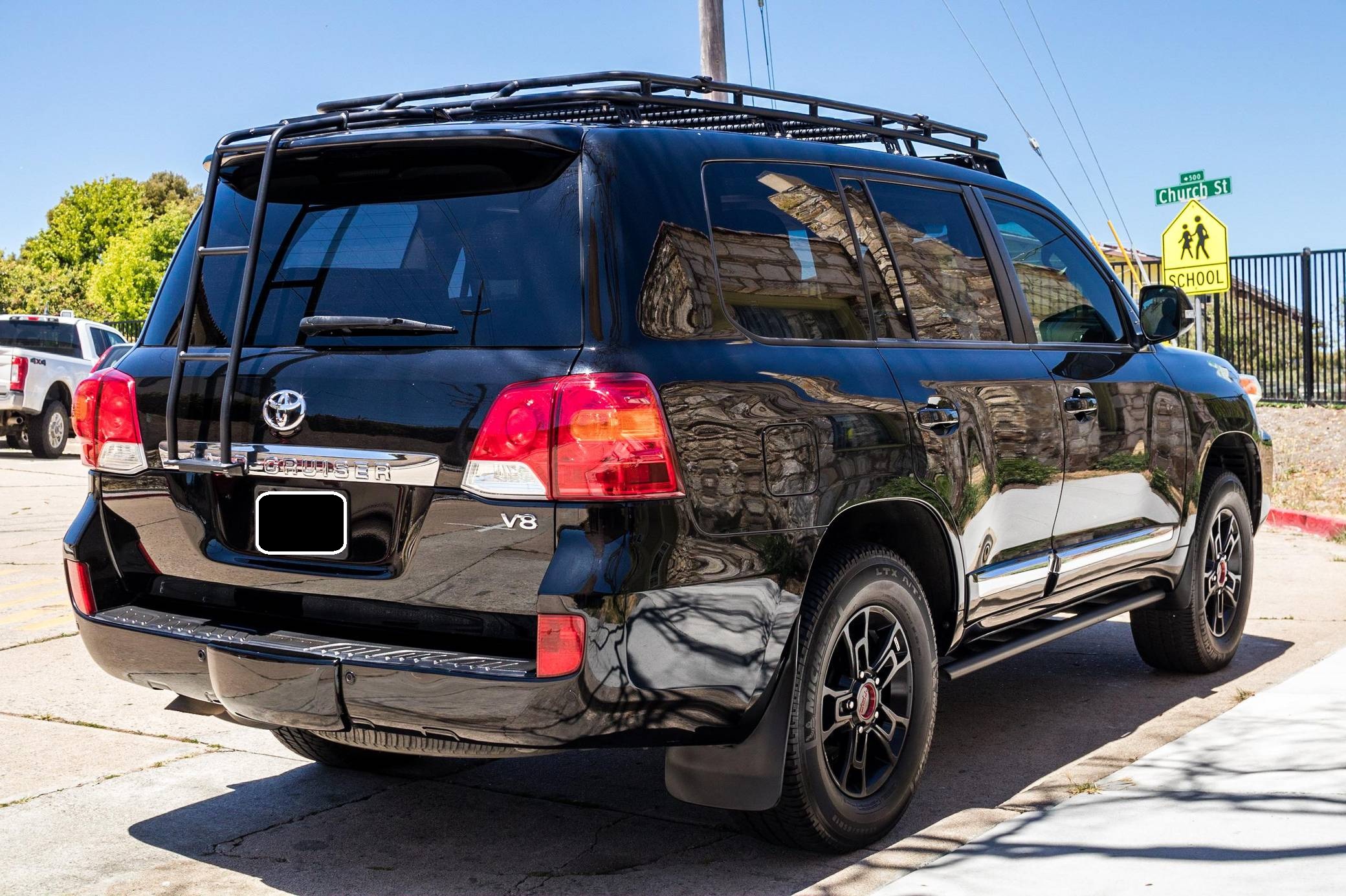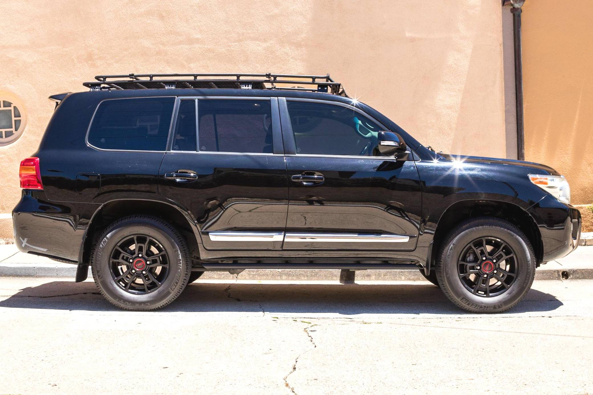 2013 Toyota Land Cruiser, finished in black with a black interior. A build sheet is provided in the photo gallery, and a partial list of notable equipment includes a Kinetic Dynamic Suspension System (KDSS), a locking center differential, an Active Traction Control (A-TRAC) system, CRAWL Control with Off-Road Turn Assist, a power-operated sunroof, leather upholstery, a heated steering wheel, heated, ventilated, and power-adjustable front seats, folding third-row seats, a four-zone climate control system, a center console cool-box, a 14-speaker JBL sound system, an 8-inch touchscreen infotainment system, a navigation system, a rear-seat entertainment system, a rear-view camera, and adaptive cruise control. Modifications reported by the seller include 18-inch Toyota Tundra TRD PRO BBS Forged wheels with Michelin LTX A/T2 tires, FOX 2. 5-inch dual-reservoir suspension, a GOBI low-profile roof rack with sunroof rack option, BudBuilt rock sliders, OSRAM Night Breaker headlight bulbs, GTR Lighting yellow LED fog lights, FormulaOne window tint, OSRAM LED interior lighting, and a JDM horn. Toyota's 200-Series Land Cruiser arrived for 2008 with a more powerful V8 shared with the Tundra, a longer list of technology added to increase on-road comfort and off-road prowess, and a quieter interior. It retained rugged body-on-frame construction but it put an even greater emphasis on luxury than its predecessor. Toyota made several updates to the 200-Series before production ended in 2021. Power comes from a 5. 7-liter V8, rated at 381 horsepower and 401 lb-ft of torque. Output is sent to all four wheels via a 6-speed automatic transmission and a 2-speed transfer case.