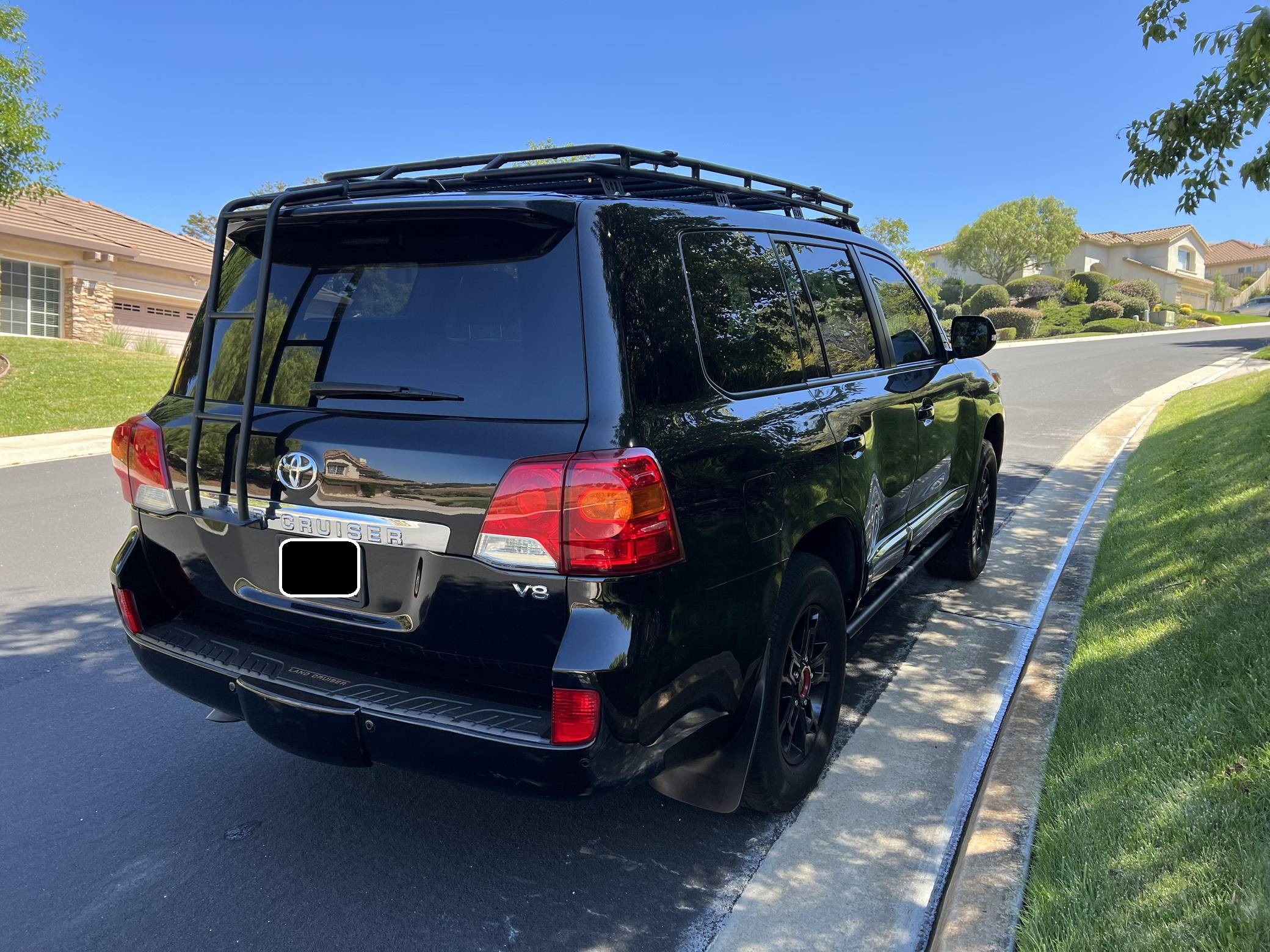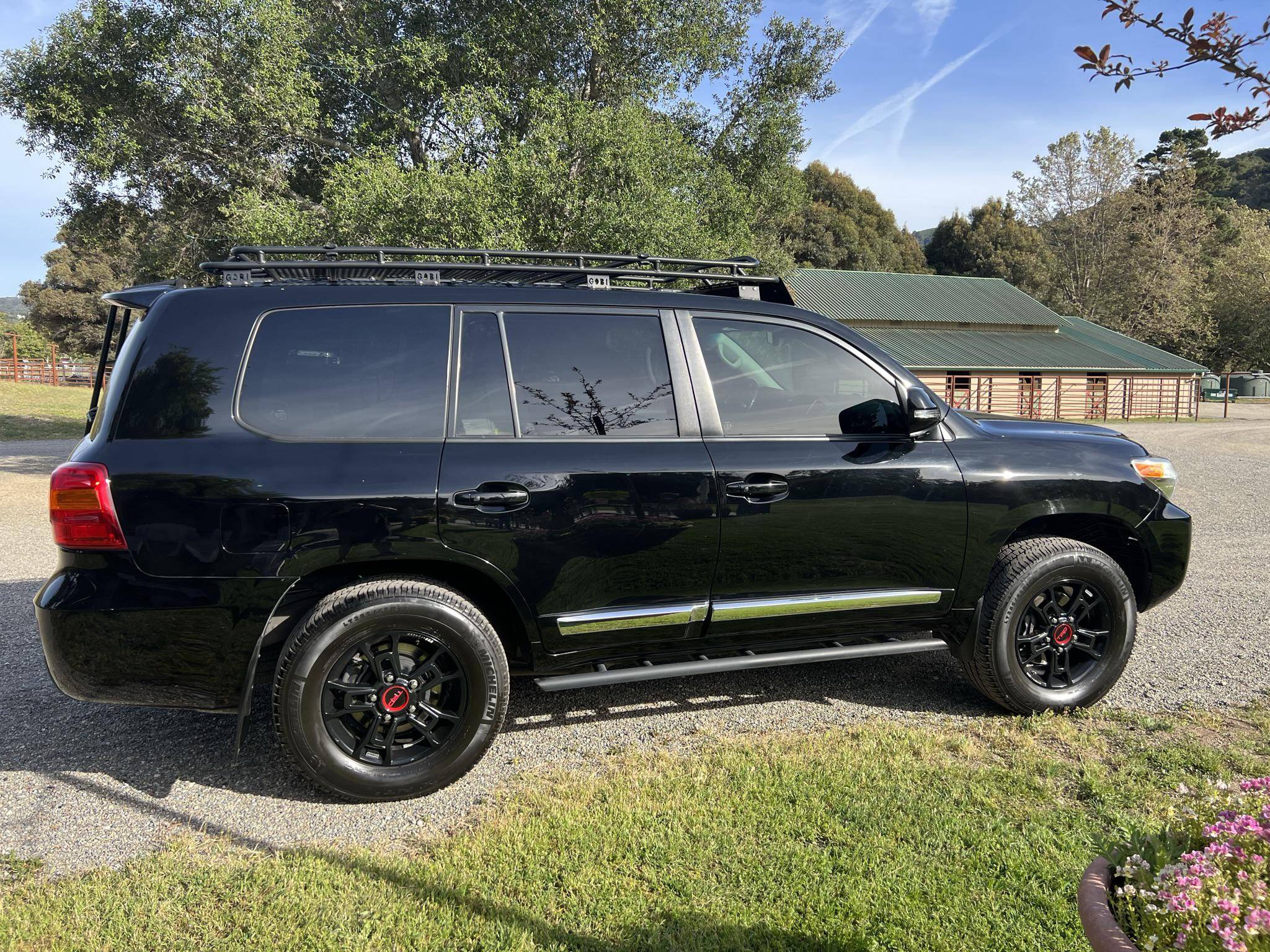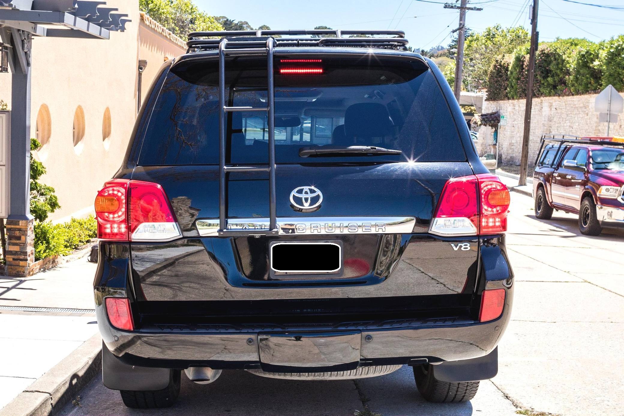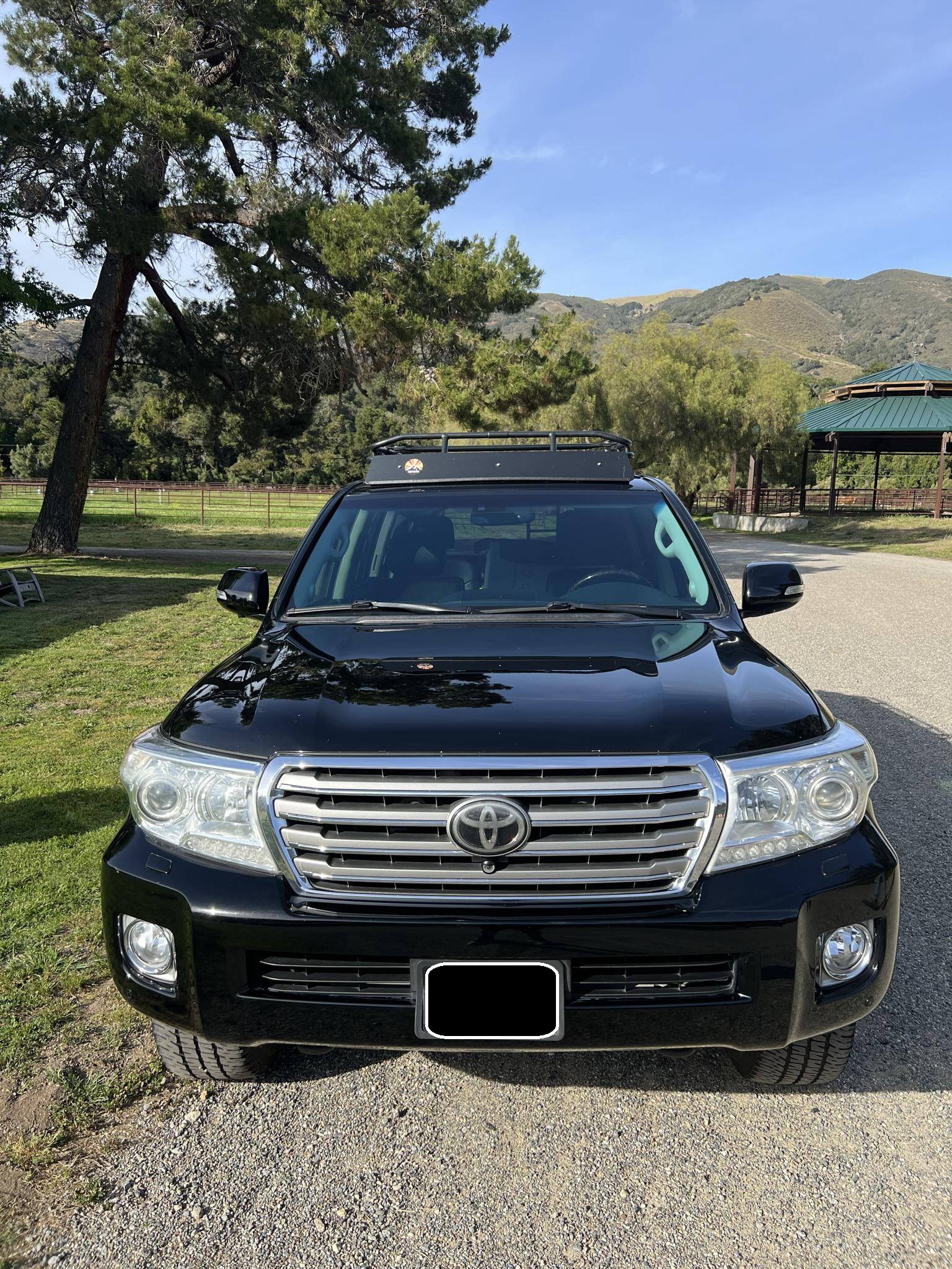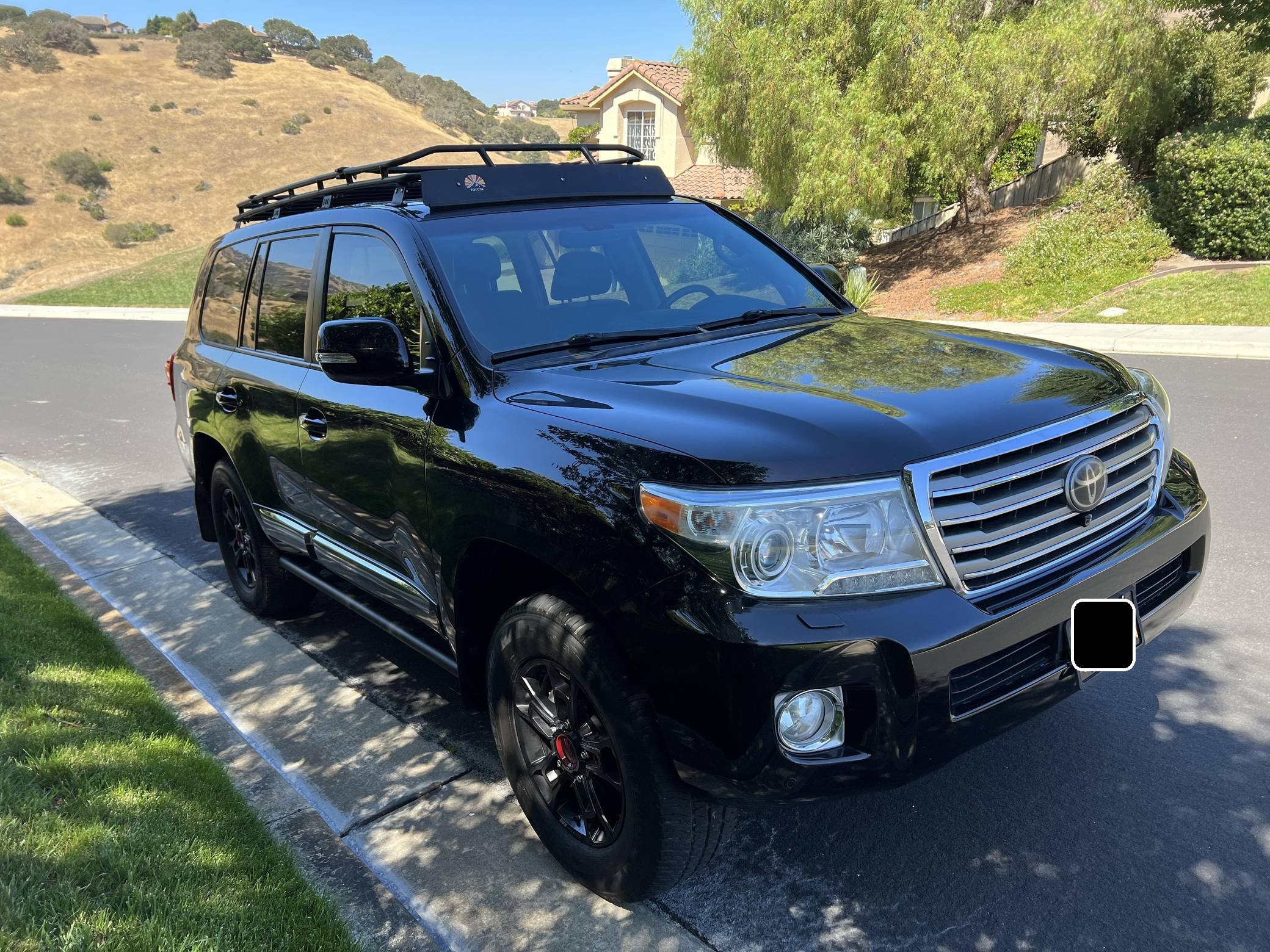 2013 Toyota Land Cruiser, finished in black with a black interior. A build sheet is provided in the photo gallery, and a partial list of notable equipment includes a Kinetic Dynamic Suspension System (KDSS), a locking center differential, an Active Traction Control (A-TRAC) system, CRAWL Control with Off-Road Turn Assist, a power-operated sunroof, leather upholstery, a heated steering wheel, heated, ventilated, and power-adjustable front seats, folding third-row seats, a four-zone climate control system, a center console cool-box, a 14-speaker JBL sound system, an 8-inch touchscreen infotainment system, a navigation system, a rear-seat entertainment system, a rear-view camera, and adaptive cruise control. Modifications reported by the seller include 18-inch Toyota Tundra TRD PRO BBS Forged wheels with Michelin LTX A/T2 tires, FOX 2. 5-inch dual-reservoir suspension, a GOBI low-profile roof rack with sunroof rack option, BudBuilt rock sliders, OSRAM Night Breaker headlight bulbs, GTR Lighting yellow LED fog lights, FormulaOne window tint, OSRAM LED interior lighting, and a JDM horn. Toyota's 200-Series Land Cruiser arrived for 2008 with a more powerful V8 shared with the Tundra, a longer list of technology added to increase on-road comfort and off-road prowess, and a quieter interior. It retained rugged body-on-frame construction but it put an even greater emphasis on luxury than its predecessor. Toyota made several updates to the 200-Series before production ended in 2021. Power comes from a 5. 7-liter V8, rated at 381 horsepower and 401 lb-ft of torque. Output is sent to all four wheels via a 6-speed automatic transmission and a 2-speed transfer case.