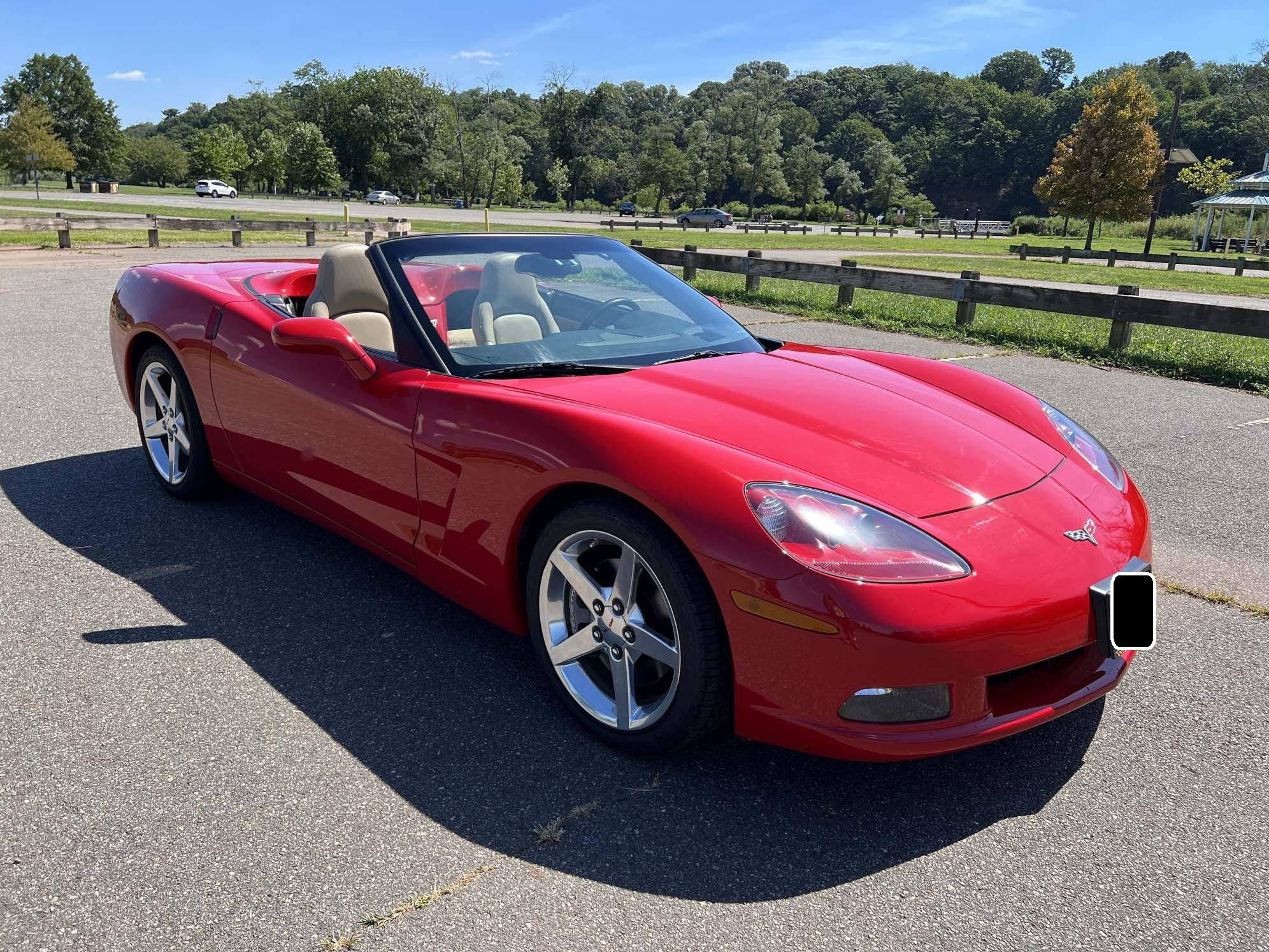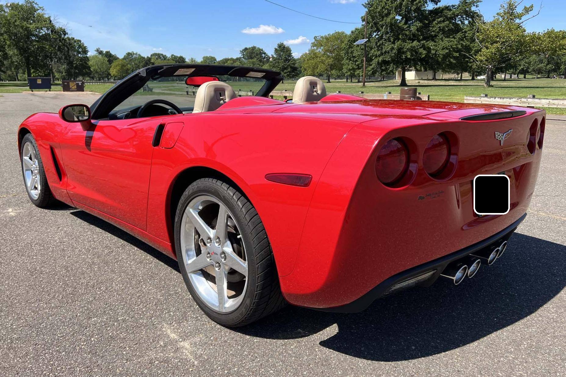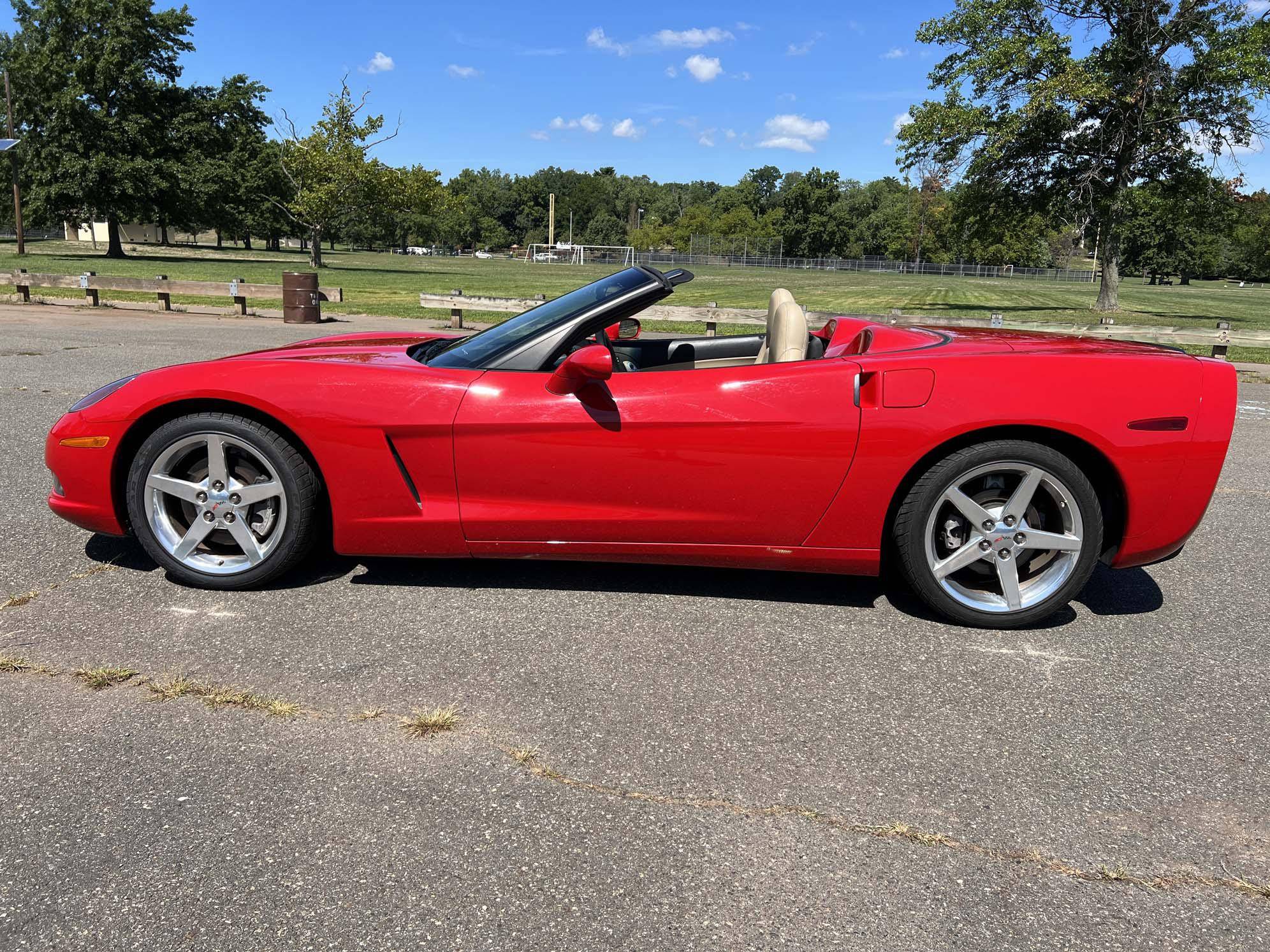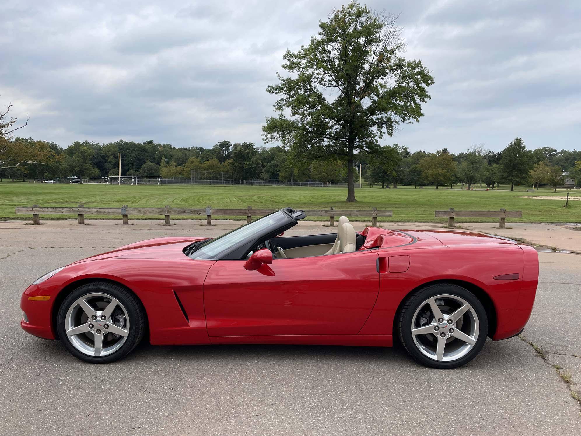 2005 Chevrolet Corvette Convertible, finished in Victory Red with a black soft top and a Cashmere interior. The odometer on this Corvette currently displays approximately 17,300 miles. An RPO code list is provided in the photo gallery, and a partial list of notable equipment includes 18-inch in front and 19-inch rear wheels, Selective Ride Control, a power-operated soft top, leather upholstery, and a Bose sound system. Modifications reported by the seller are limited to a Borla exhaust. The C6-generation Corvette debuted for the 2005 model year, and stood out from its predecessor with a more compact size, revised styling that did away with the pop-up headlights of the previous generation, and a notable bump in horsepower. Interior materials were improved, as were performance metrics; the C6 was sold in the United States until 2013. Power comes from an "LS2" 6. 0-liter V8, rated at 400 horsepower and 400 lb-ft of torque. Output is sent to the rear wheels via a 4-speed automatic transmission.