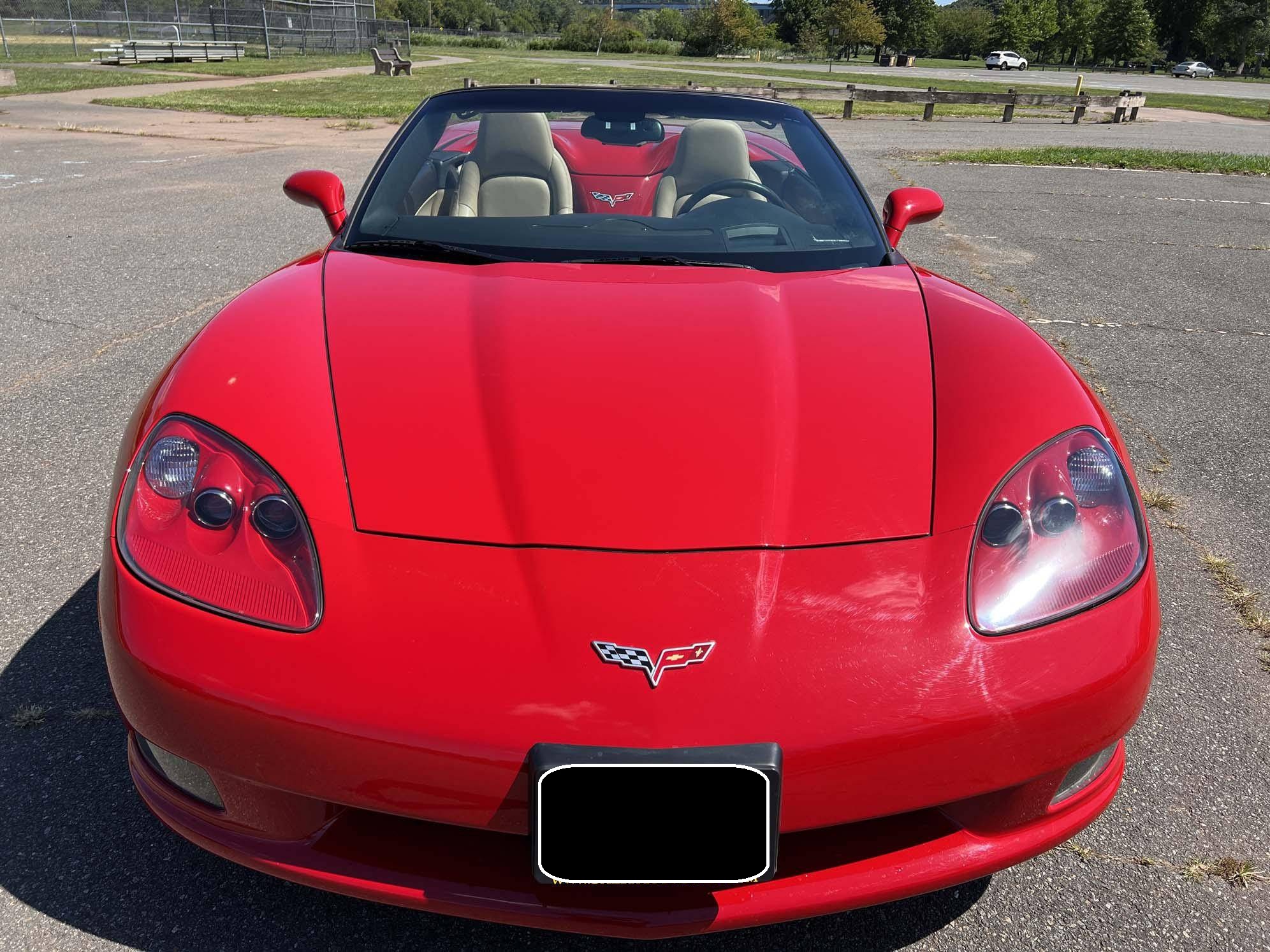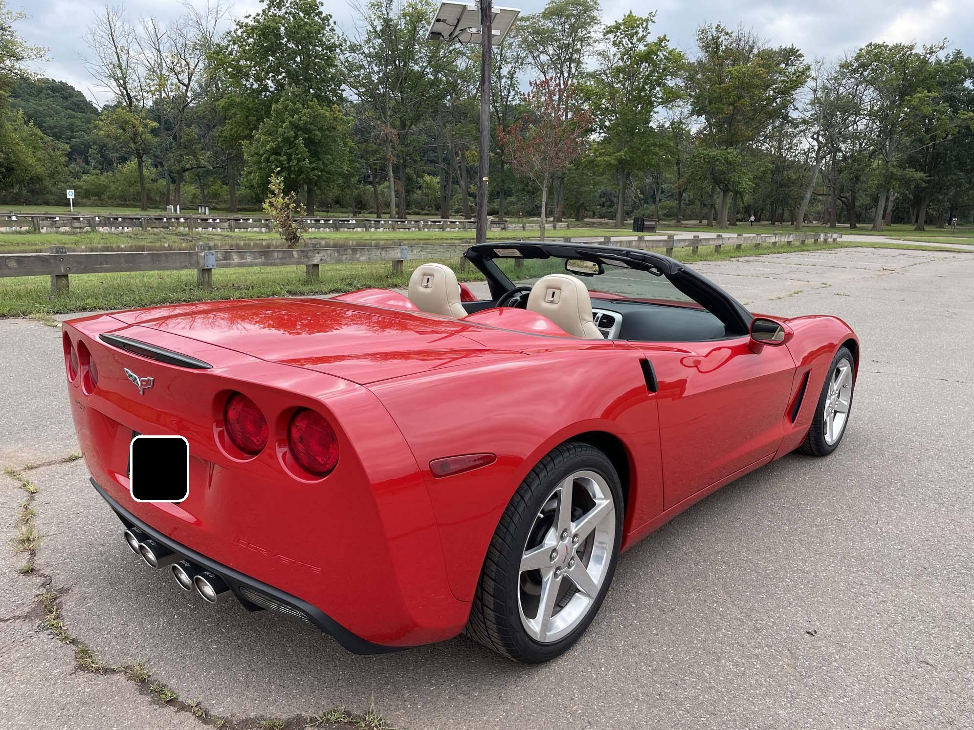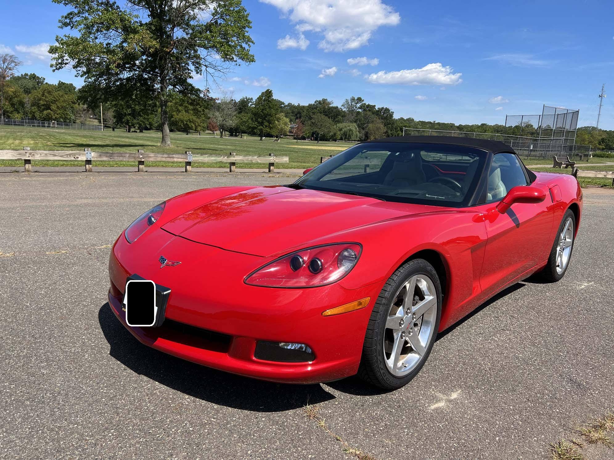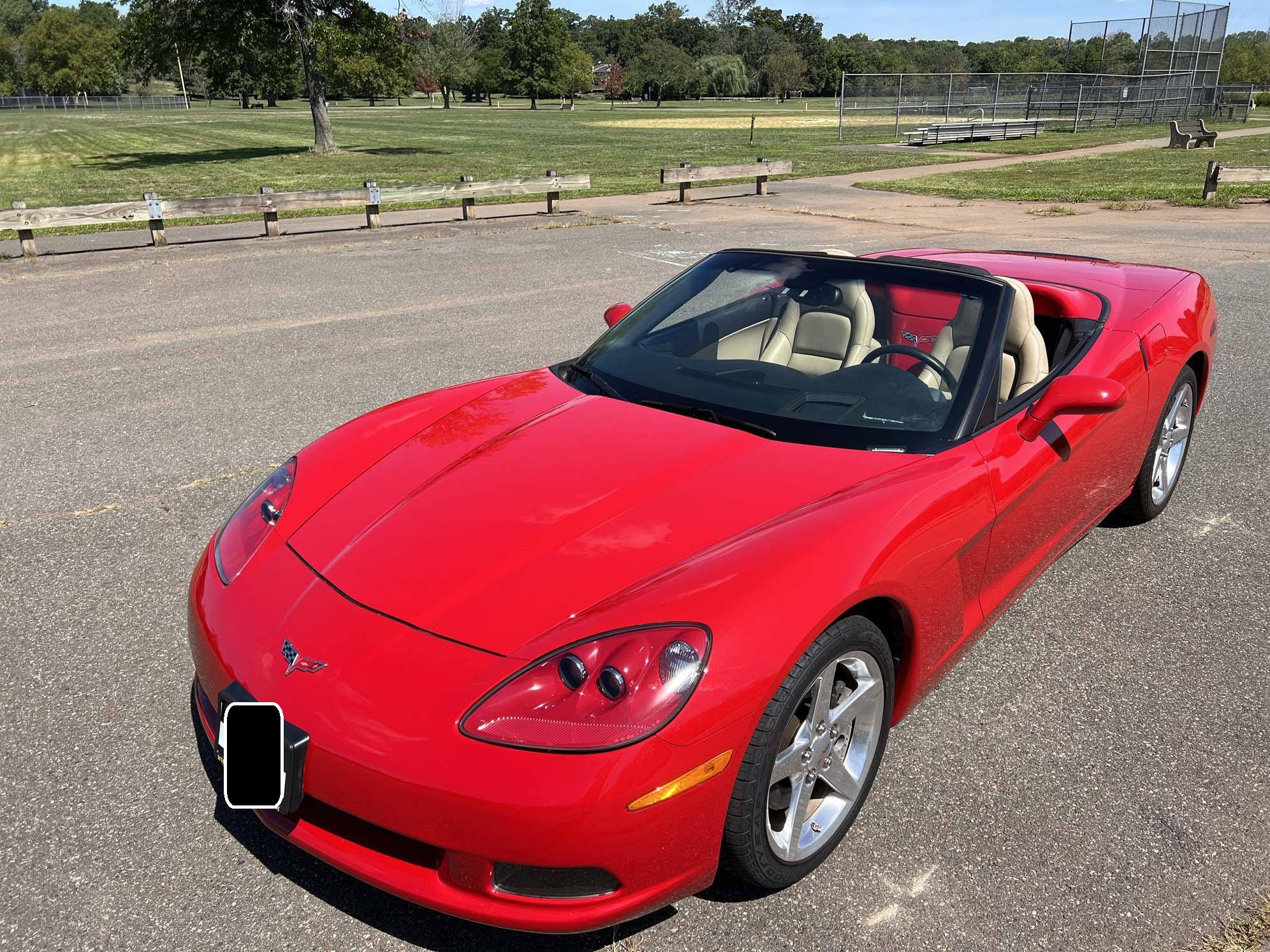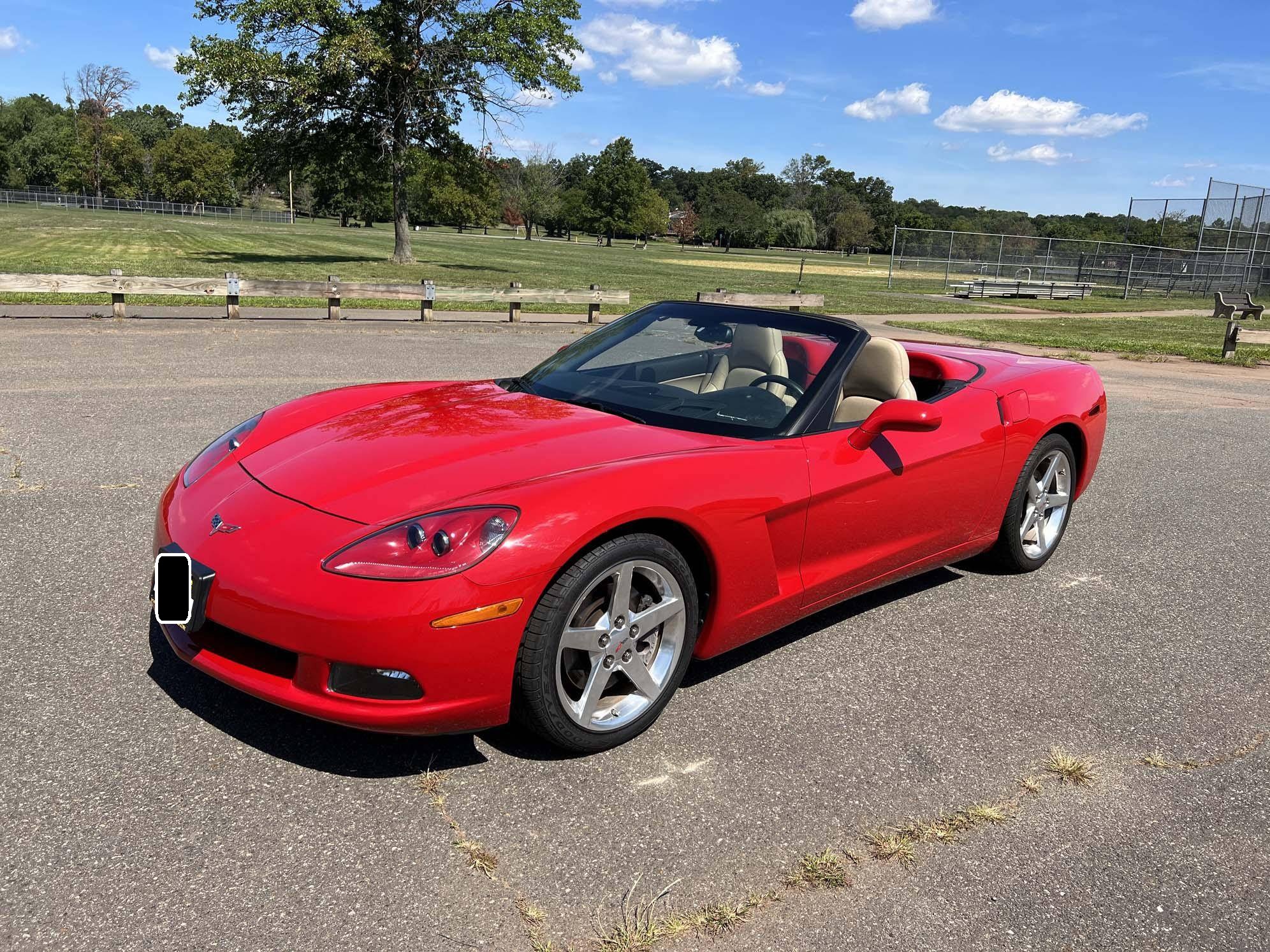 2005 Chevrolet Corvette Convertible, finished in Victory Red with a black soft top and a Cashmere interior. The odometer on this Corvette currently displays approximately 17,300 miles. An RPO code list is provided in the photo gallery, and a partial list of notable equipment includes 18-inch in front and 19-inch rear wheels, Selective Ride Control, a power-operated soft top, leather upholstery, and a Bose sound system. Modifications reported by the seller are limited to a Borla exhaust. The C6-generation Corvette debuted for the 2005 model year, and stood out from its predecessor with a more compact size, revised styling that did away with the pop-up headlights of the previous generation, and a notable bump in horsepower. Interior materials were improved, as were performance metrics; the C6 was sold in the United States until 2013. Power comes from an "LS2" 6. 0-liter V8, rated at 400 horsepower and 400 lb-ft of torque. Output is sent to the rear wheels via a 4-speed automatic transmission.