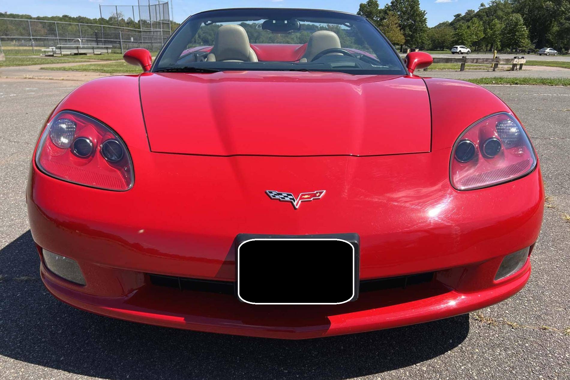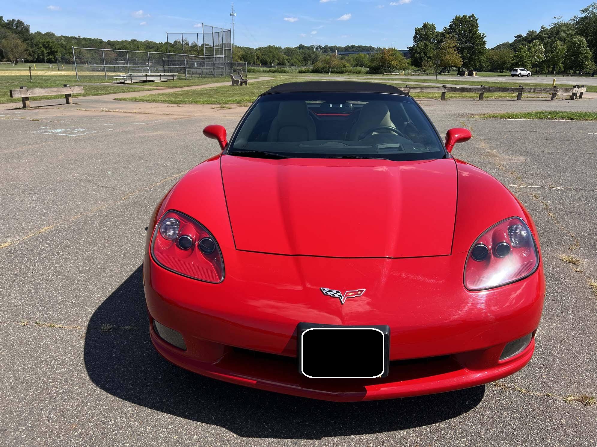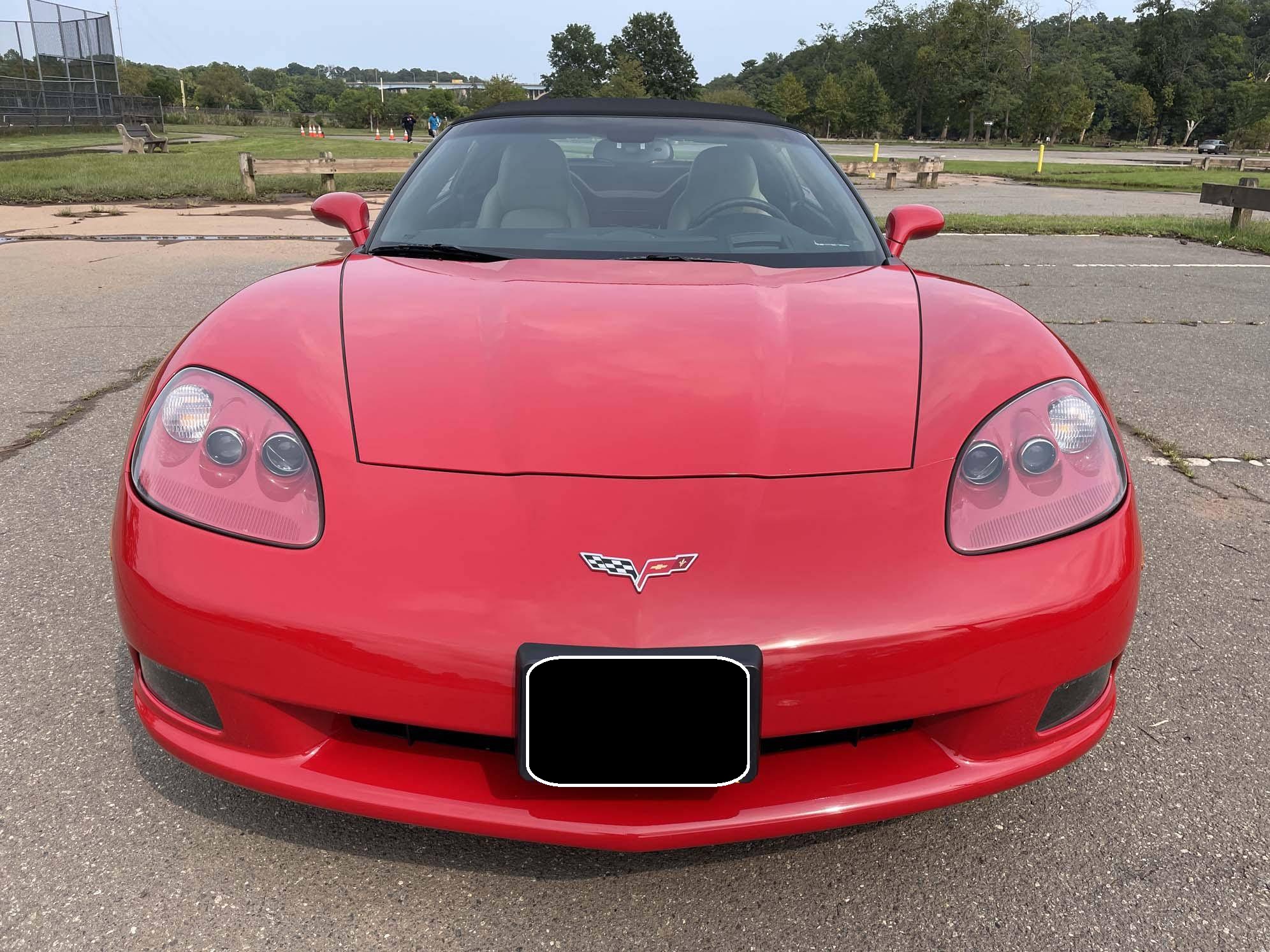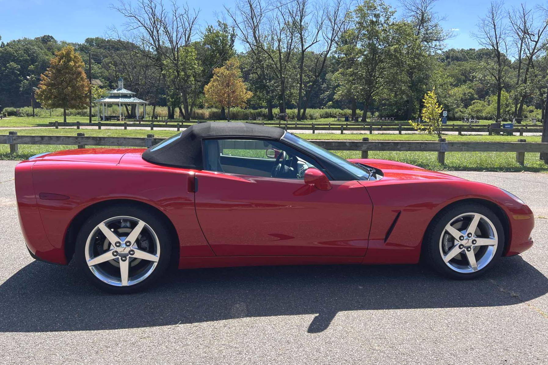 2005 Chevrolet Corvette Convertible, finished in Victory Red with a black soft top and a Cashmere interior. The odometer on this Corvette currently displays approximately 17,300 miles. An RPO code list is provided in the photo gallery, and a partial list of notable equipment includes 18-inch in front and 19-inch rear wheels, Selective Ride Control, a power-operated soft top, leather upholstery, and a Bose sound system. Modifications reported by the seller are limited to a Borla exhaust. The C6-generation Corvette debuted for the 2005 model year, and stood out from its predecessor with a more compact size, revised styling that did away with the pop-up headlights of the previous generation, and a notable bump in horsepower. Interior materials were improved, as were performance metrics; the C6 was sold in the United States until 2013. Power comes from an "LS2" 6. 0-liter V8, rated at 400 horsepower and 400 lb-ft of torque. Output is sent to the rear wheels via a 4-speed automatic transmission.