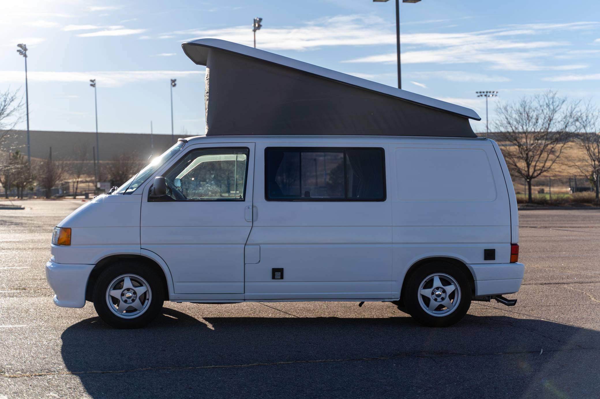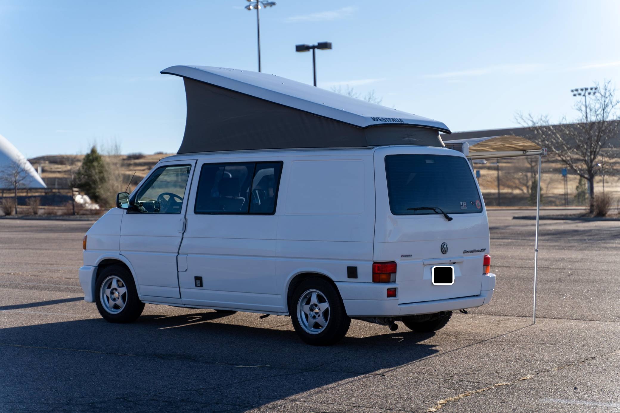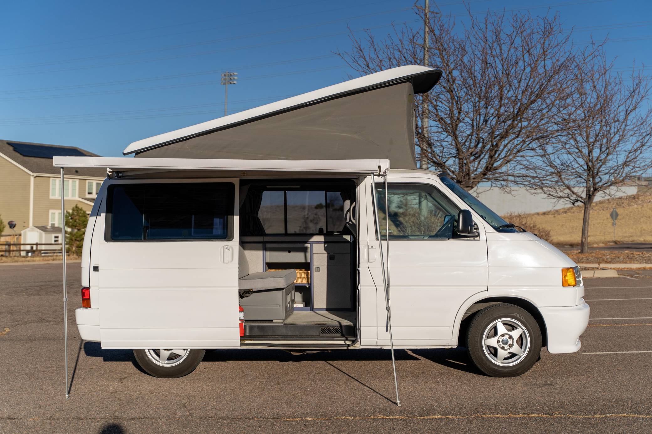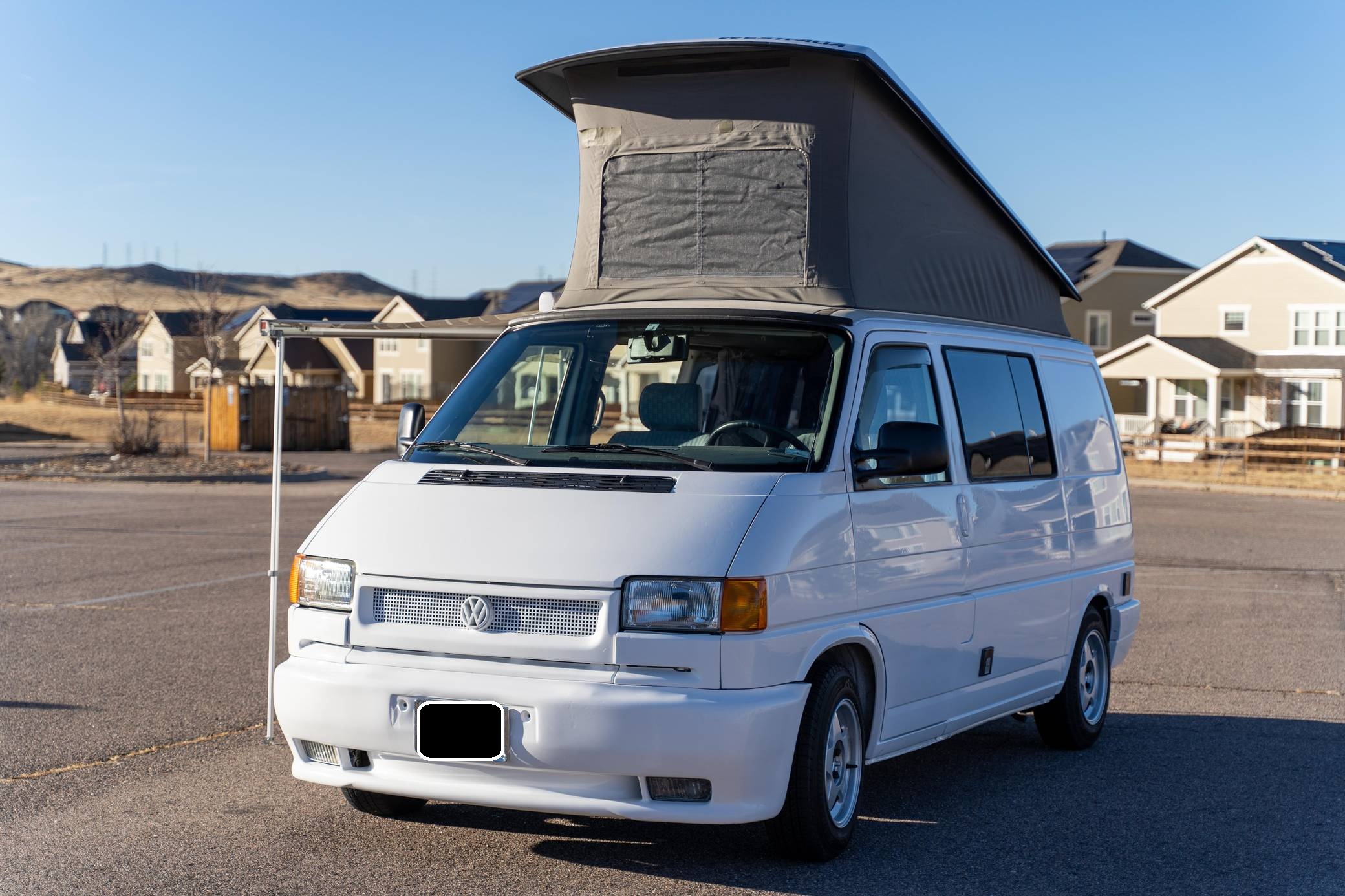 1995 Volkswagen EuroVan CV, finished in white with a gray interior. This is a Canadian-spec camper that was reportedly imported to the United States from Japan in 2020. It's equipped with a metric instrument cluster and its odometer displays about 100,500 kilometers, which represents approximately 62,500 miles. This short-wheelbase EuroVan was modified into a camper by Westfalia. It's equipped with a pop-up top, rotating front seats, a folding rear bench, curtains, a 12-volt refrigerator, a 2-burner butane stove, and a sink, among other features. More details about the modifications made to this van are provided below. Factory equipment includes cloth upholstery and air conditioning. Based on the "T4"-generation Transporter, the EuroVan is on the same branch of the Volkswagen family tree as the split- and bay-window Buses and the Vanagon. The T4 stood out as Volkswagen's first front-wheel-drive van when it launched globally in 1990, and German outfitter Westfalia took advantage of the spacious interior to turn the EuroVan into a camper that a family could comfortably sleep in. Power comes from a 2. 5-liter 5-cylinder engine, rated at 109 horsepower and 140 lb-ft of torque. It spins the front wheels via a 4-speed automatic transmission.