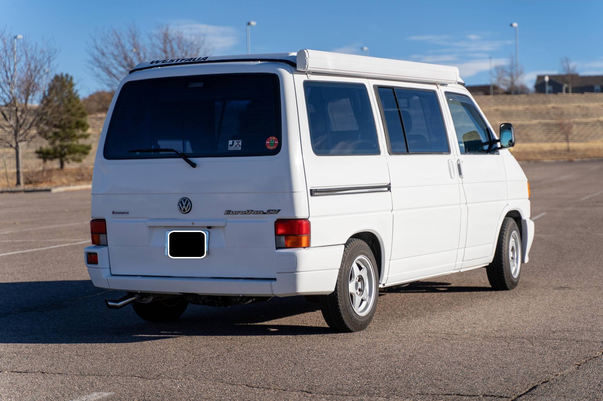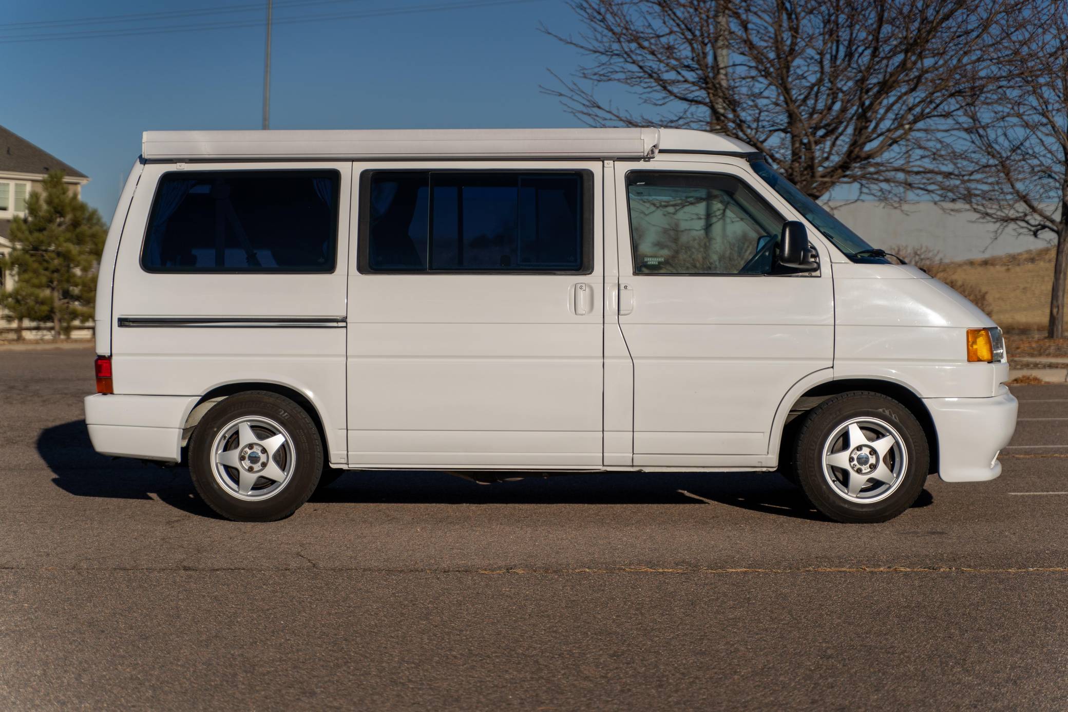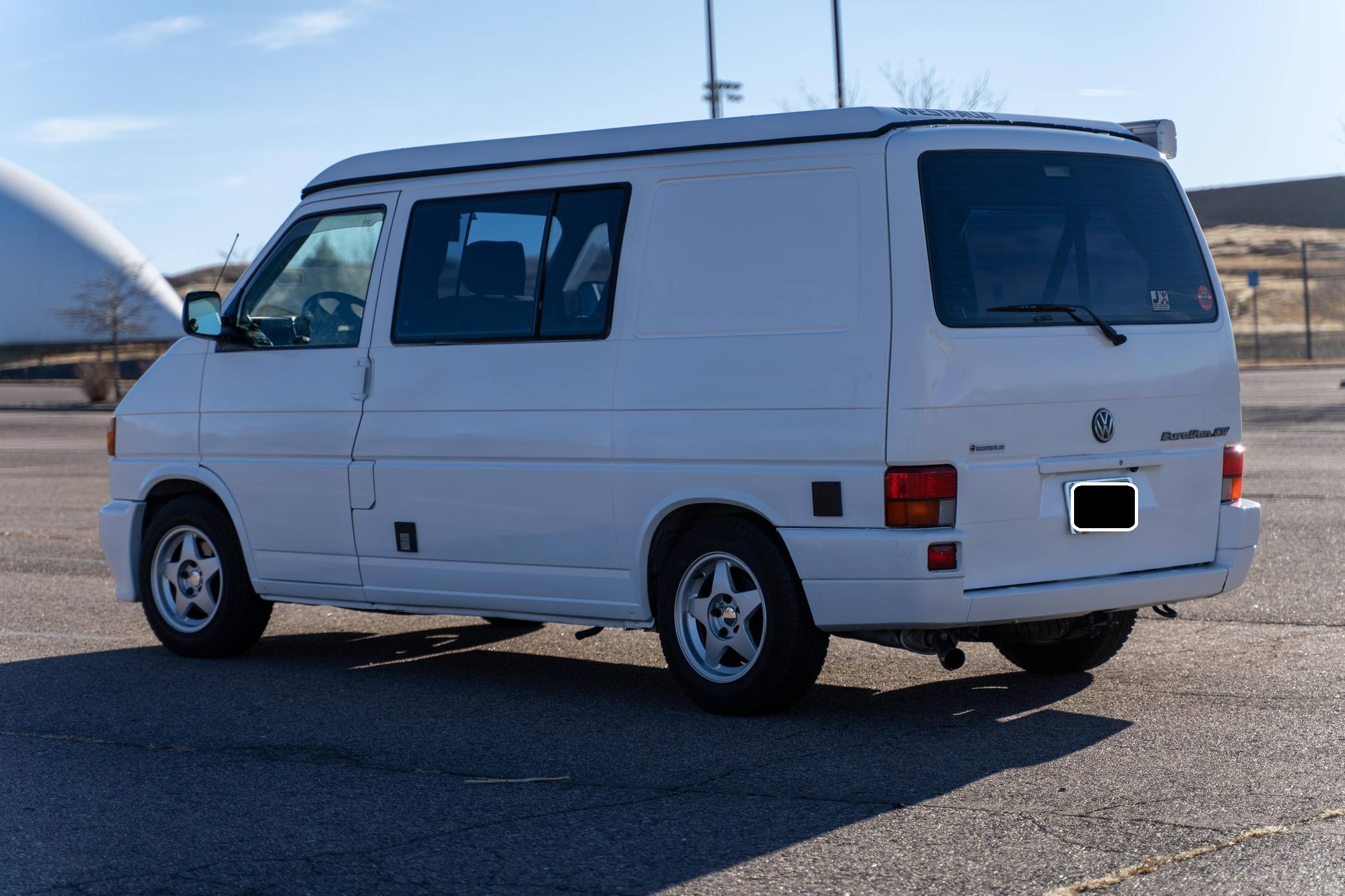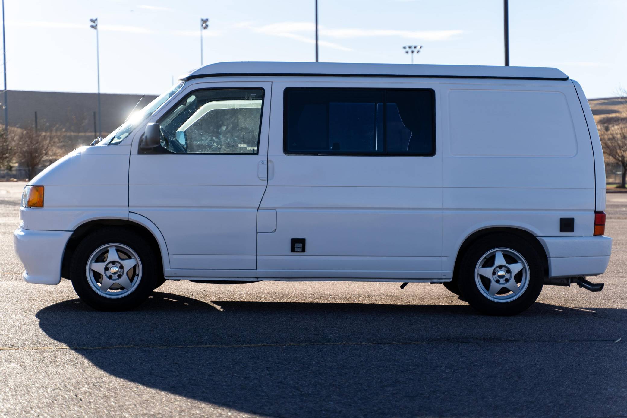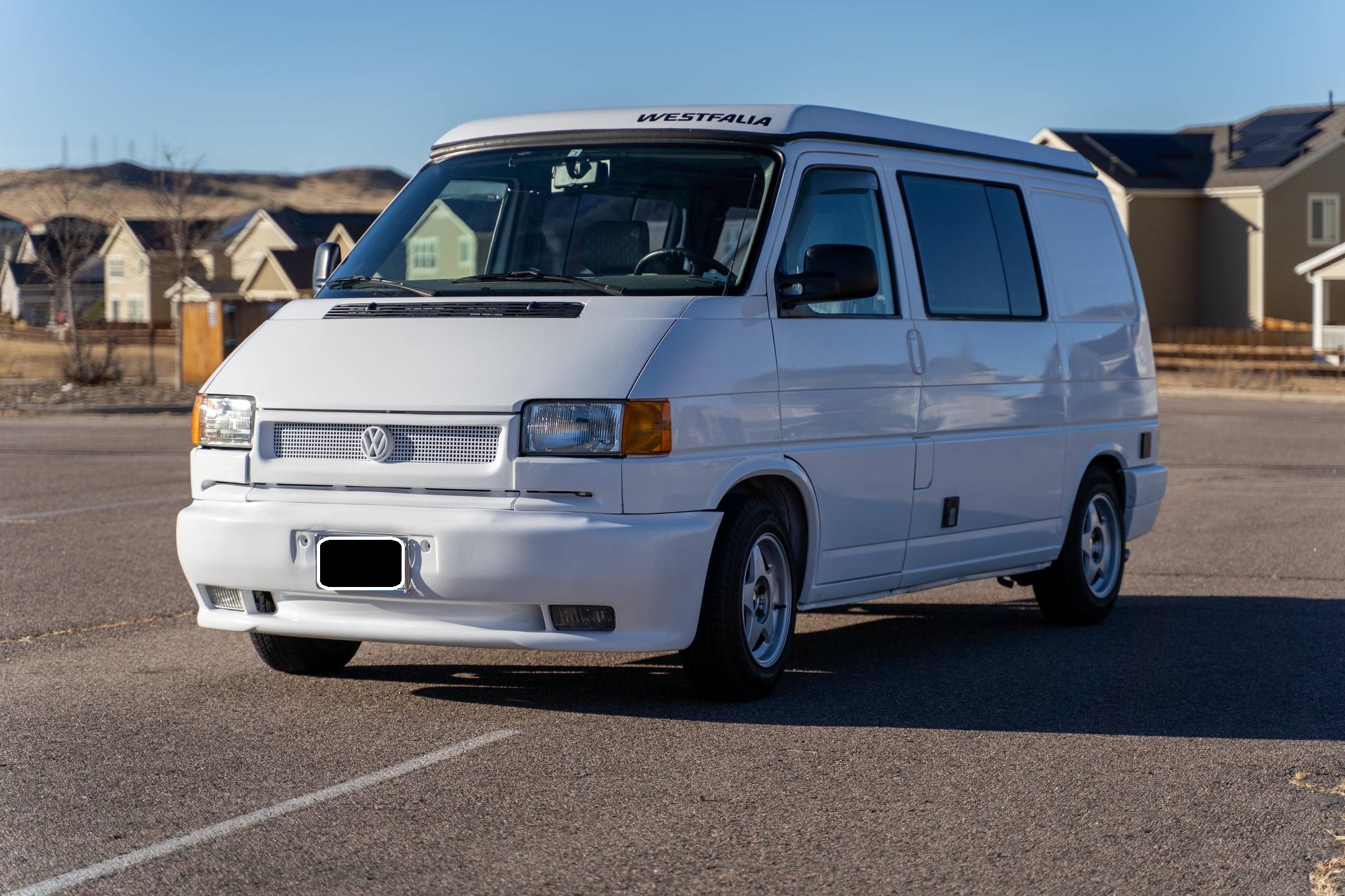 1995 Volkswagen EuroVan CV, finished in white with a gray interior. This is a Canadian-spec camper that was reportedly imported to the United States from Japan in 2020. It's equipped with a metric instrument cluster and its odometer displays about 100,500 kilometers, which represents approximately 62,500 miles. This short-wheelbase EuroVan was modified into a camper by Westfalia. It's equipped with a pop-up top, rotating front seats, a folding rear bench, curtains, a 12-volt refrigerator, a 2-burner butane stove, and a sink, among other features. More details about the modifications made to this van are provided below. Factory equipment includes cloth upholstery and air conditioning. Based on the "T4"-generation Transporter, the EuroVan is on the same branch of the Volkswagen family tree as the split- and bay-window Buses and the Vanagon. The T4 stood out as Volkswagen's first front-wheel-drive van when it launched globally in 1990, and German outfitter Westfalia took advantage of the spacious interior to turn the EuroVan into a camper that a family could comfortably sleep in. Power comes from a 2. 5-liter 5-cylinder engine, rated at 109 horsepower and 140 lb-ft of torque. It spins the front wheels via a 4-speed automatic transmission.