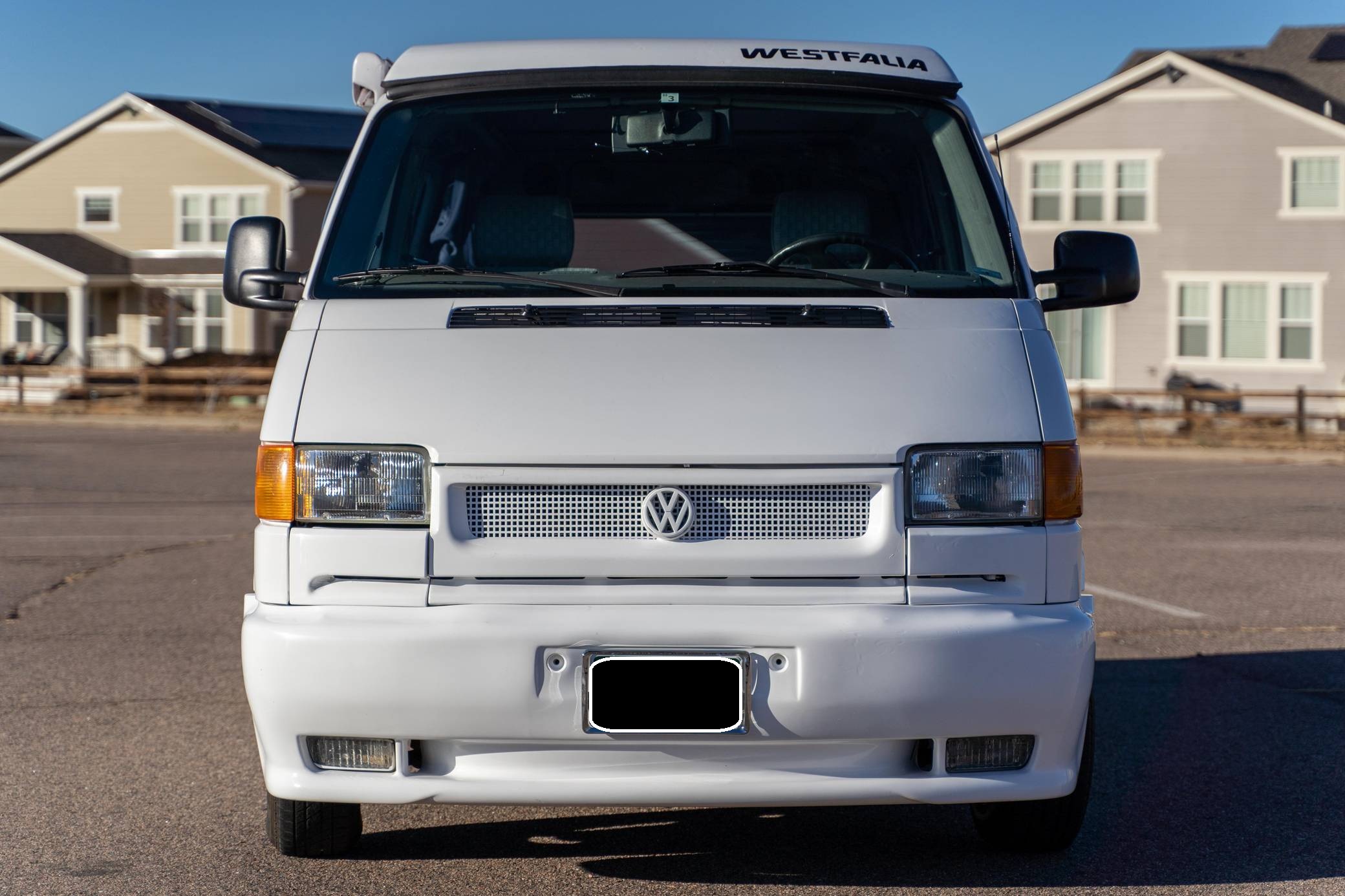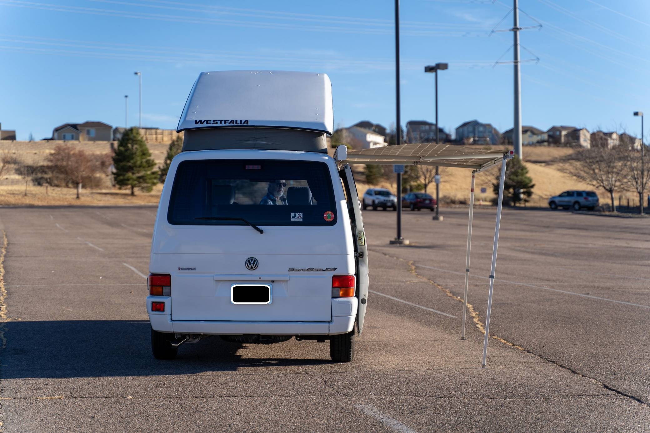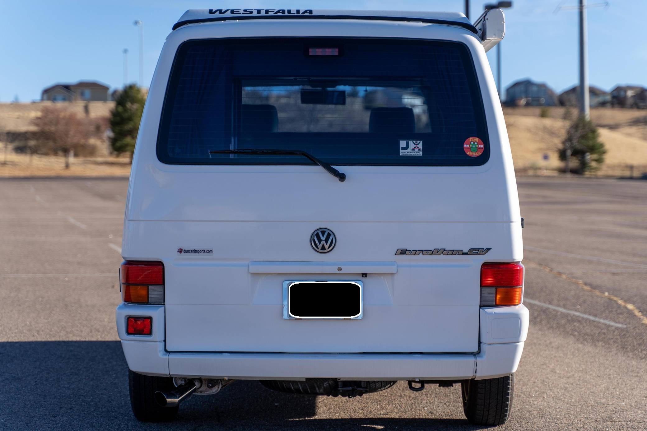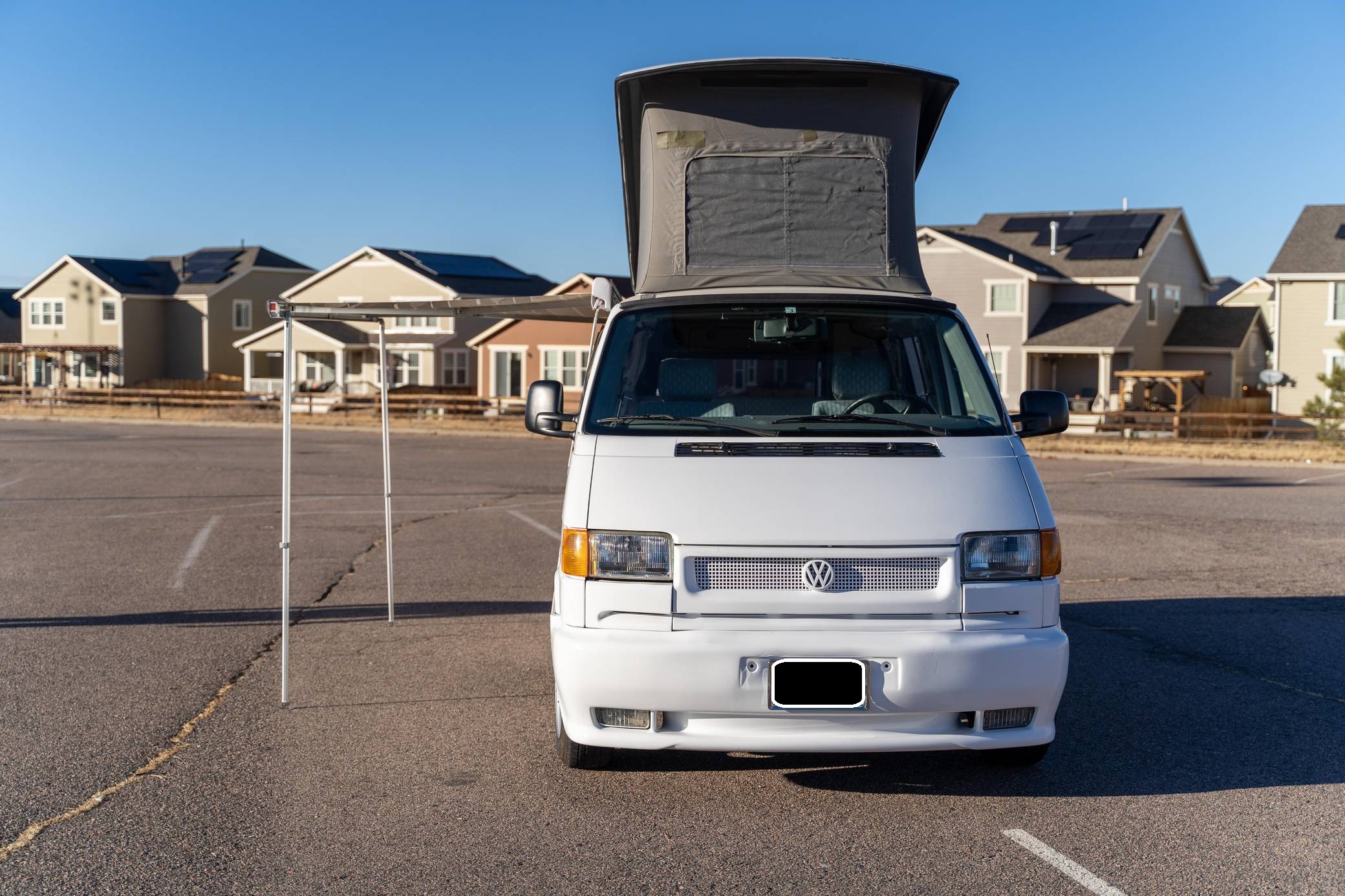 1995 Volkswagen EuroVan CV, finished in white with a gray interior. This is a Canadian-spec camper that was reportedly imported to the United States from Japan in 2020. It's equipped with a metric instrument cluster and its odometer displays about 100,500 kilometers, which represents approximately 62,500 miles. This short-wheelbase EuroVan was modified into a camper by Westfalia. It's equipped with a pop-up top, rotating front seats, a folding rear bench, curtains, a 12-volt refrigerator, a 2-burner butane stove, and a sink, among other features. More details about the modifications made to this van are provided below. Factory equipment includes cloth upholstery and air conditioning. Based on the "T4"-generation Transporter, the EuroVan is on the same branch of the Volkswagen family tree as the split- and bay-window Buses and the Vanagon. The T4 stood out as Volkswagen's first front-wheel-drive van when it launched globally in 1990, and German outfitter Westfalia took advantage of the spacious interior to turn the EuroVan into a camper that a family could comfortably sleep in. Power comes from a 2. 5-liter 5-cylinder engine, rated at 109 horsepower and 140 lb-ft of torque. It spins the front wheels via a 4-speed automatic transmission.