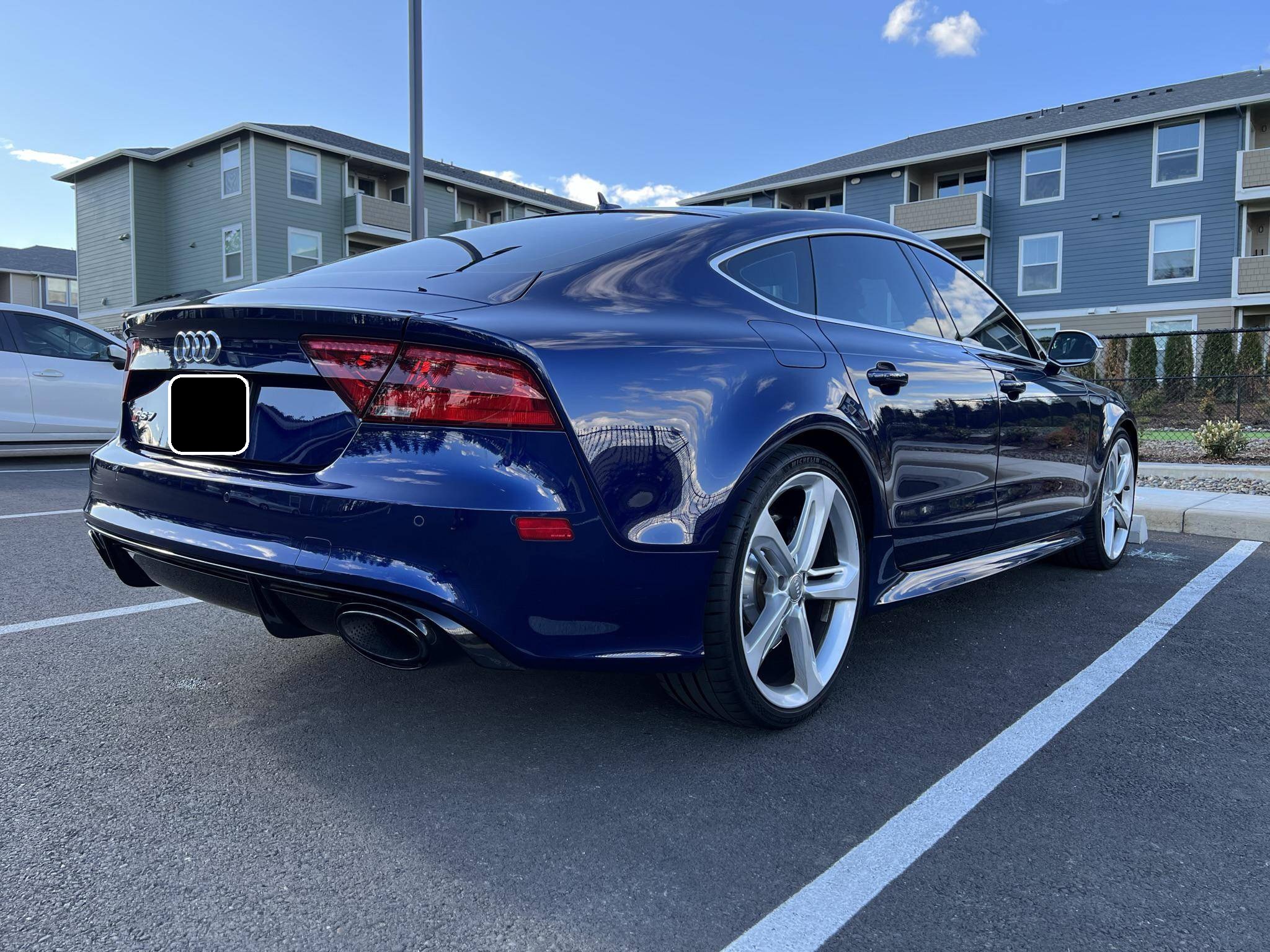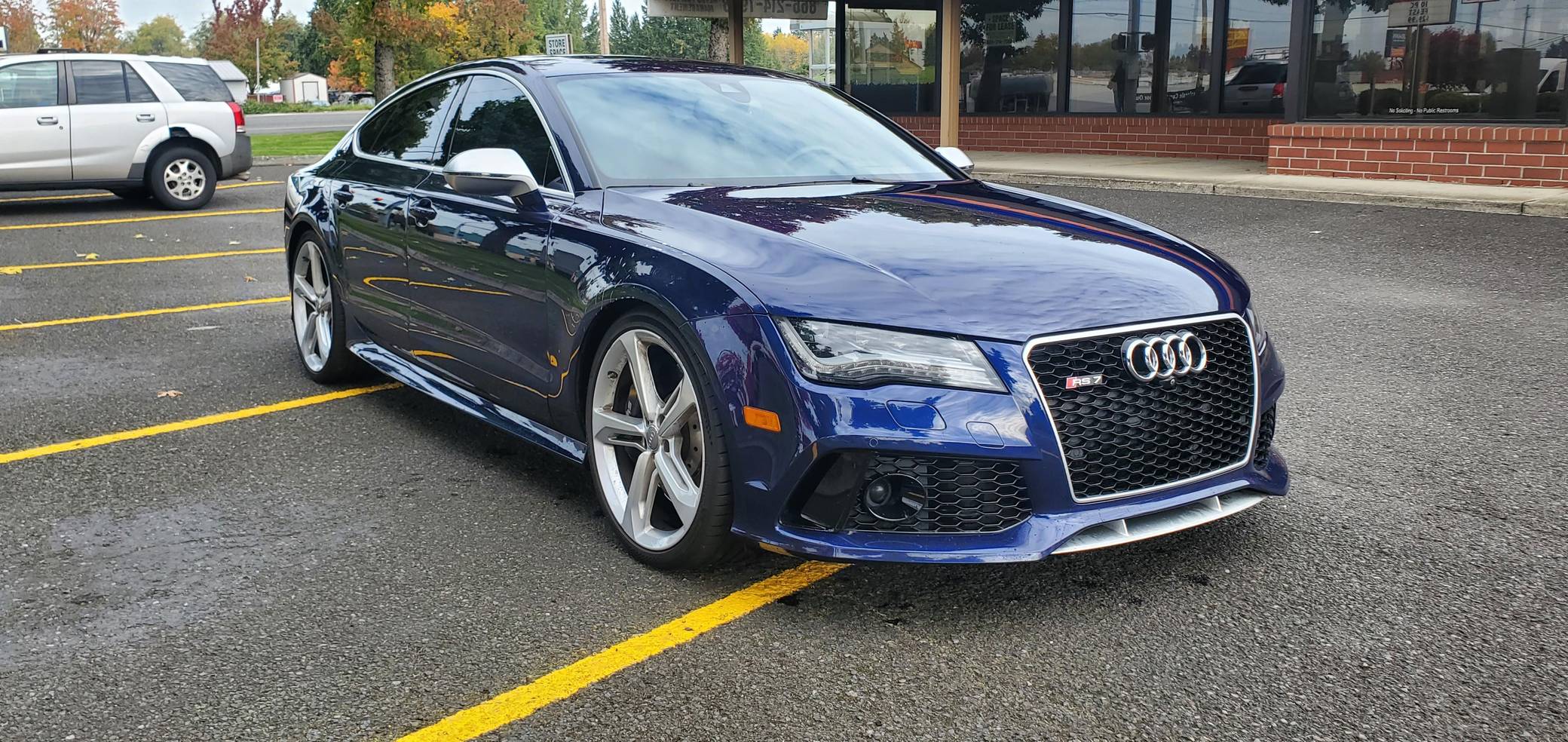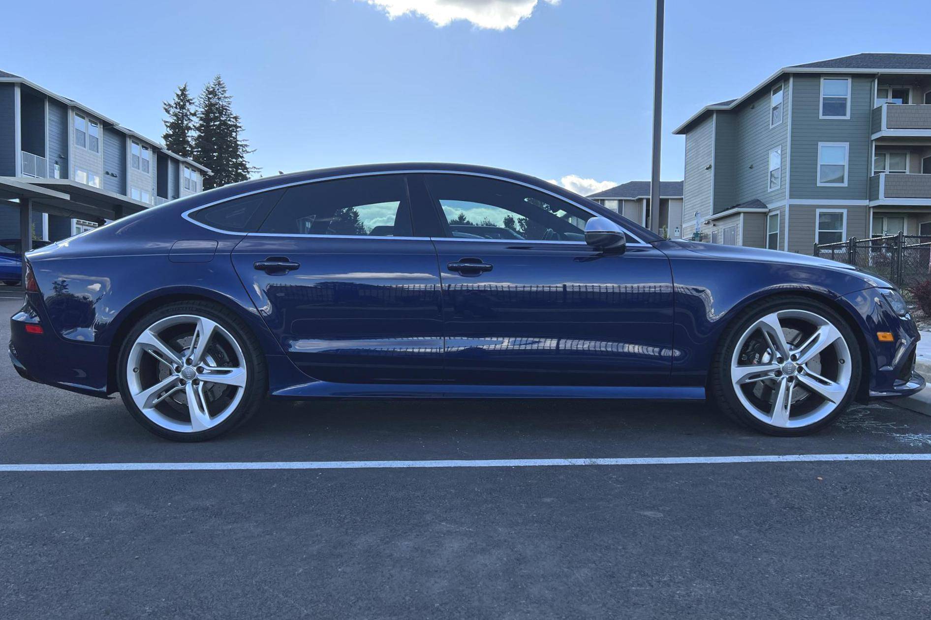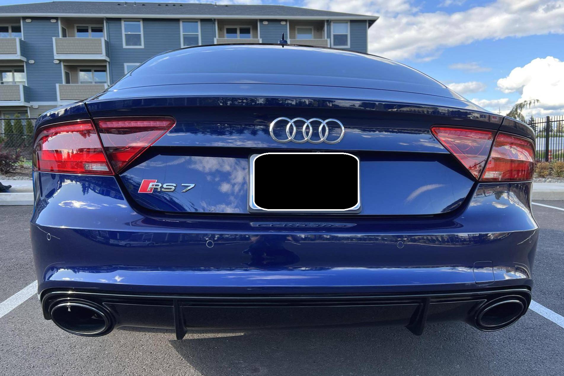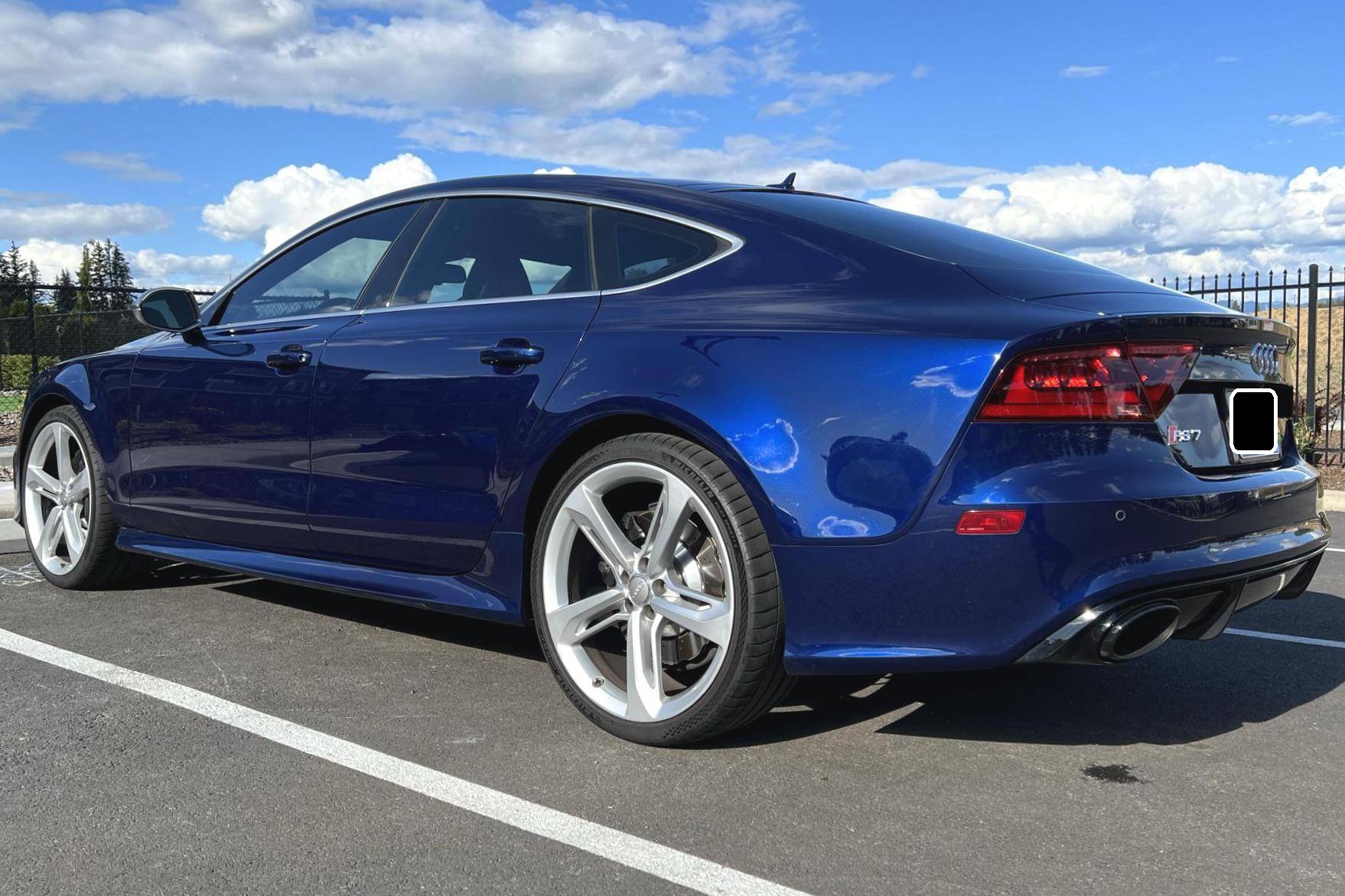 2014 Audi RS7, finished in Estoril Blue Crystal Effect with a black interior. A Monroney Label is provided in the photo gallery, and a partial list of notable equipment includes the Driver Assistance Plus Package, the Innovation Package, 21-inch 5-spoke blade design wheels, 4-corner auto-leveling suspension, an electro-mechanical limited-slip differential, sports exhaust with black finishers, a power rear spoiler, a sunroof, leather upholstery, aluminum and carbon fiber interior trim, a black Alcantara headliner, a Bang & Olufsen Advanced Sound System, a navigation system, and power-closing doors. The seller reports no modifications. Audi introduced the "Type 4G8" A7 in 2010, and the range-topping RS7 variant arrived in 2013. In addition to power upgrades, Audi also added a myriad of high-performance equipment such as 15-inch front brake rotors with 6-piston calipers, Quattro all-wheel-drive with torque vectoring, and a locking center differential, among other RS-specific features. Power comes from a 4. 0-liter twin-turbocharged "TFSI" V8, rated at 560 horsepower and 516 lb-ft of torque. Output is sent to all four wheels via an 8-speed automatic transmission and Audi's Quattro permanent all-wheel-drive system.