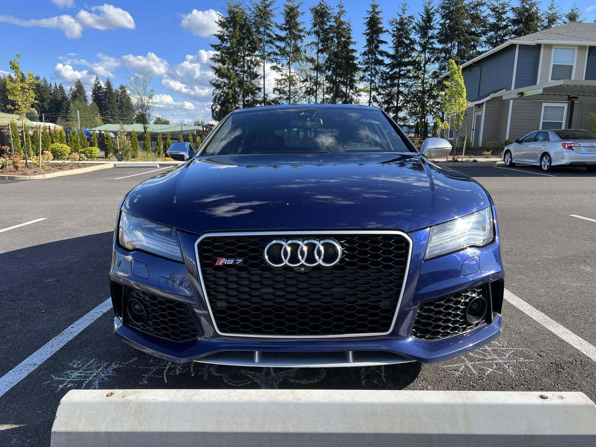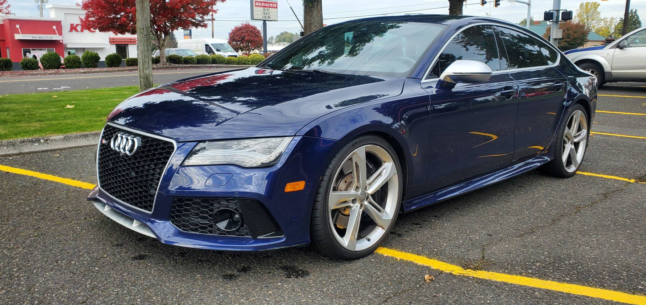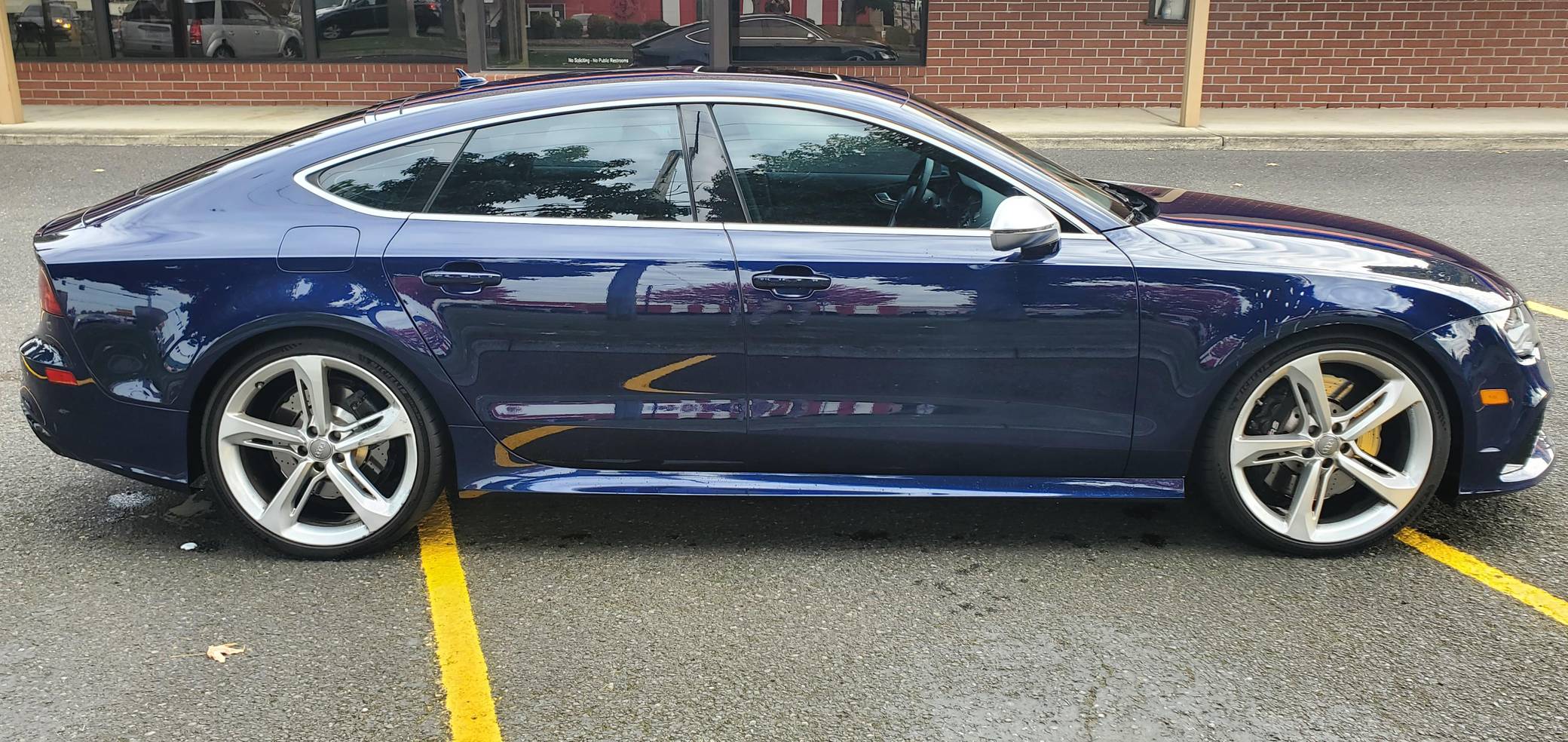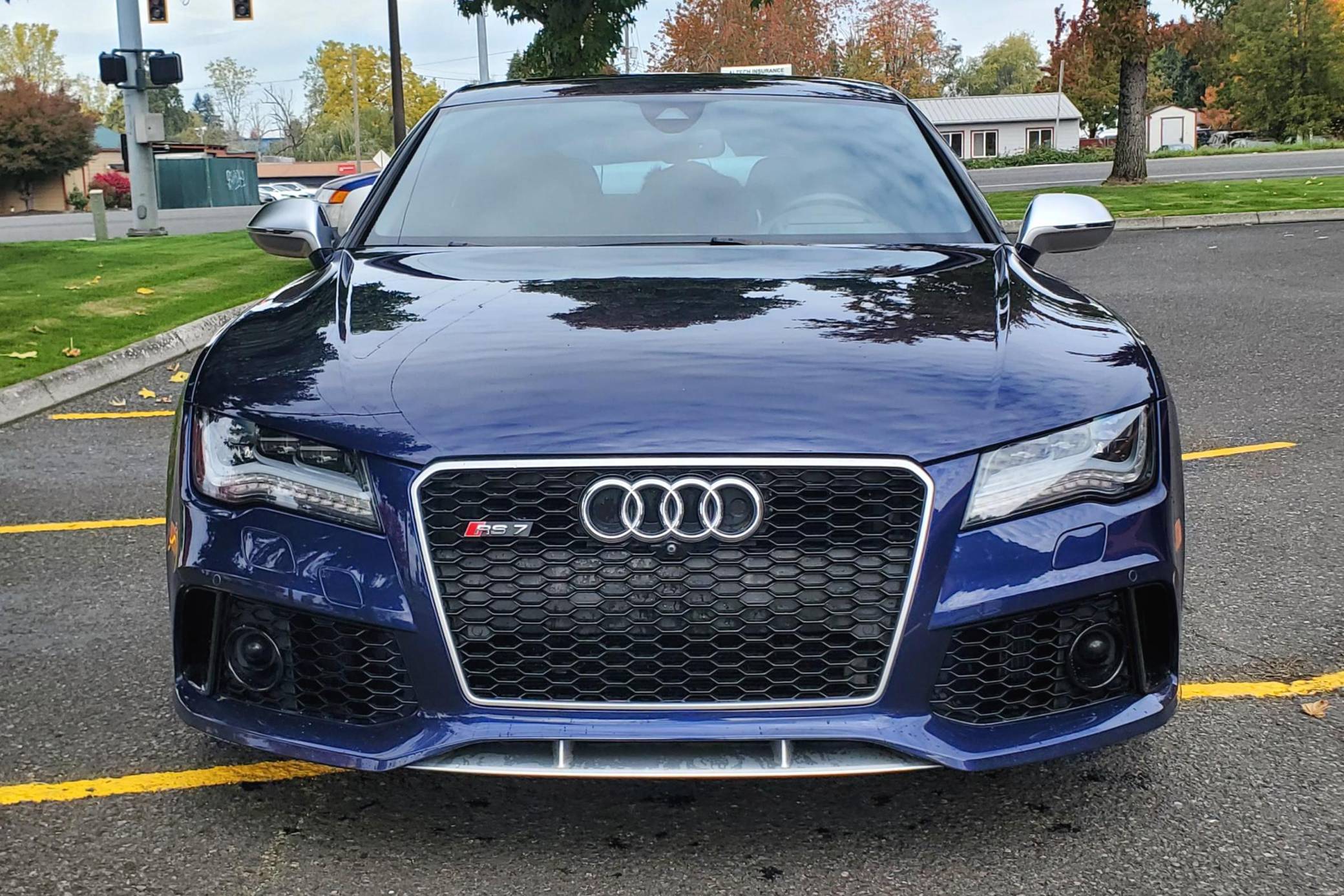 2014 Audi RS7, finished in Estoril Blue Crystal Effect with a black interior. A Monroney Label is provided in the photo gallery, and a partial list of notable equipment includes the Driver Assistance Plus Package, the Innovation Package, 21-inch 5-spoke blade design wheels, 4-corner auto-leveling suspension, an electro-mechanical limited-slip differential, sports exhaust with black finishers, a power rear spoiler, a sunroof, leather upholstery, aluminum and carbon fiber interior trim, a black Alcantara headliner, a Bang & Olufsen Advanced Sound System, a navigation system, and power-closing doors. The seller reports no modifications. Audi introduced the "Type 4G8" A7 in 2010, and the range-topping RS7 variant arrived in 2013. In addition to power upgrades, Audi also added a myriad of high-performance equipment such as 15-inch front brake rotors with 6-piston calipers, Quattro all-wheel-drive with torque vectoring, and a locking center differential, among other RS-specific features. Power comes from a 4. 0-liter twin-turbocharged "TFSI" V8, rated at 560 horsepower and 516 lb-ft of torque. Output is sent to all four wheels via an 8-speed automatic transmission and Audi's Quattro permanent all-wheel-drive system.