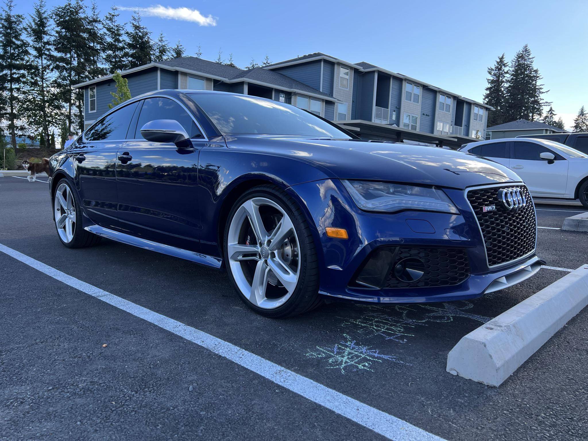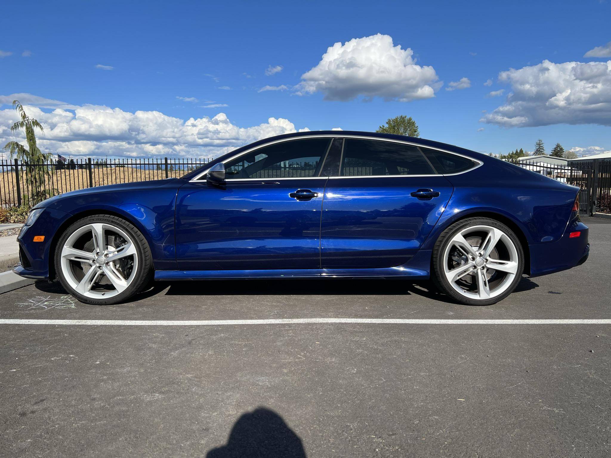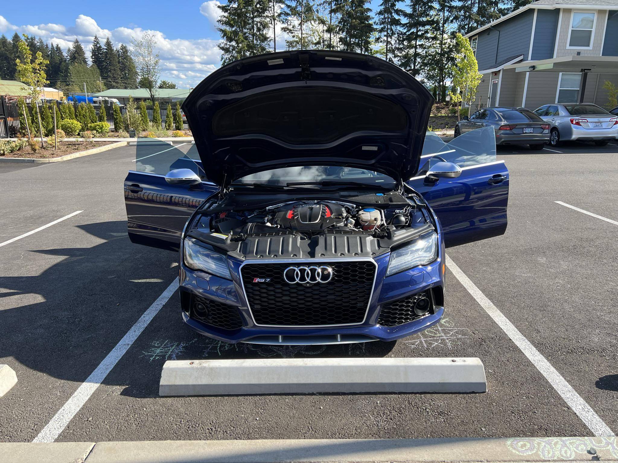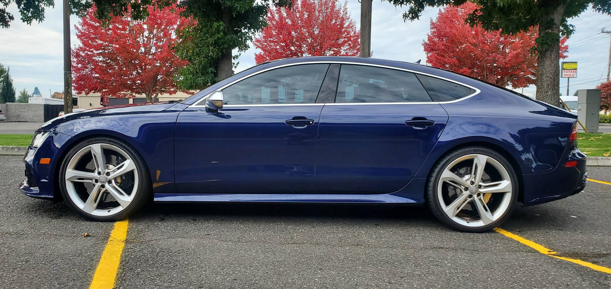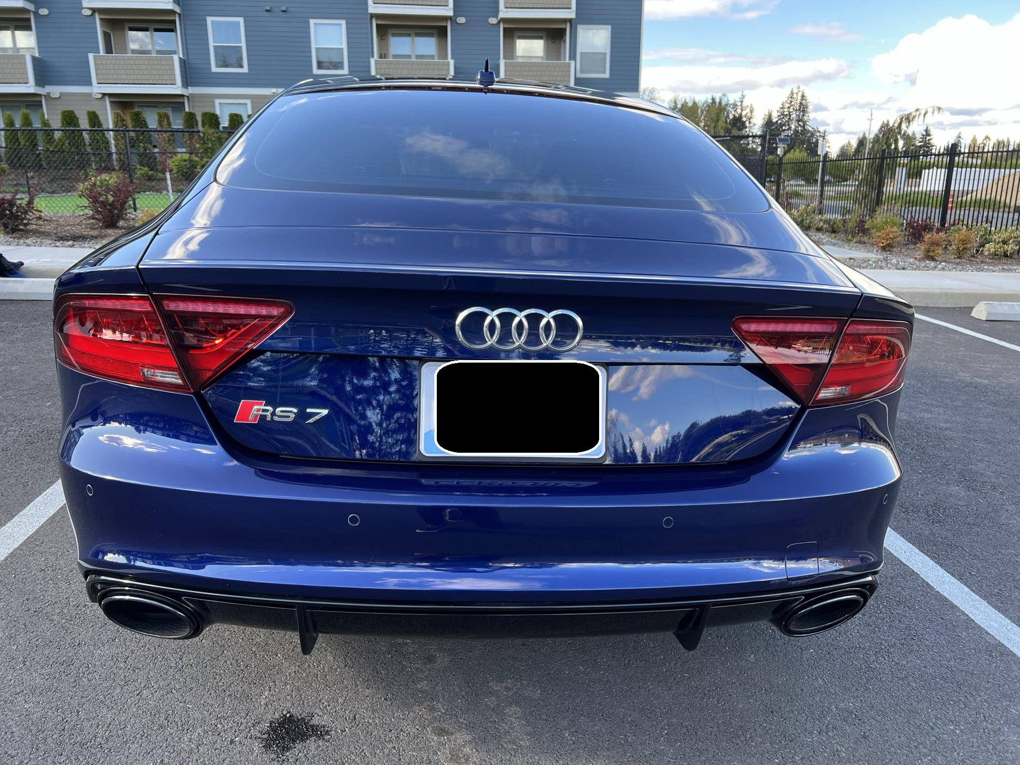 2014 Audi RS7, finished in Estoril Blue Crystal Effect with a black interior. A Monroney Label is provided in the photo gallery, and a partial list of notable equipment includes the Driver Assistance Plus Package, the Innovation Package, 21-inch 5-spoke blade design wheels, 4-corner auto-leveling suspension, an electro-mechanical limited-slip differential, sports exhaust with black finishers, a power rear spoiler, a sunroof, leather upholstery, aluminum and carbon fiber interior trim, a black Alcantara headliner, a Bang & Olufsen Advanced Sound System, a navigation system, and power-closing doors. The seller reports no modifications. Audi introduced the "Type 4G8" A7 in 2010, and the range-topping RS7 variant arrived in 2013. In addition to power upgrades, Audi also added a myriad of high-performance equipment such as 15-inch front brake rotors with 6-piston calipers, Quattro all-wheel-drive with torque vectoring, and a locking center differential, among other RS-specific features. Power comes from a 4. 0-liter twin-turbocharged "TFSI" V8, rated at 560 horsepower and 516 lb-ft of torque. Output is sent to all four wheels via an 8-speed automatic transmission and Audi's Quattro permanent all-wheel-drive system.