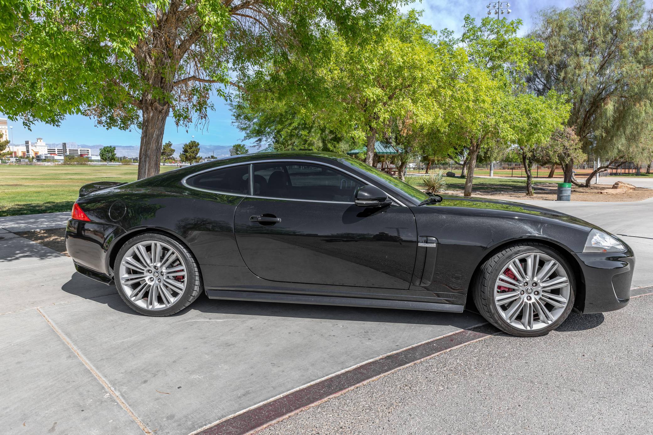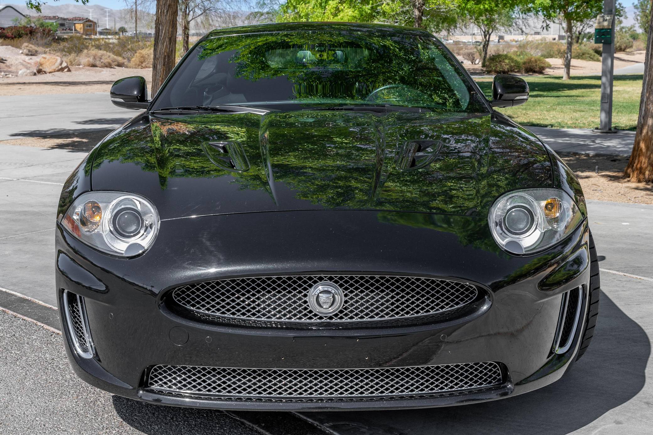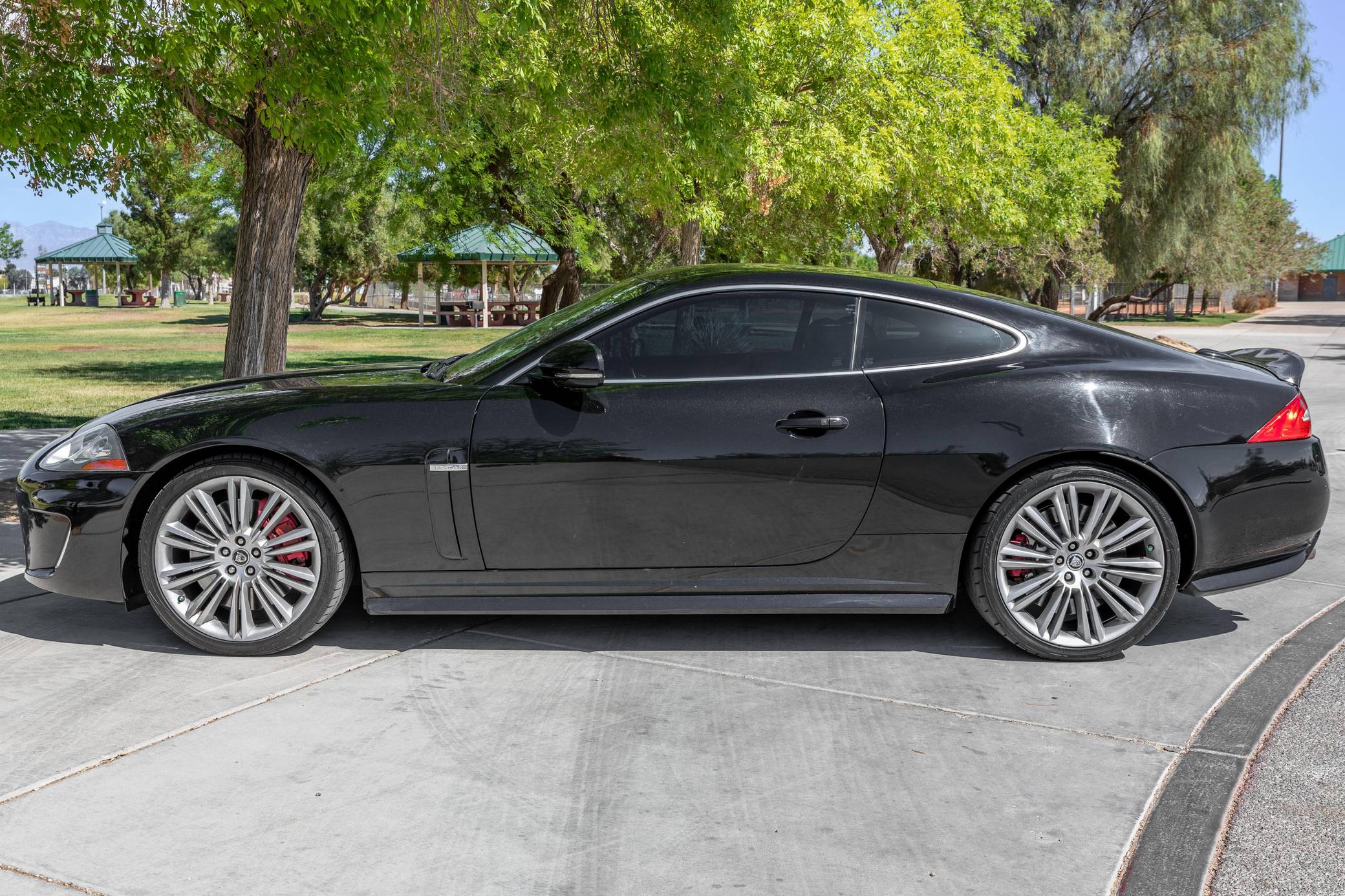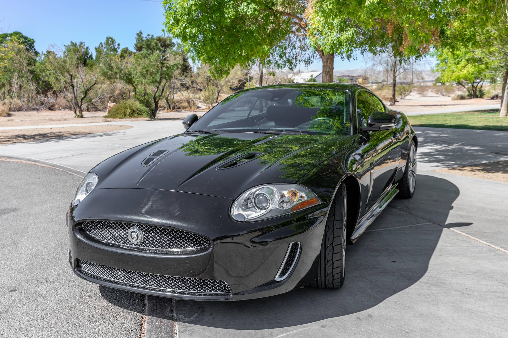 2011 Jaguar XKR 175, finished in Ultimate Black with a Warm Charcoal interior. The odometer on this XRK currently displays about 46,300 miles. Factory equipment includes 20-inch Kasuga wheels, leather upholstery, heated and cooled power adjustable front seats, a Bowers & Wilkins audio system, front and rear parking sensors, and a navigation system. The seller reports no modifications. The "X150" is the second and final generation of the Jaguar XK GT car, notable for its all-aluminum construction and striking XKE-inspired styling penned by Ian Callum — who also designed vehicles such as the Aston Martin V12 Vanquish, Ford RS200, Aston Martin DB9, and more. The XKR 175 edition was built to celebrate Jaguar's 75th anniversary. Only 175 cars were built, all of which were painted Ultimate Black and included a Warm Charcoal interior with Cranberry stitching. Additional changes over the standard XKR include an increased top speed limiter and special door sill tread plates. Power comes from a 5. 0-liter supercharged V8 engine, rated at 510 horsepower and 461 lb-ft of torque. Output is sent to the rear wheels via a 6-speed automatic transmission.