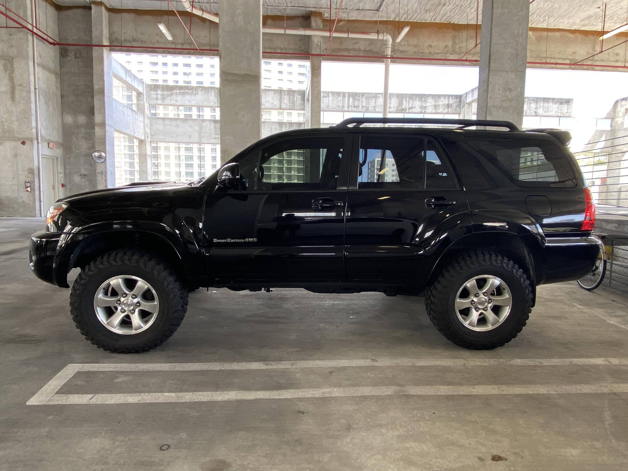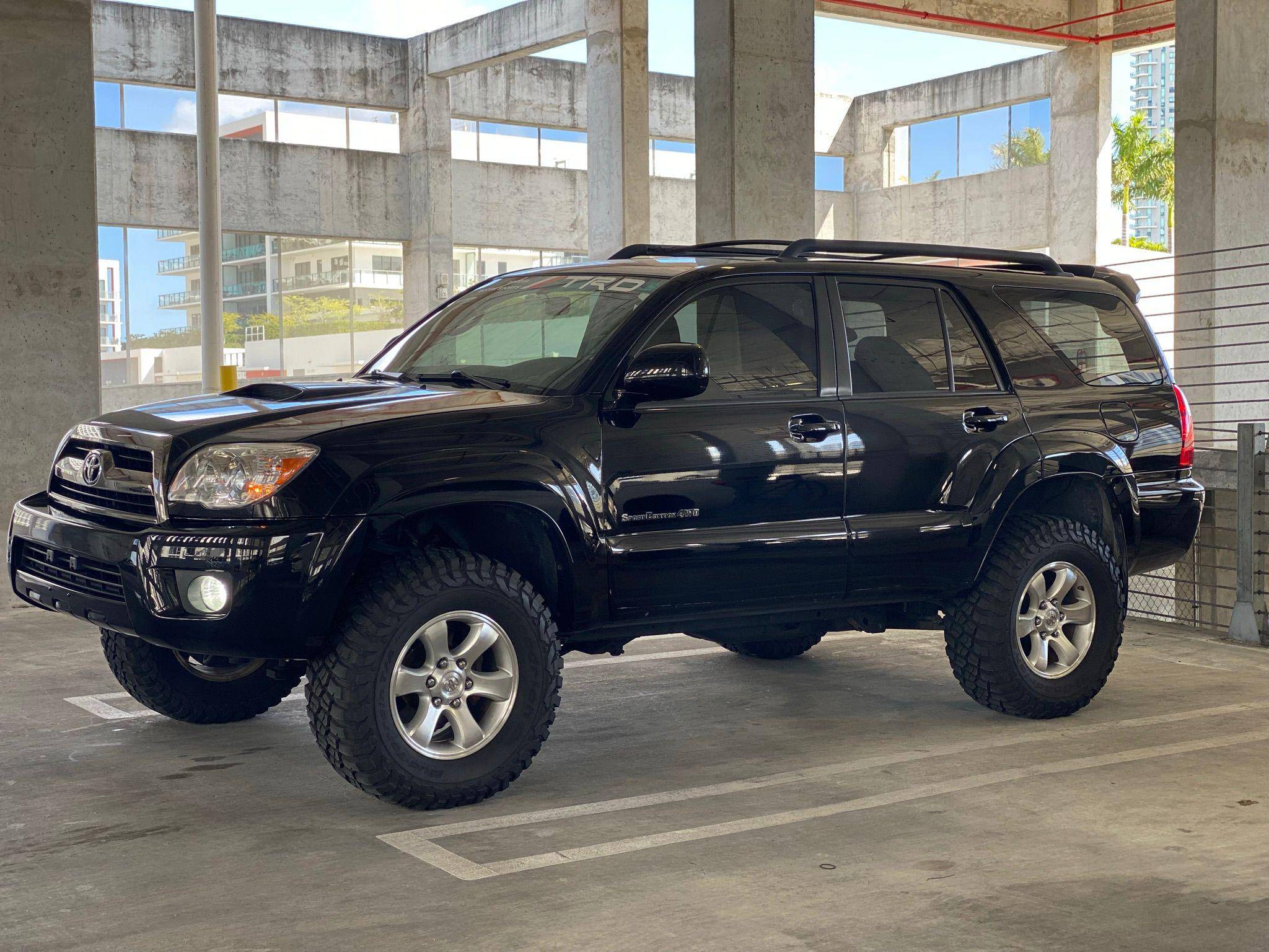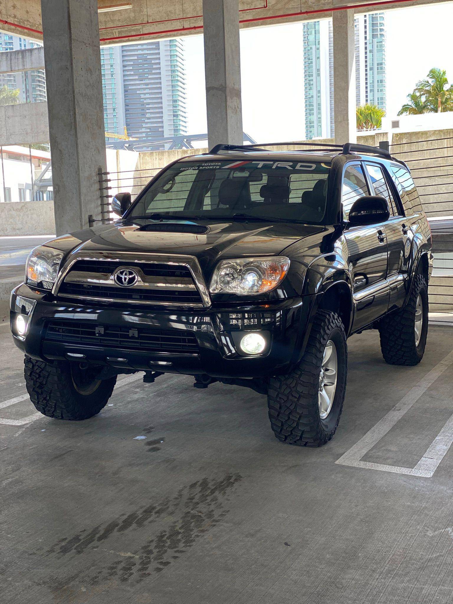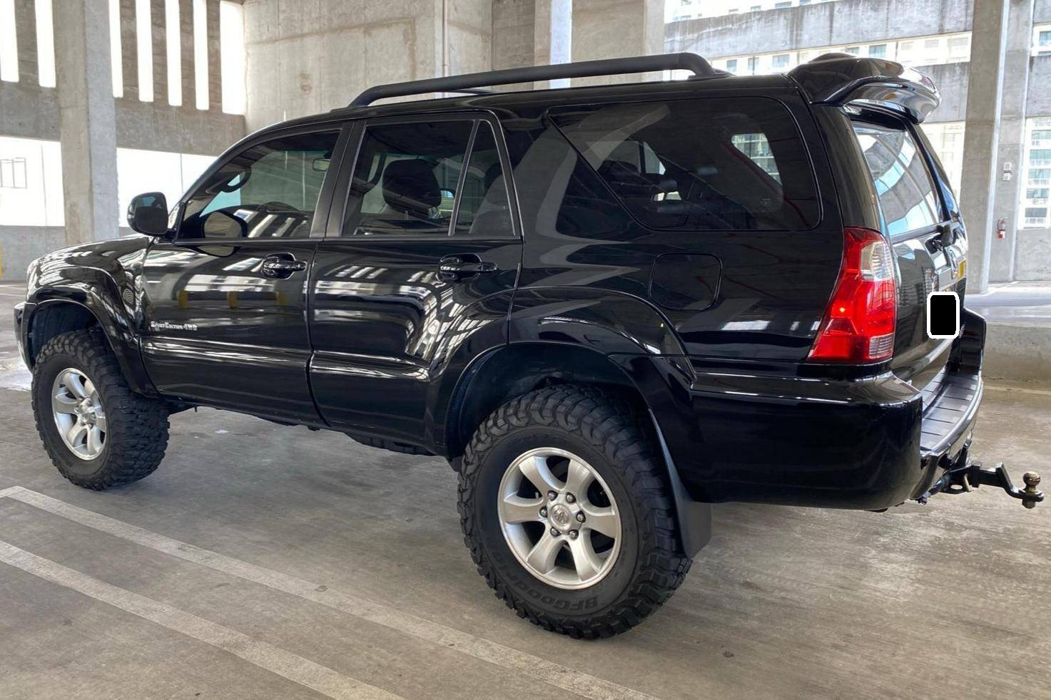 2006 Toyota 4Runner Sport Edition 4x4, finished in black with a black interior. Equipment on this 4Runner includes the Sport Edition Package (which adds 17-inch wheels, a hood scoop, a tubular roof rack with cross bars, and smoked chrome accents on the grille and headlight bezels), a locking center differential, a rear spoiler, leather upholstery, and more as detailed below. Modifications reported to this 4Runner include a Supreme Suspensions 2-inch spacer lift kit, BFGoodrich Mud Terrain tires, and LED headlight and foglight bulbs. A full list of modifications is included below. The fourth-generation 4Runner arrived for 2003. It was larger, more powerful, and generally more refined than the model it replaced. Toyota significantly bucked the industry's trend towards car-like crossovers and let the 4Runner keep its rugged body-on-frame construction, an architecture later shared with the FJ Cruiser. The 2006 model year received a slight facelift, which included projector beam headlights, a redesigned grille, and LED tail lights. Production ended in 2009. Power comes from a "2UZ-FE" 4. 7-liter V8, rated at 260 horsepower and 306 lb-ft of torque. The engine spins all four wheels via a 5-speed automatic transmission and a full-time four-wheel-drive system.
