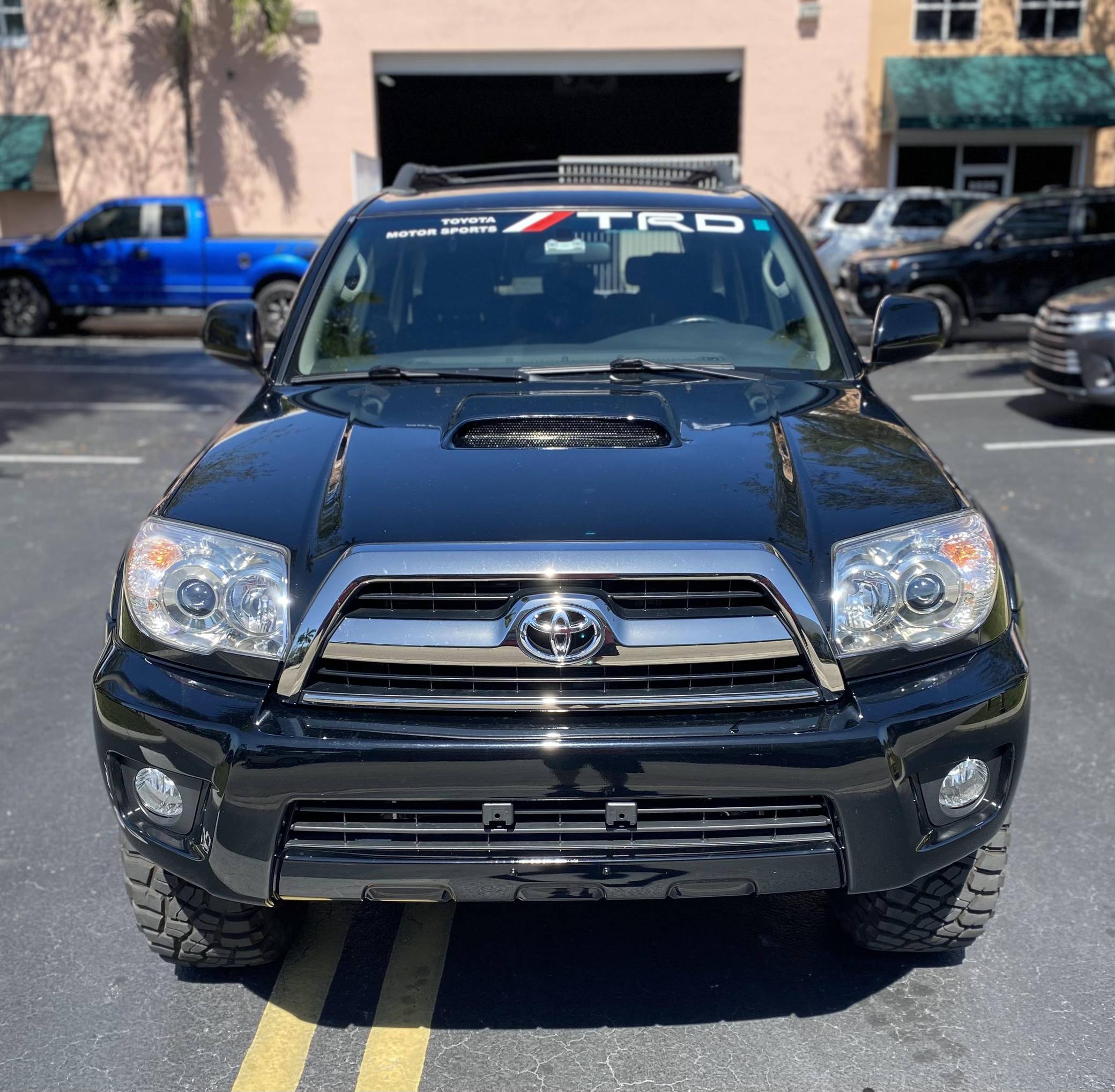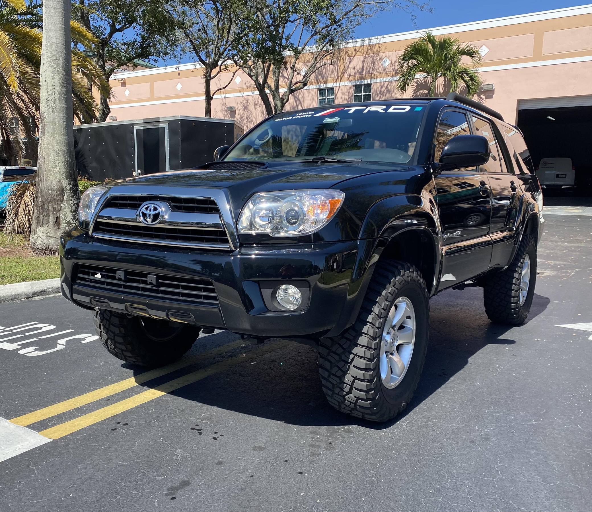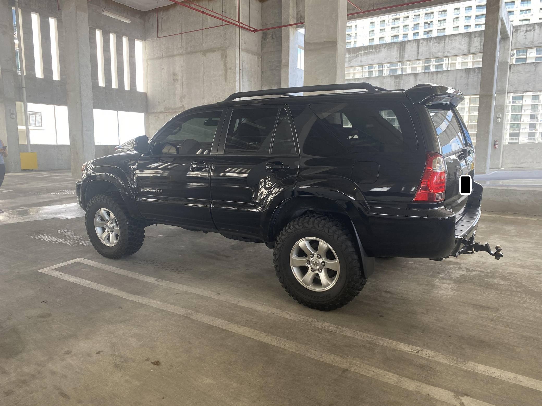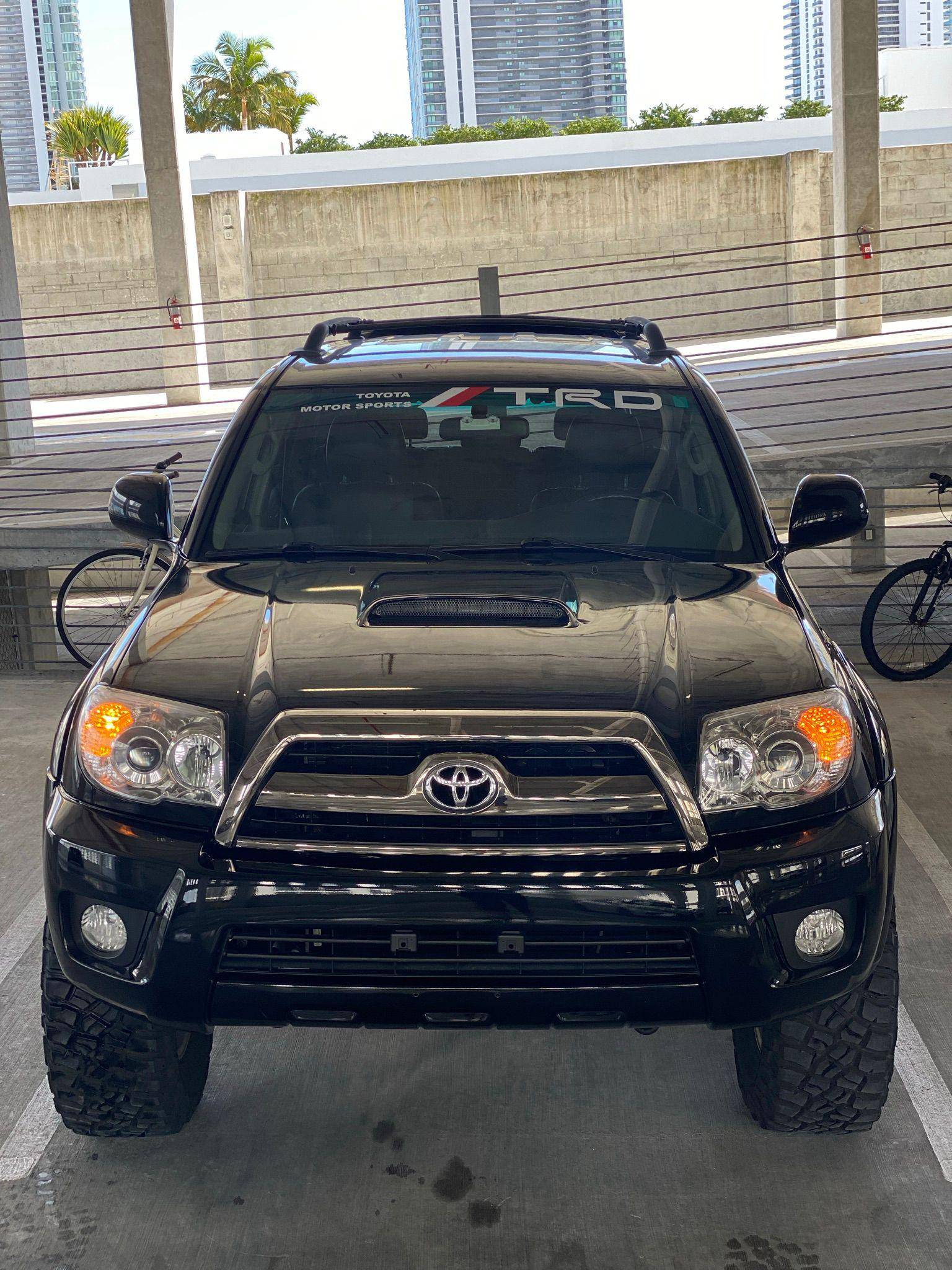 2006 Toyota 4Runner Sport Edition 4x4, finished in black with a black interior. Equipment on this 4Runner includes the Sport Edition Package (which adds 17-inch wheels, a hood scoop, a tubular roof rack with cross bars, and smoked chrome accents on the grille and headlight bezels), a locking center differential, a rear spoiler, leather upholstery, and more as detailed below. Modifications reported to this 4Runner include a Supreme Suspensions 2-inch spacer lift kit, BFGoodrich Mud Terrain tires, and LED headlight and foglight bulbs. A full list of modifications is included below. The fourth-generation 4Runner arrived for 2003. It was larger, more powerful, and generally more refined than the model it replaced. Toyota significantly bucked the industry's trend towards car-like crossovers and let the 4Runner keep its rugged body-on-frame construction, an architecture later shared with the FJ Cruiser. The 2006 model year received a slight facelift, which included projector beam headlights, a redesigned grille, and LED tail lights. Production ended in 2009. Power comes from a "2UZ-FE" 4. 7-liter V8, rated at 260 horsepower and 306 lb-ft of torque. The engine spins all four wheels via a 5-speed automatic transmission and a full-time four-wheel-drive system.